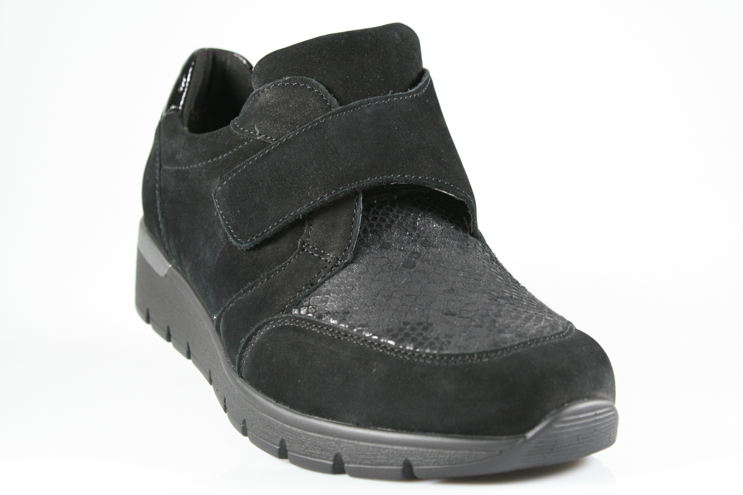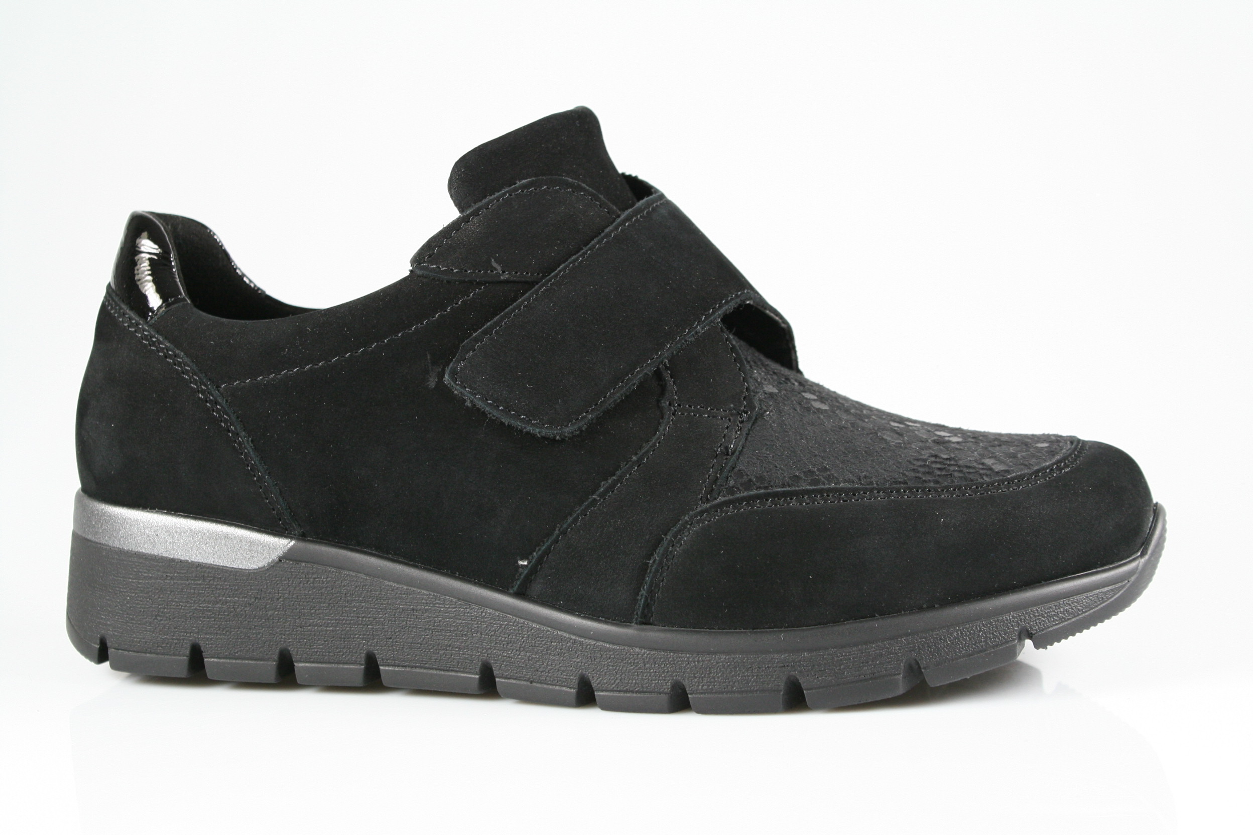 Typ: Halbschuh; Farbe "schwarz"; Ausstattung:; - Obermaterial: Leder, Stretch; - herausnehmbares Fußbett; - leichte, flexible Laufsohle; - gepolsterter Schaftrand; - Klettverschluss zur Weitenregulierung