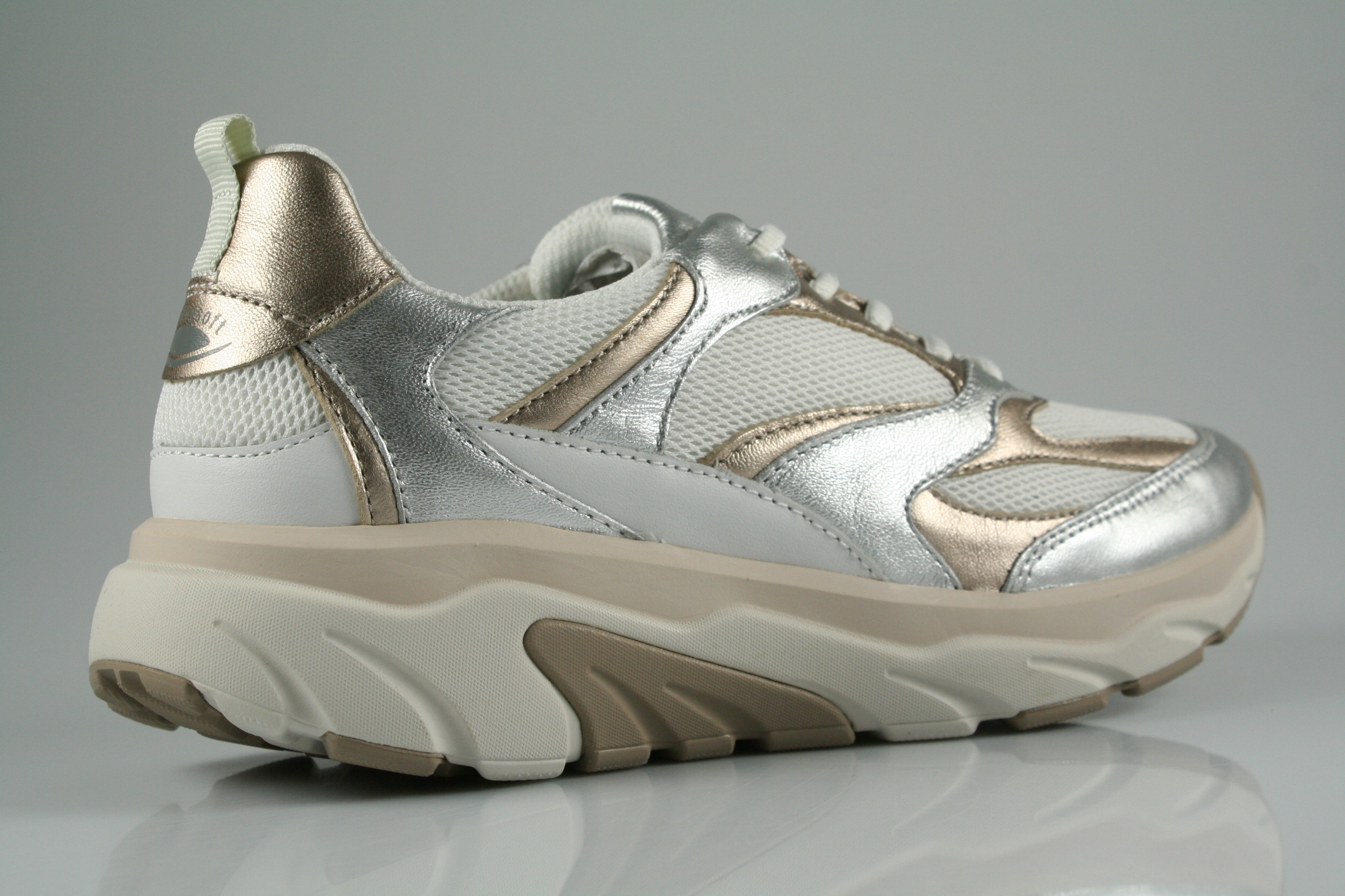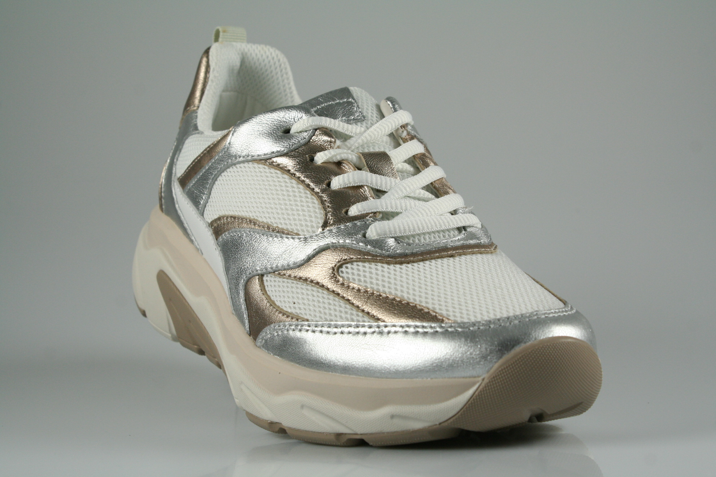 Typ: Sneaker; Farbe "weiß/silber/puder"; Ausstattung:; - Obermaterial: Leder, Mesh; - herausnehmbares Fußbett; - leichte Laufsohle; - 15mm Keilabsatz; - gepolsterter Schaftrand; - Schnürsenkel zur Weitenregulierung