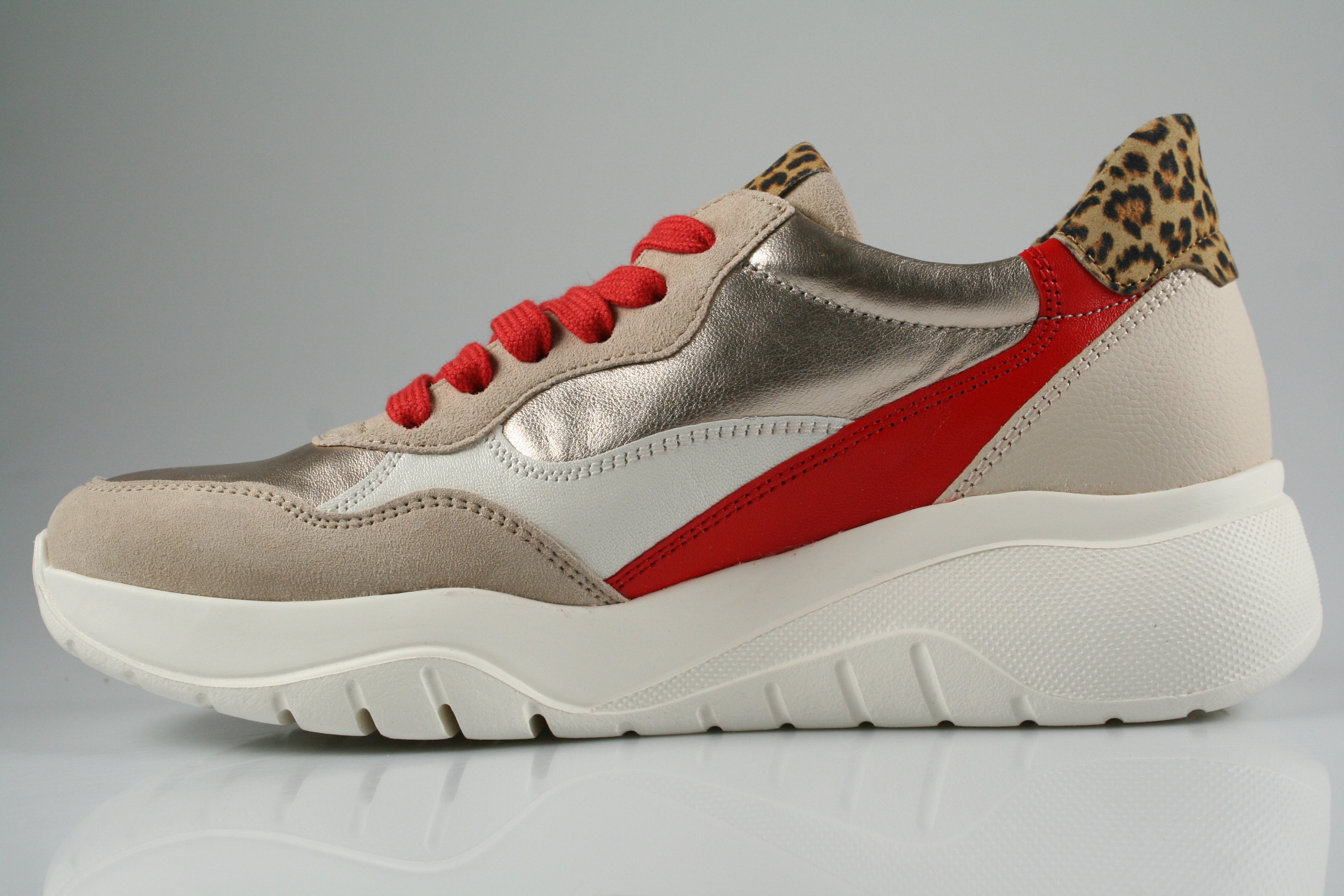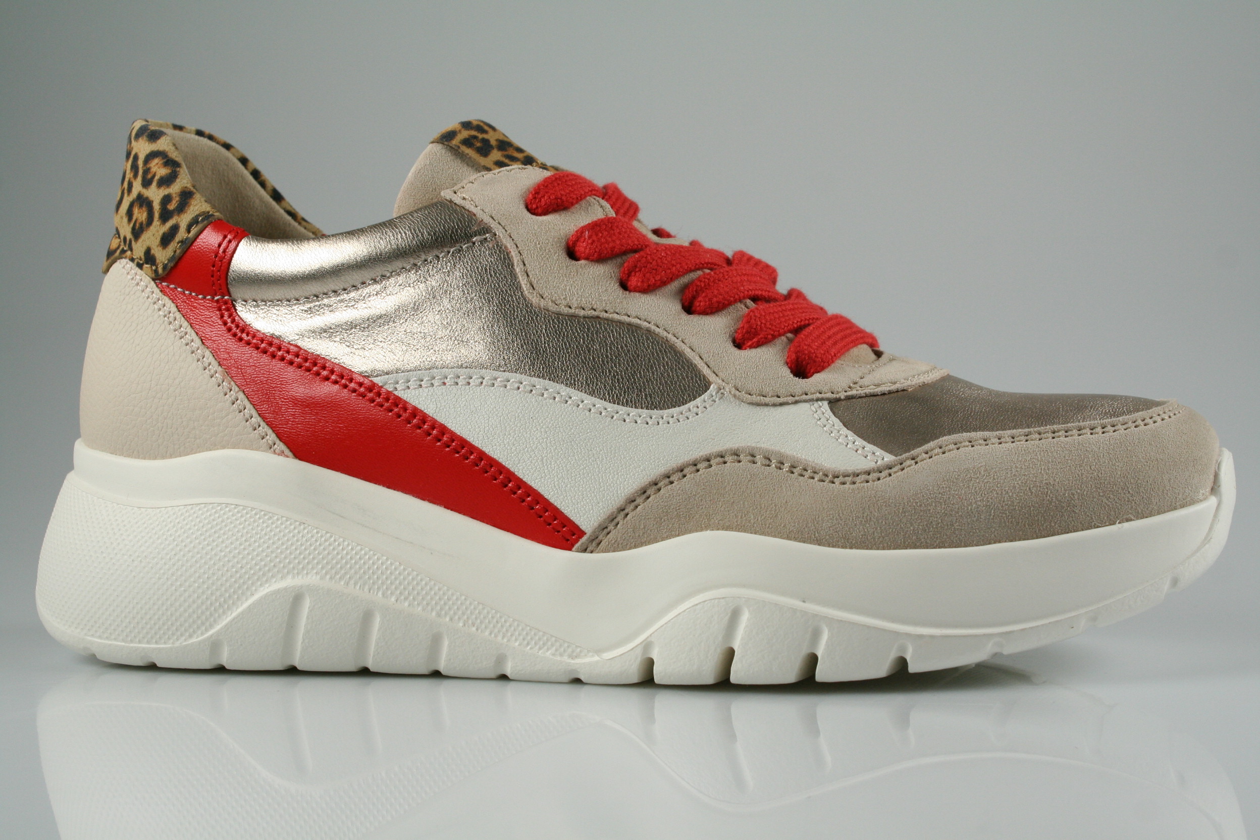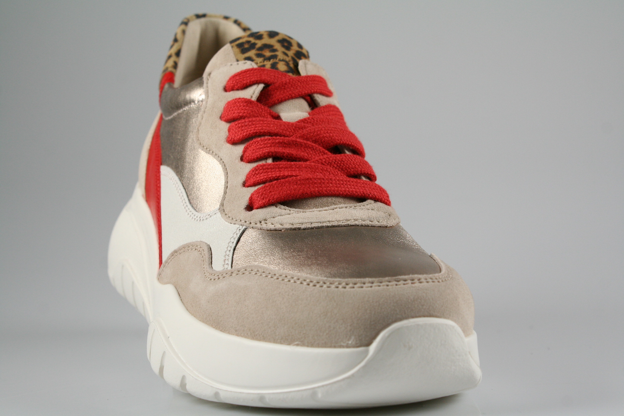 Typ: Sneaker/Halbschuh; Farbe: "beige/flame"; Ausstattung:; - Obermaterial: Velourleder/Satin/Leo kombiniert; - herausnehmbares Fußbett; - leichte, flexible Laufsohle; - gepolsterter Schaftrand; - Schnürsenkel zur Weitenregulierung