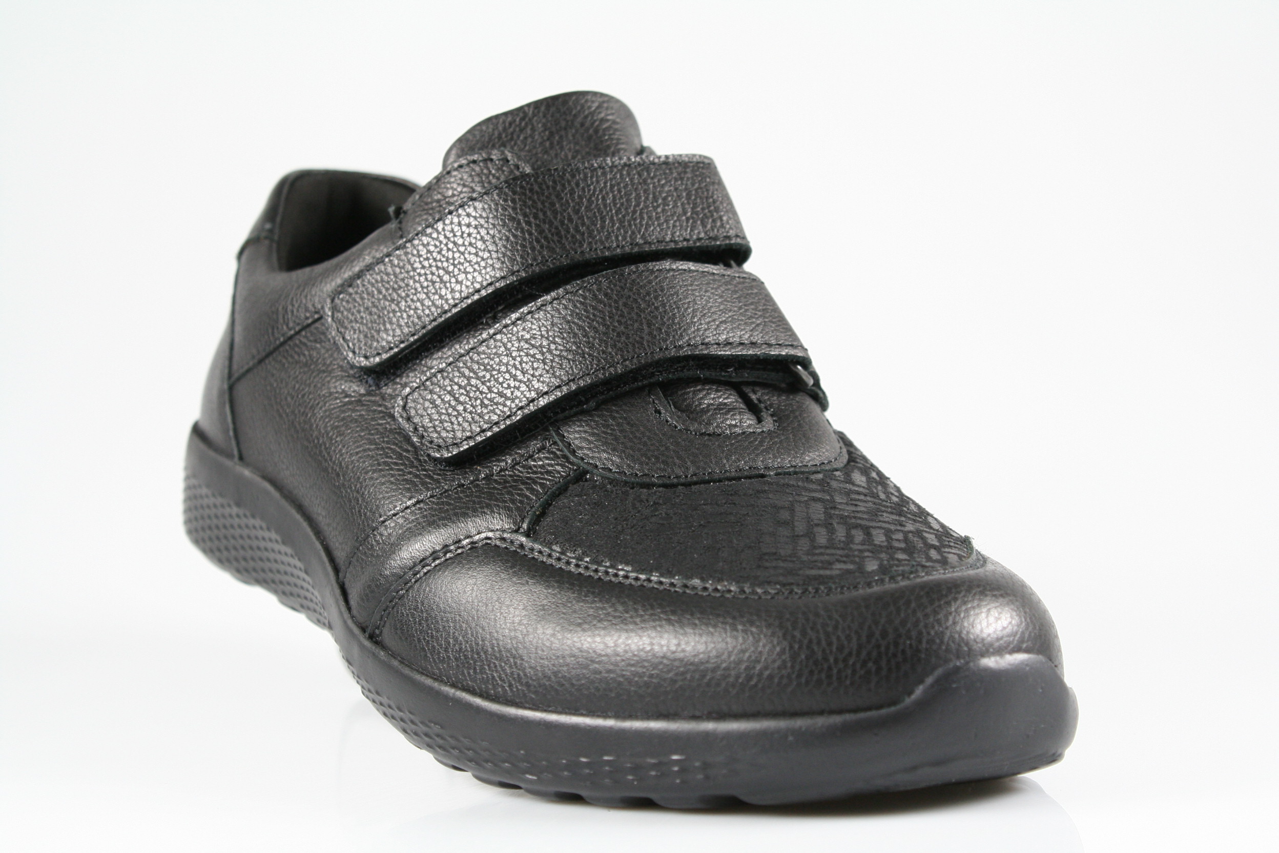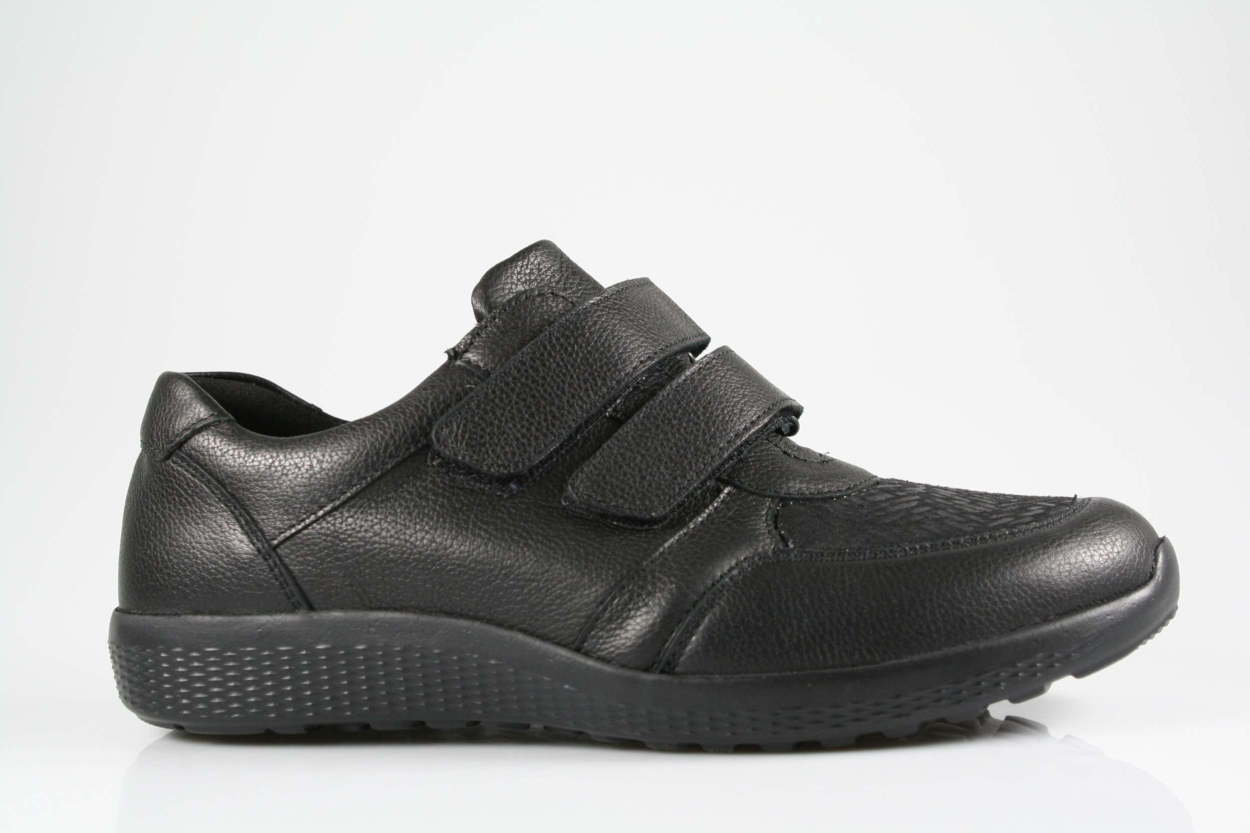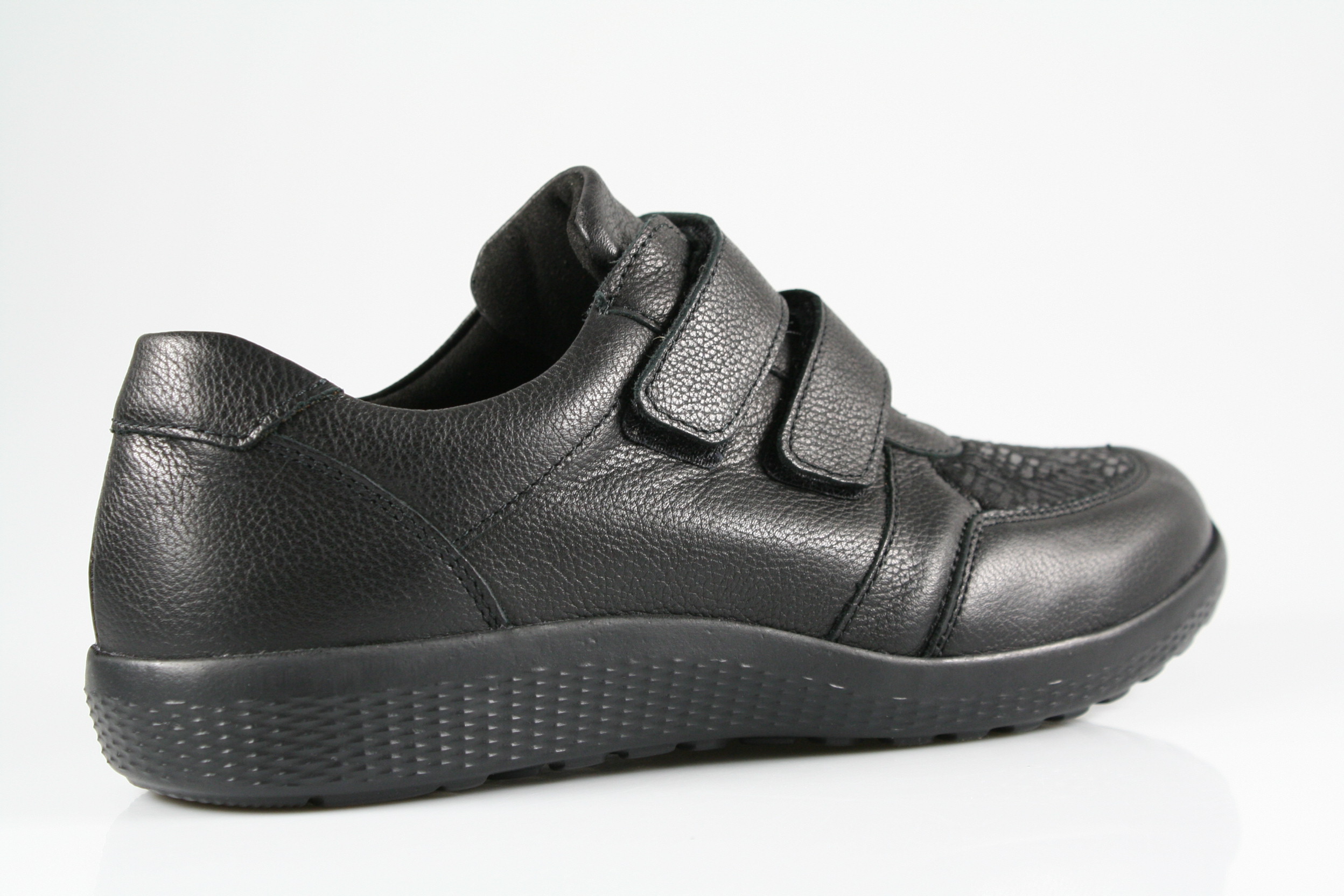 Typ: Halbschuh; Farbe "schwarz"; Ausstattung:; - Obermaterial: Leder, Stretch; - herausnehmbares Fußbett; - leichte Laufsohle; - gepolsterter Schaftrand; - Klettverschluss zur Weitenregulierung