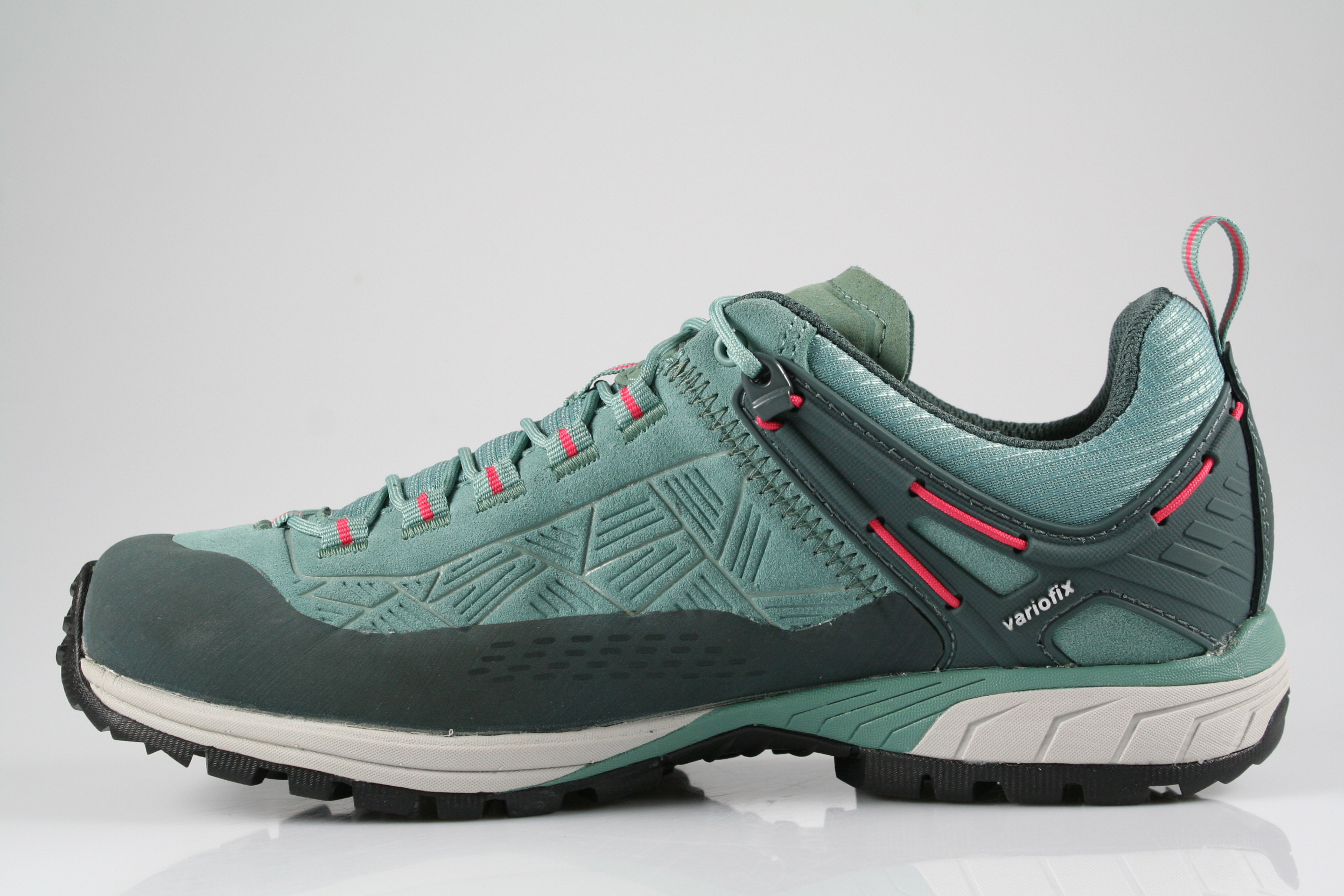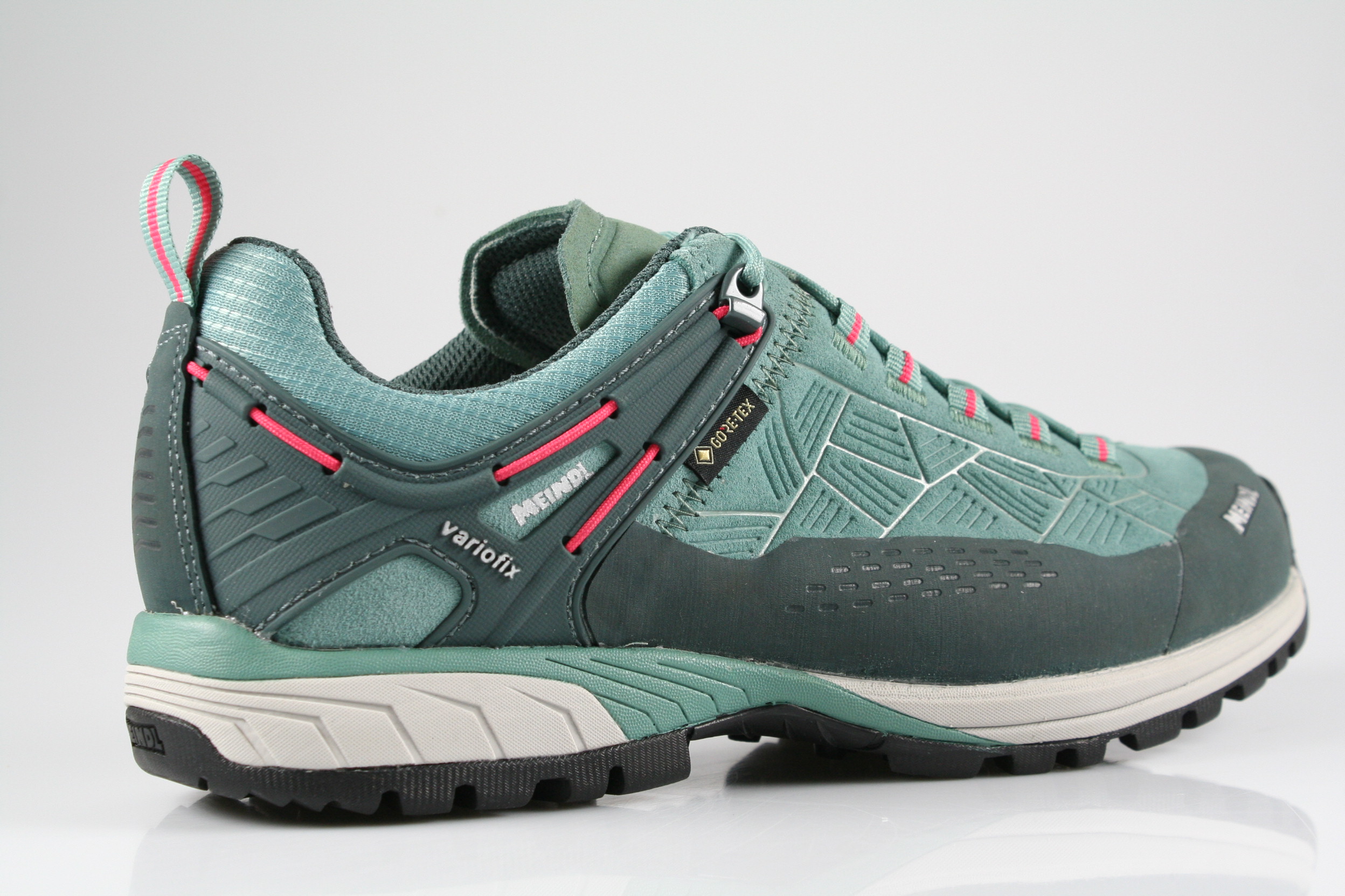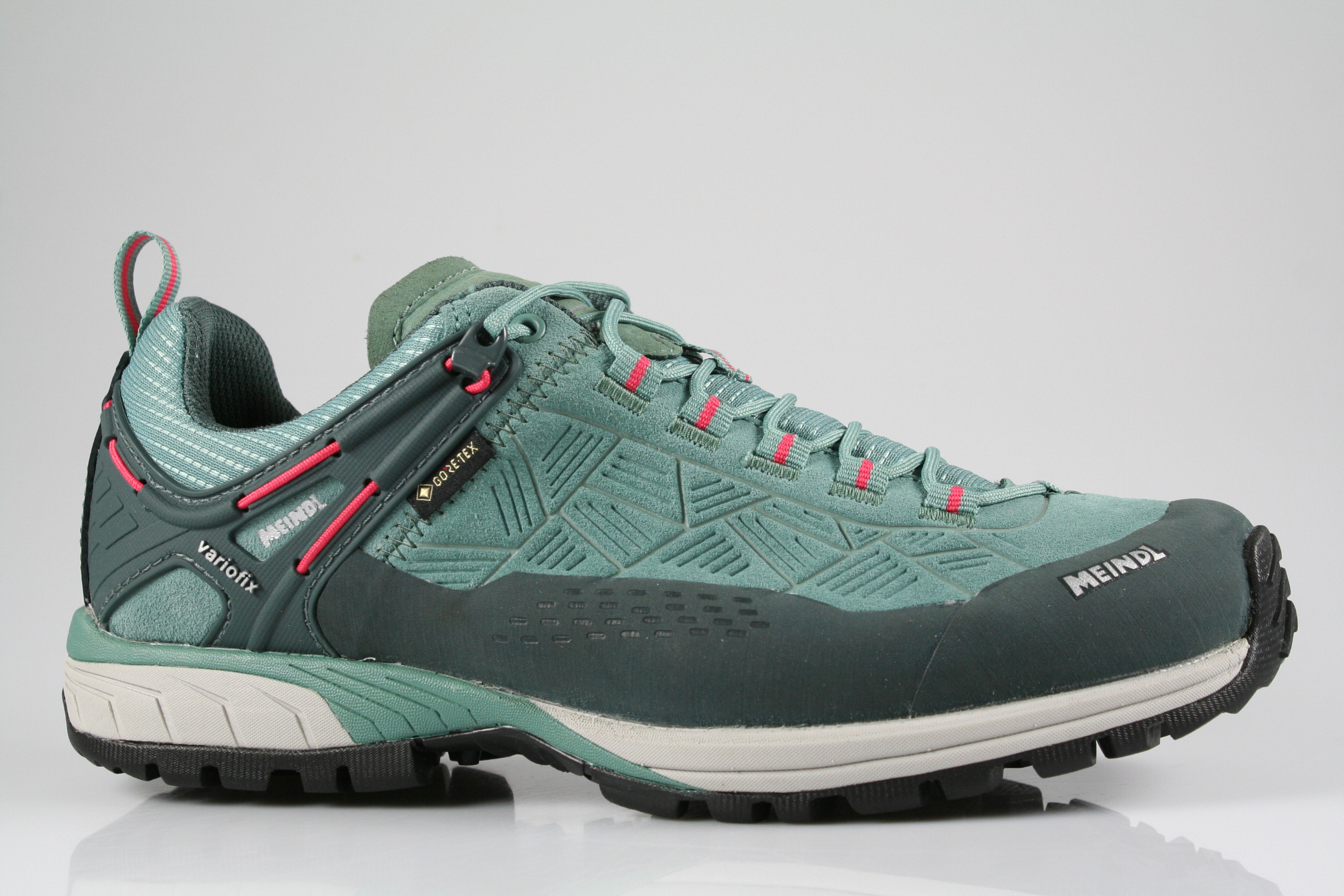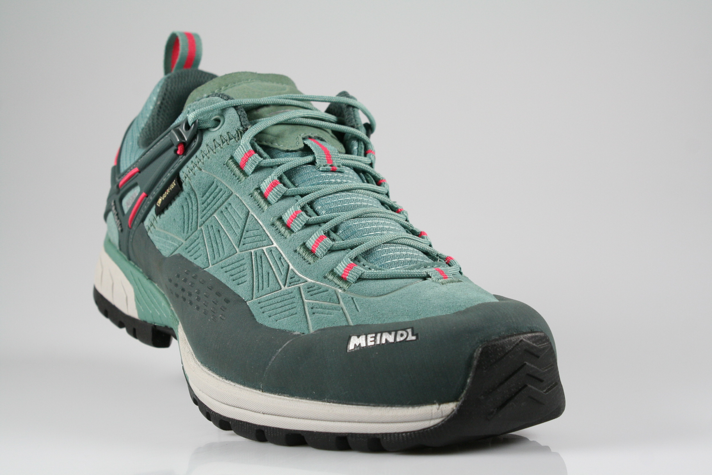 Typ: Halbschuh; Farbe "linde/rot"; Ausstattung:; - Obermaterial: Velourleder, Mesh; - herausnehmbares Fußbett; - robuste Laufsohle; - gepolsterter Schaftrand; - Schnürsenkel zur Weitenregulierung; - wasserfest durch "GoreTex"-Membrane