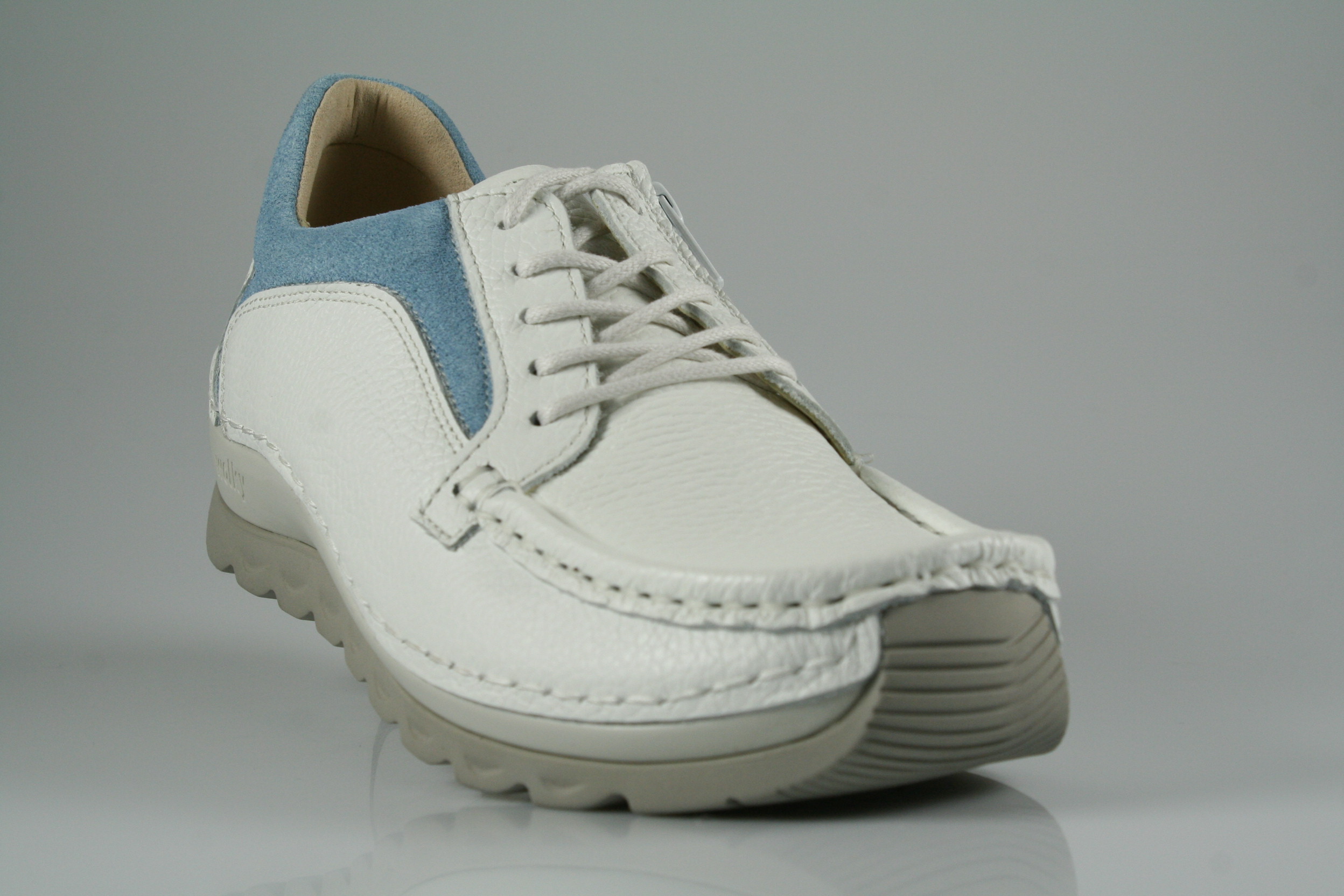 Typ: Halbschuh; Farbe "white/light blue"; Ausstattung:; - Obermaterial: Leder; - herausnehmbares Fußbett; - flexible Laufsohle; - gepolsterter Schaftrand; - Schnürsenkel und Reißverschluss zur Weitenregulierung