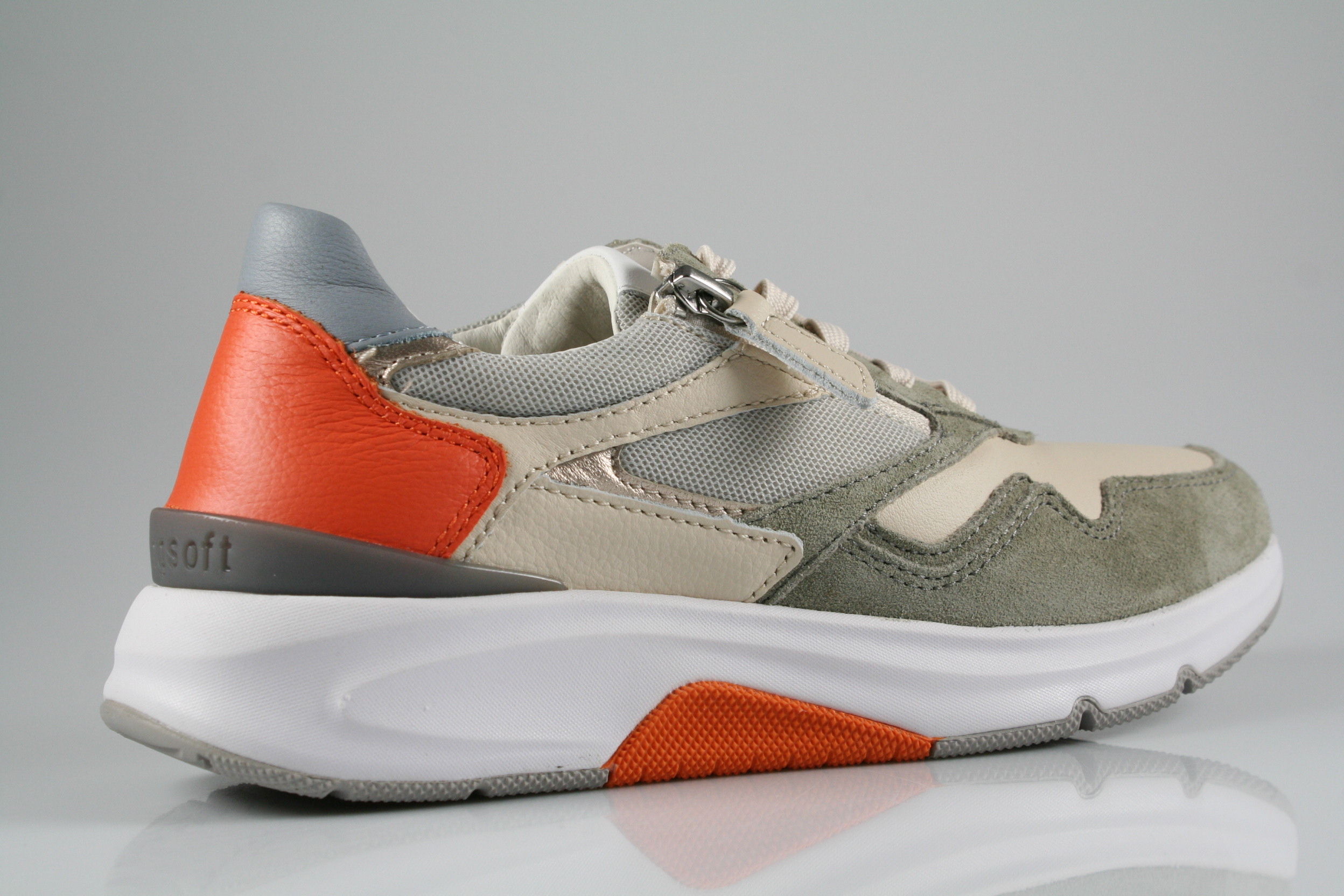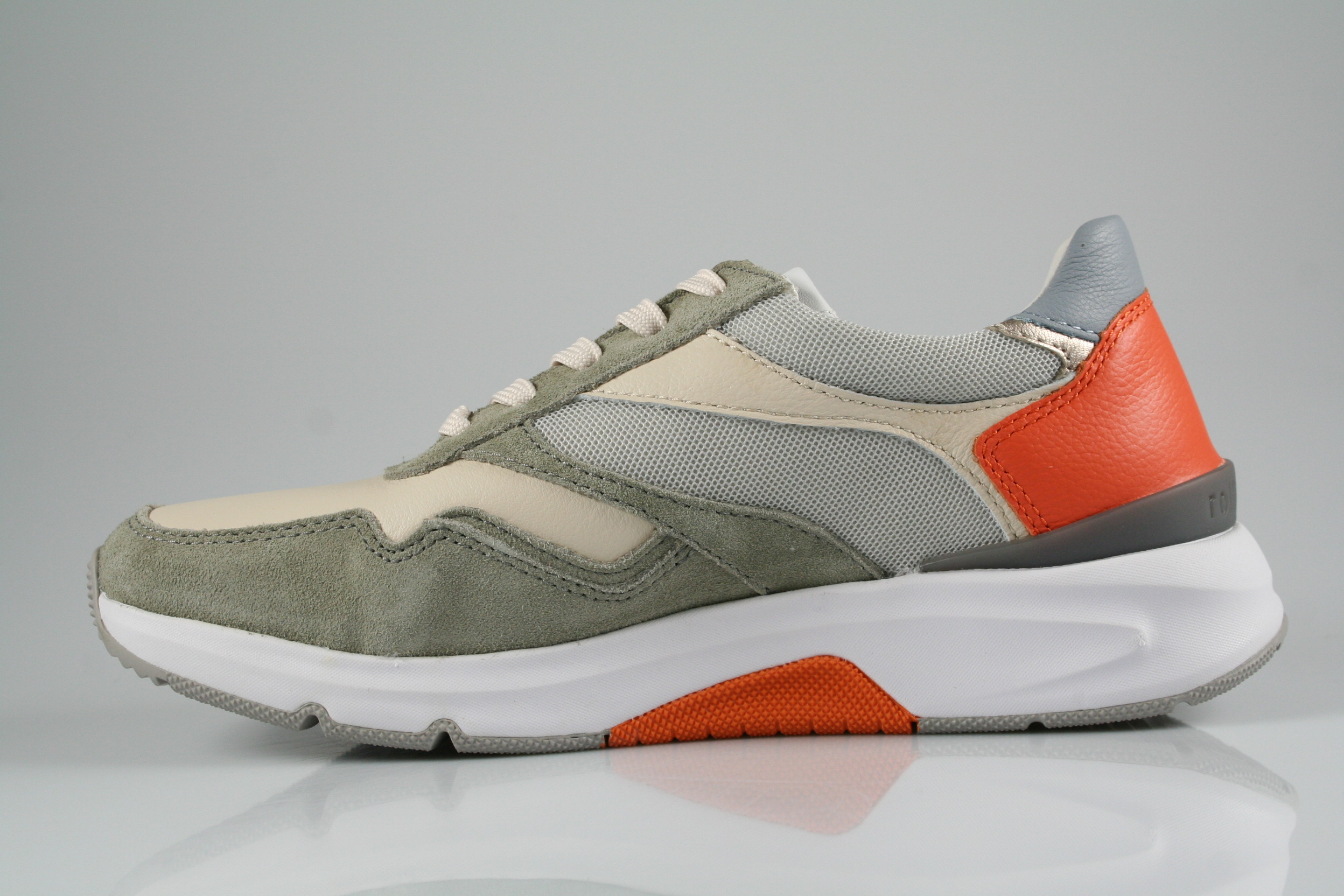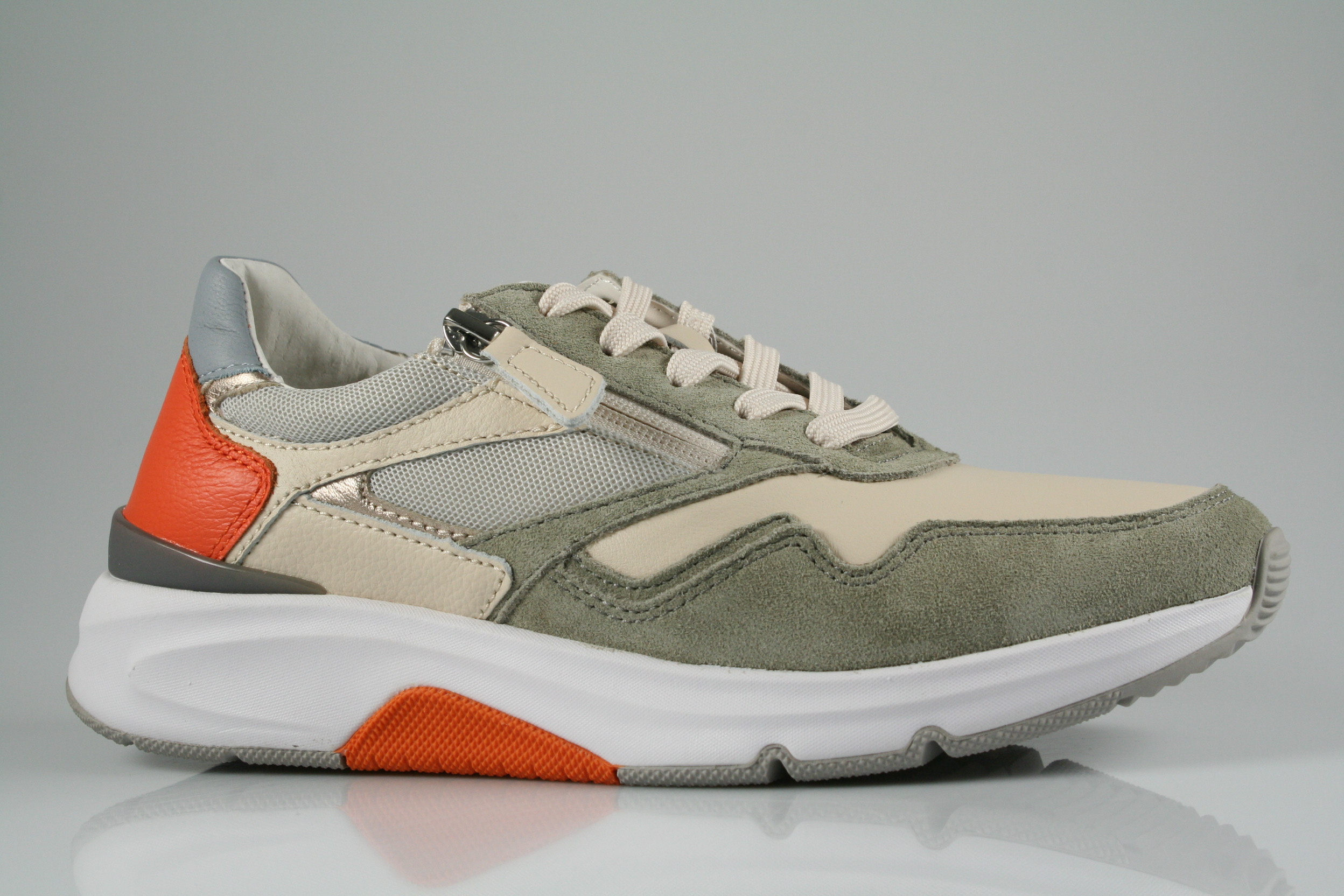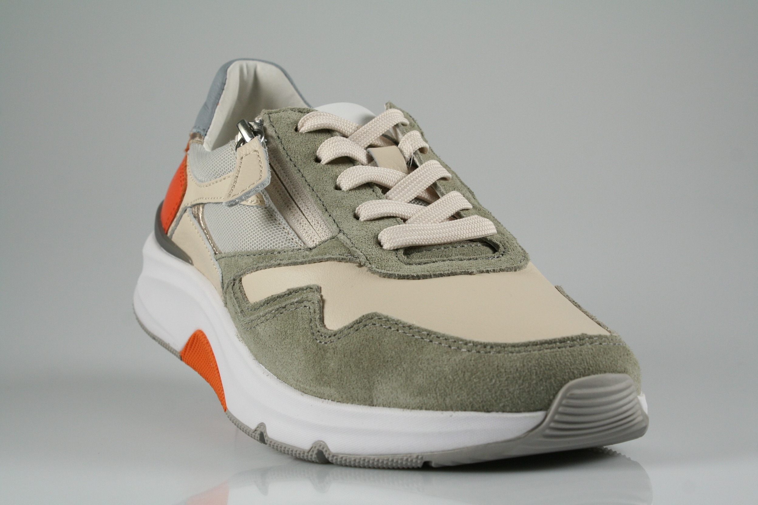 Typ: Halbschuh; Farbe "creme/salvia/orange"; Ausstattung:; - Obermaterial: Leder, Mesh; - herausnehmbares Fußbett; - leichte Laufsohle; - gepolsterter Schaftrand; - Schnürsenkel und Reißverschluss zur Weitenregulierung