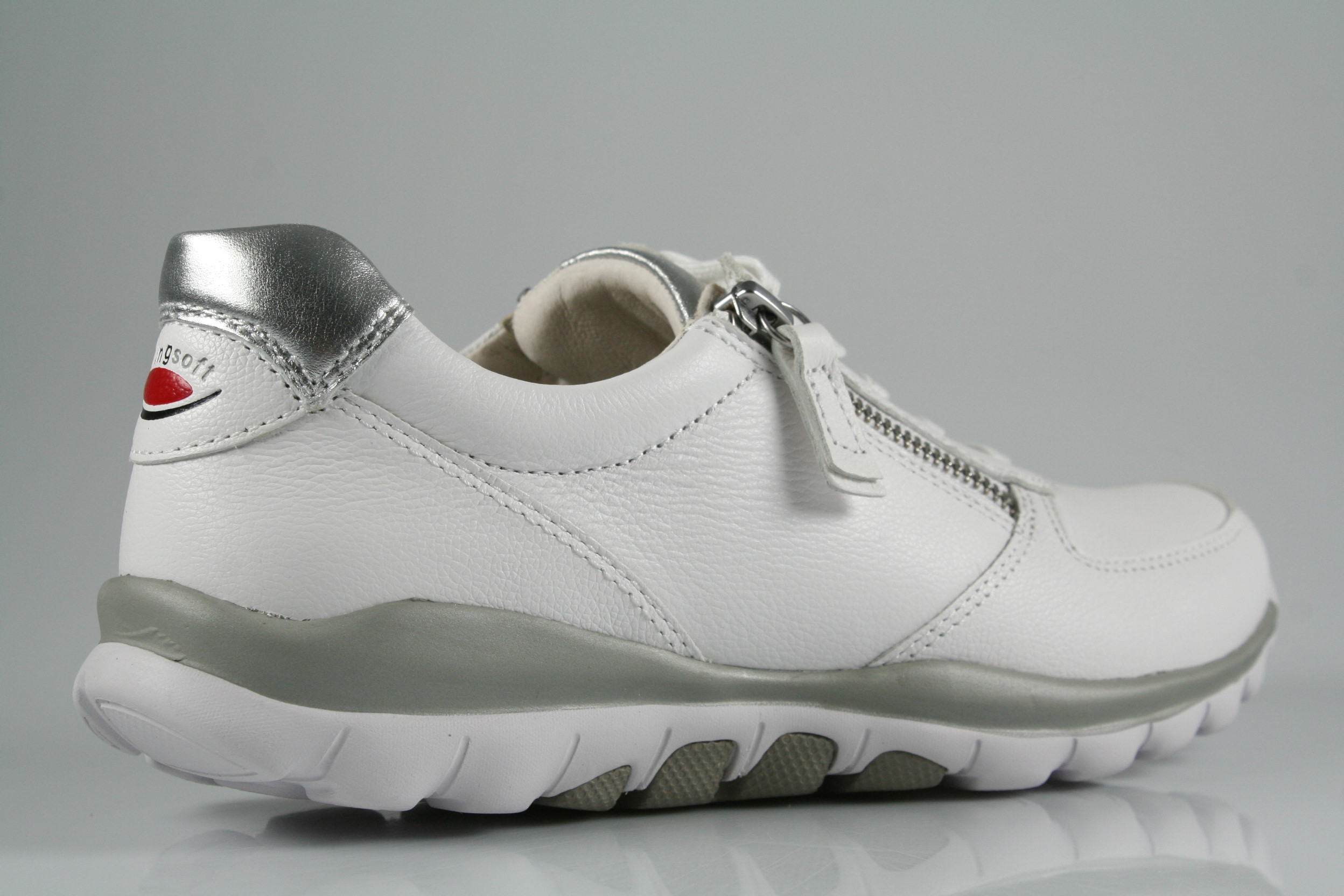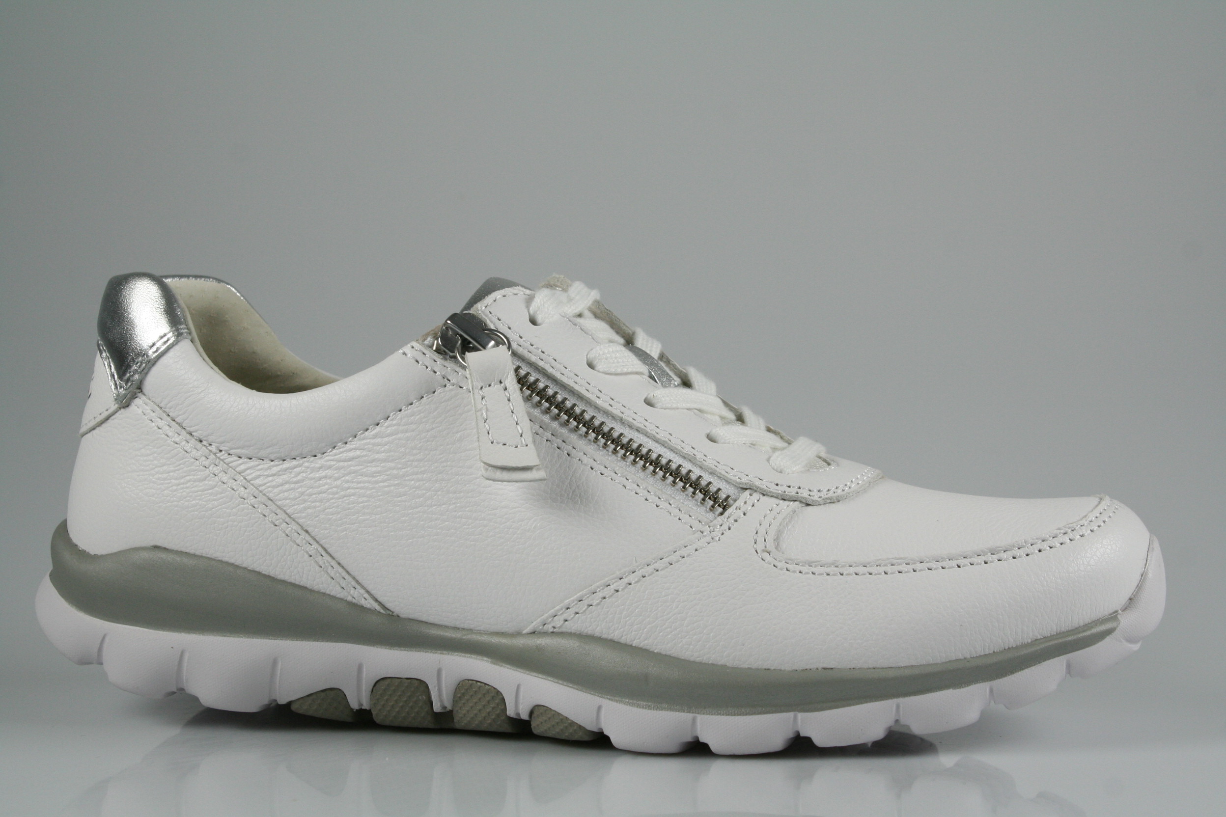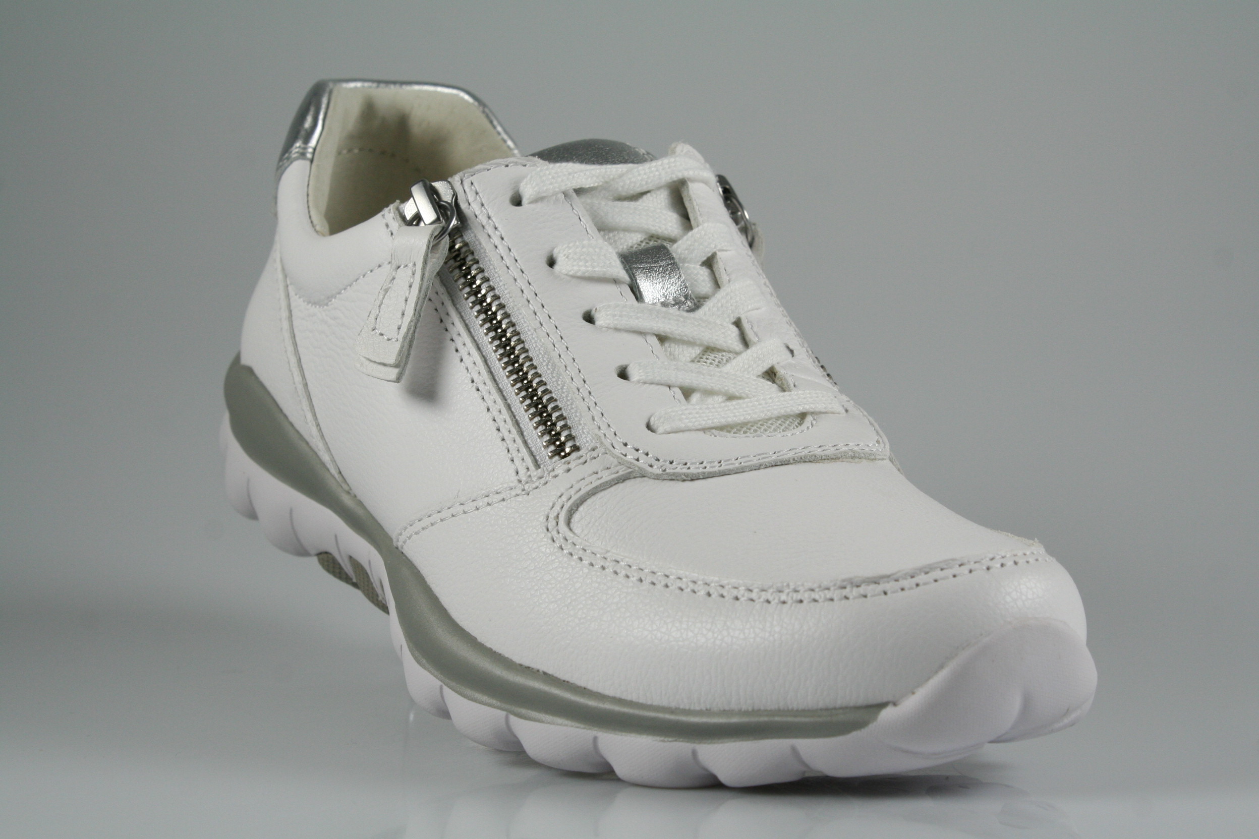 Typ: Sneaker/Halbschuh; Farbe "weiß/silber"; Ausstattung:; - Obermaterial: Glattleder; - herausnehmbares Fußbett; - leichte, flexible Laufsohle; - gepolsterter Schaftrand; - Schnürsenkel und Reißverschluss zur Weitenregulierung