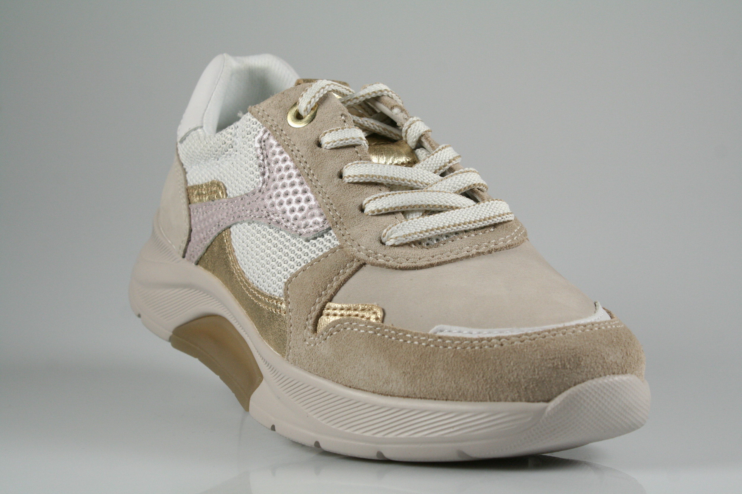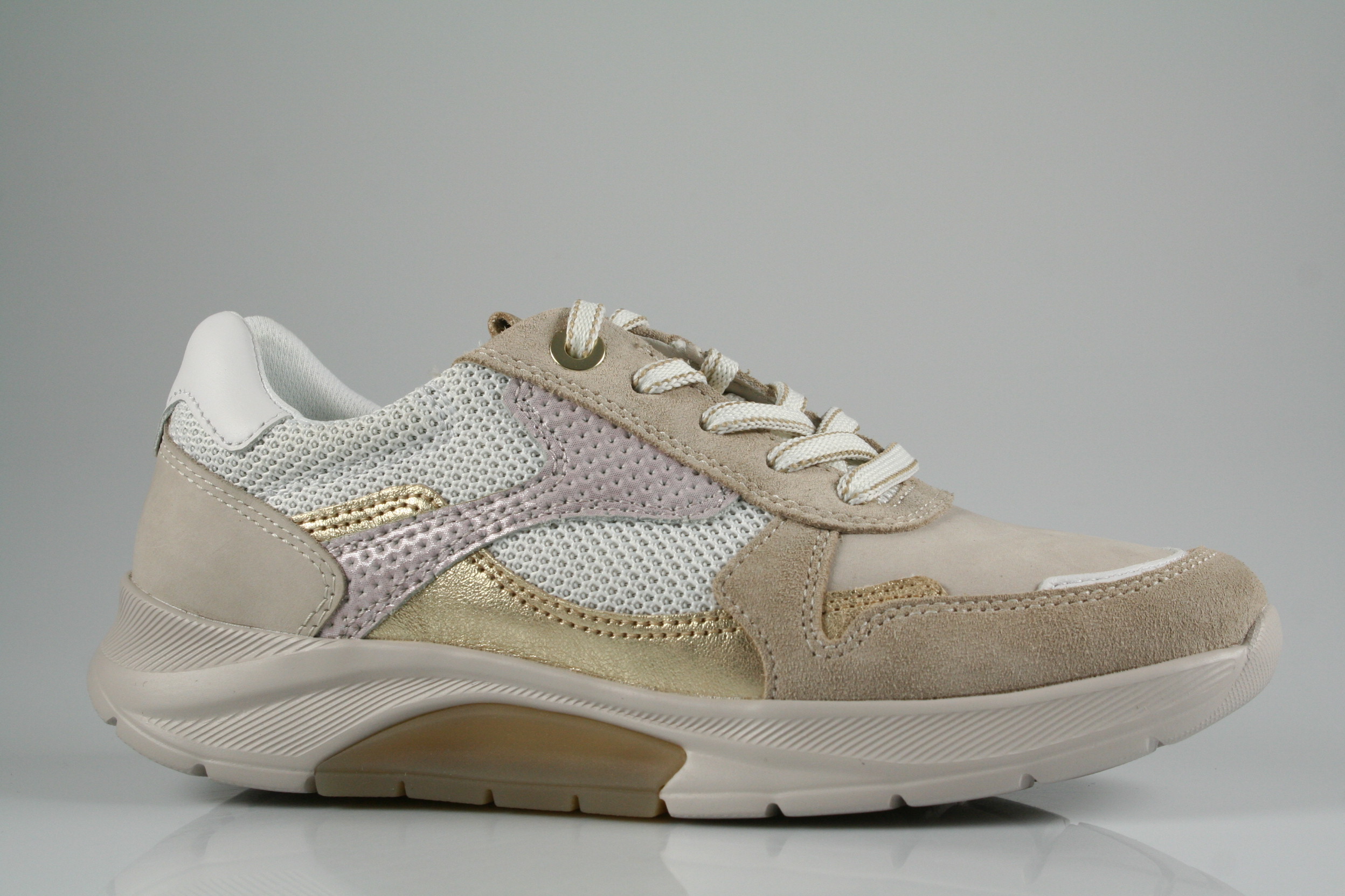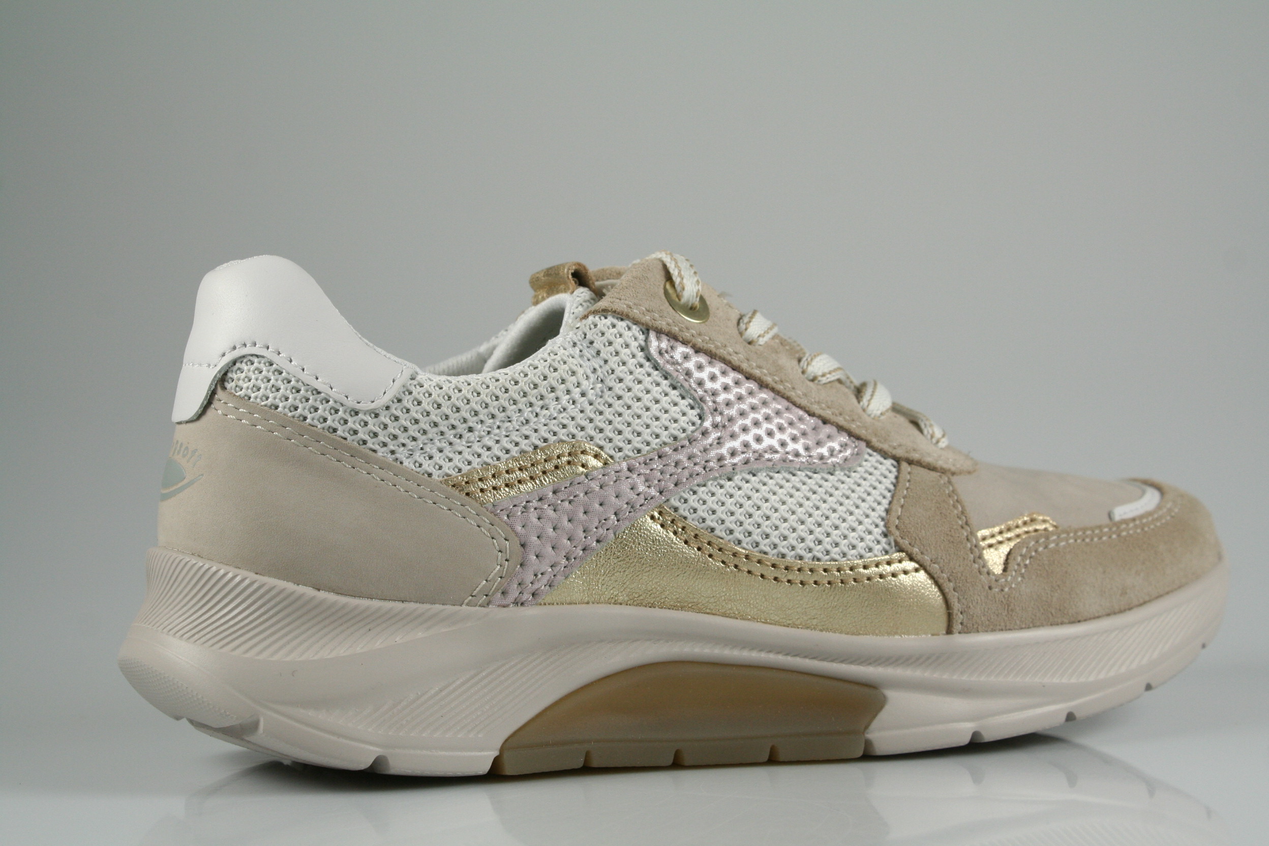 Typ: Sneaker/Halbschuh; Farbe: "puder/weiß/platino"; Ausstattung:; - Obermaterial: Leder kombiniert; - herausnehmbares Fußbett; - leichte, flexible Laufsohle; - gepolsterter Schaftrand; - Schnürsenkel zur Weitenregulierung