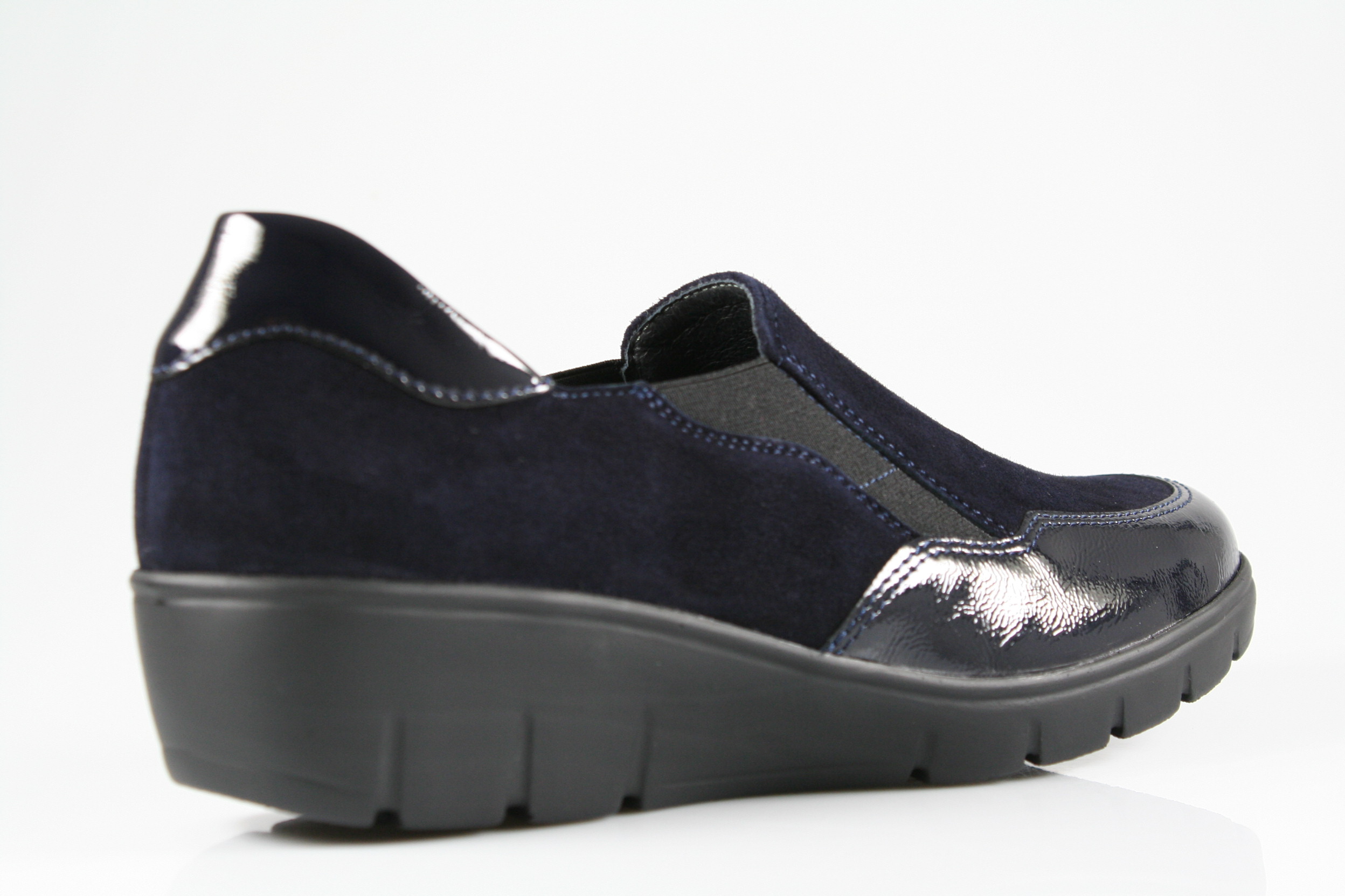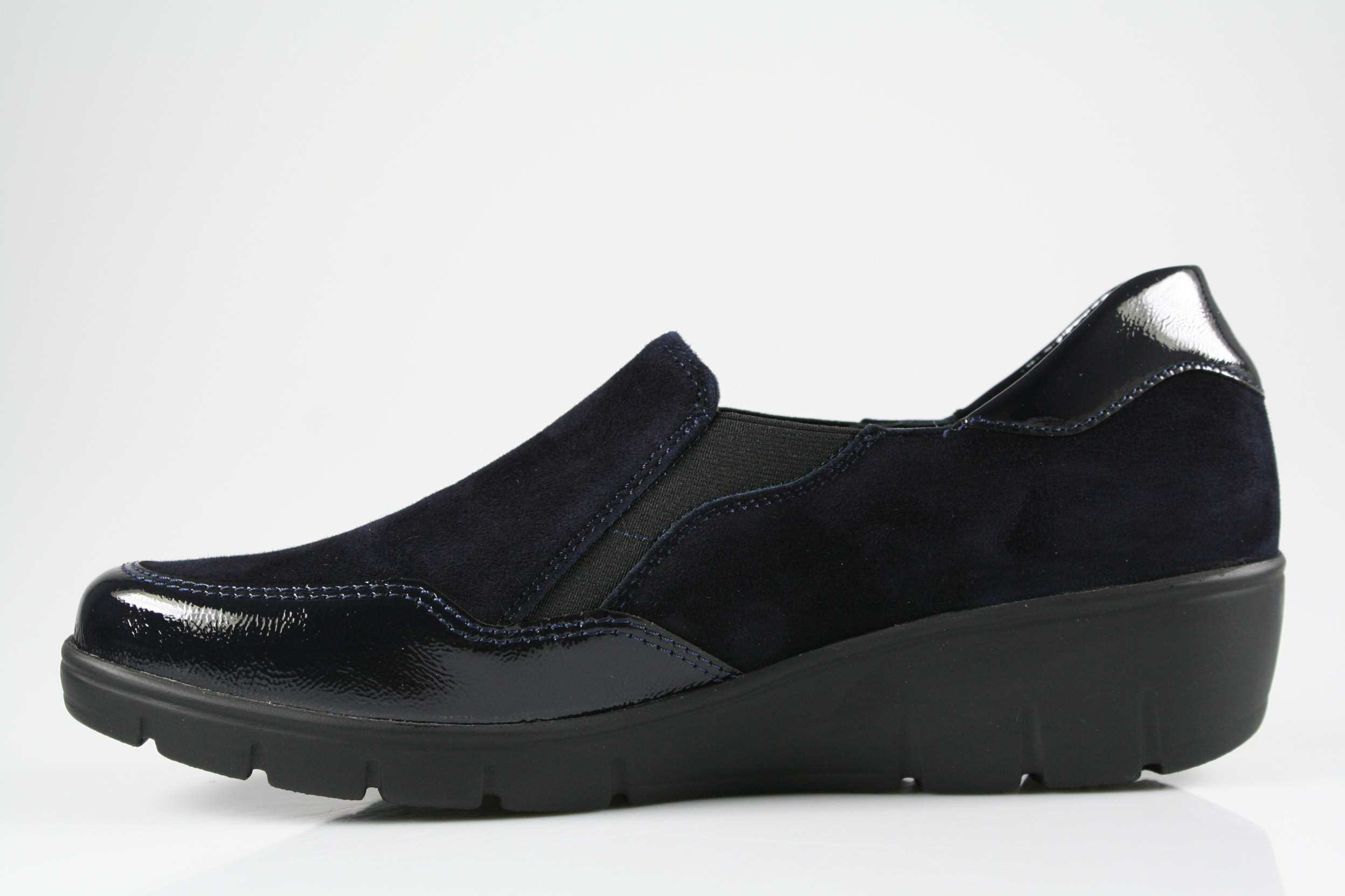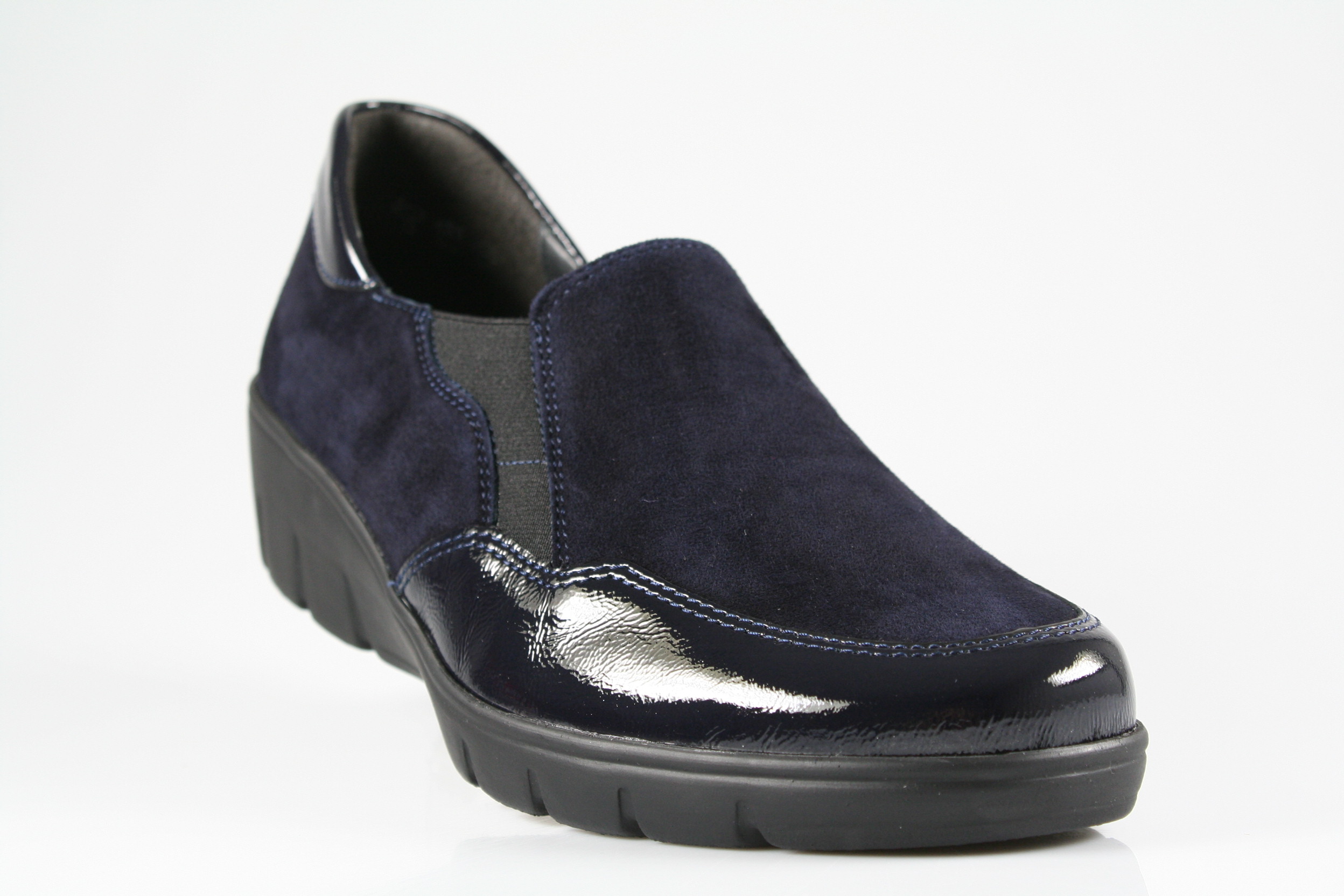 Typ: Slipper; Farbe: "midnightblue"; Ausstattung:; - Obermaterial: Lack-/Velourleder; - Lederfutter; - herausnehmbares Lederfußbett; - flexible PU-Luftpolstersohle; - gepolsterter Schaftrand; - elastische Einsätze am Einschlupf; - Weite "H"