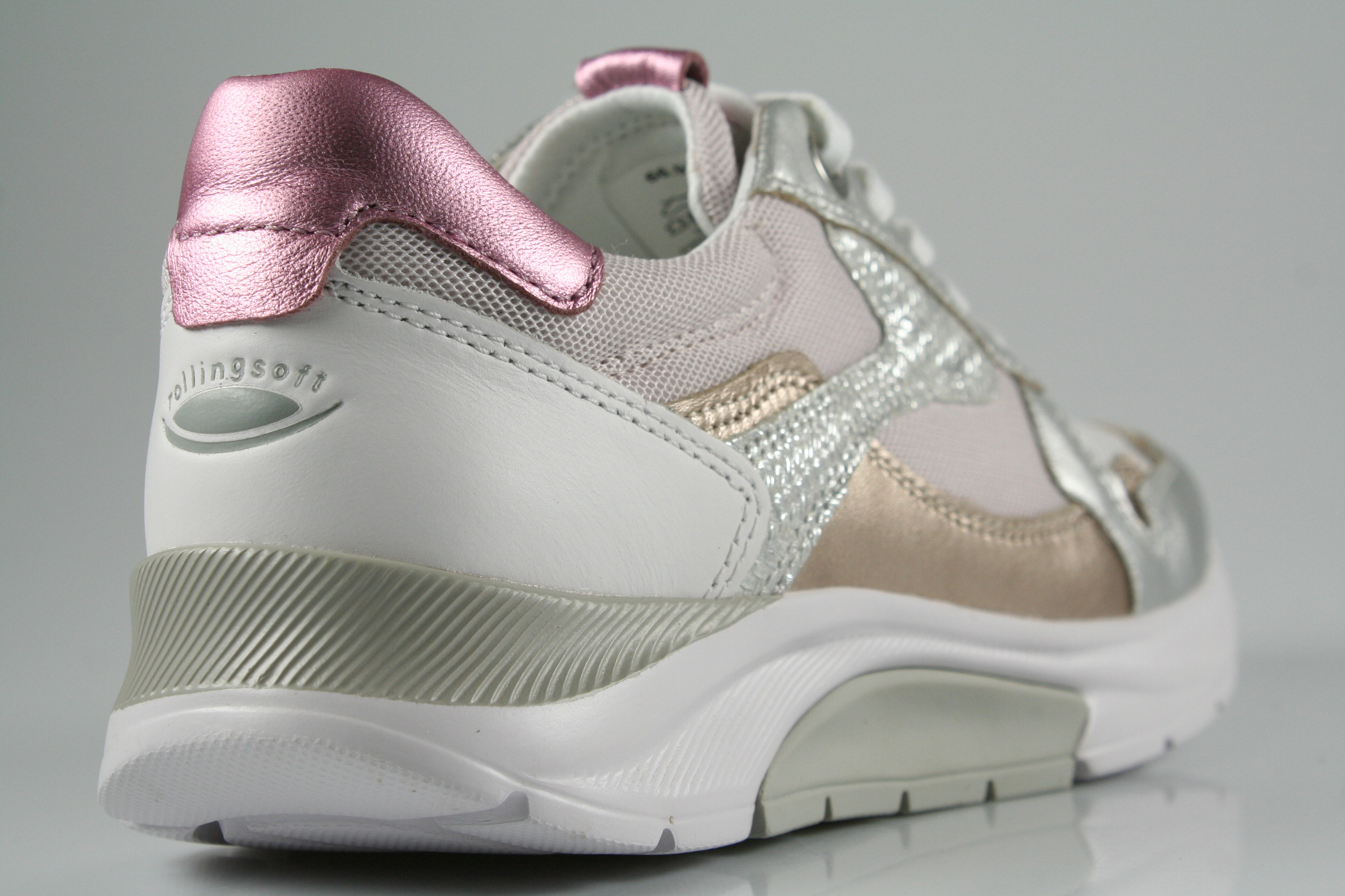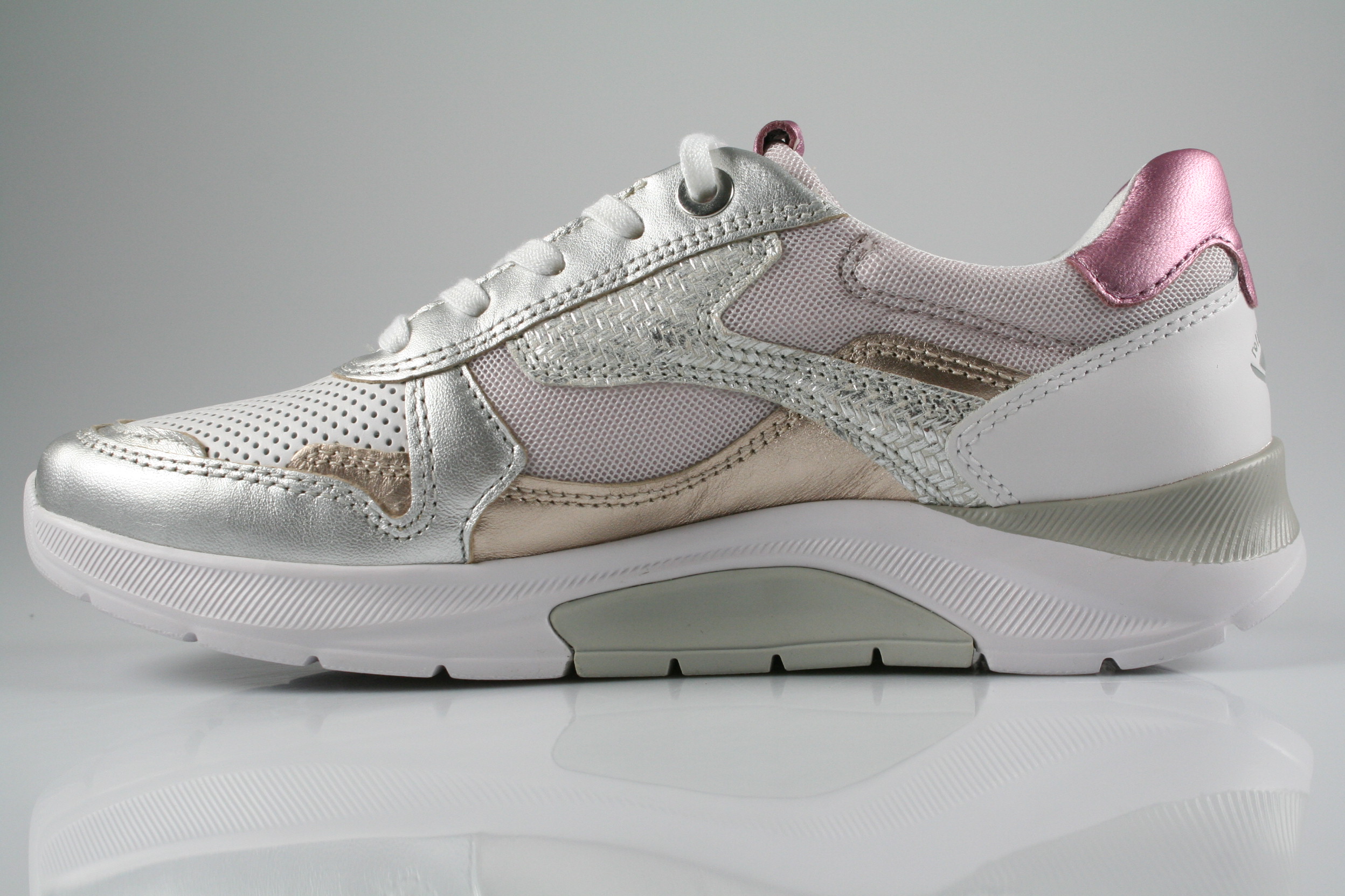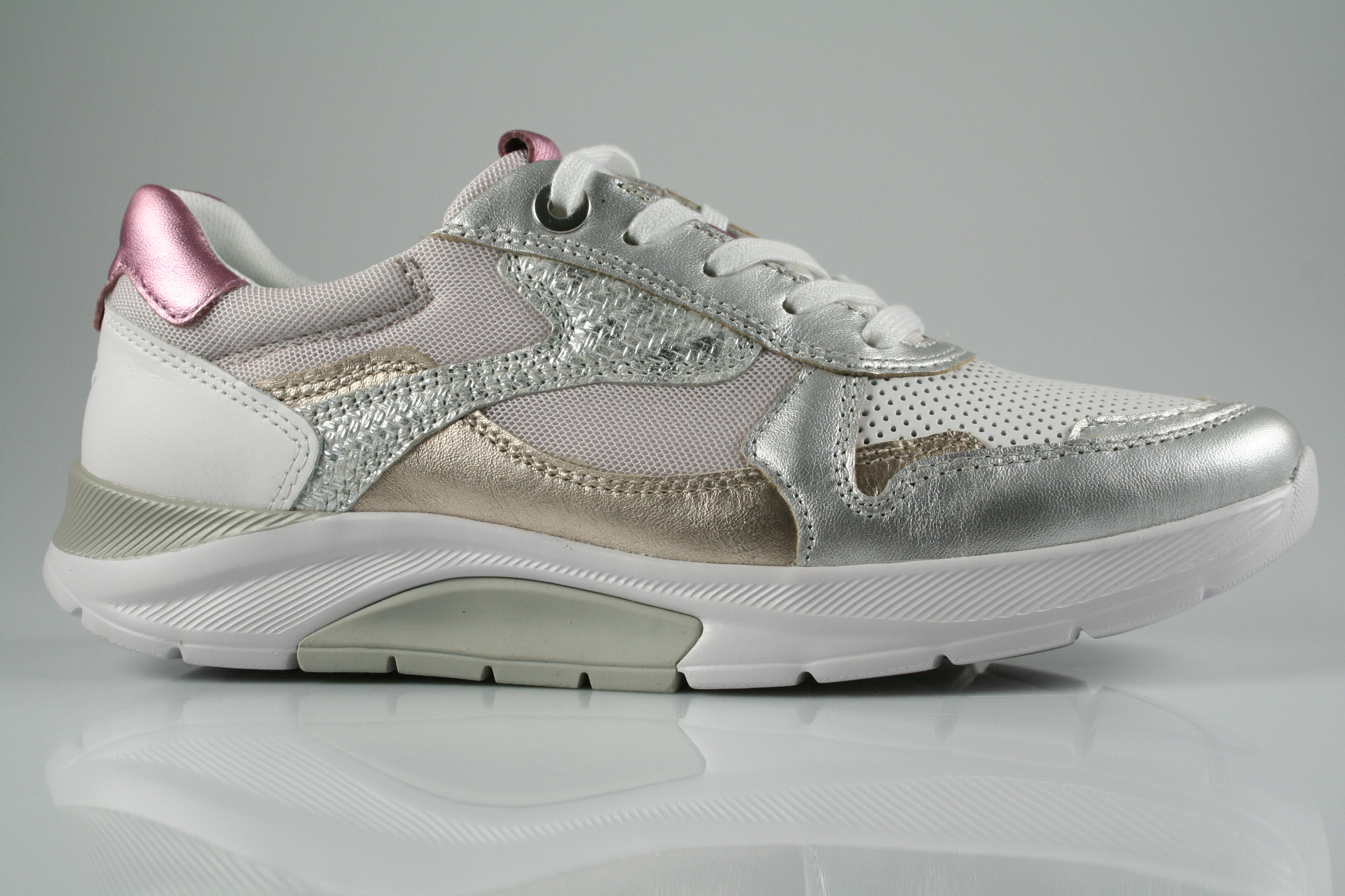 Typ: Sneaker/Halbschuh; Farbe: "weiss/silber/puder"; Ausstattung:; - Obermaterial: Leder/Mesh kombiniert; - herausnehmbares Fußbett; - leichte, flexible Laufsohle; - gepolsterter Schaftrand; - Schnürsenkel zur Weitenregulierung
