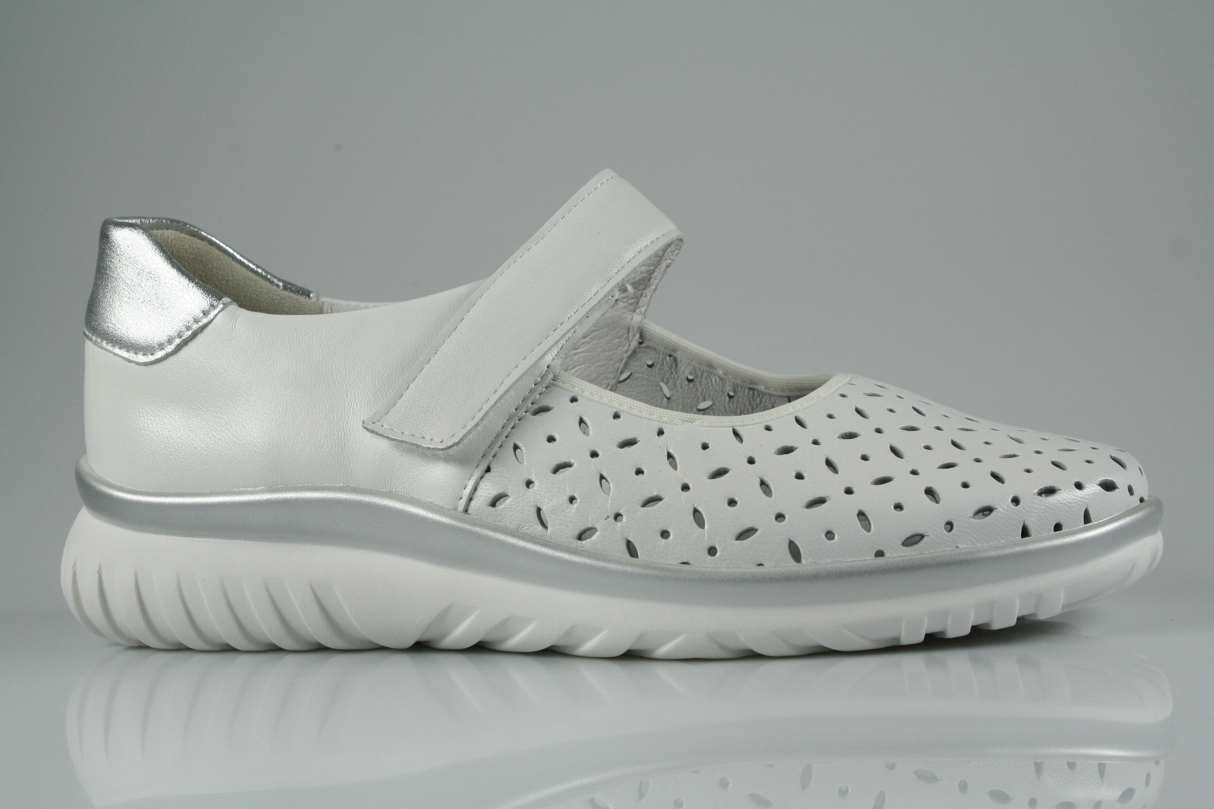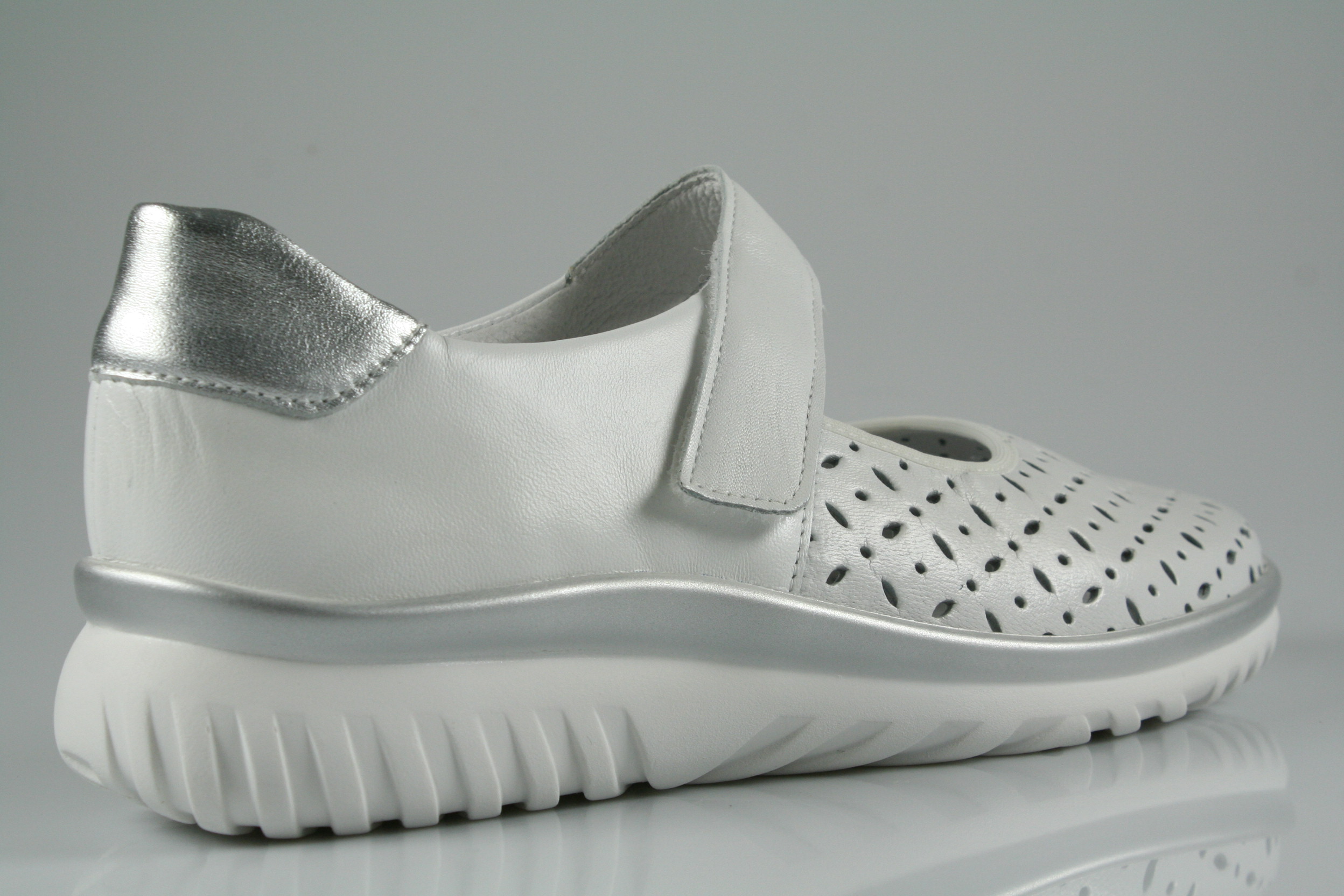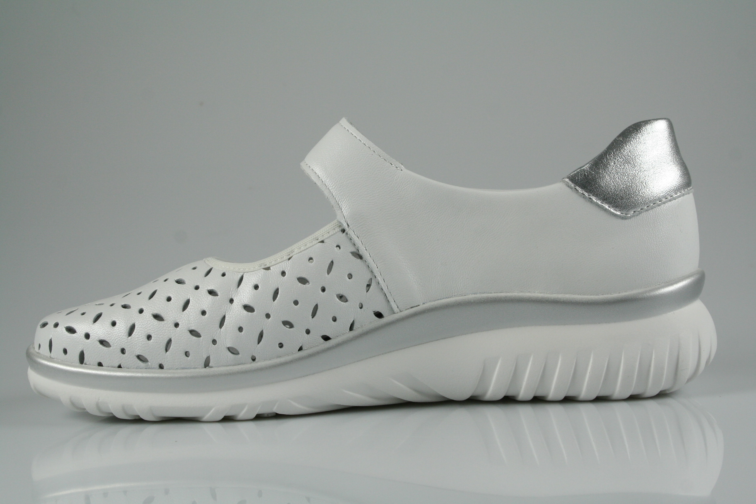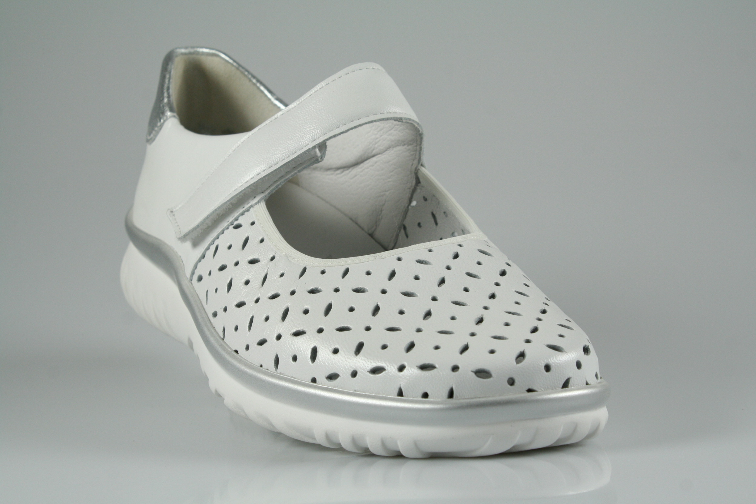 Typ: Slipper; Farbe "weiß-silber"; Ausstattung:; - Obermaterial: Leder; - herausnehmbares Fußbett; - superleichte Laufsohle; - gepolsterter Schaftrand; - Klettverschluss