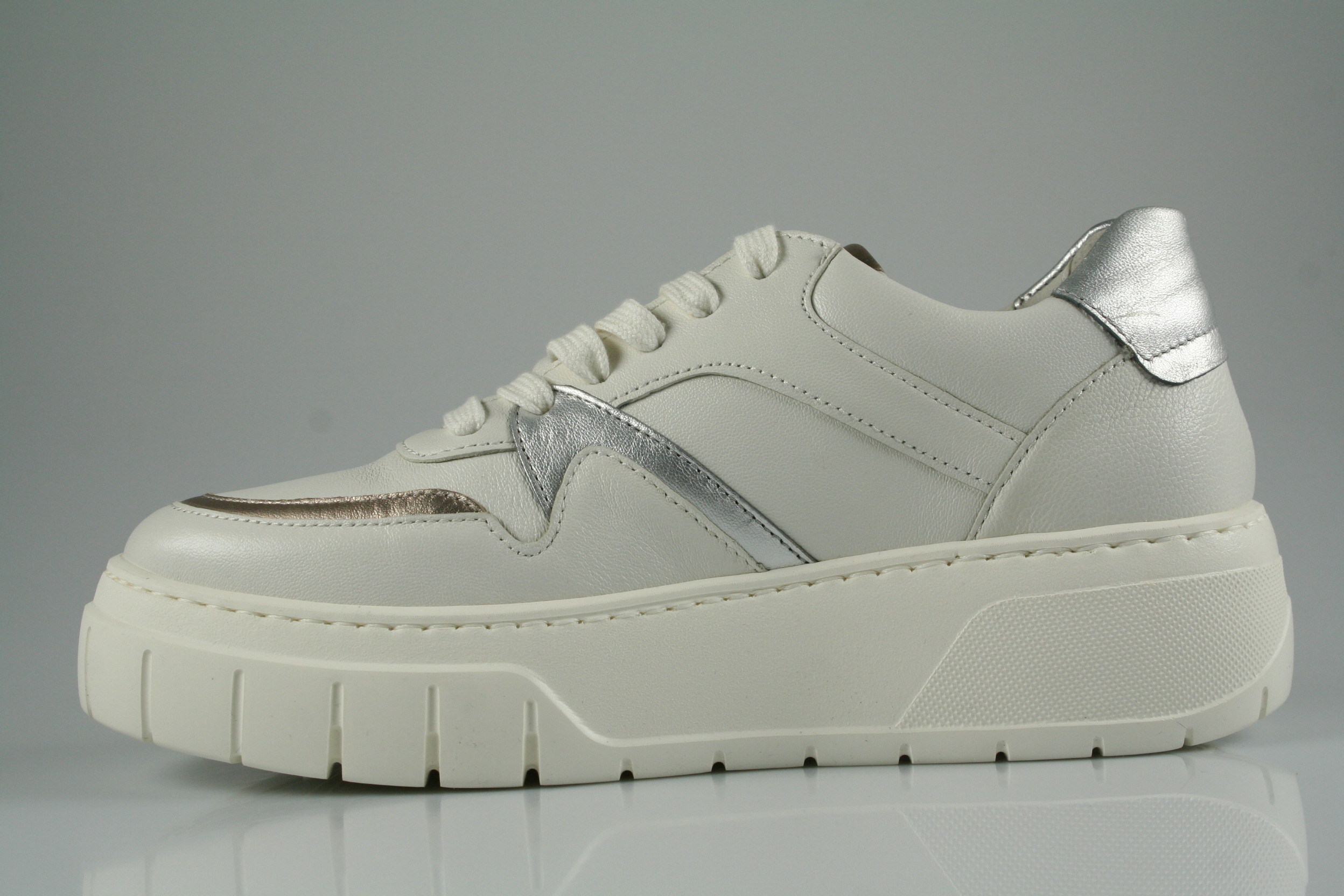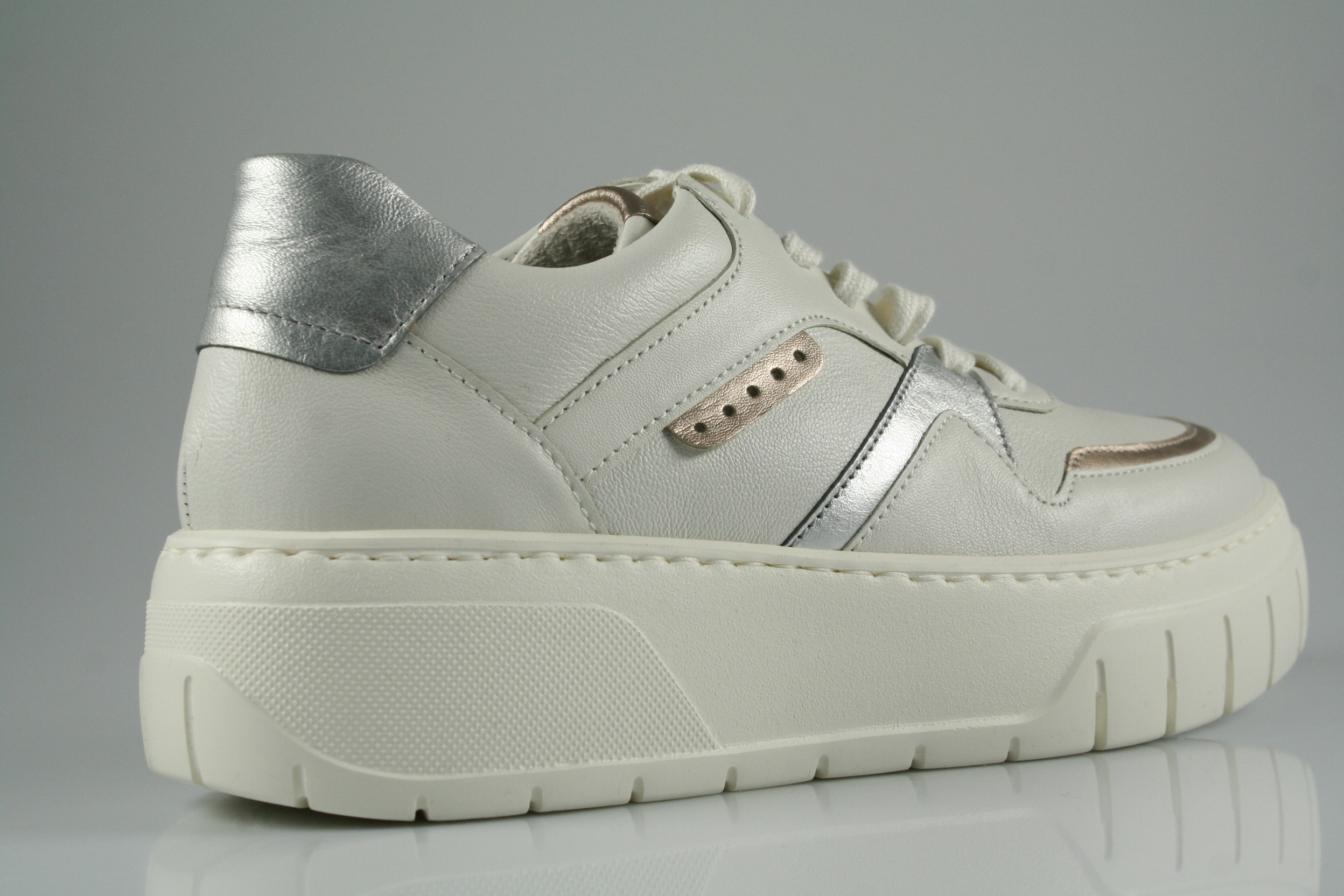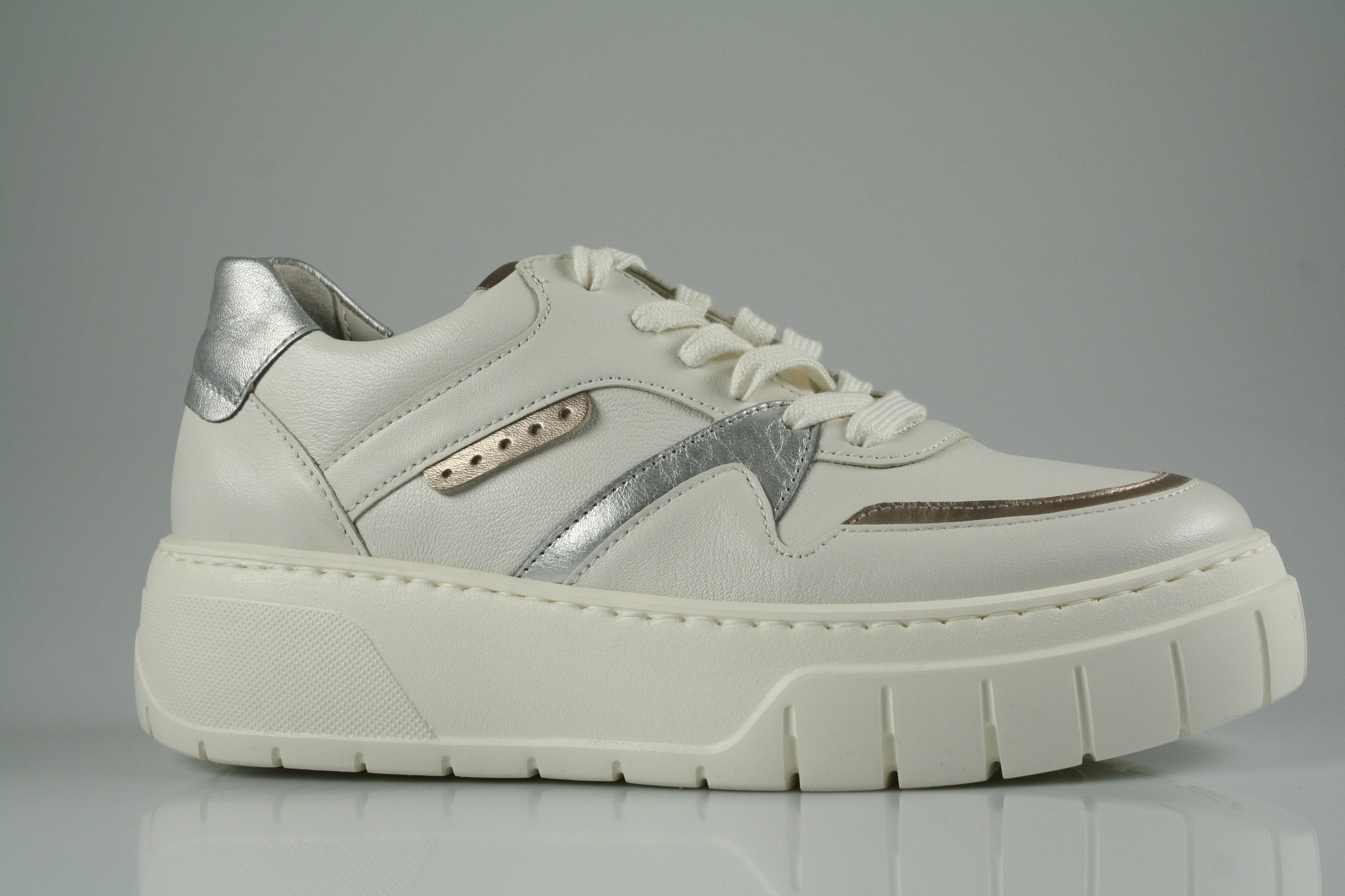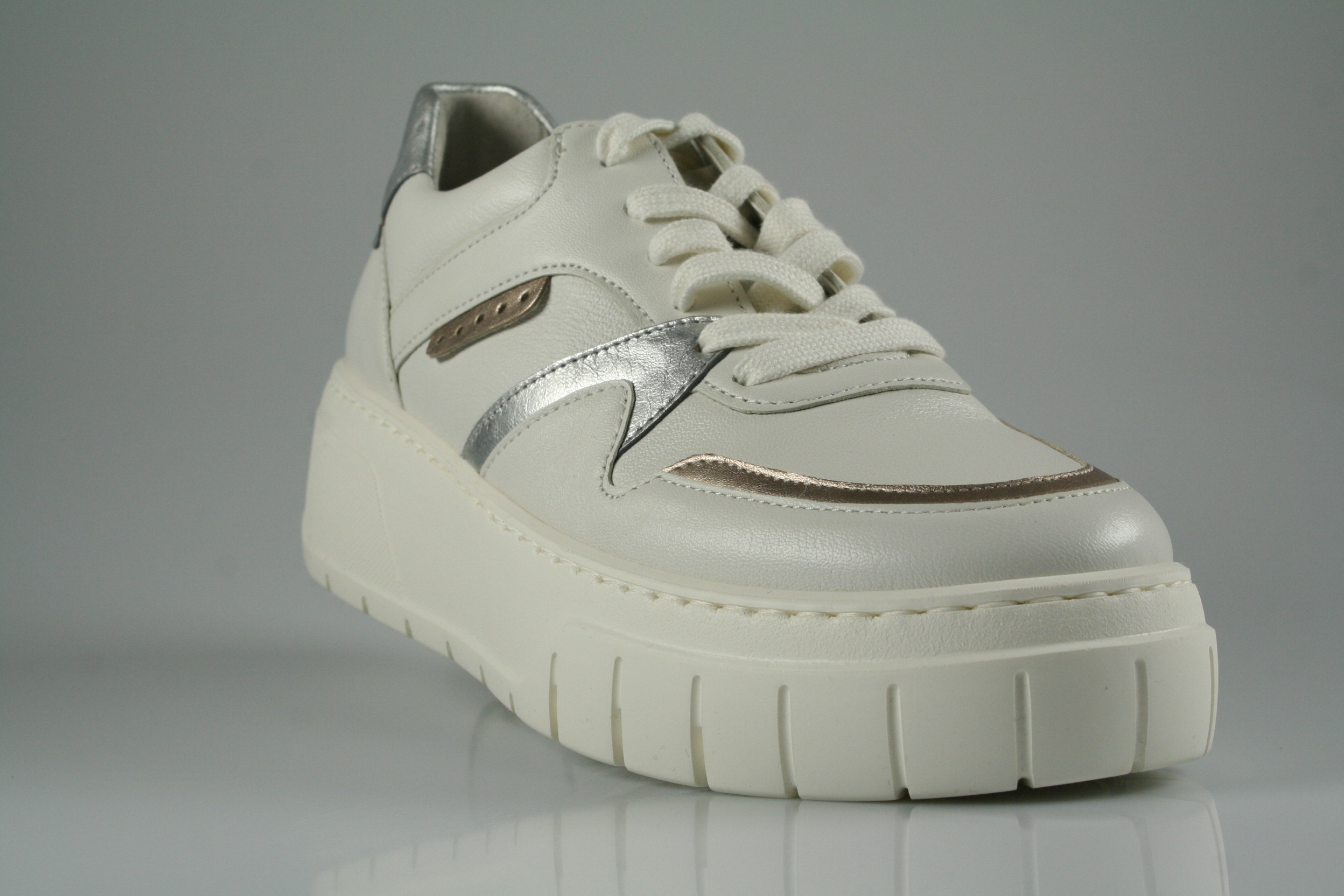 Typ: Sneaker; Farbe "latte/puder/silber"; Ausstattung:; - Obermaterial: Leder; - herausnehmbares Fußbett; - leichte Plateausohle; - gepolsterter Schaftrand; - Schnürsenkel zur Weitenregulierung