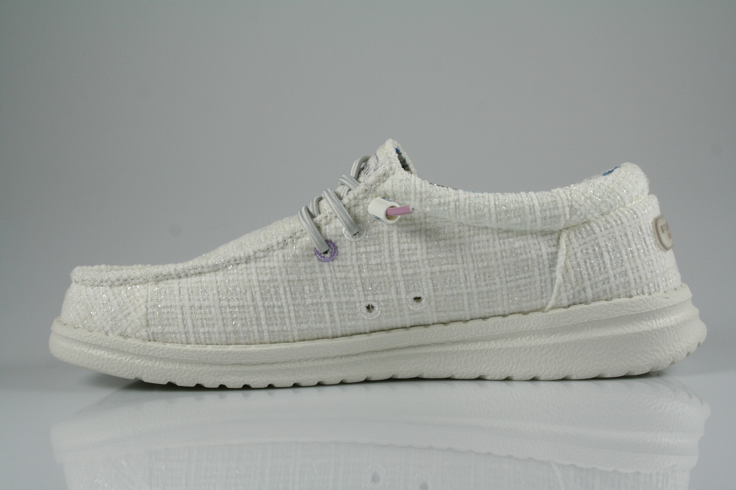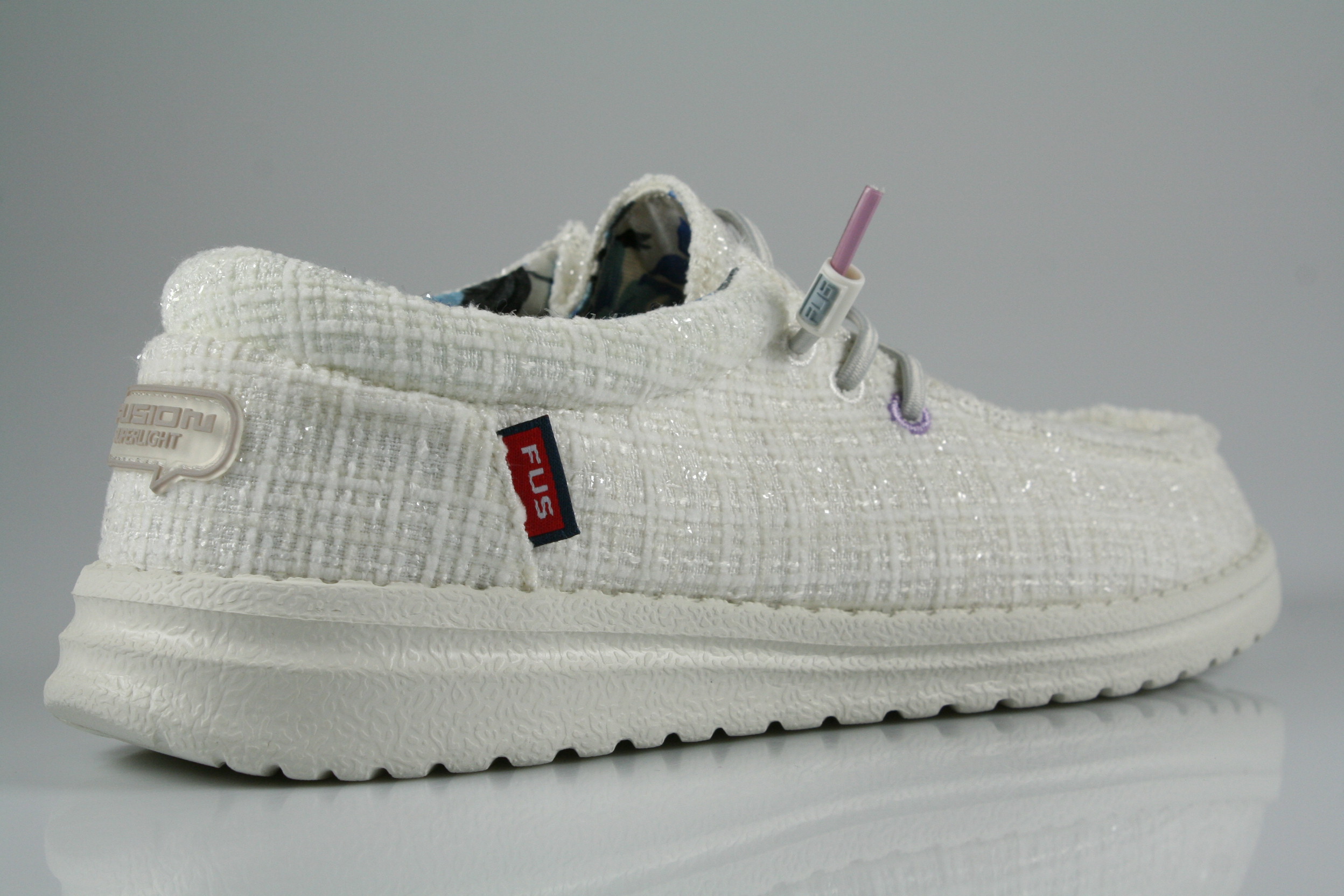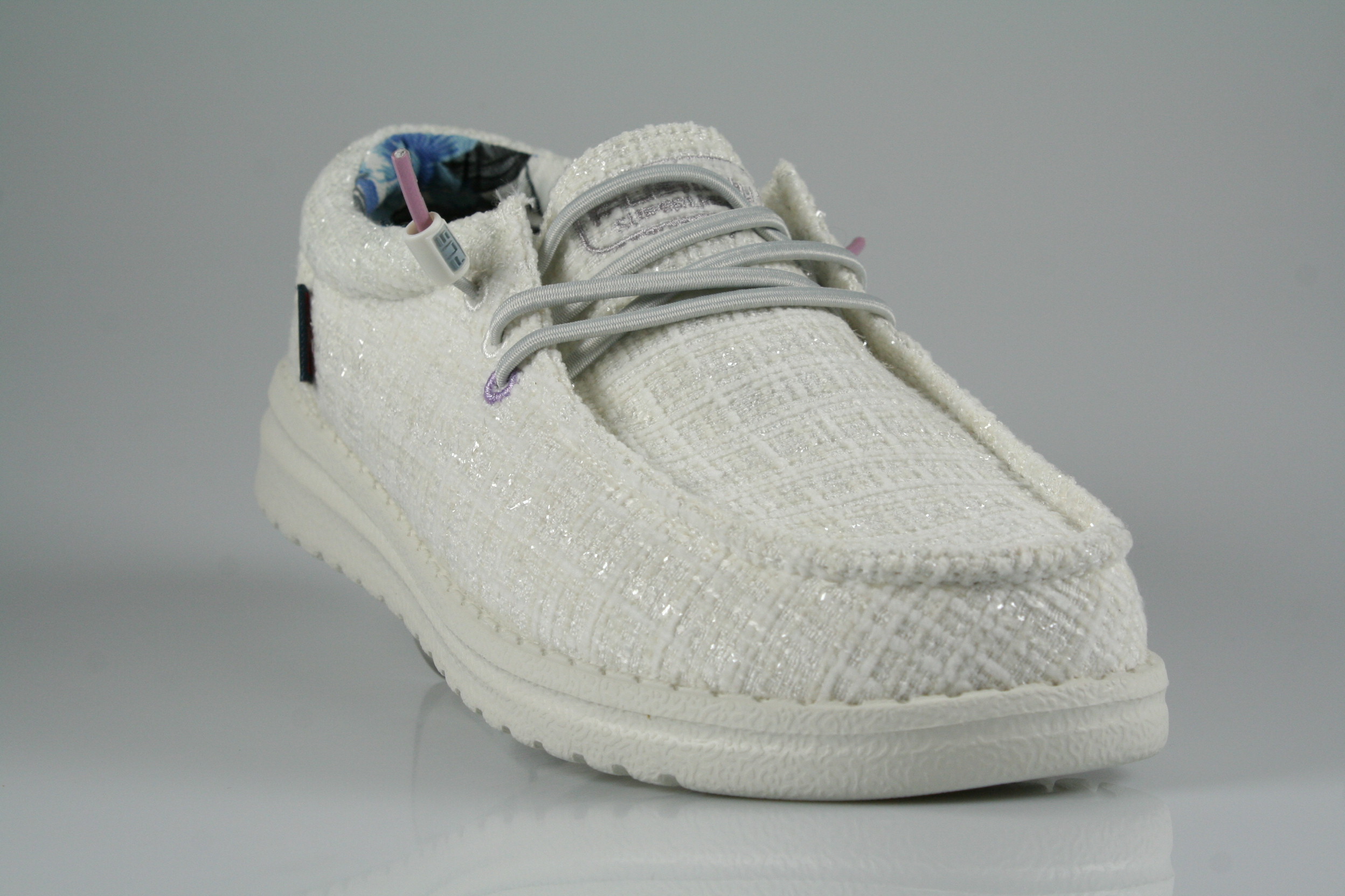 Typ: Halbschuh; Farbe "white/glitter"; Ausstattung:; - Obermaterial: Baumwolle; - herausnehmbares Fußbett; - superleichte Laufsohle; - gepolsterter Schaftrand; - Gummizug zur Weitenregulierung