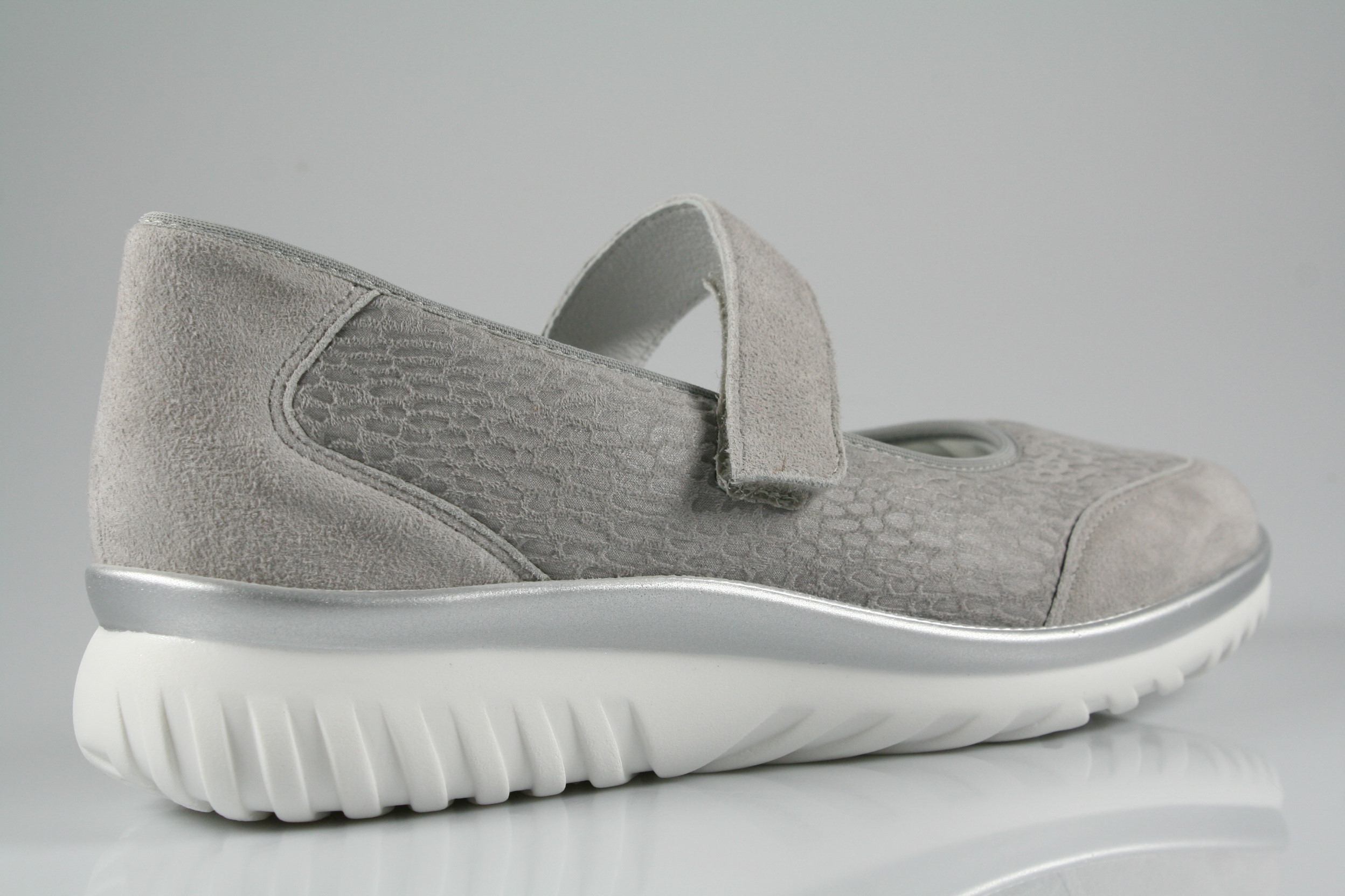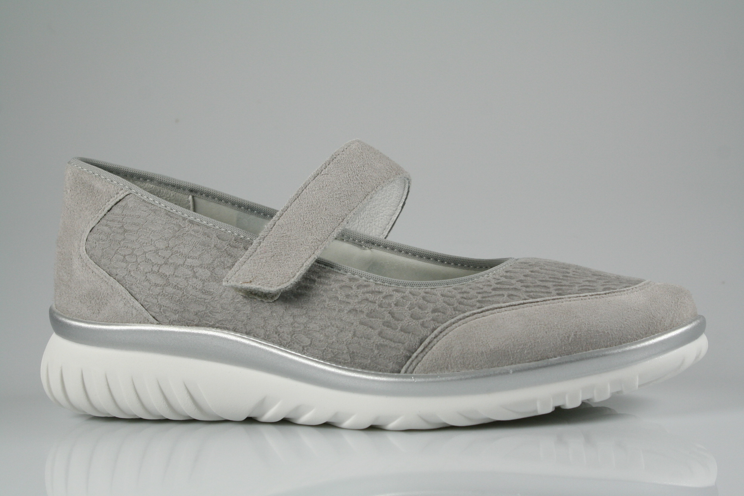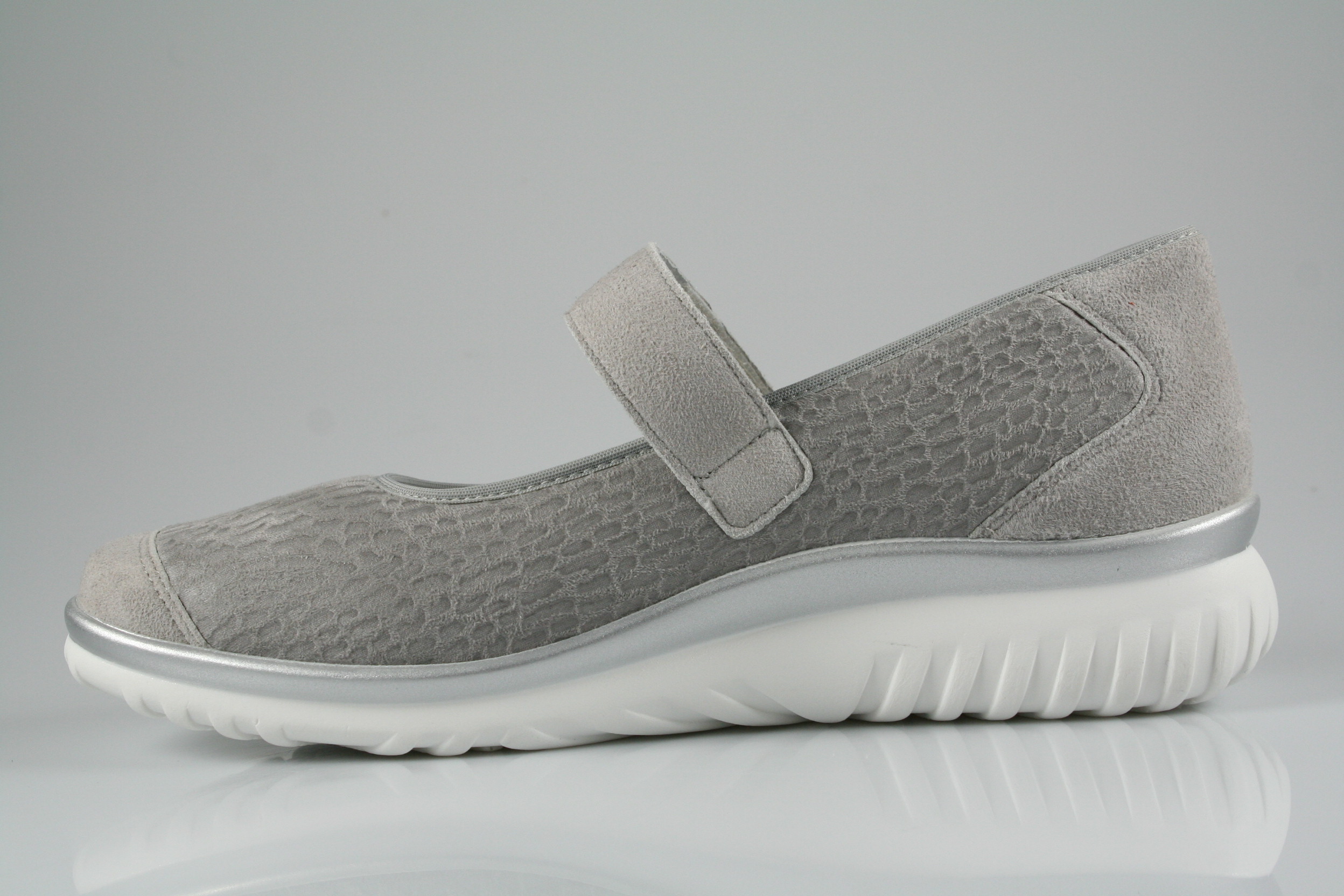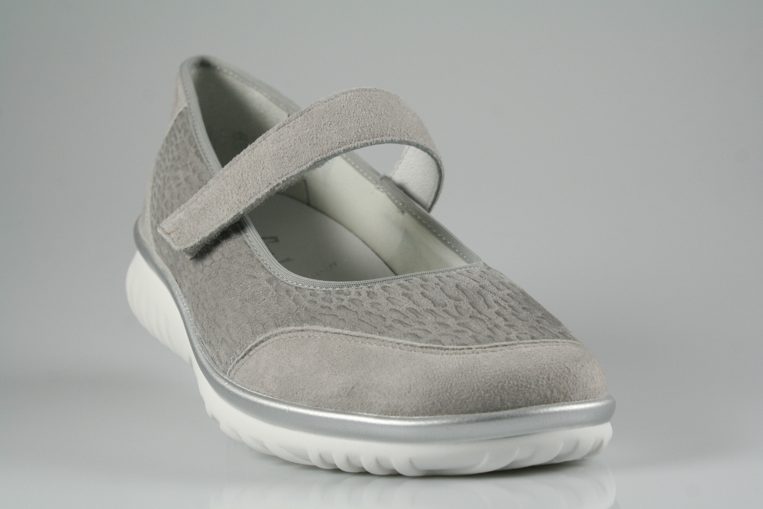 Typ: Ballerina; Farbe: "perle"; Ausstattung:; - Obermaterial: Nubukleder/Stretch; - weich gepolstertes Wechselfußbett; - atmungsaktives Futter; - leichte PU-Laufsohle; - Riemchen mit Klettverschluss; - elastischer Schaftrand