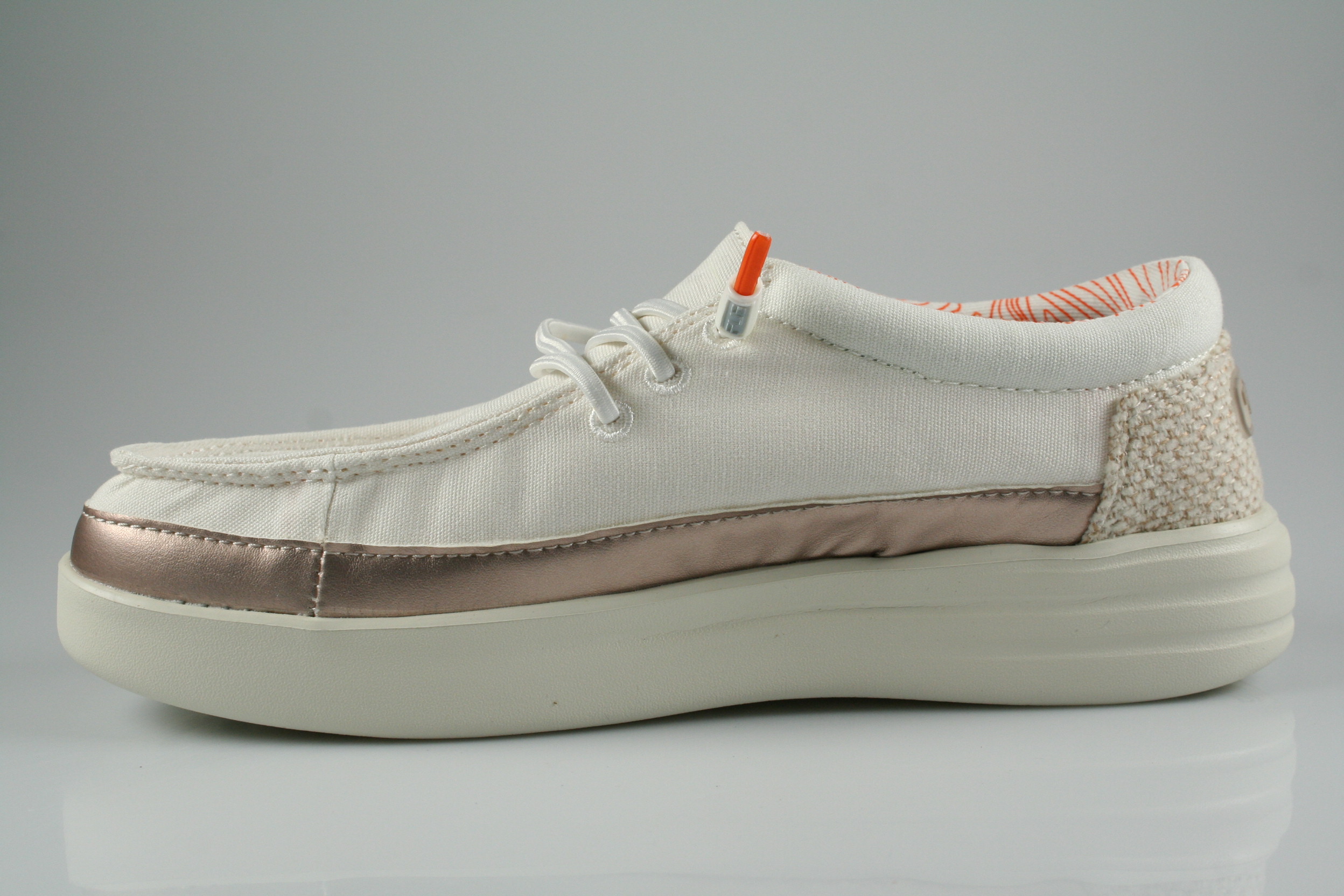 Typ: Halbschuh; Farbe "metallic white"; Ausstattung:; - Obermaterial: Leinen; - herausnehmbares Fußbett; - superleichte Laufsohle; - gepolsterter Schaftrand; - Gummizug zur Weitenregulierung