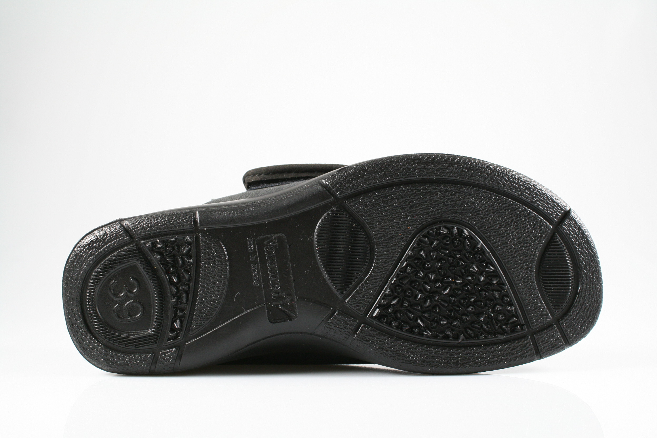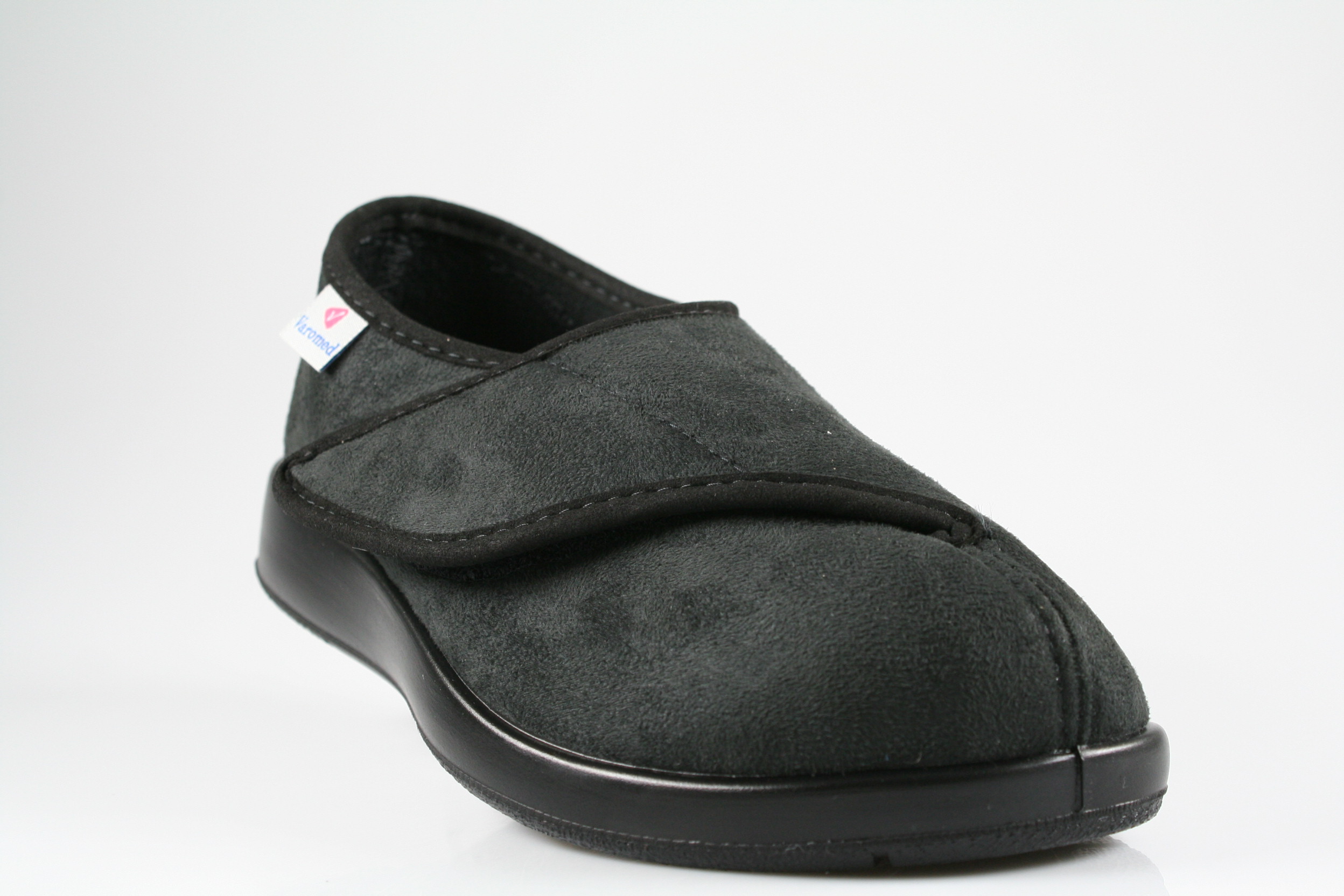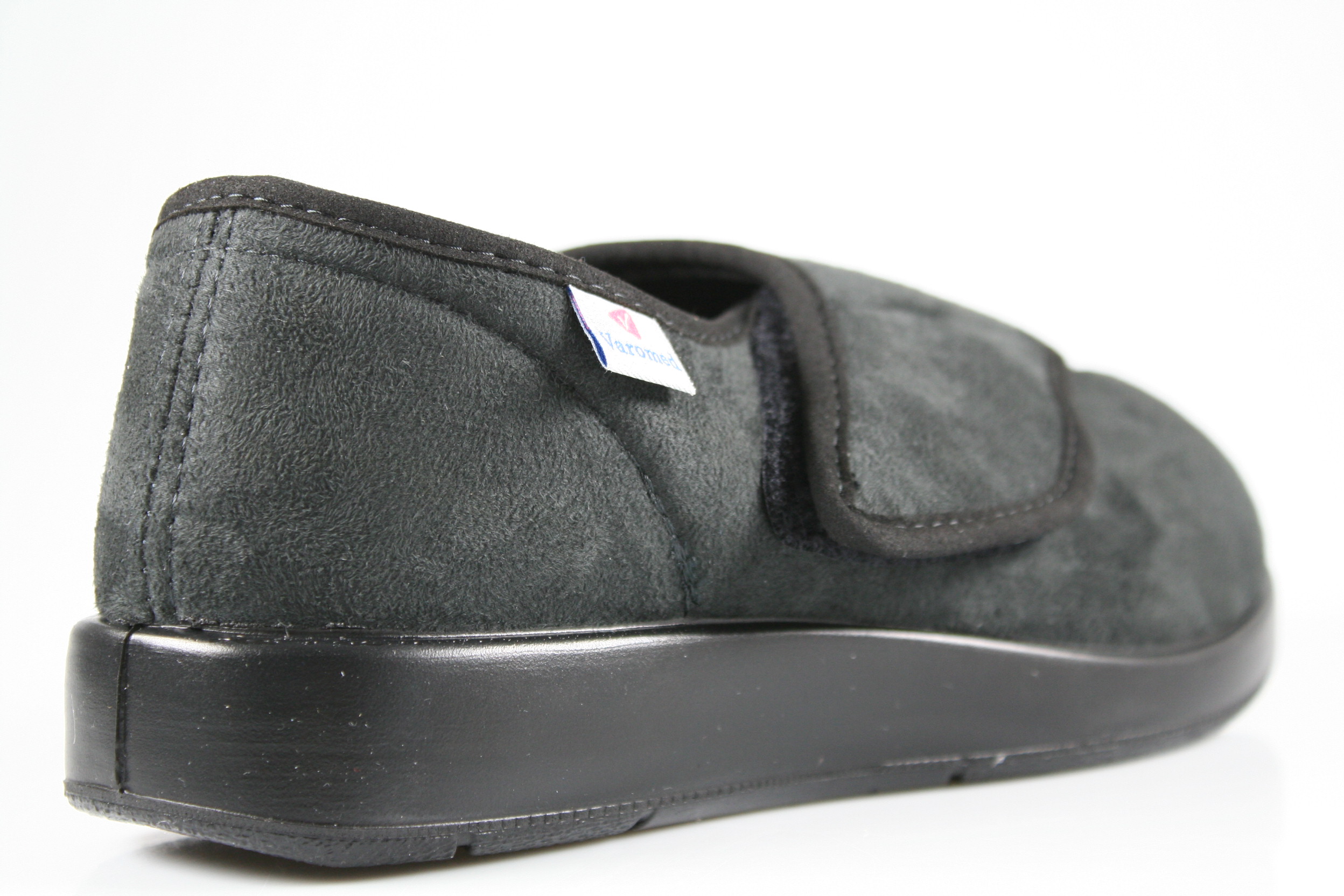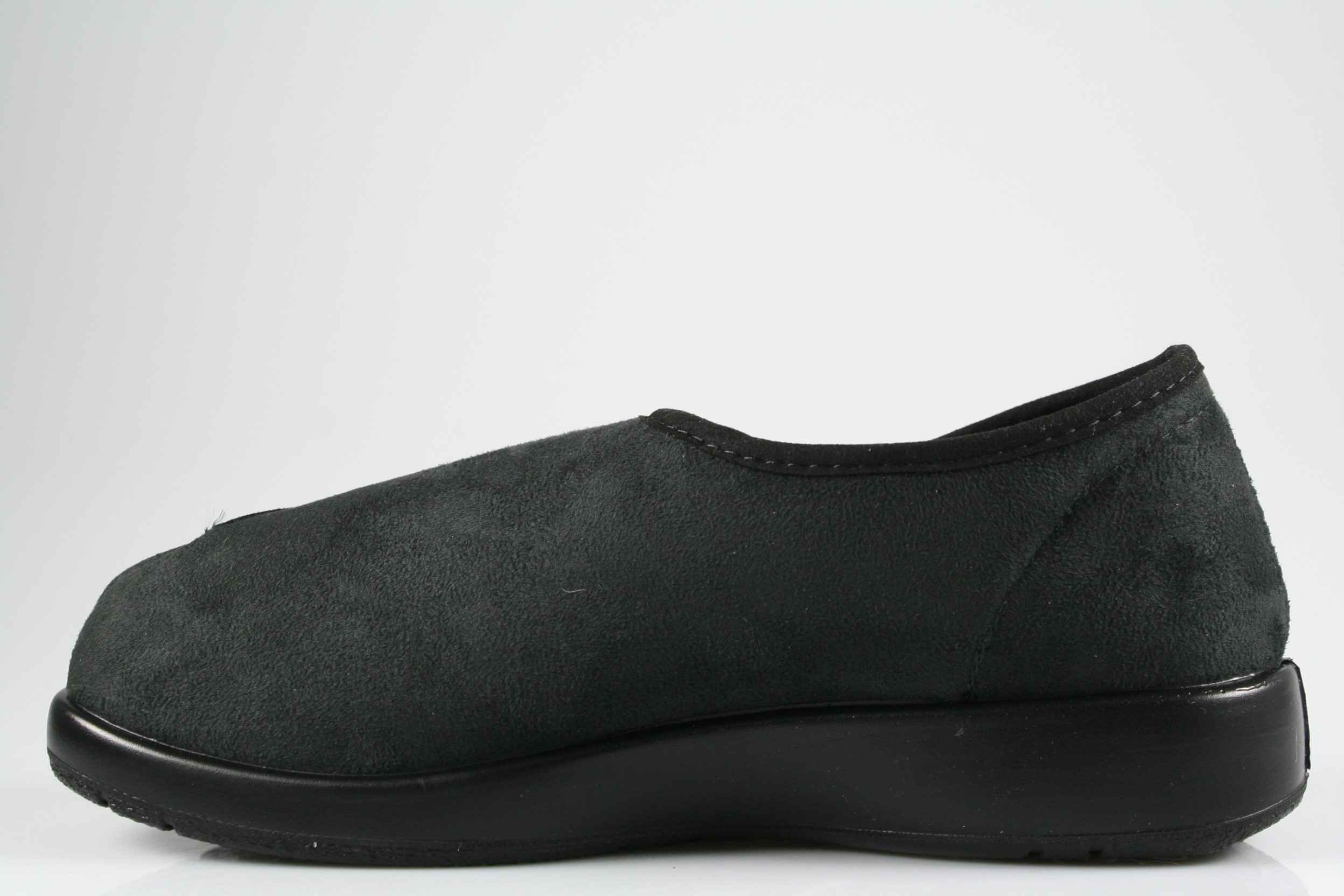Typ: Hausschuh (Verbandschuh); Farbe: schwarz; Ausstattung:; - Obermaterial: Velour; - herausnehmbares Fußbett; - leichte Laufsohle; - Weite "L", genügend Volumen für Wickelungen, Verbände und Bettungen ; - Klettverschluss für einfache Handhabung