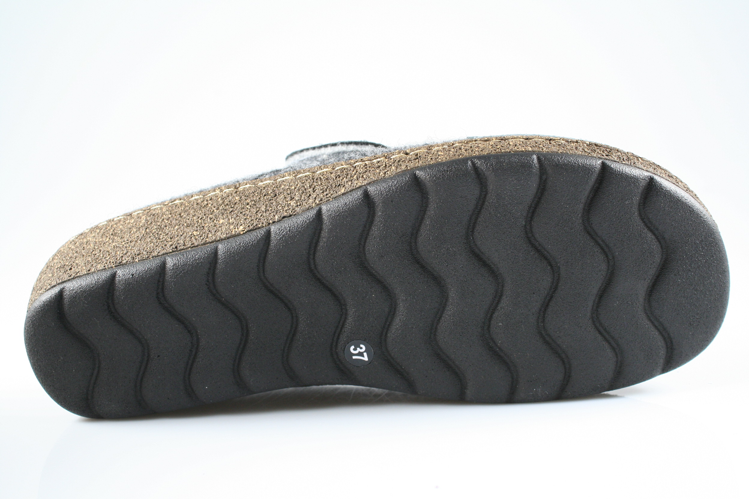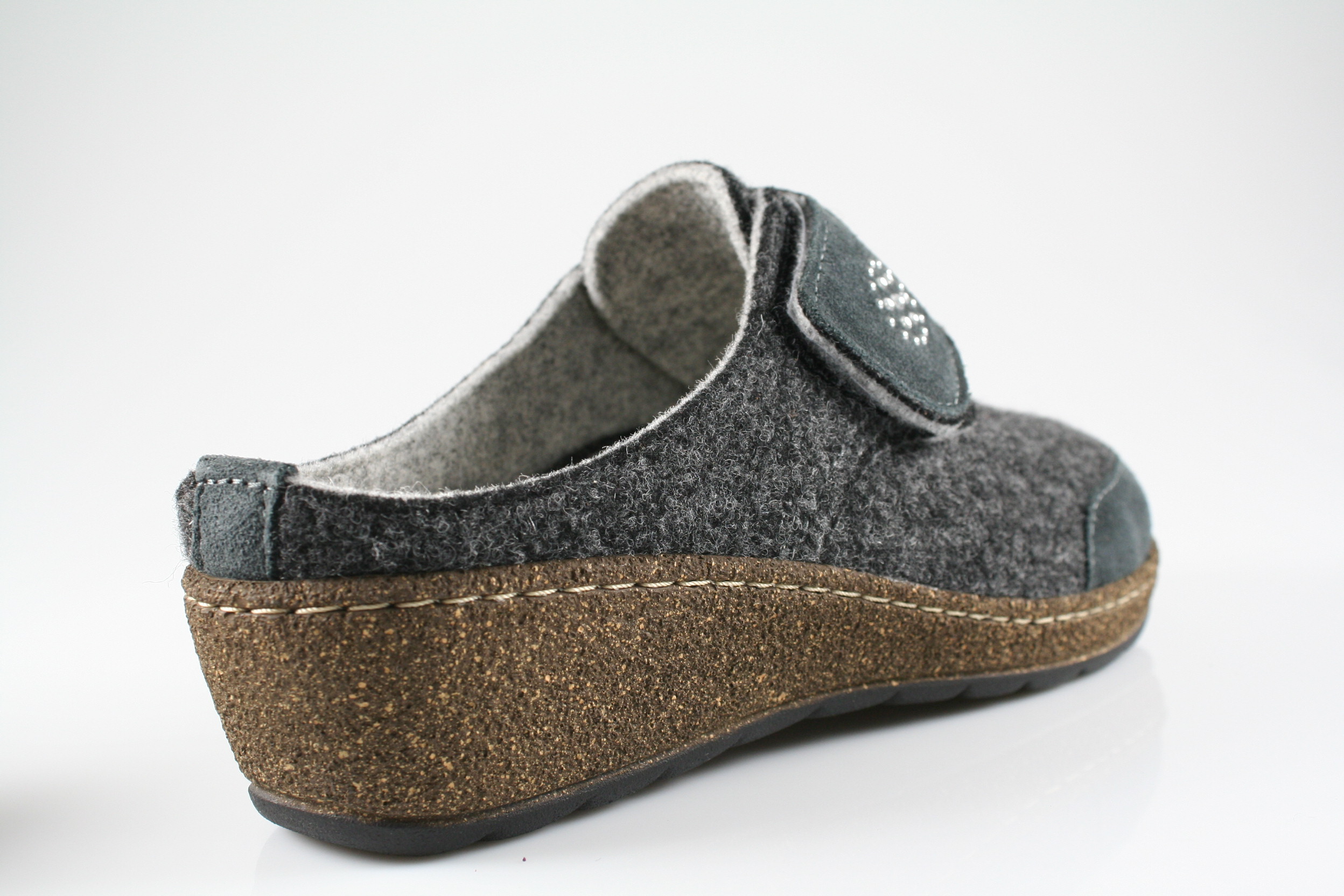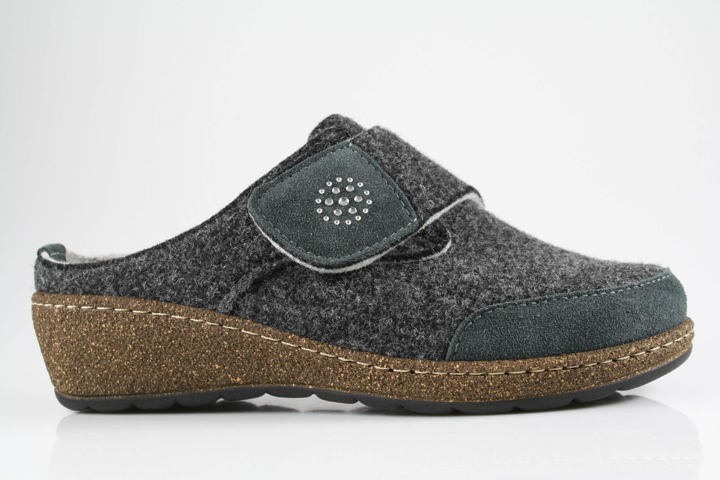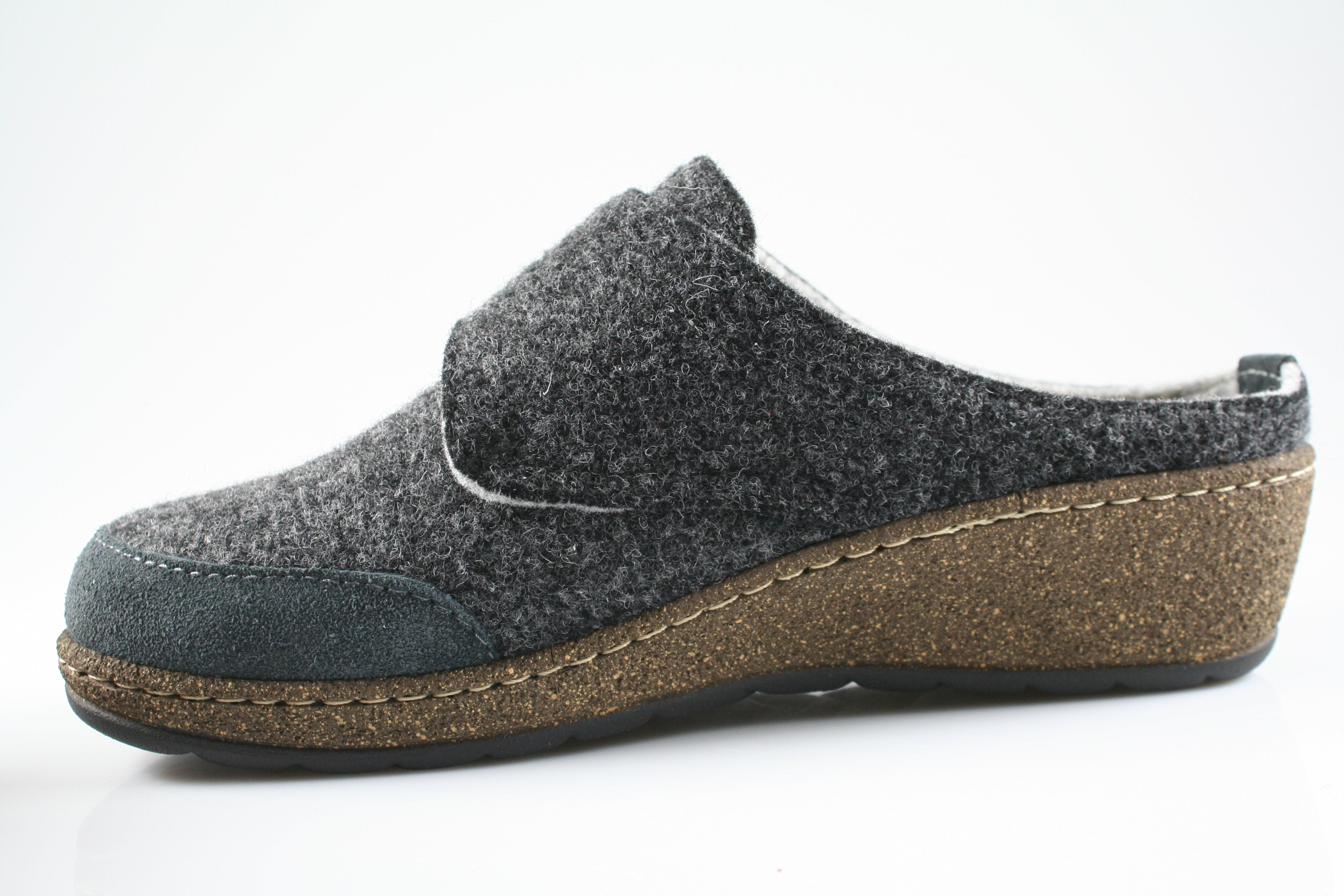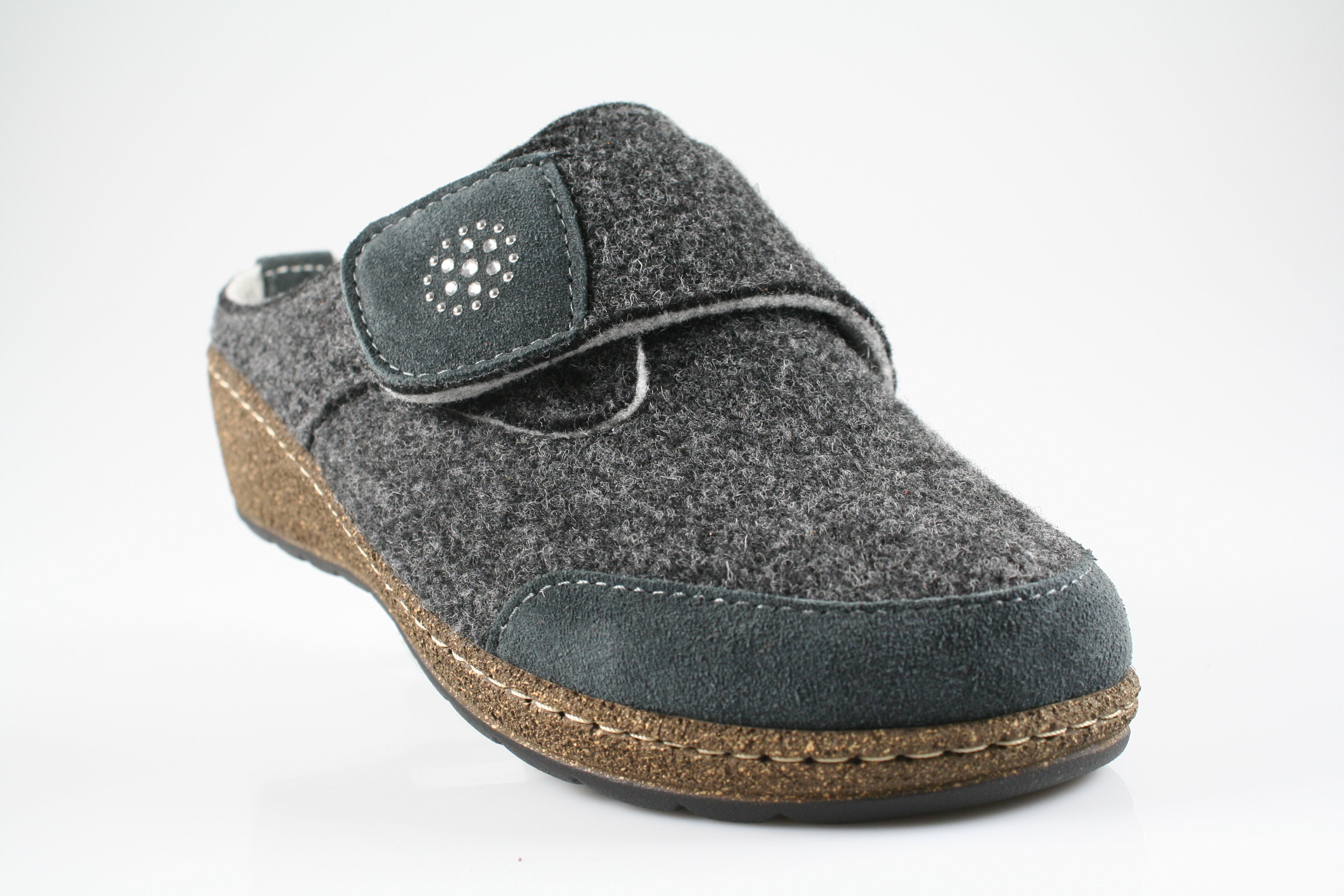 Typ: Hausschuh; Farbe: grau; Ausstattung:; - Obermaterial: Filz; - herausnehmbares Fußbett; -leichte Laufsohle; - klettverschluss zur Weitenregulierung