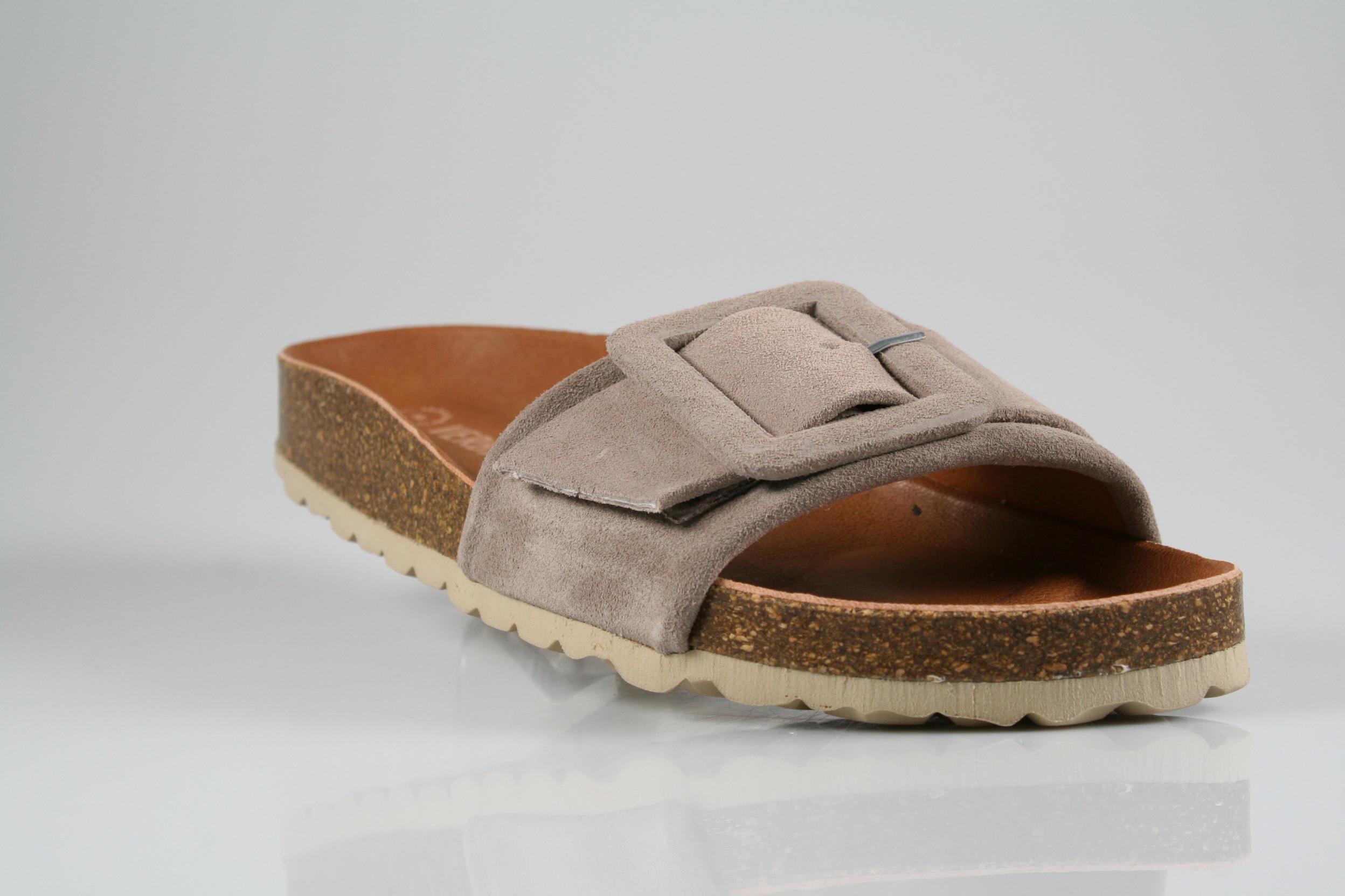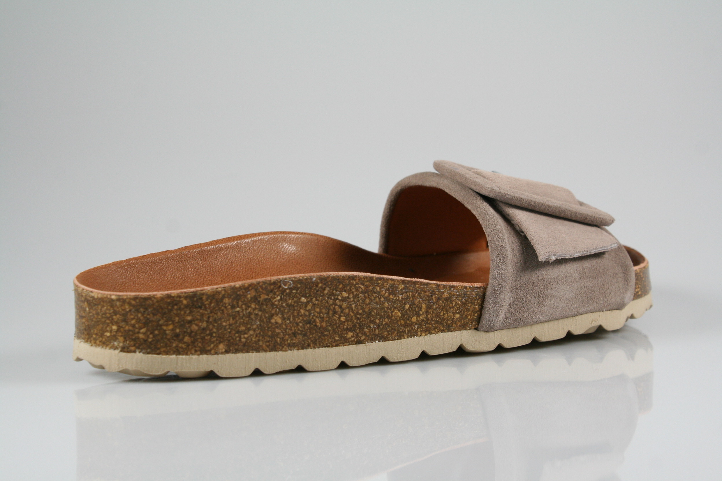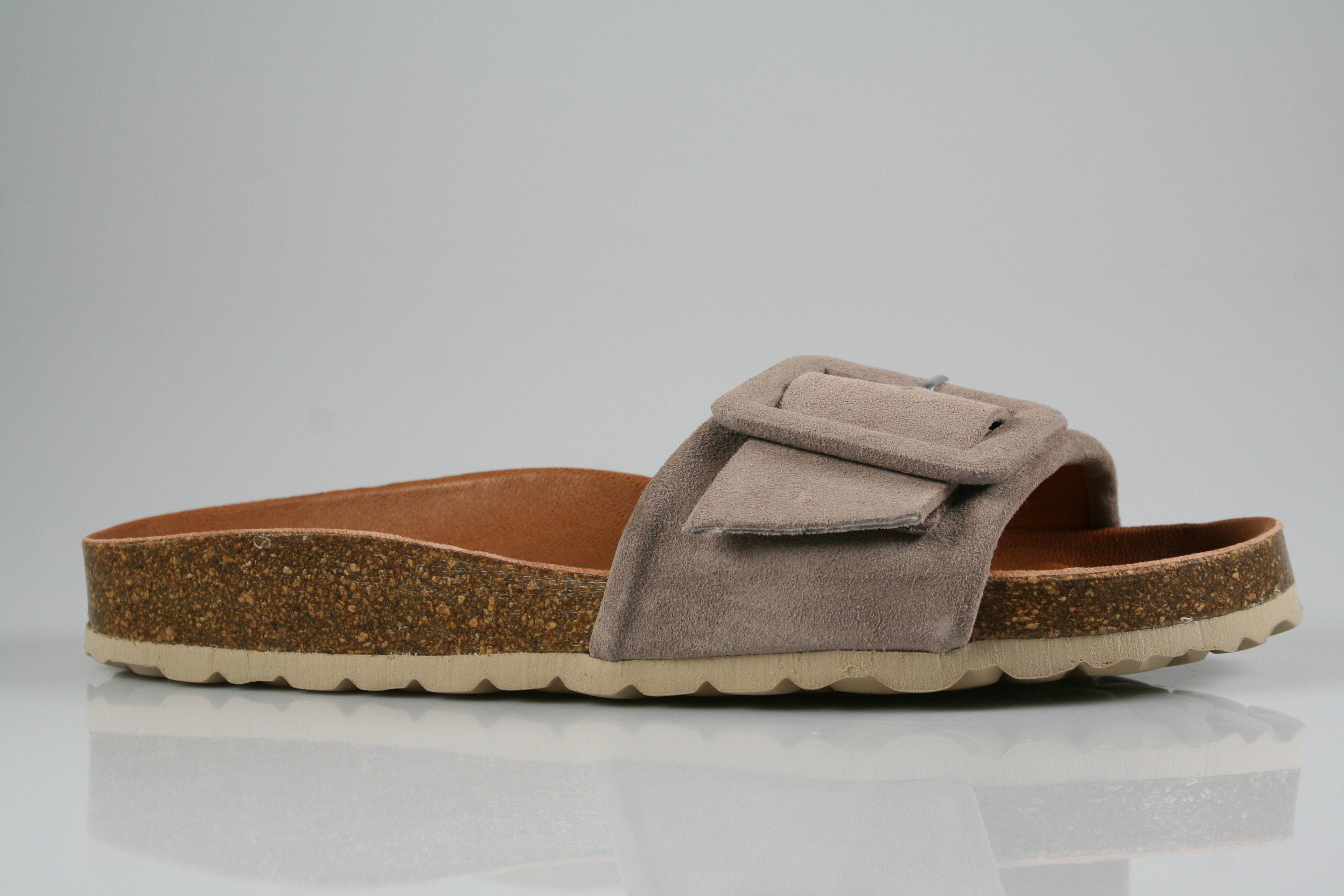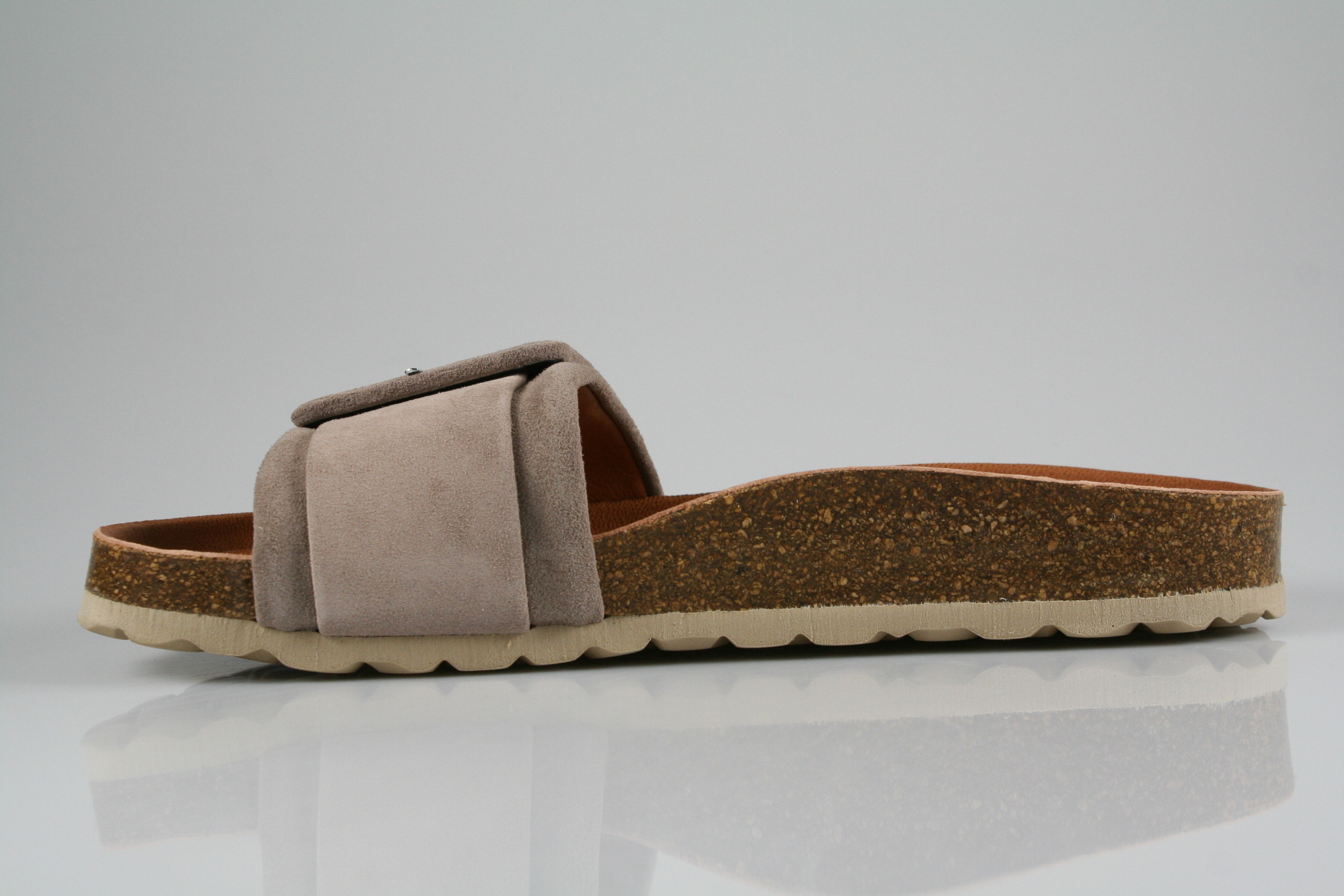 Typ: Pantolette; Farbe: "piedra"; Ausstattung:; - Obermaterial: Velourleder; - Kork-/Lederfußbett; - leichte Laufsohle; - Riemchen zur Weitenregulierung