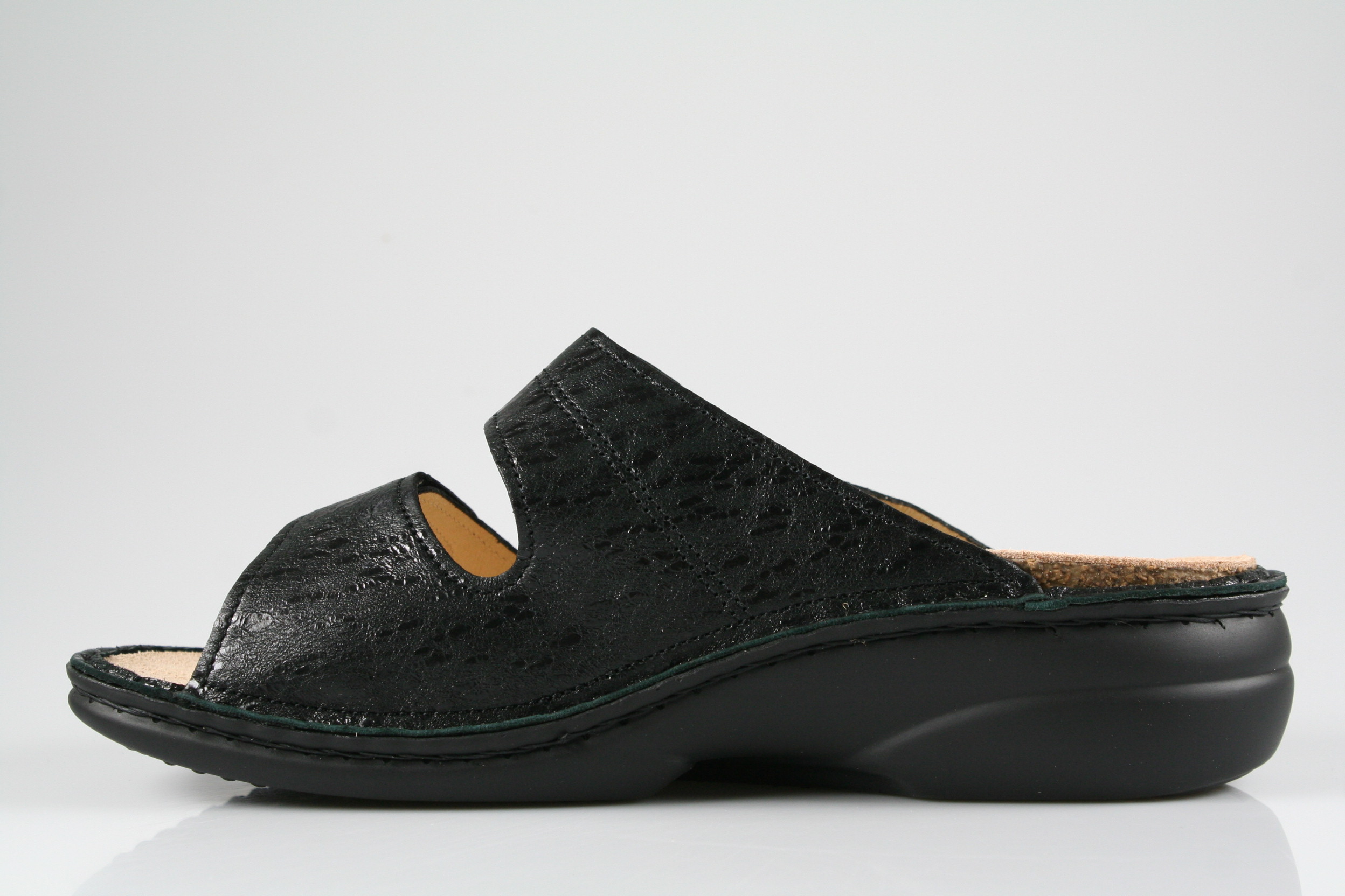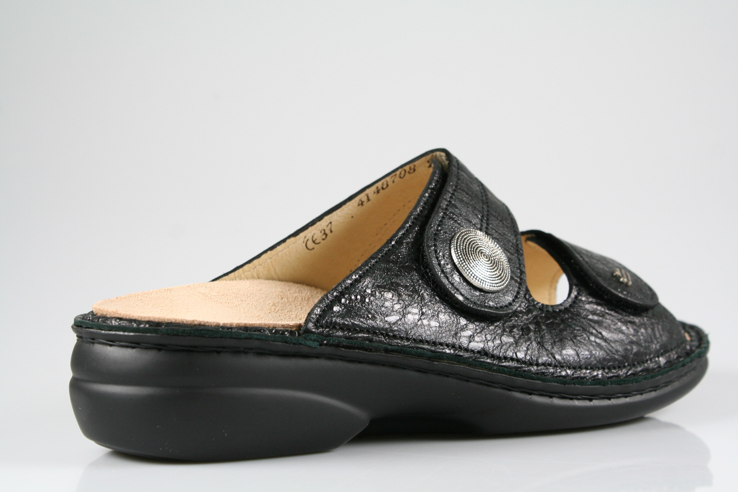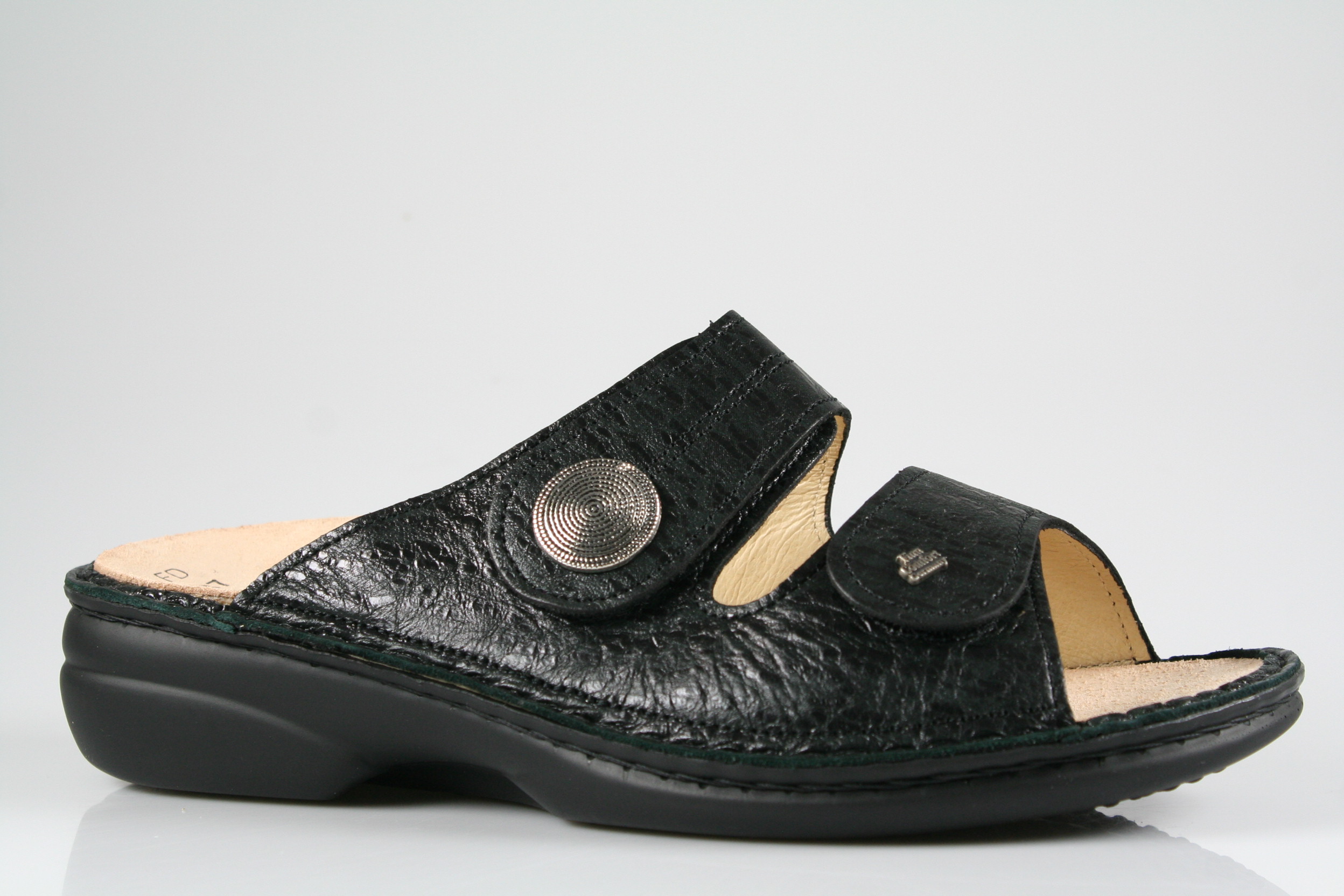 Typ: Pantolette; Farbe "black"; Ausstattung:; - Obermaterial: Leder; - herausnehmbares Fußbett; - leichte Laufsohle; - gepolsterter Schaftrand; - Klettverschluss zur Weitenregulierung