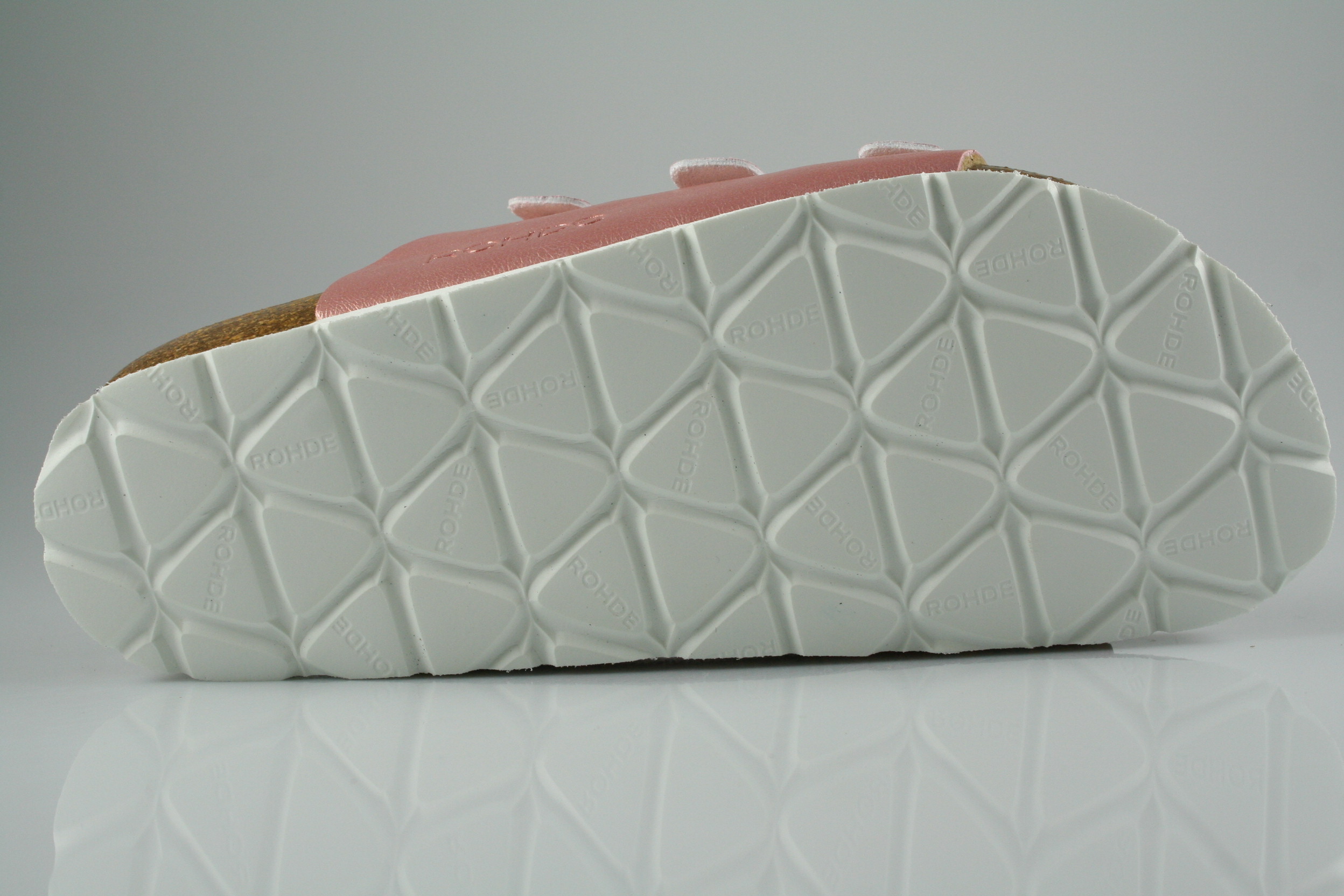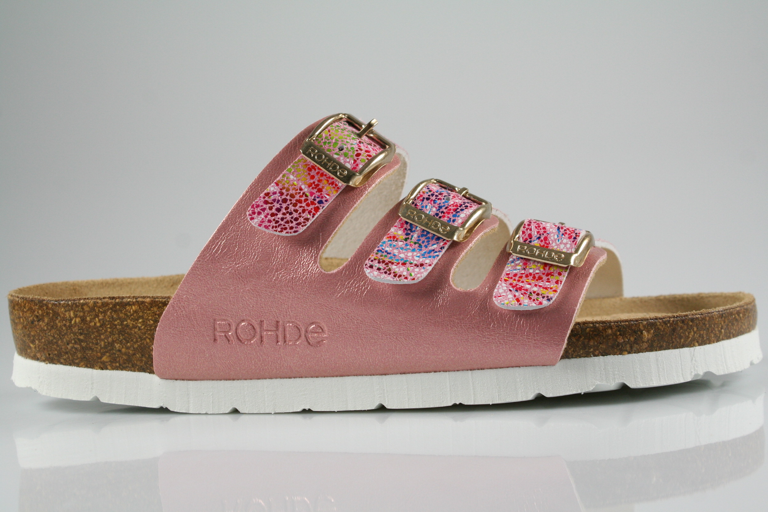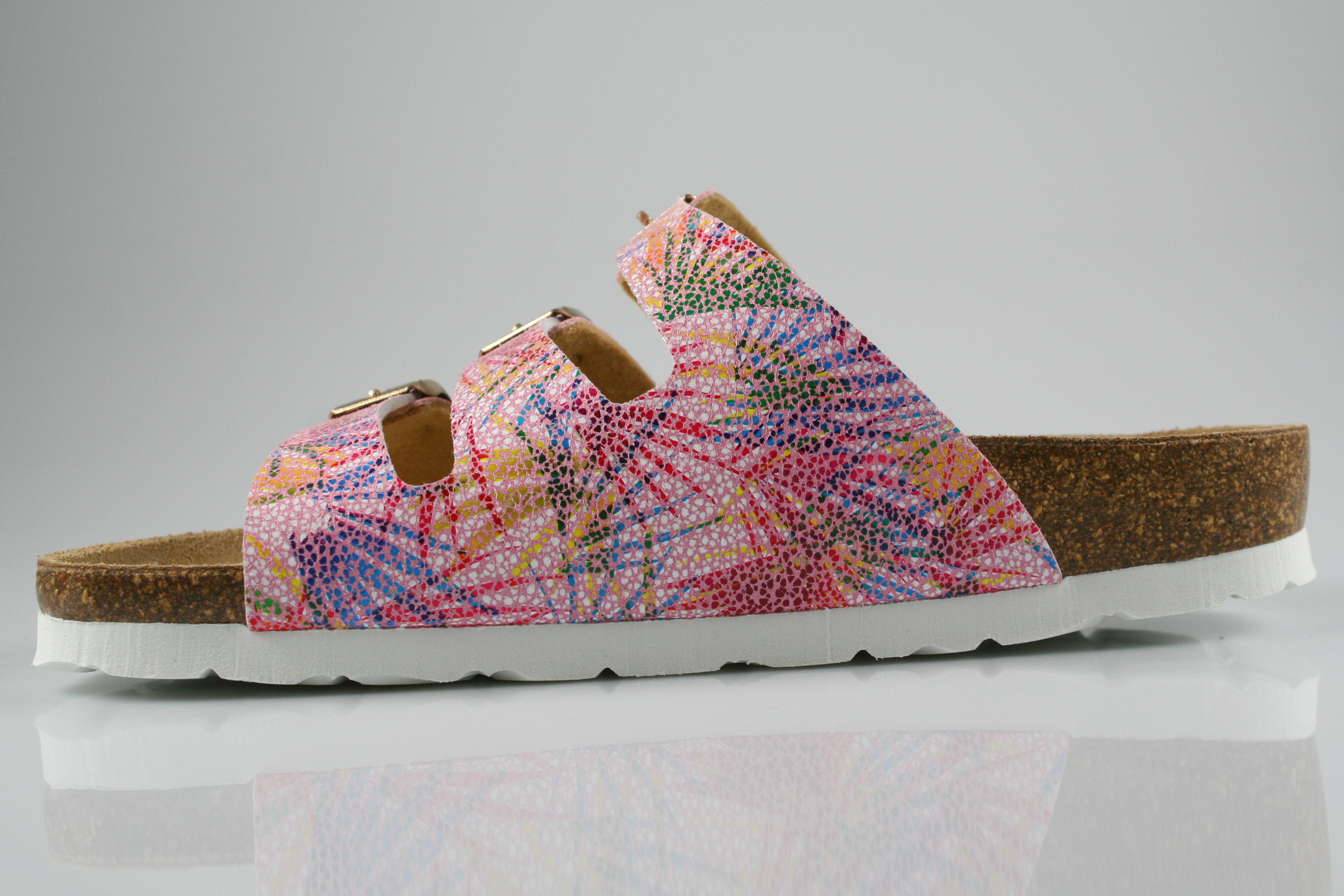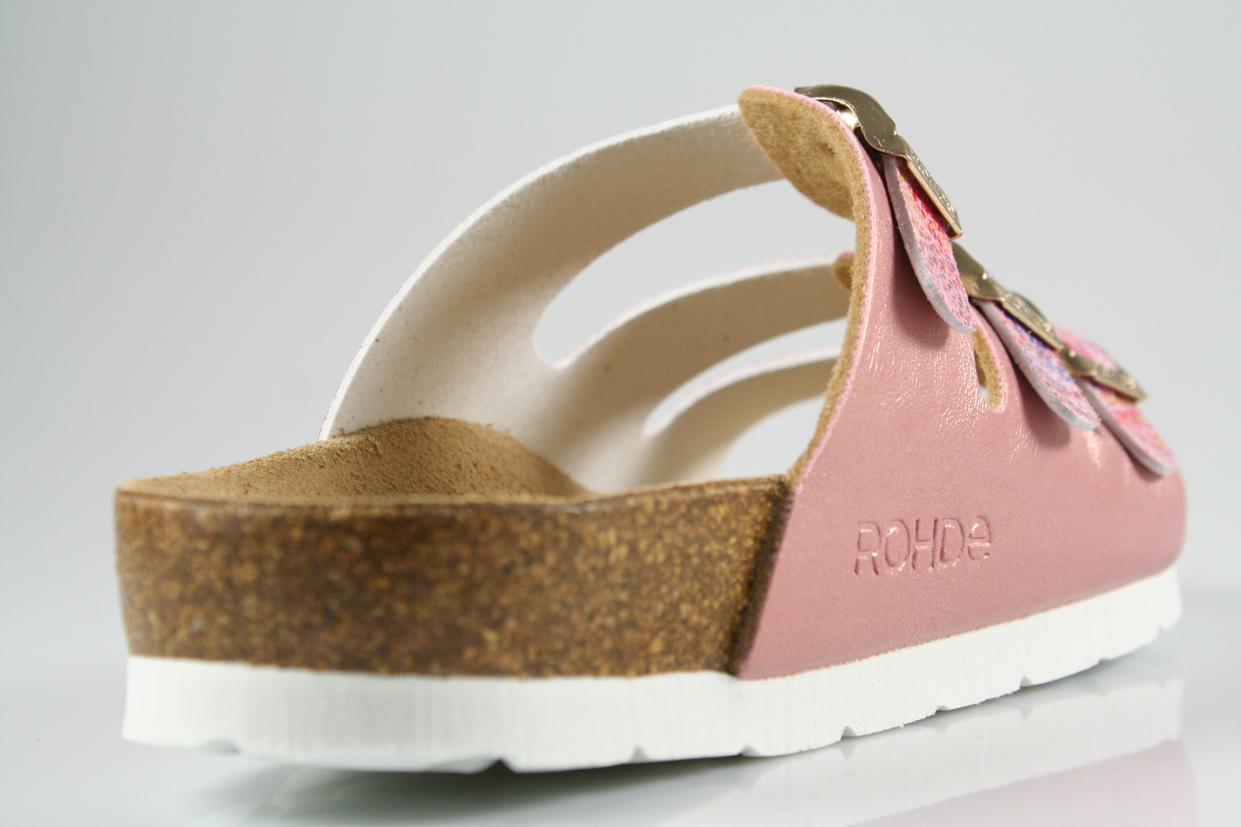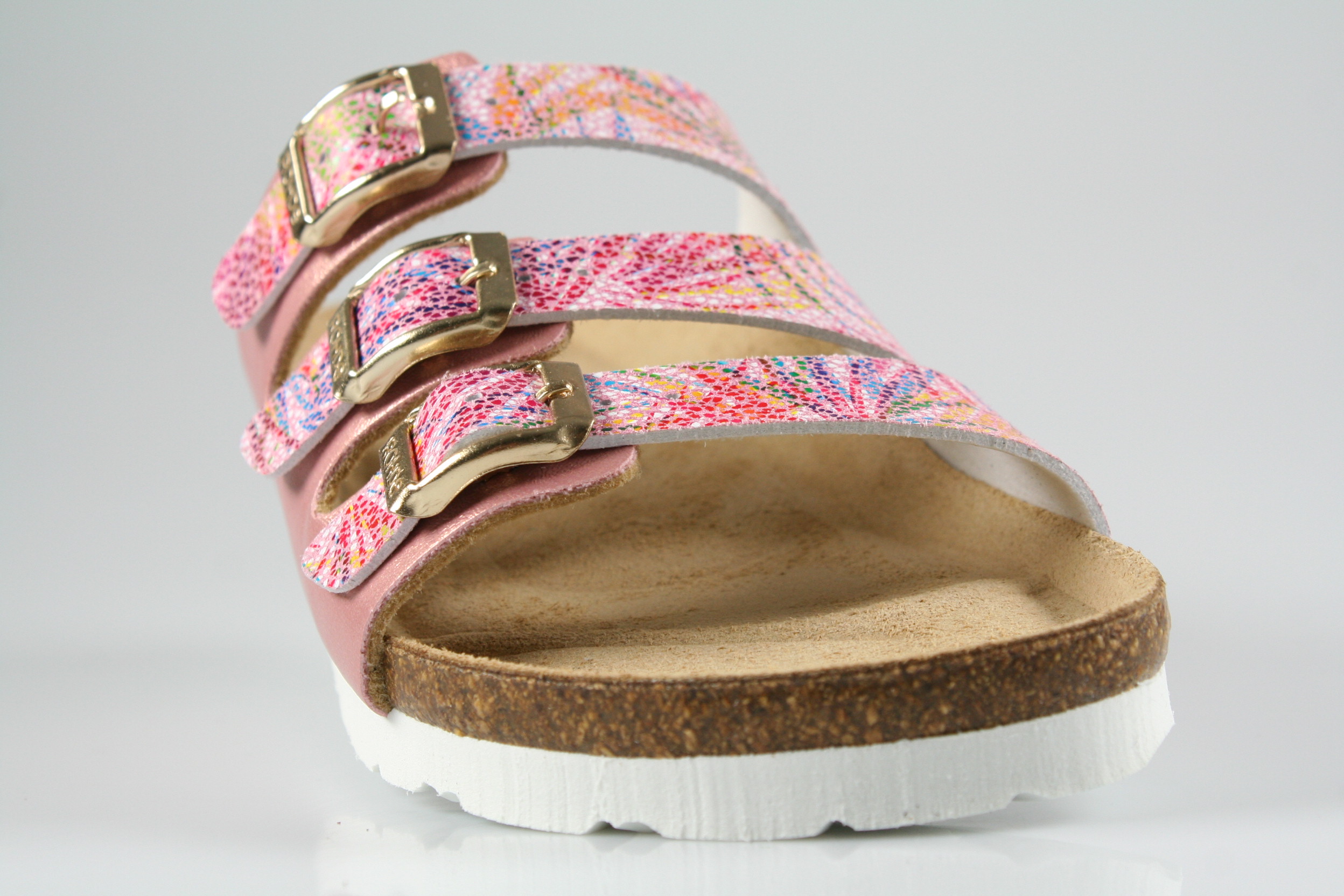 Typ: Pantolette; Farbe: "rose"; Ausstattung:; - Obermaterial: Softino bedr./Metallino; - weich gepolstertes Kork-Leder-Fußbett; - Leichtzell-Laufsohle; - Riemchen mit Schnallen