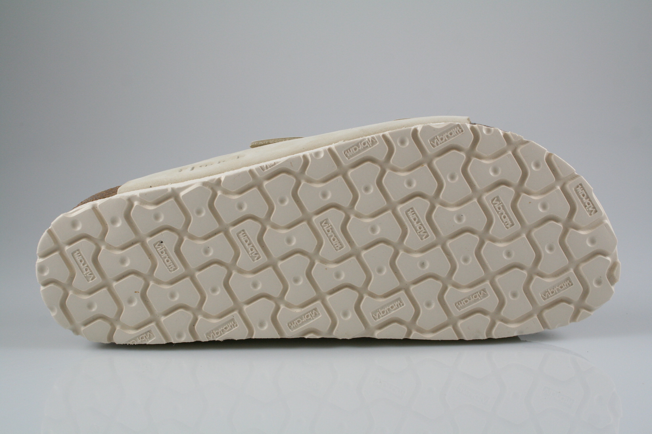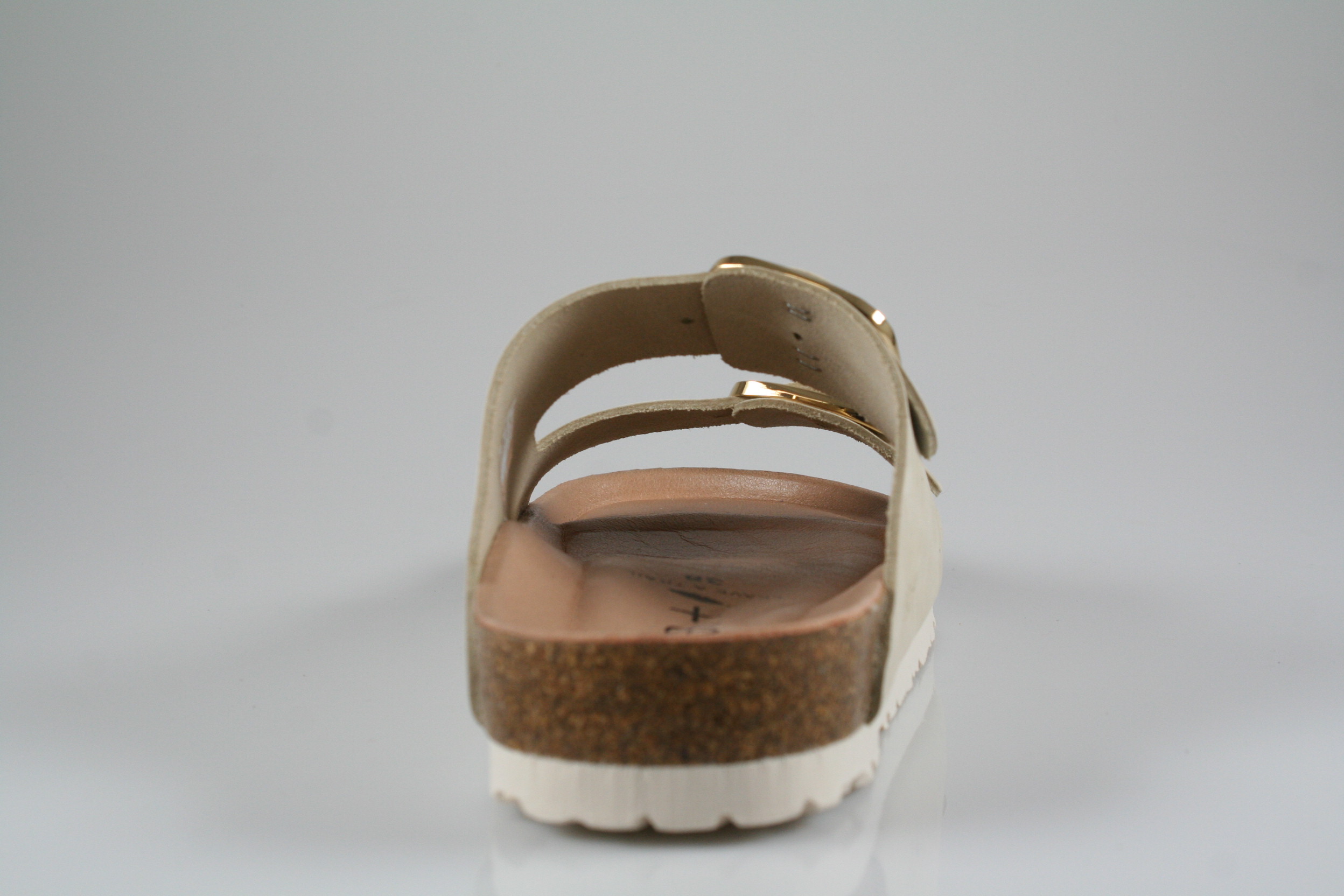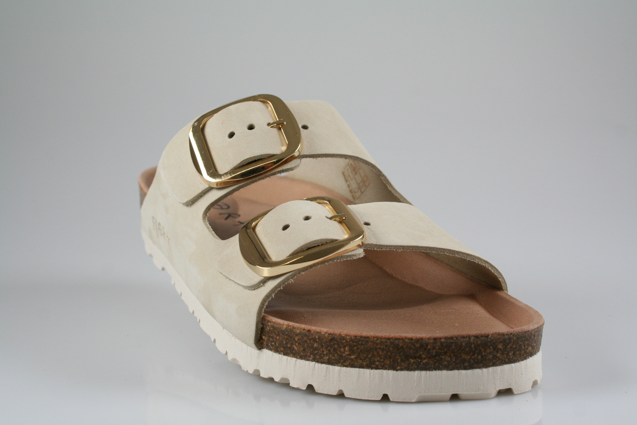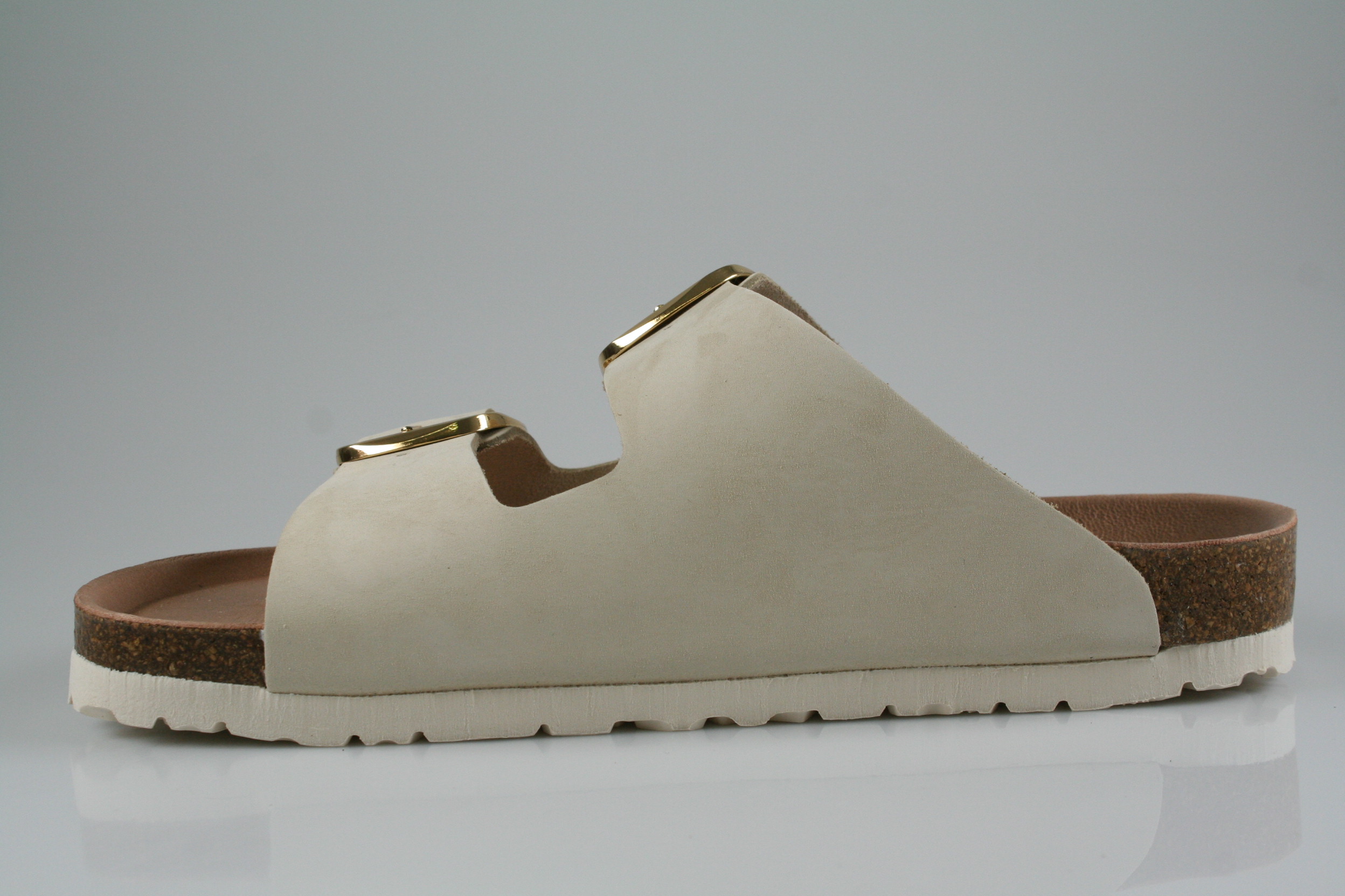 Typ: Pantolette; Farbe: "beige"; Ausstattung:; - Obermaterial: Leder; - Kork-Lederfußbett; - Leichtzellsohle; - Riemchen mit Schnalle;