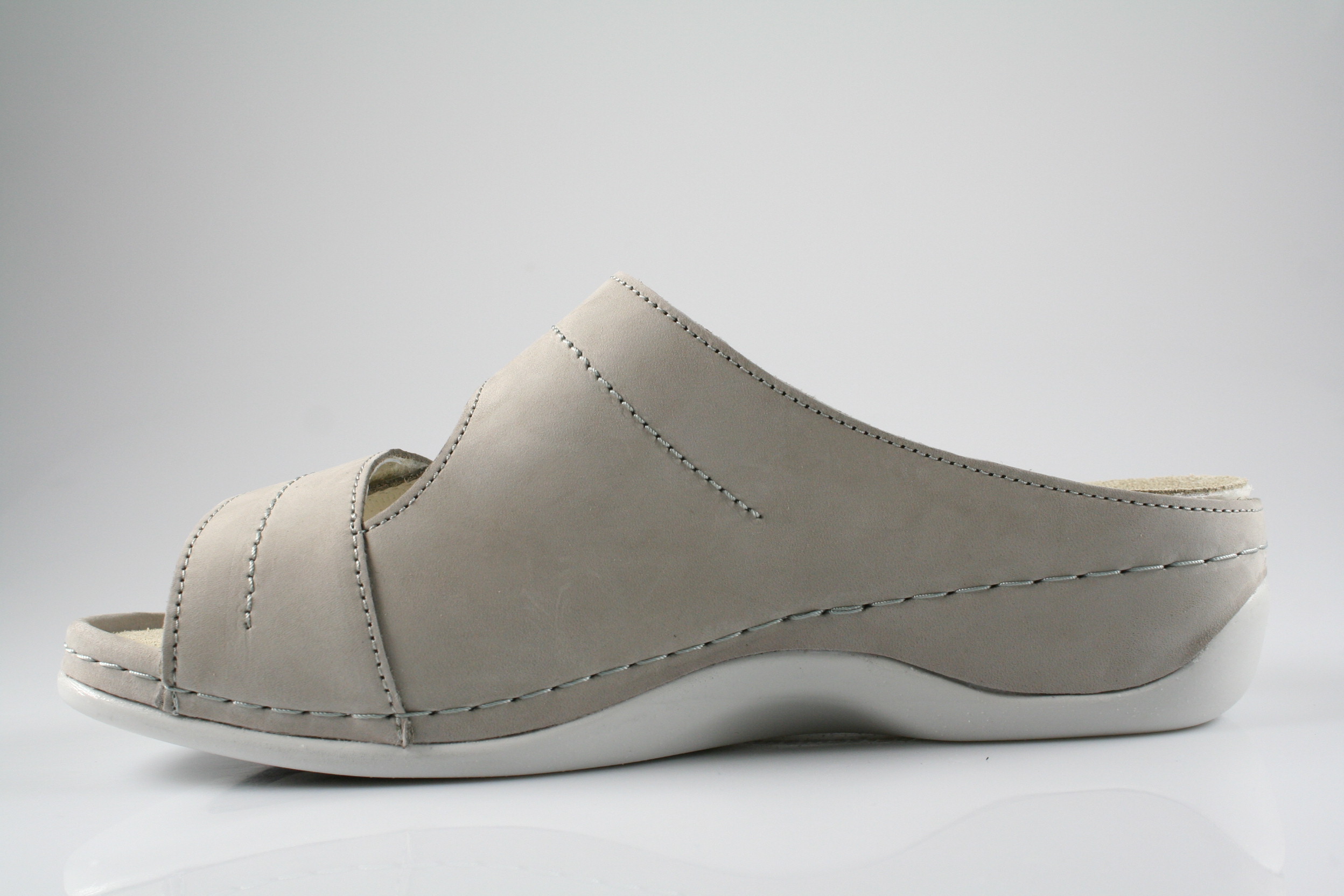 Typ: Pantolette; Farbe: "grau"; Ausstattung:; - Obermaterial: Nubukleder; - Lederfutter; - lederbezogenes Wechselfußbett; - Doppelklette; - flexible Gummisohle; - Modell "Franziska"