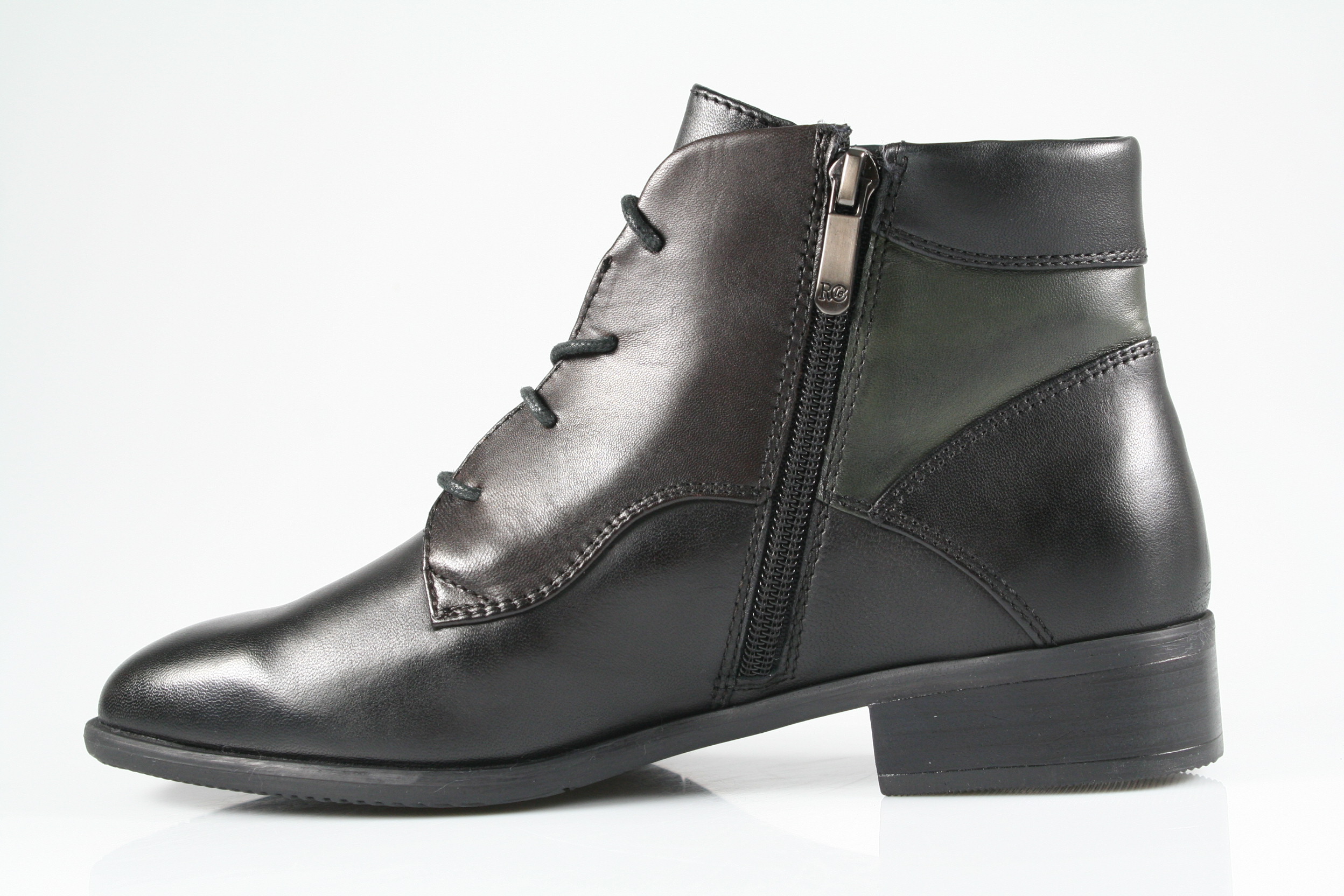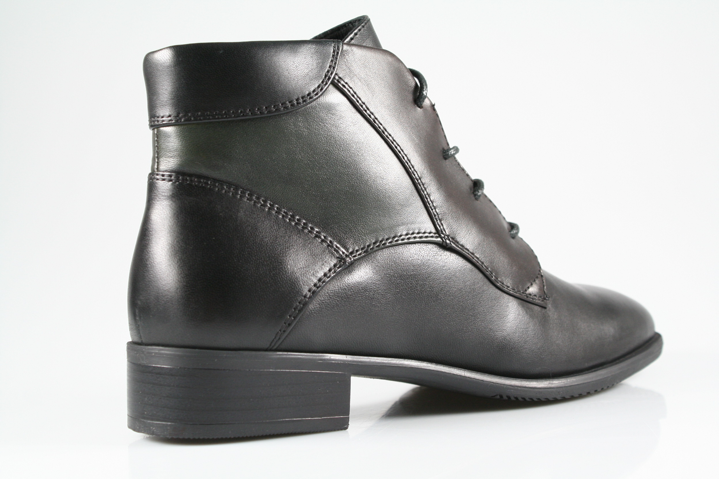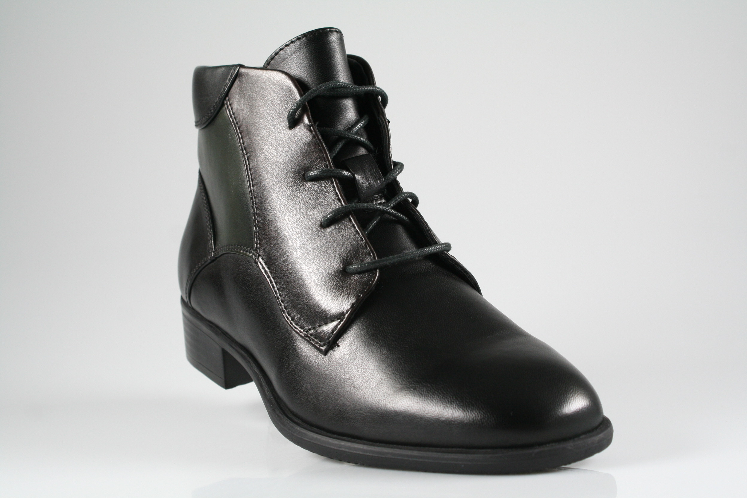 Typ: Stiefelette; Farbe "black"; Ausstattung:; - Obermaterial: Glattleder; - weiches Fußbett; - leichte Laufsohle; - gepolsterter Schaftrand; - Schnürsenkel und Reißverschluss