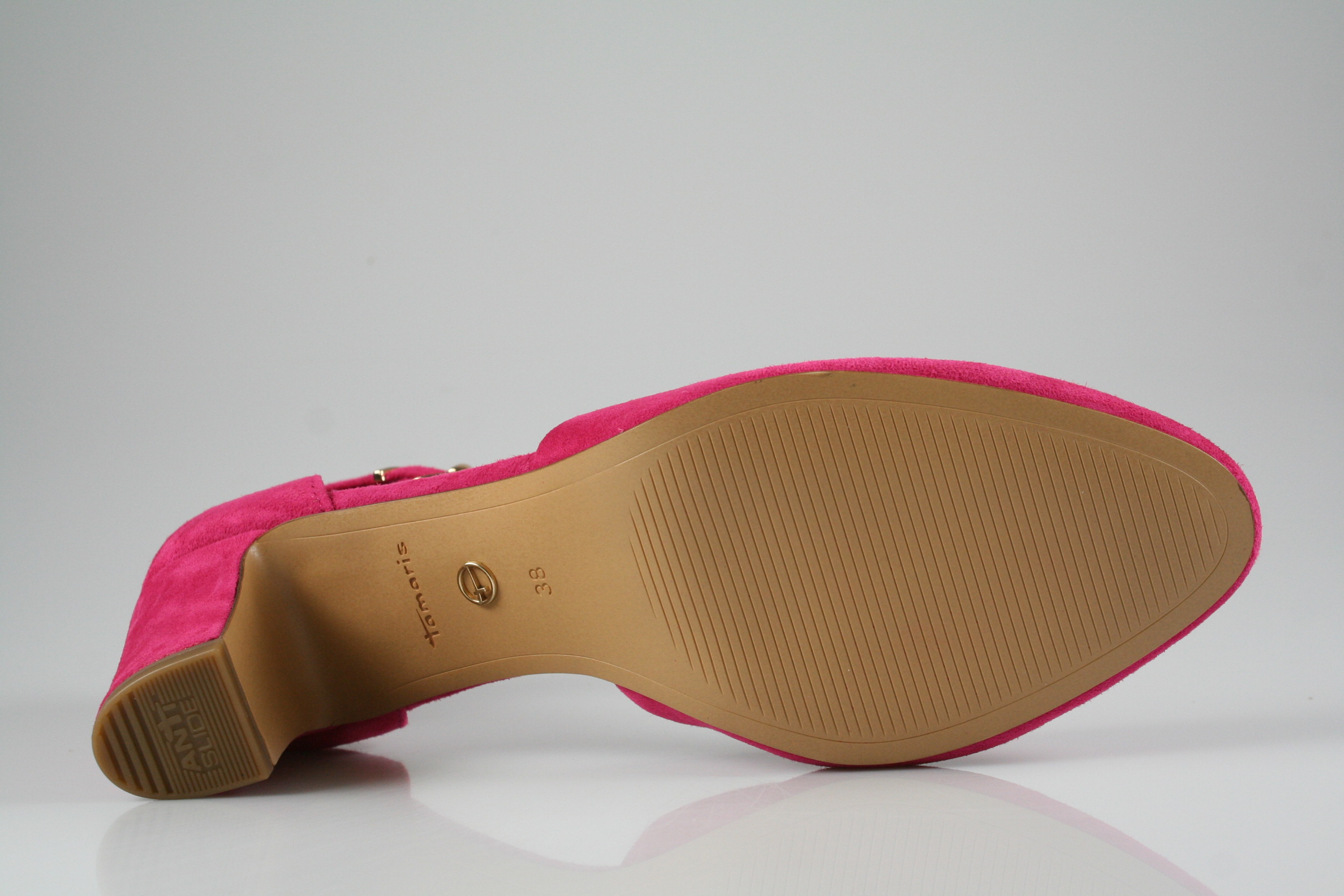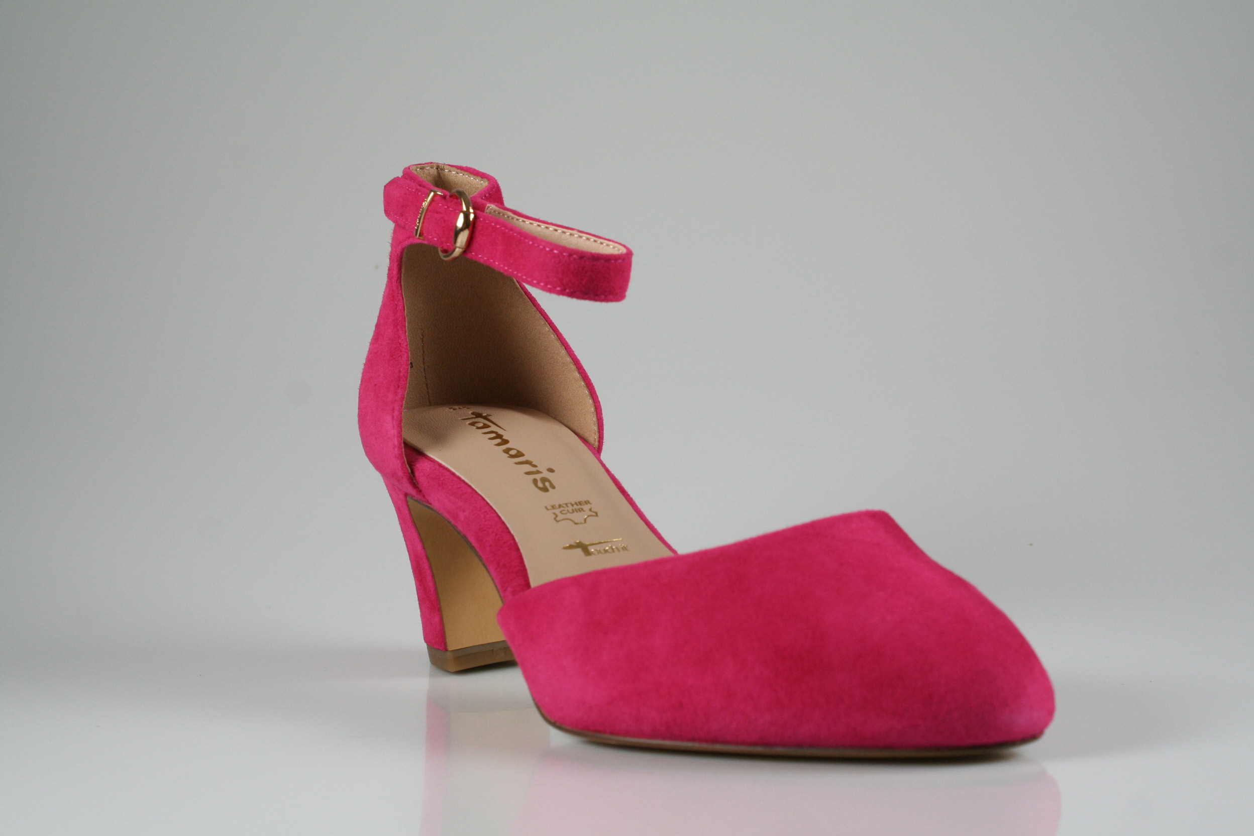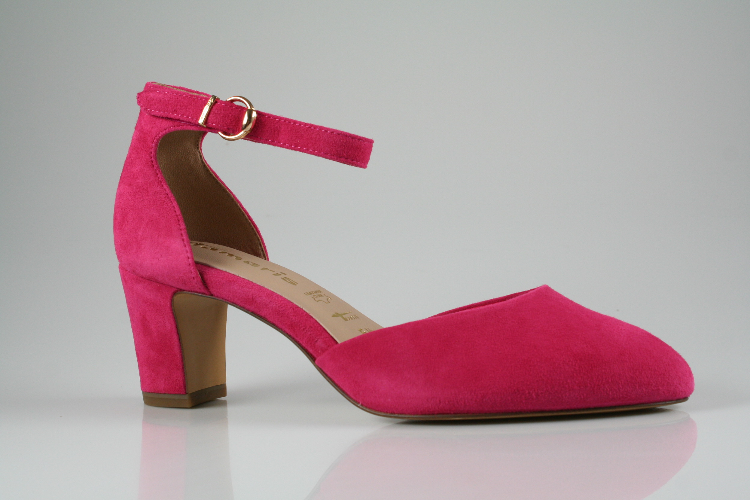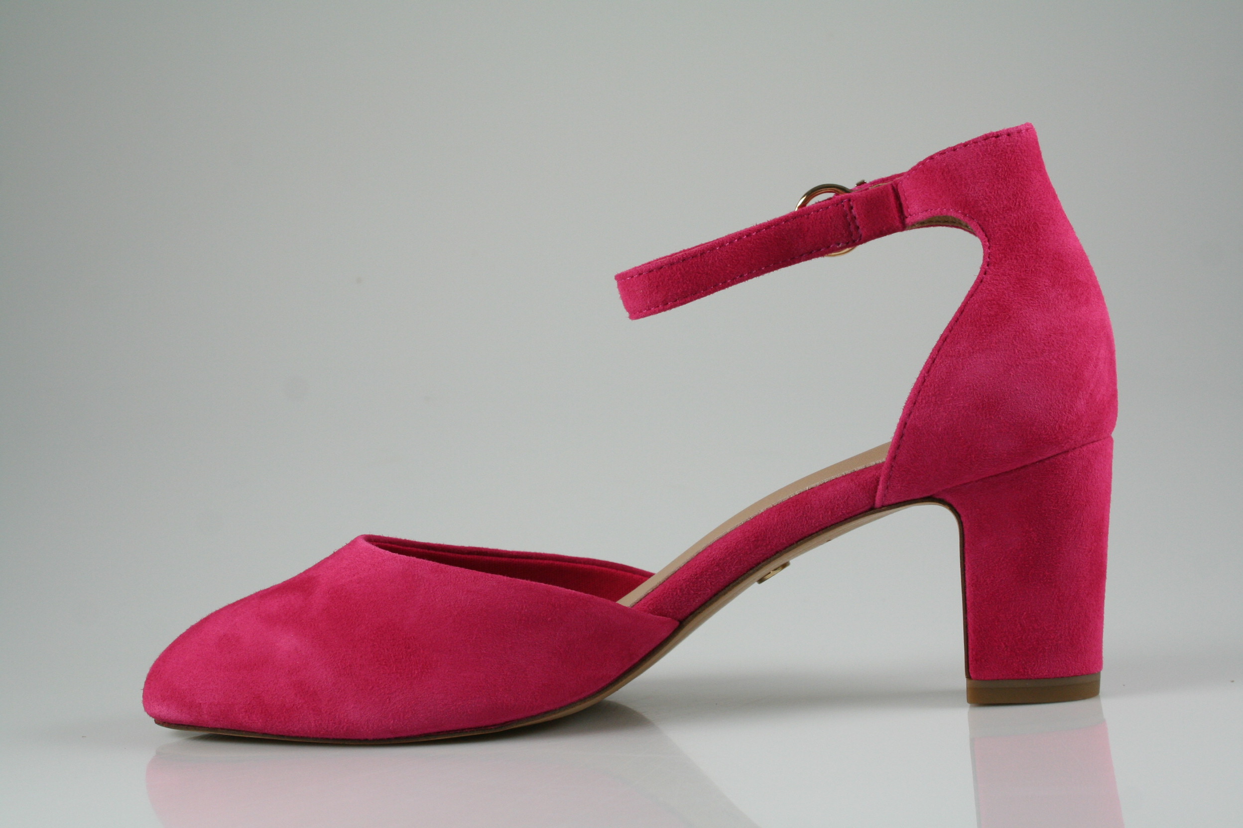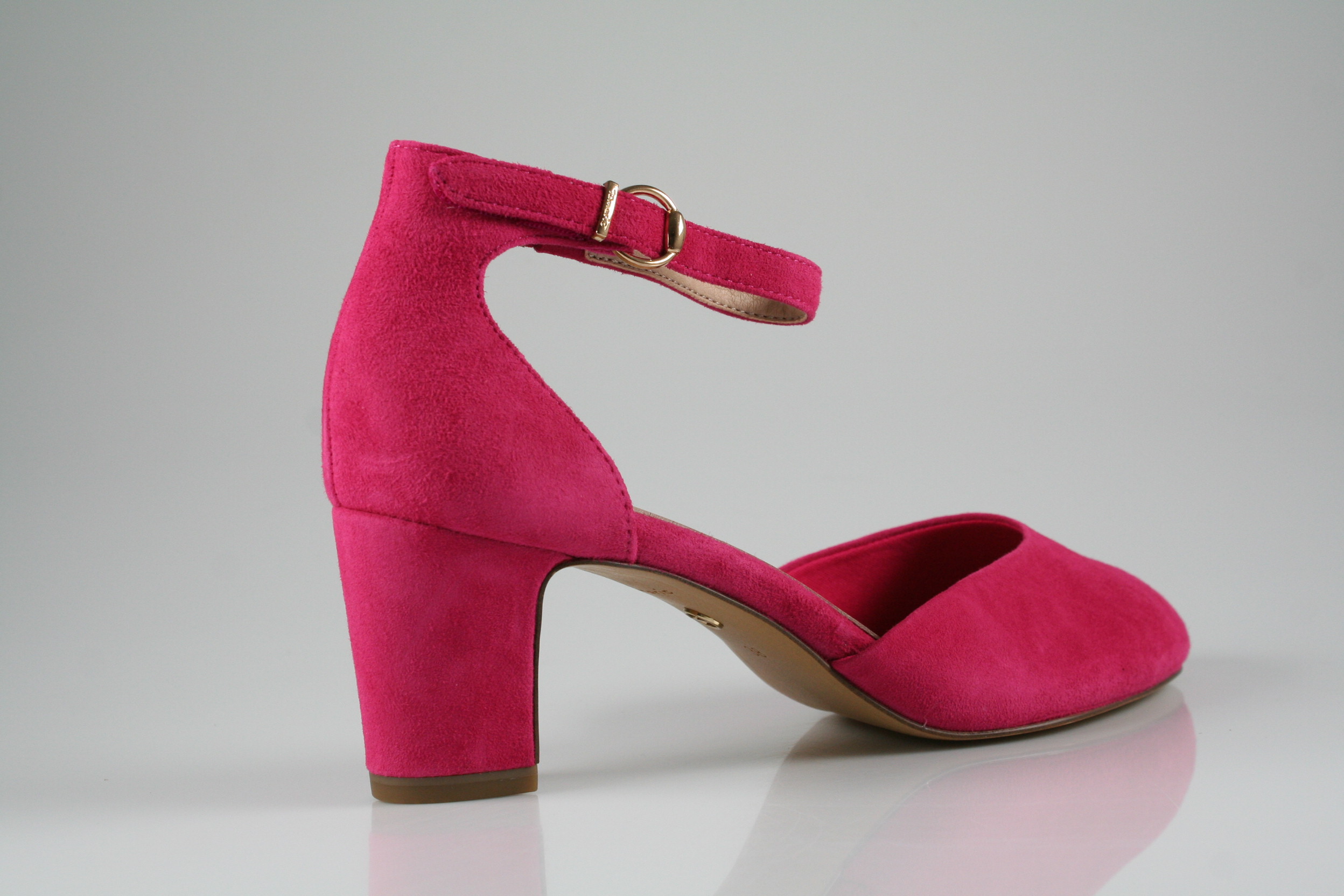 Typ: Pumps; Farbe "fuxia"; Ausstattung:; - Obermaterial: Velourleder; - weiche Decksohle; - leichte Laufsohle; - 65mm Blockabsatz; - Riemchen zur Weitenregulierung