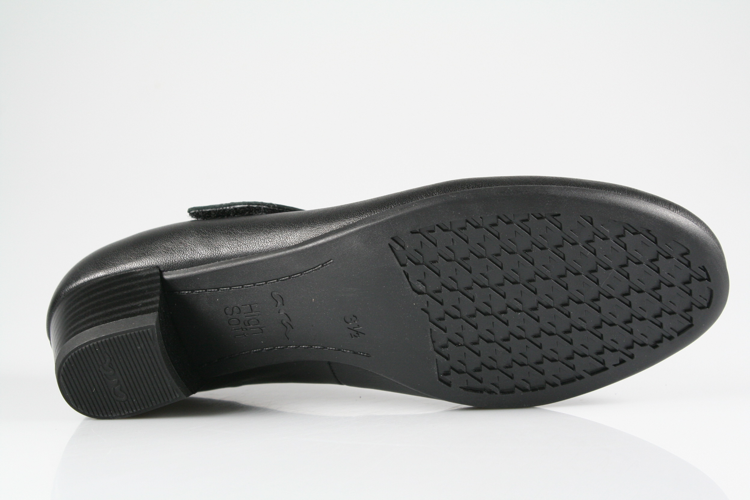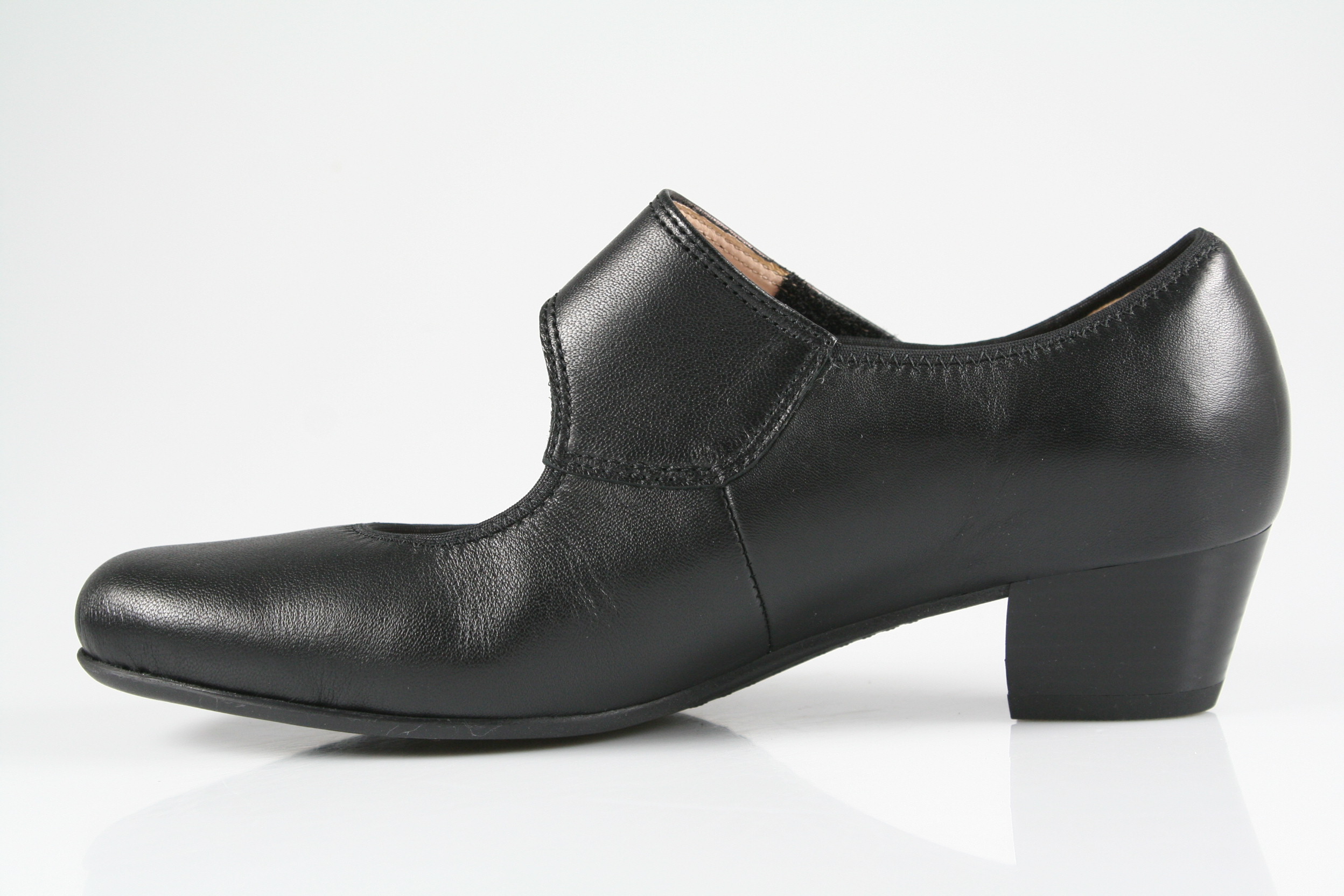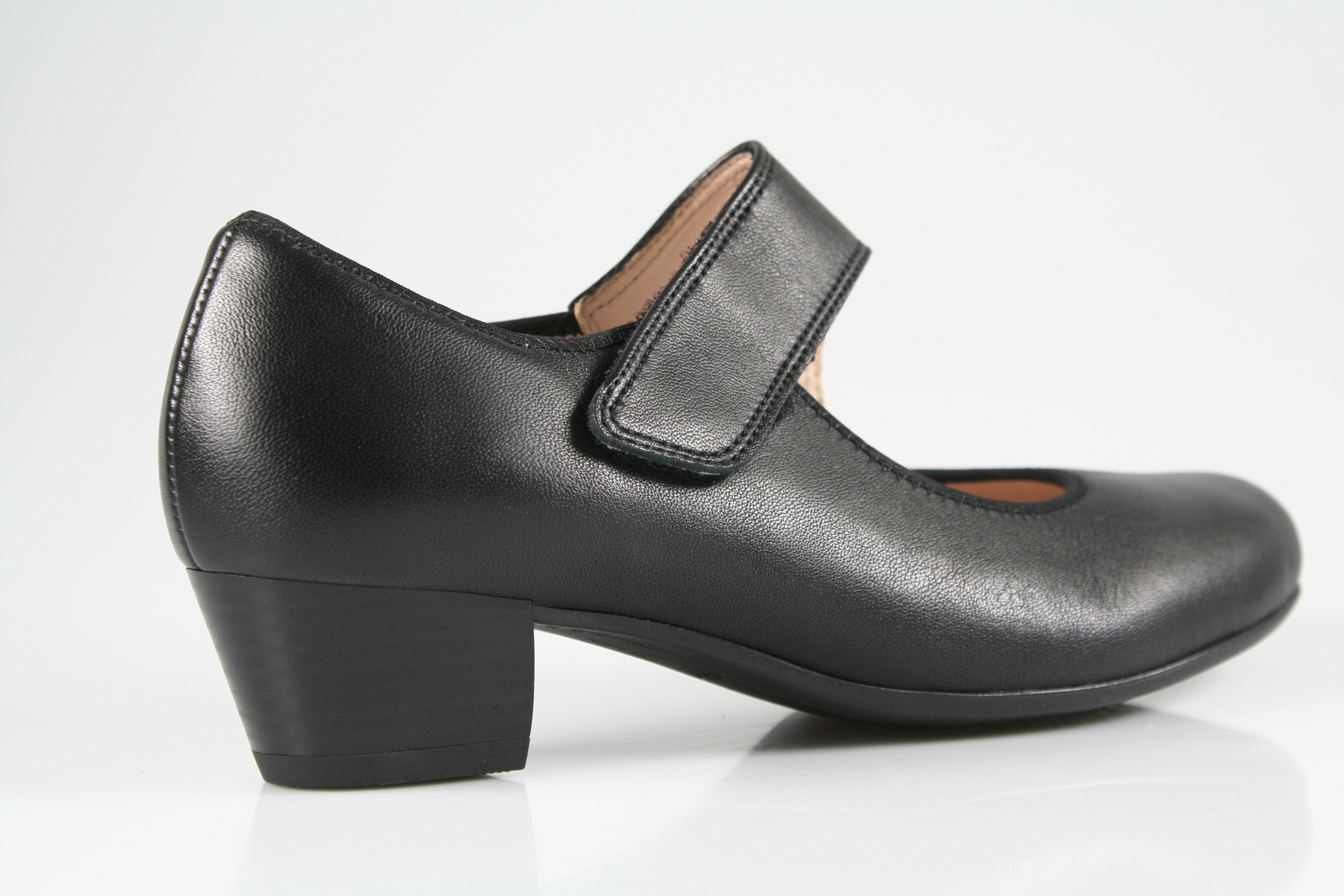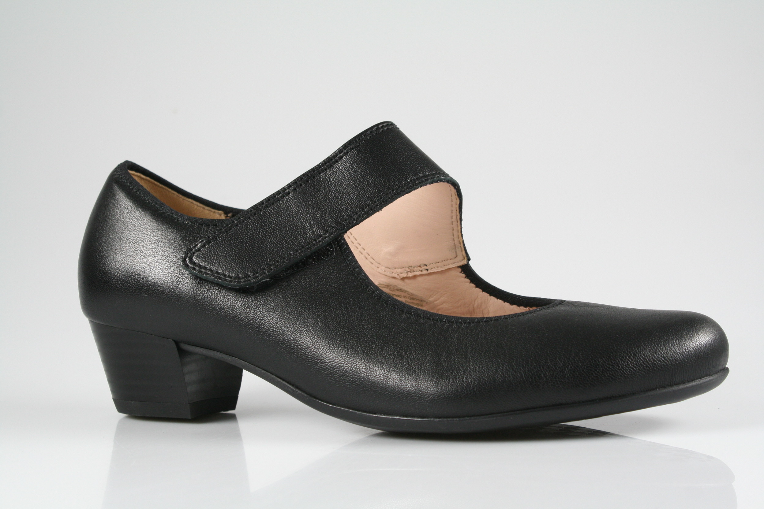 Typ: Pumps; Farbe: "schwarz"; Ausstattung:; - Obermaterial: Glattleder; - gepolsterte Decksohle; - Lederfutter; - flexible Gummisohle; - Gummizug Schaftrand; - Klettverschluss; - Weite "H"; - Absatz 3,5mm