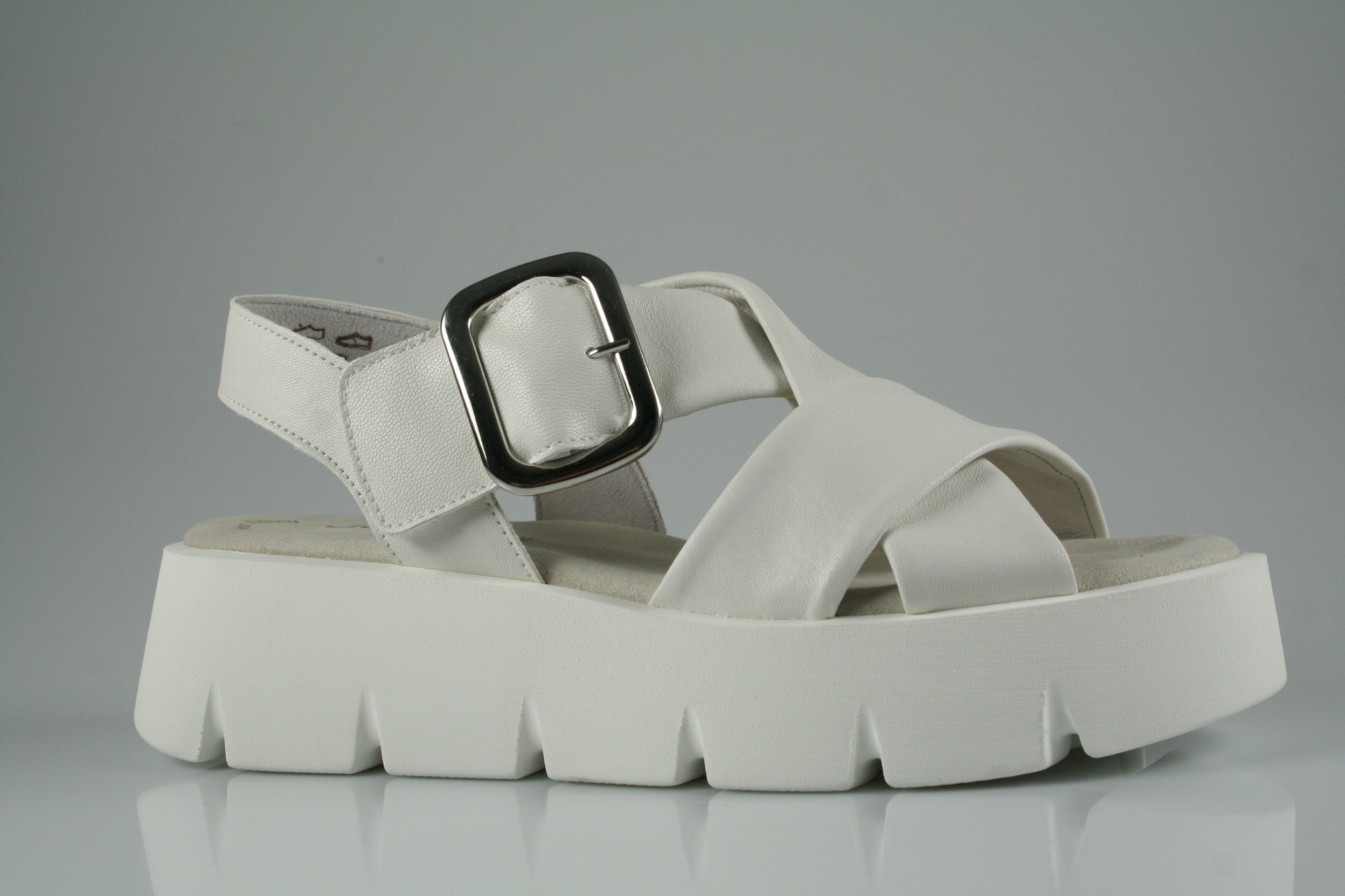 Typ: Sandale; Farbe "latte"; Ausstattung:; - Obermaterial: Nappaleder; - weiche Decksohle; - Plateausohle; - gepolsterter Schaftrand; - Klettverschluss zur Weitenregulierung