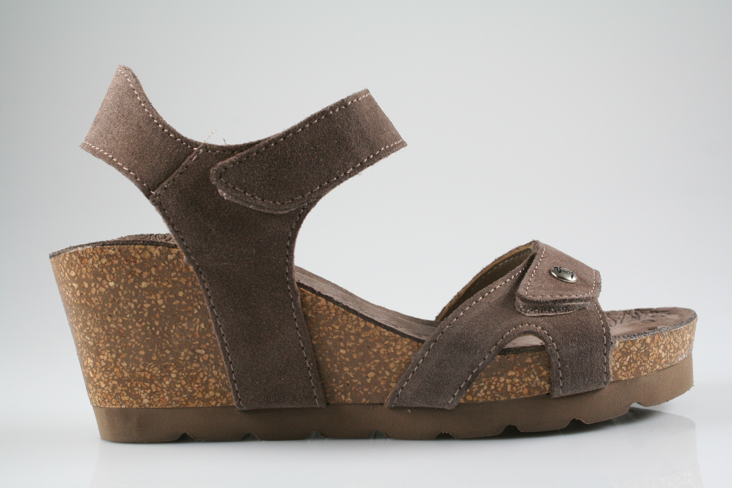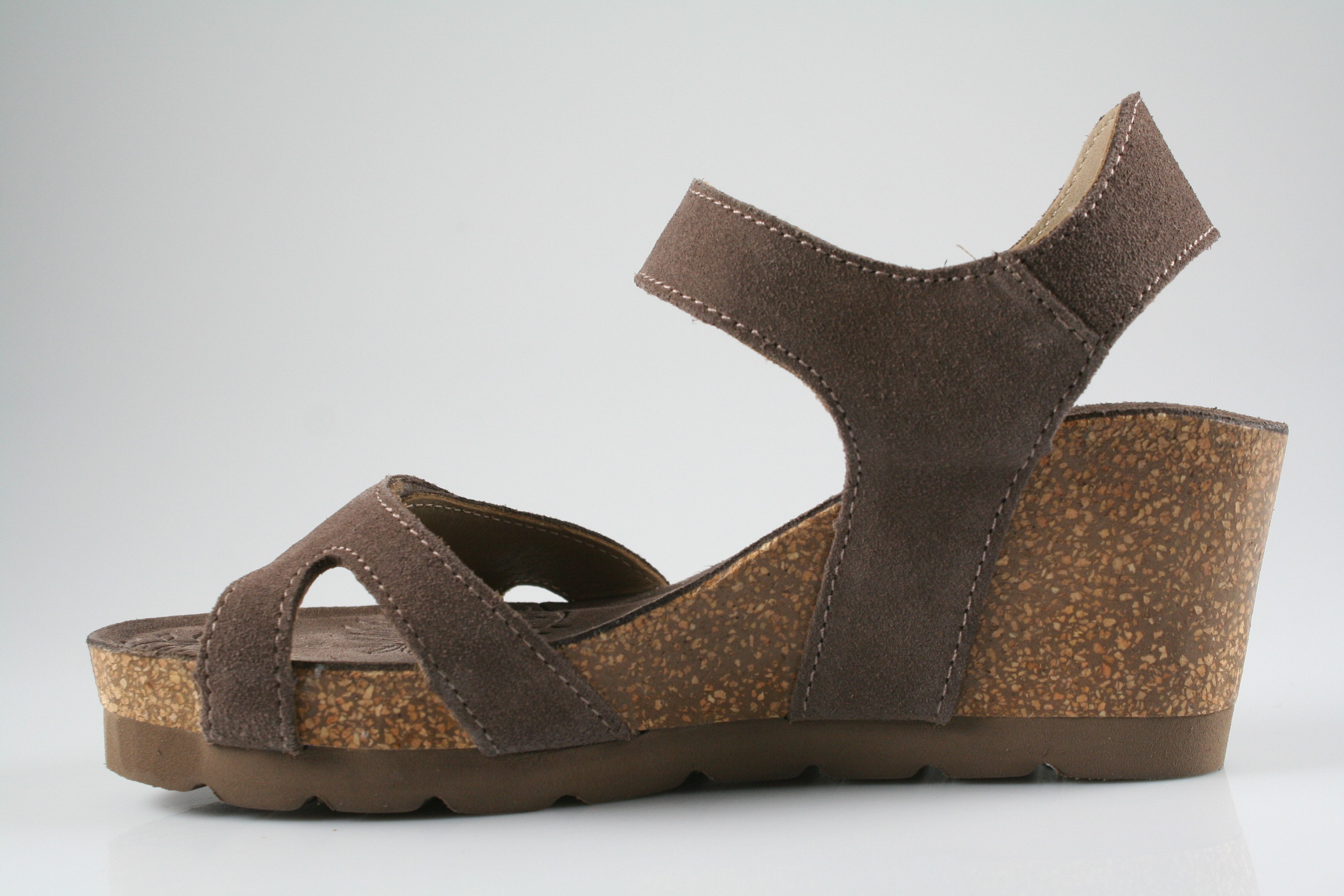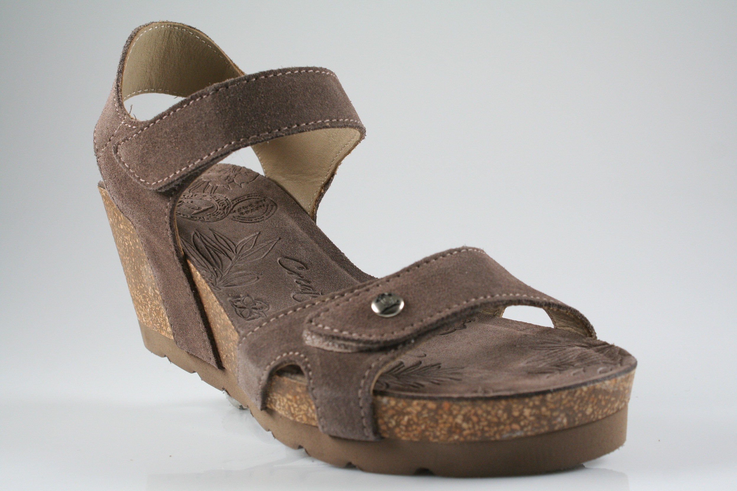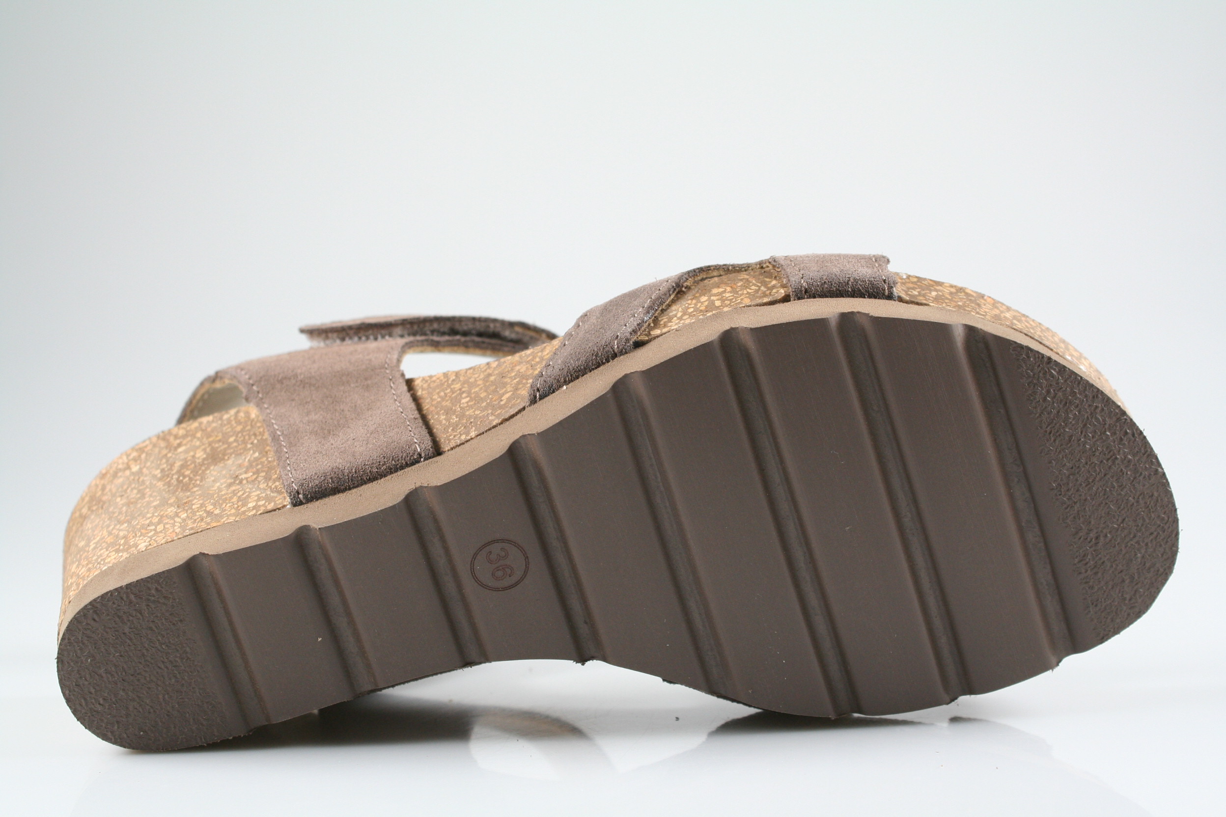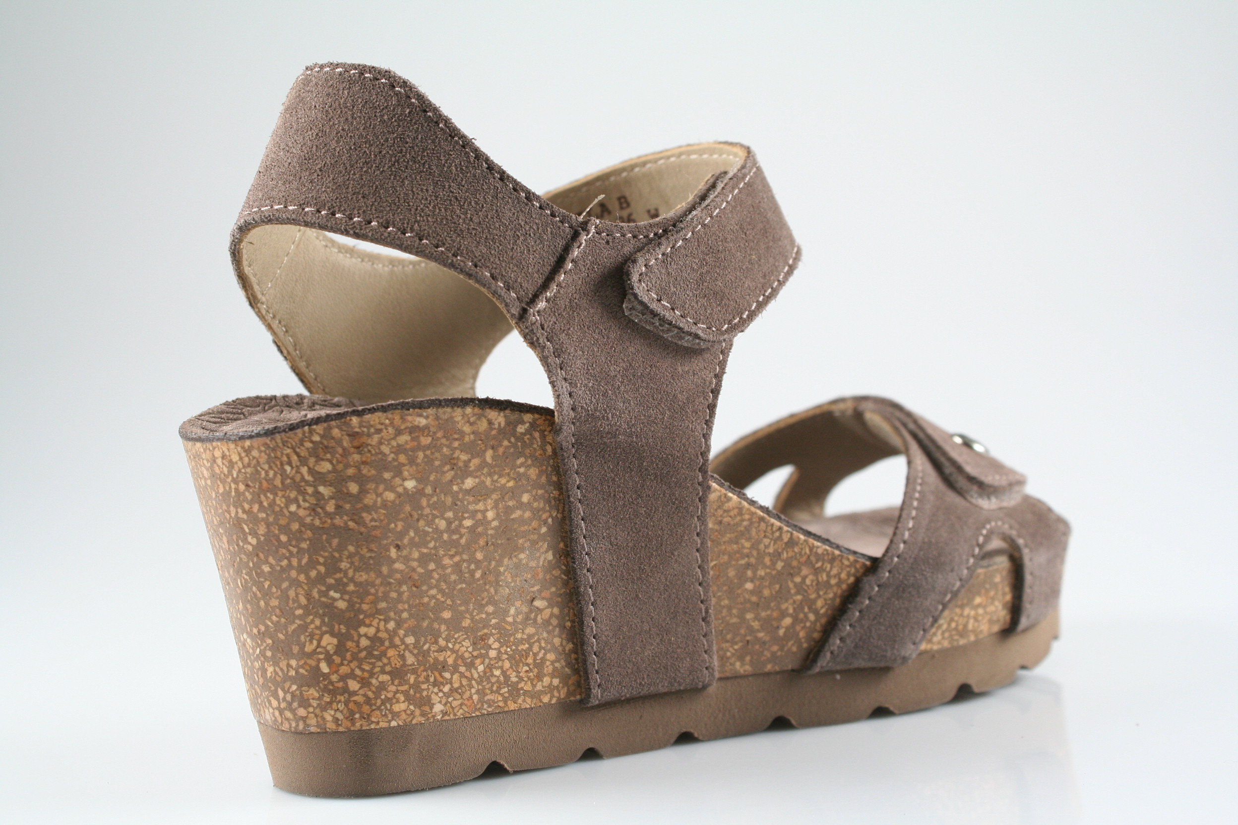 Typ: Sandale; Farbe: "stone"; Ausstattung:; - Obermaterial Velourleder; - Lederfutter; - weich gepolsterte Decksohle; - Riemchen mit Klettverschluss; - Kork-Keilsohle; - Leichtzell-Laufsohle