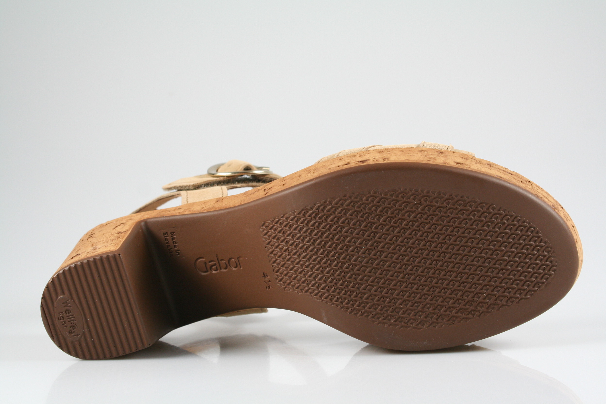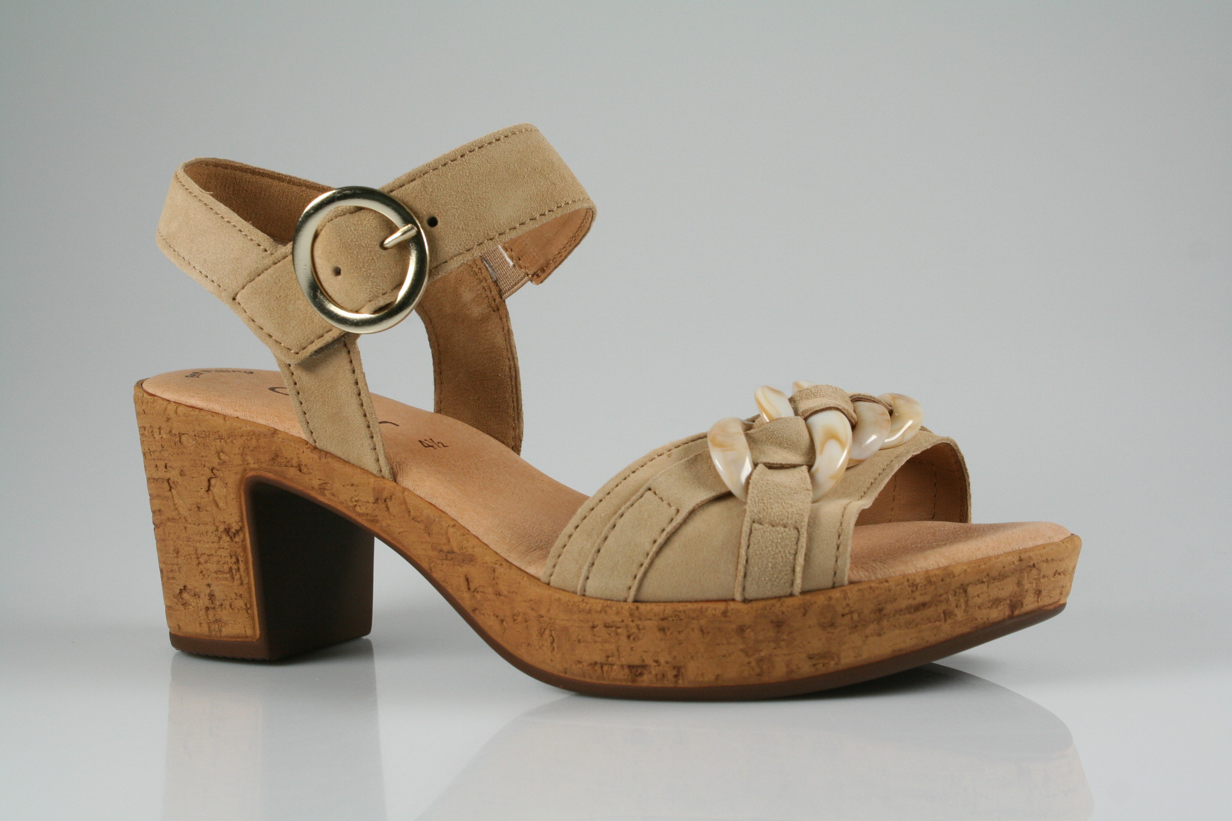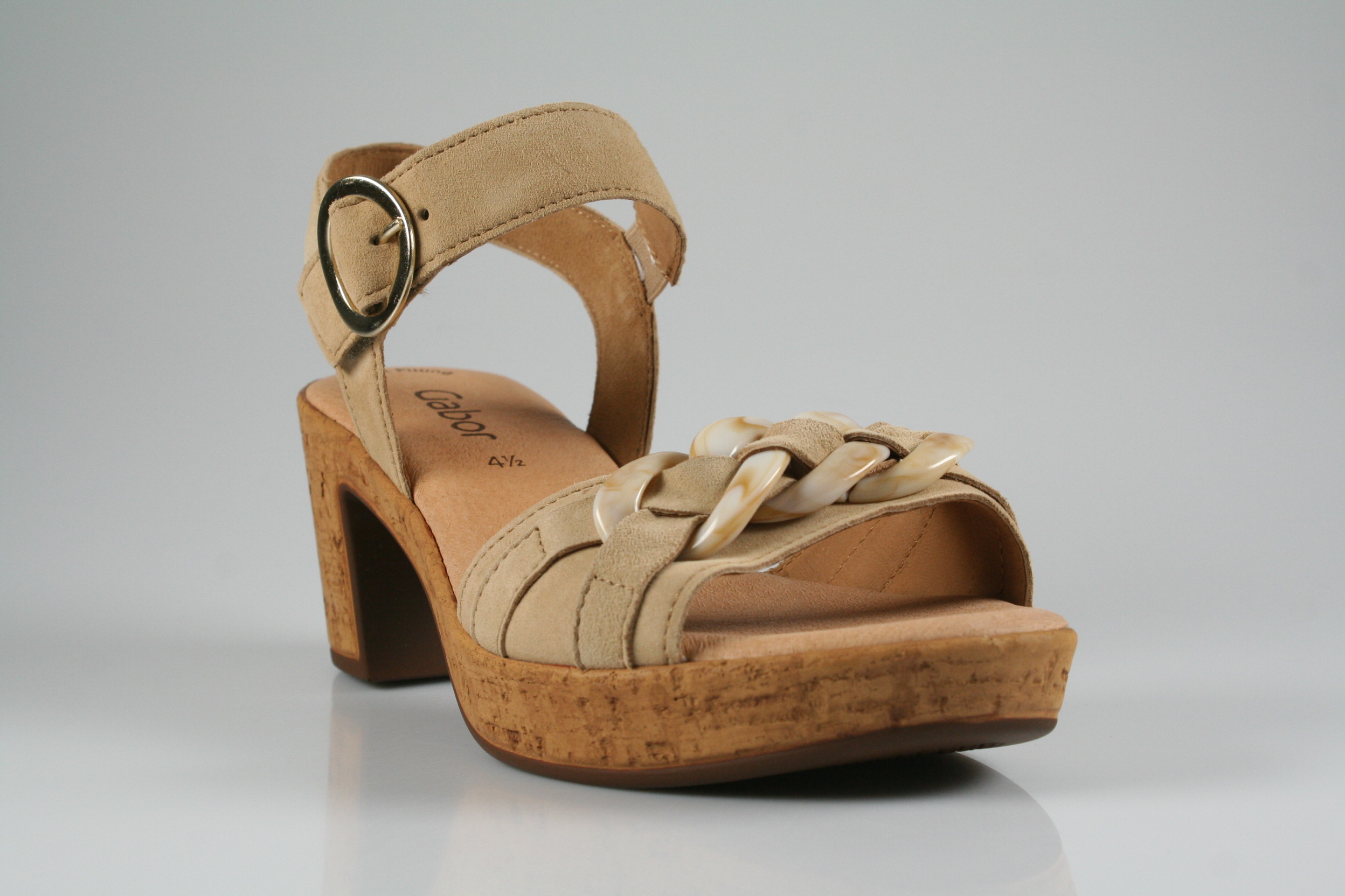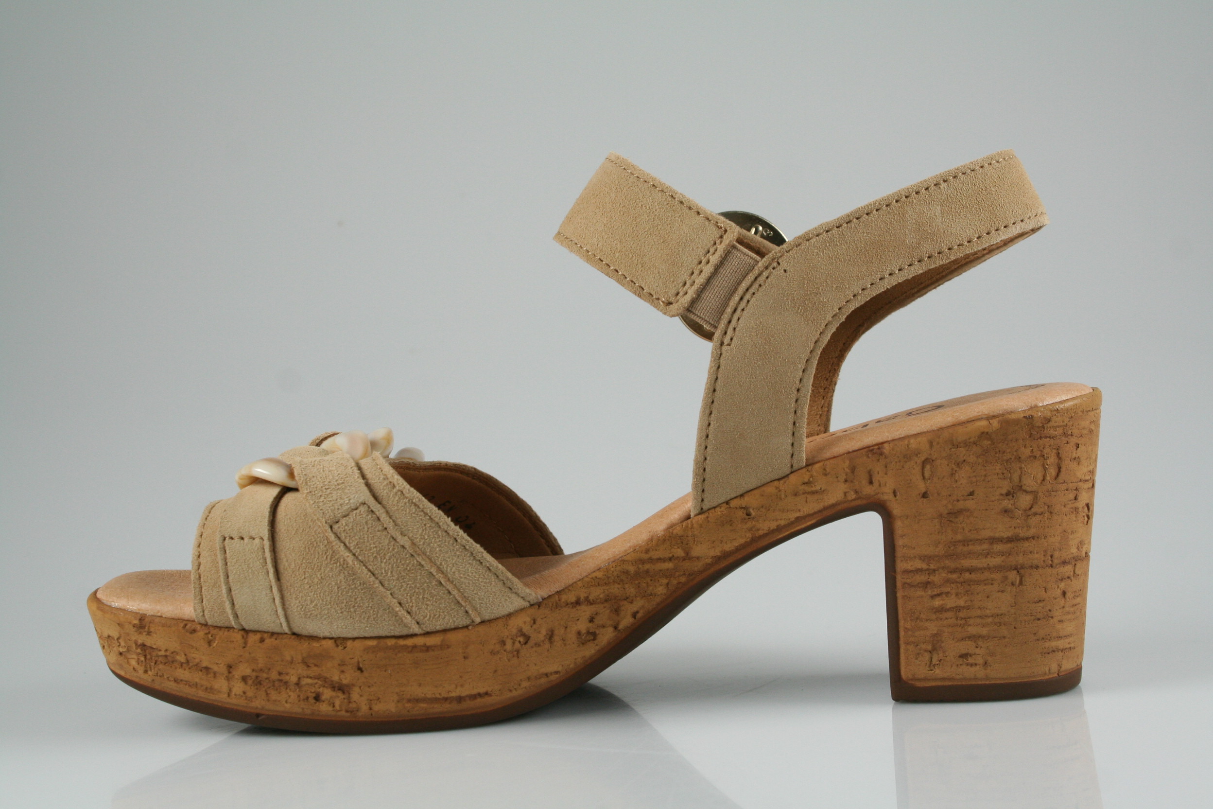 Typ: Sandalette; Farbe "caramel"; Ausstattung:; - Obermaterial: Samtchevreau; - weiche Decksohle; - Plateausohle; - 45mm Blockabsatz; - Klettverschluss zur Weitenregulierung