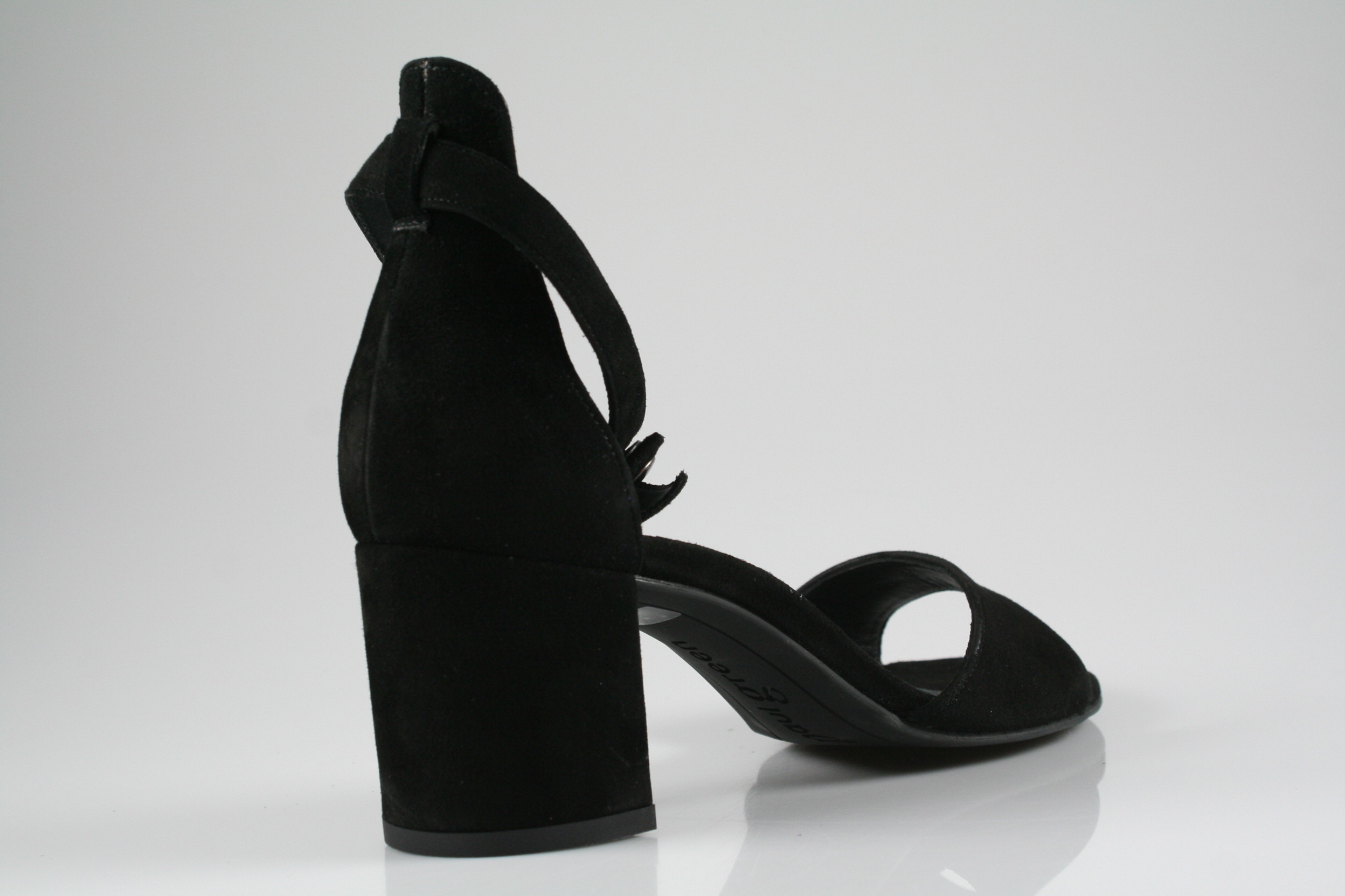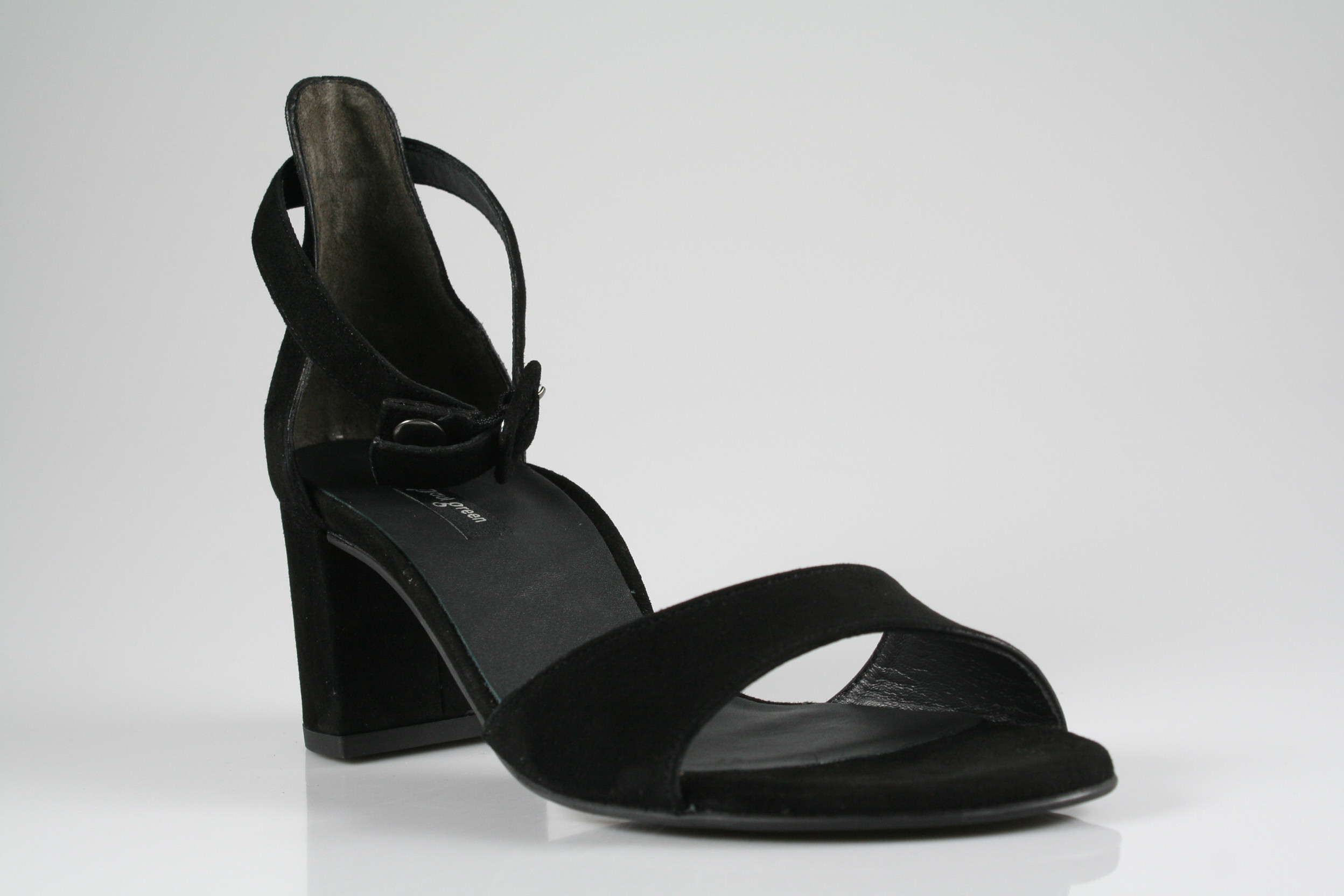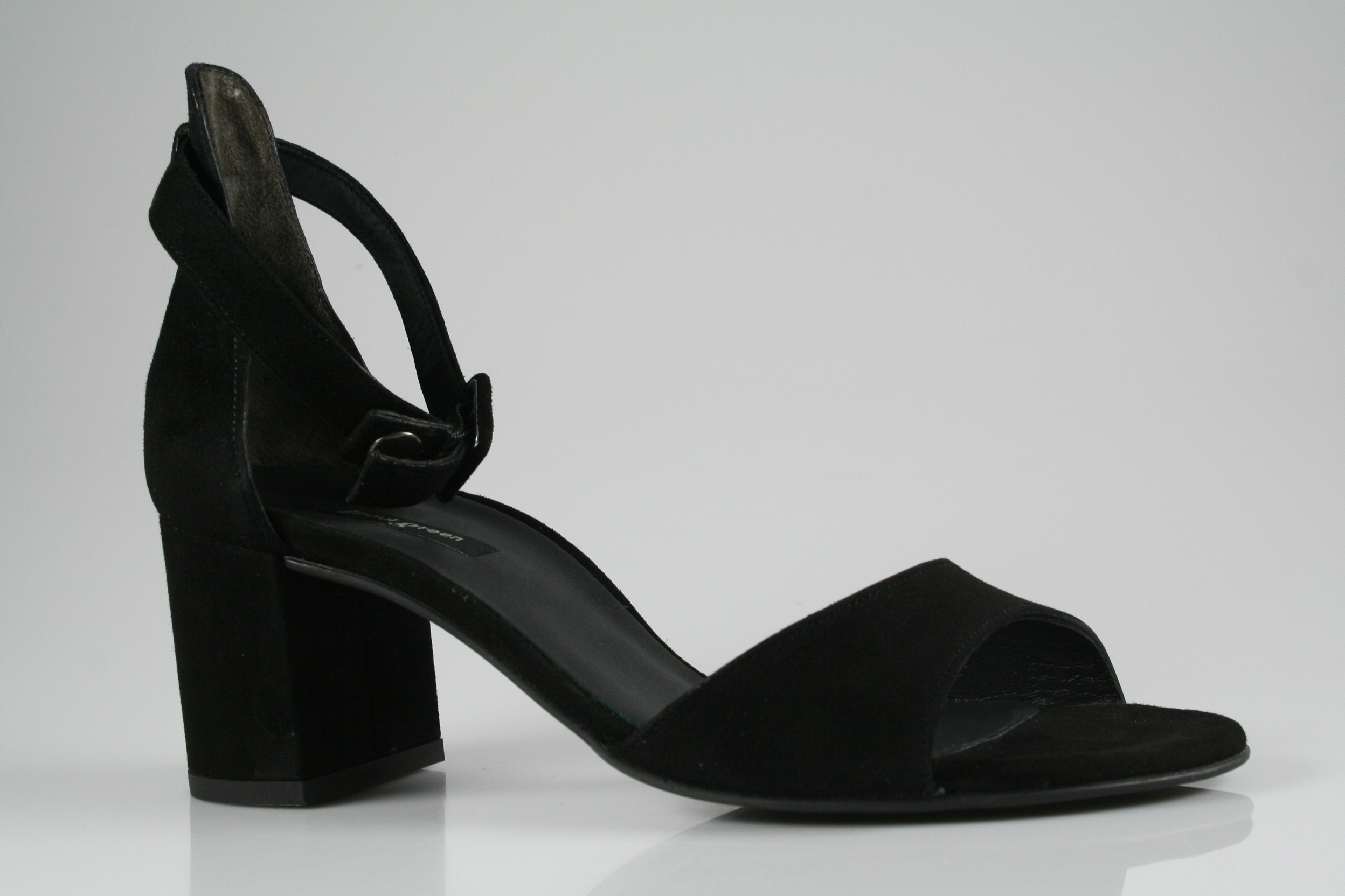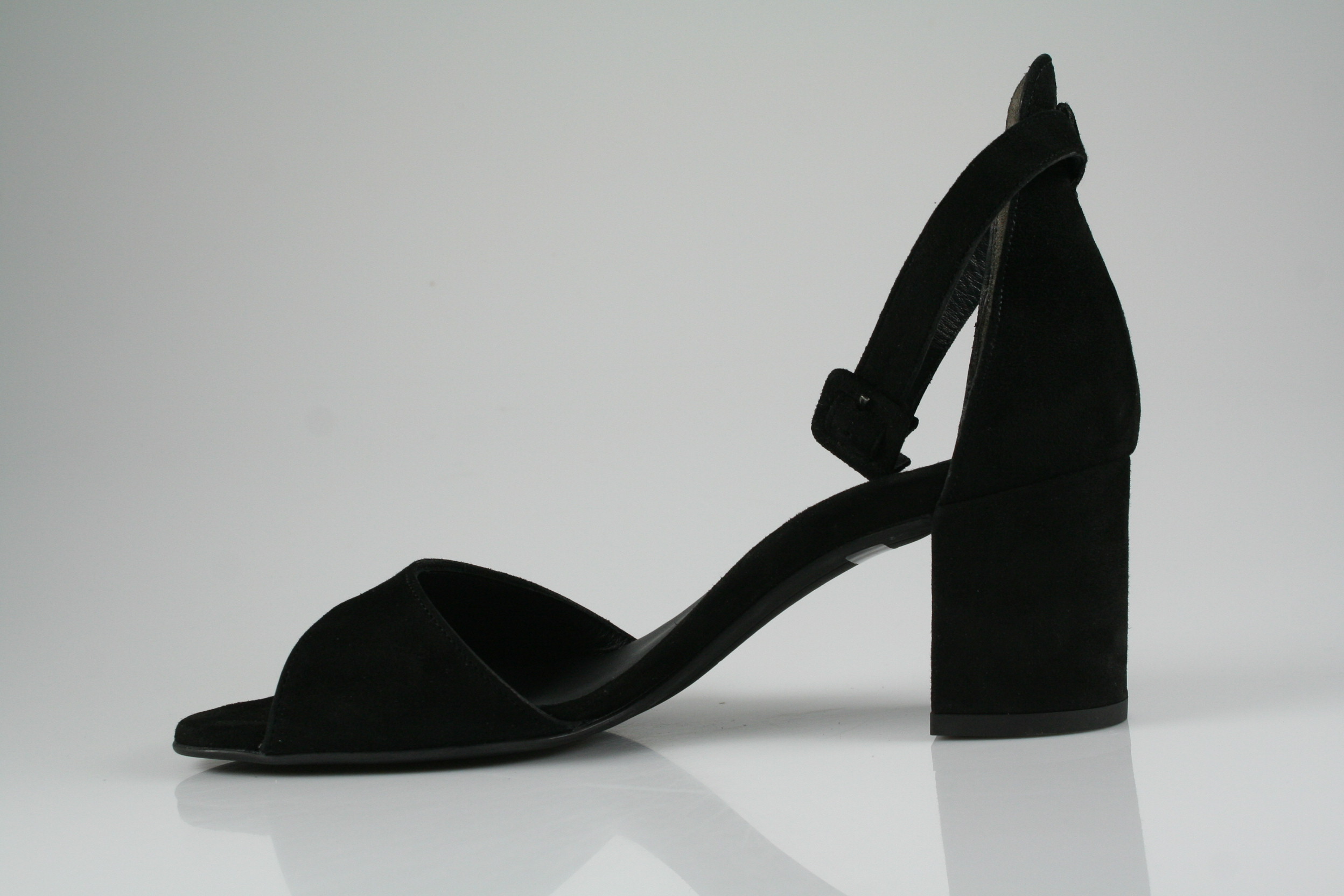 Typ: Sandalette; Farbe "schwarz"; Ausstattung:; - Obermaterial: Velourleder; - weiche Decksohle; - leichte Laufsohle; - 65mm Blockabsatz; - gepolsterter Schaftrand; - Riemchen zur Weitenregulierung