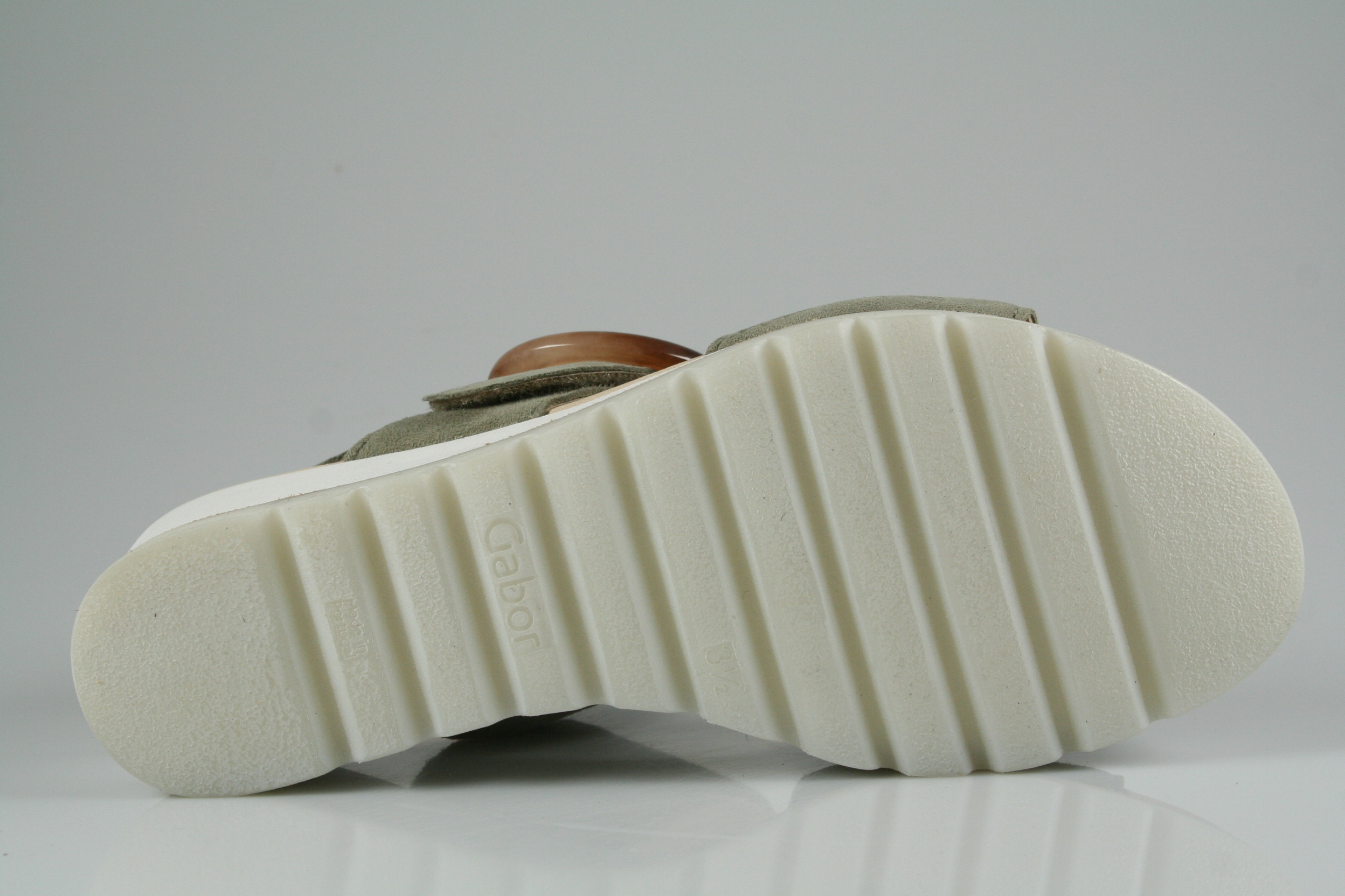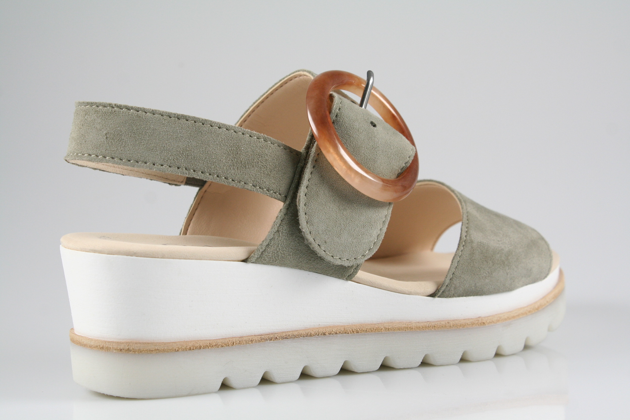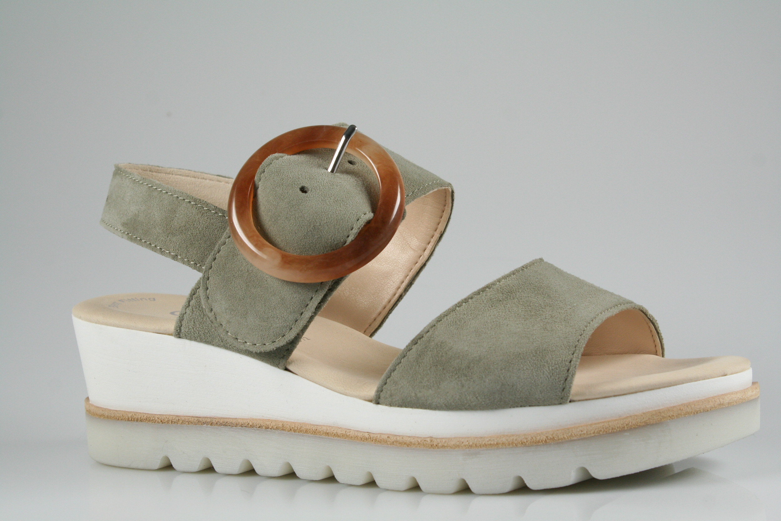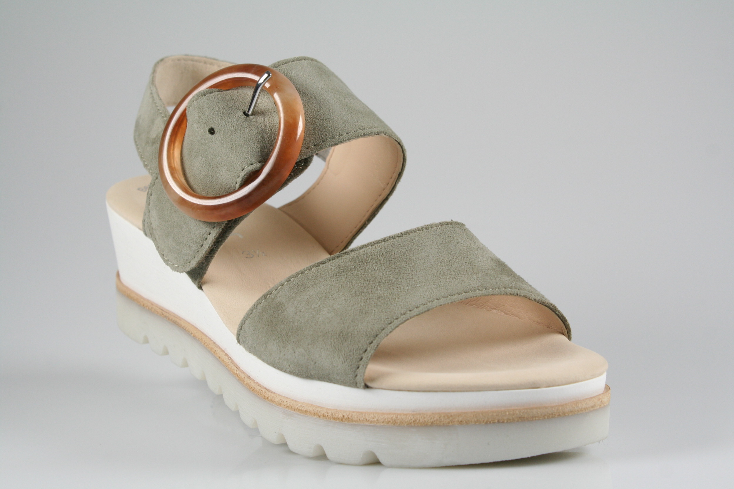 Typ: Sandale; Farbe "schilf"; Ausstattung:; - Obermaterial: Samtchevreau; - weiche Decksohle; - leichte Laufsohle; - 30mm Plateauabsatz; - Klettverschluss zur Weitenregulierung