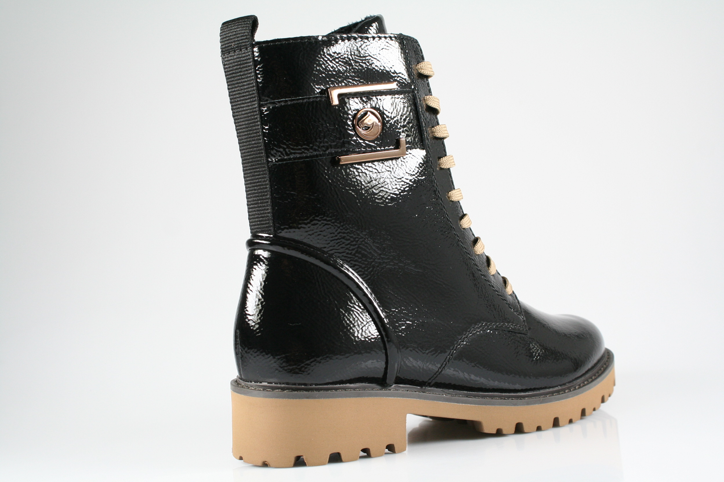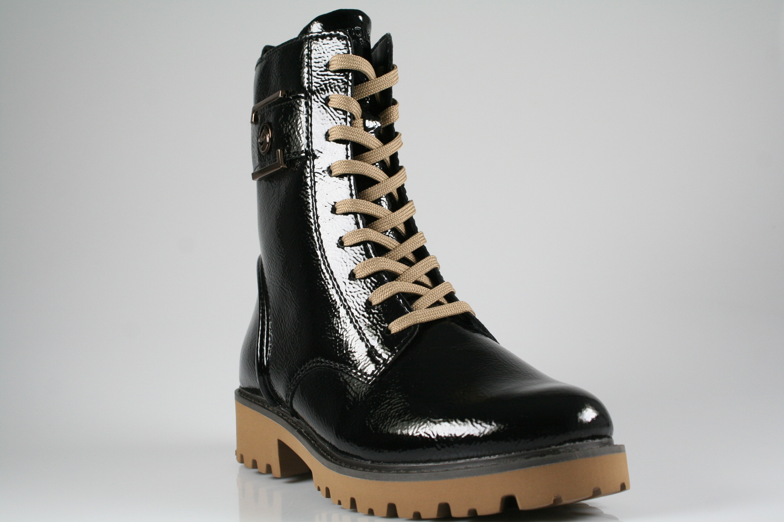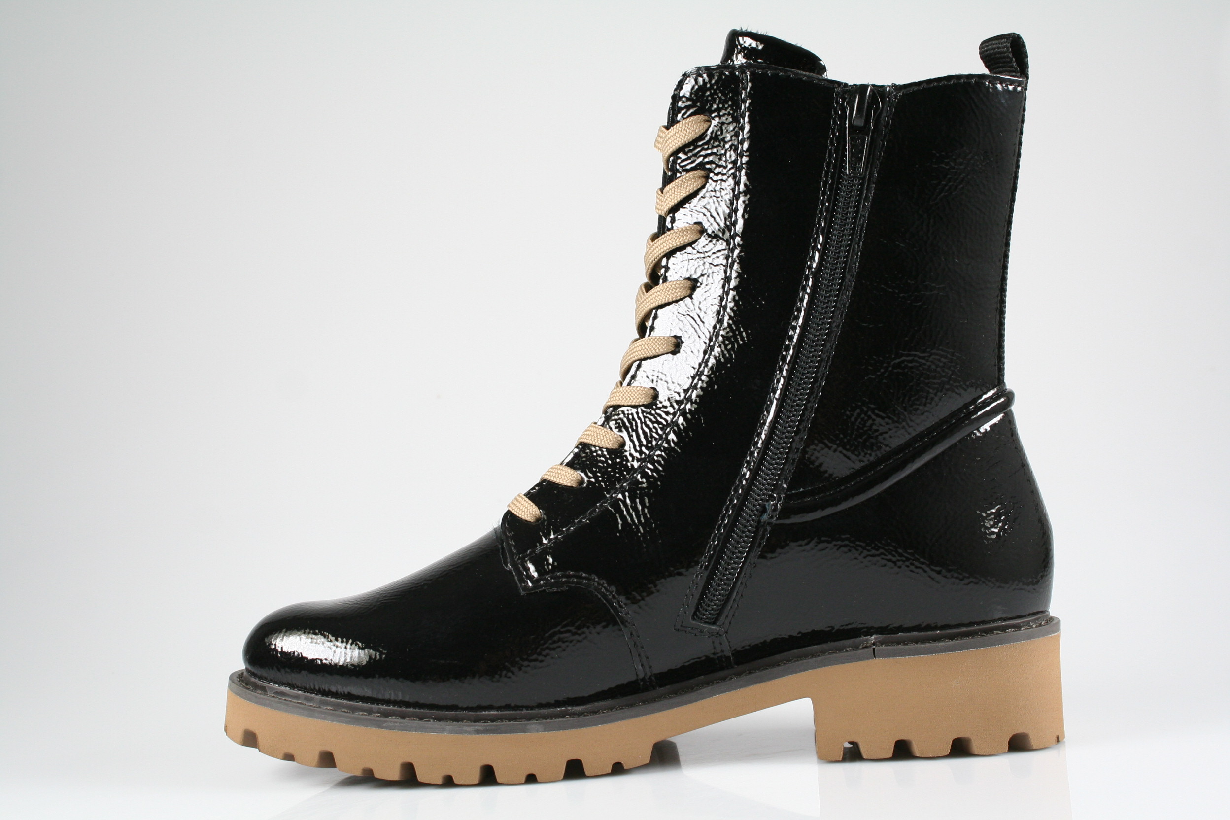 Typ: Boots; Farbe "schwarz"; Ausstattung:; - Obermaterial: Lack; - Warmfutter; - herausnhembares Fußbett; - flexible Laufsohle; - gepolsterter Schaftrand; - Schnürsenkel und Reißverschluss