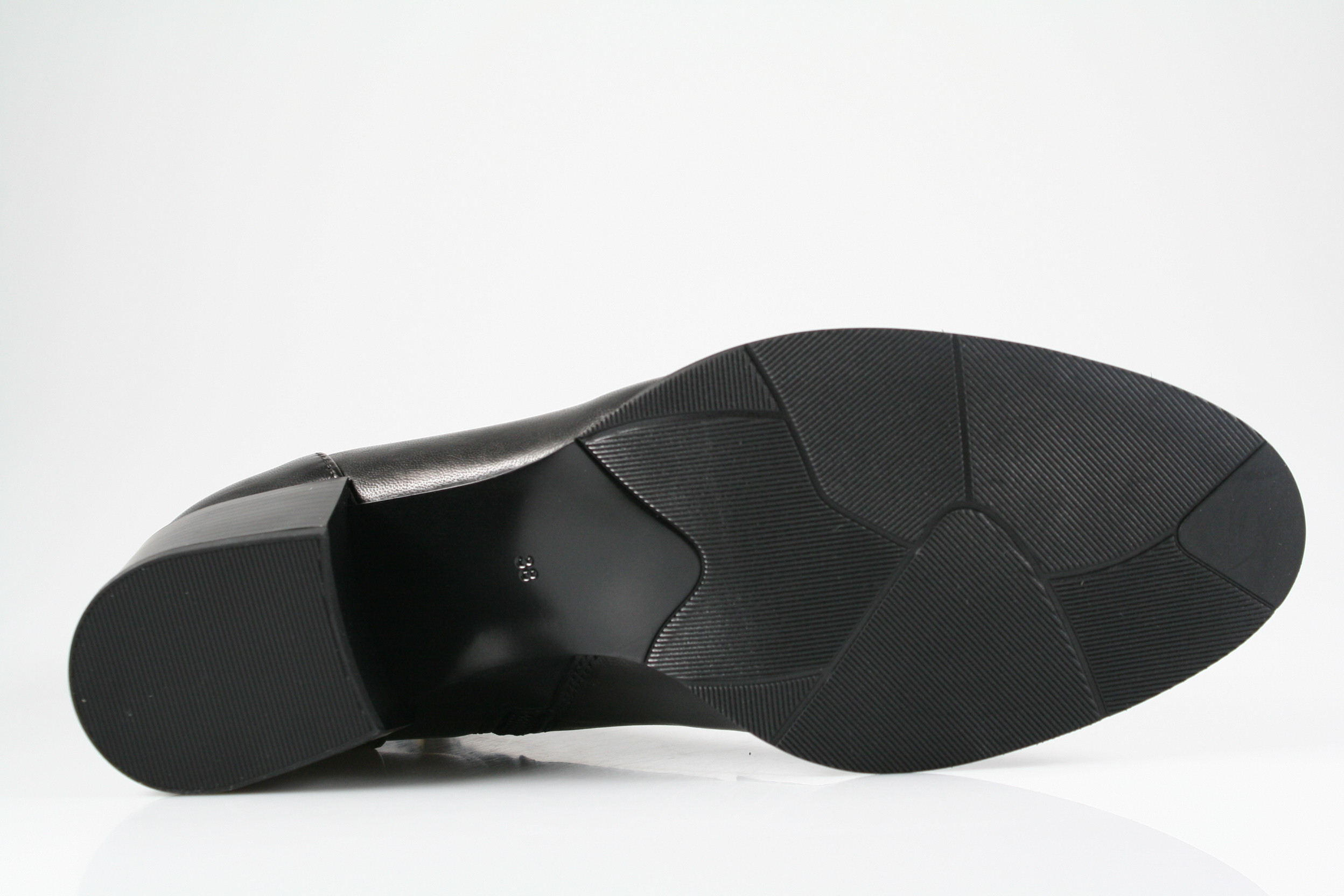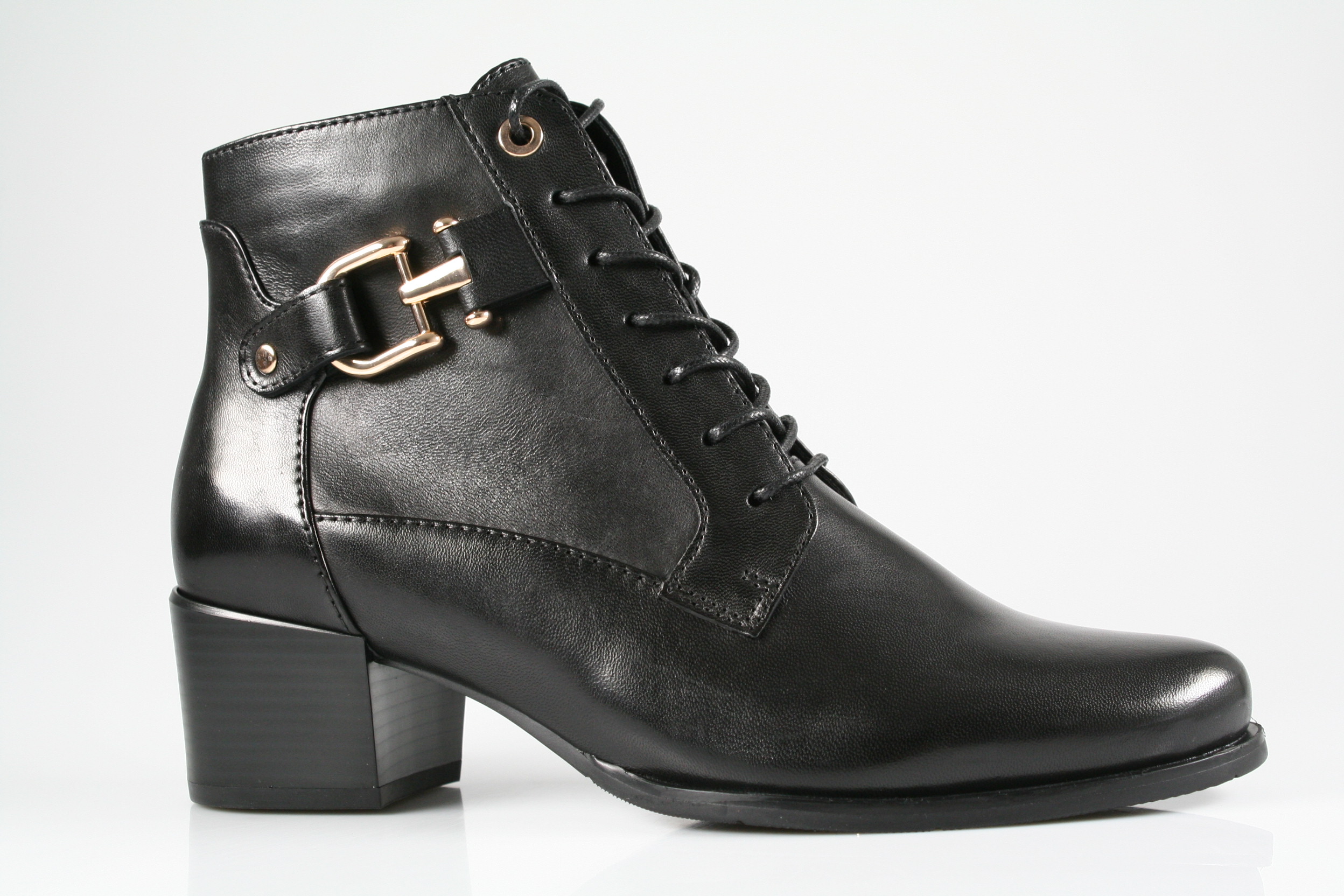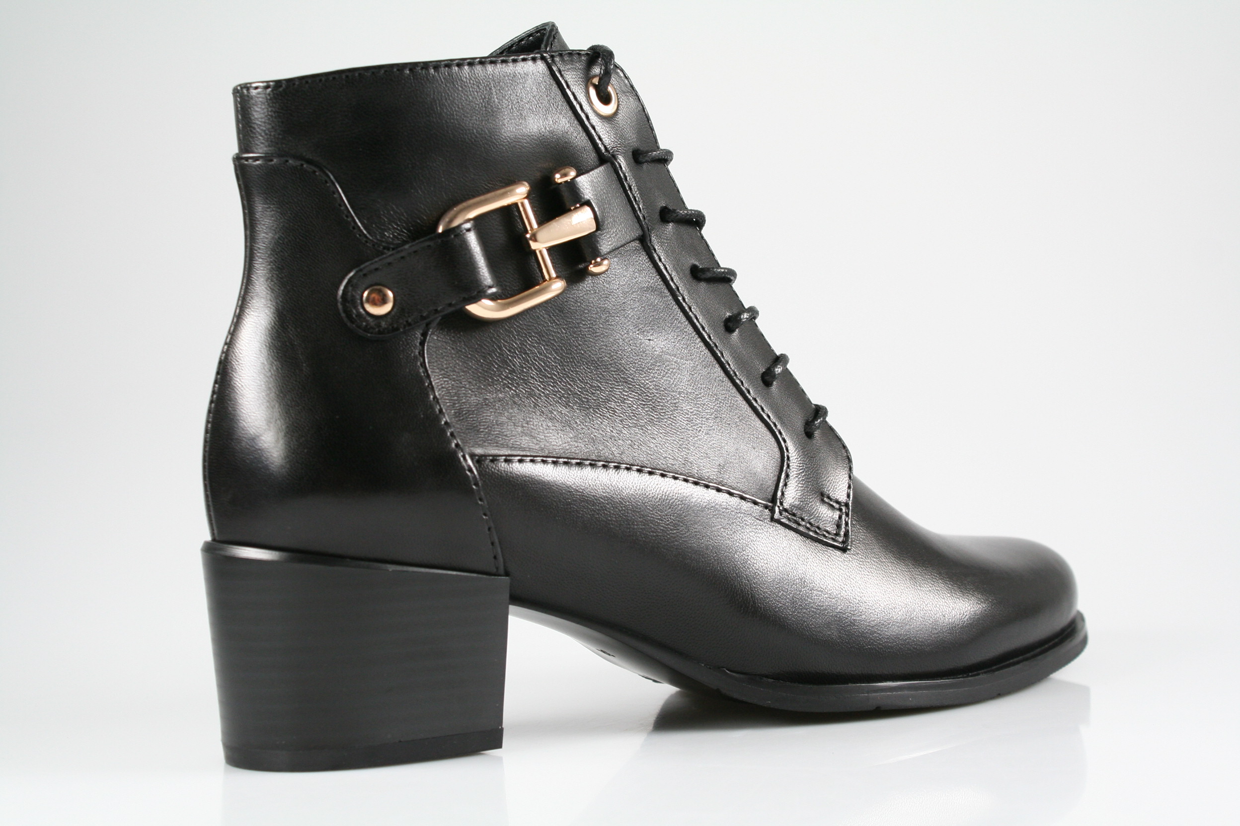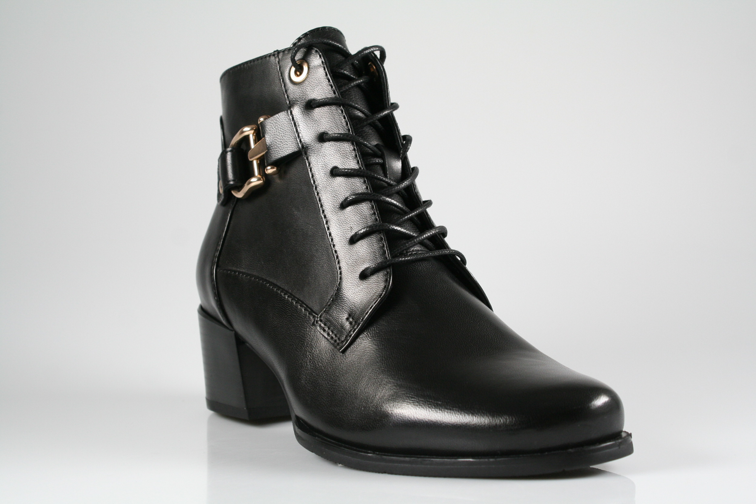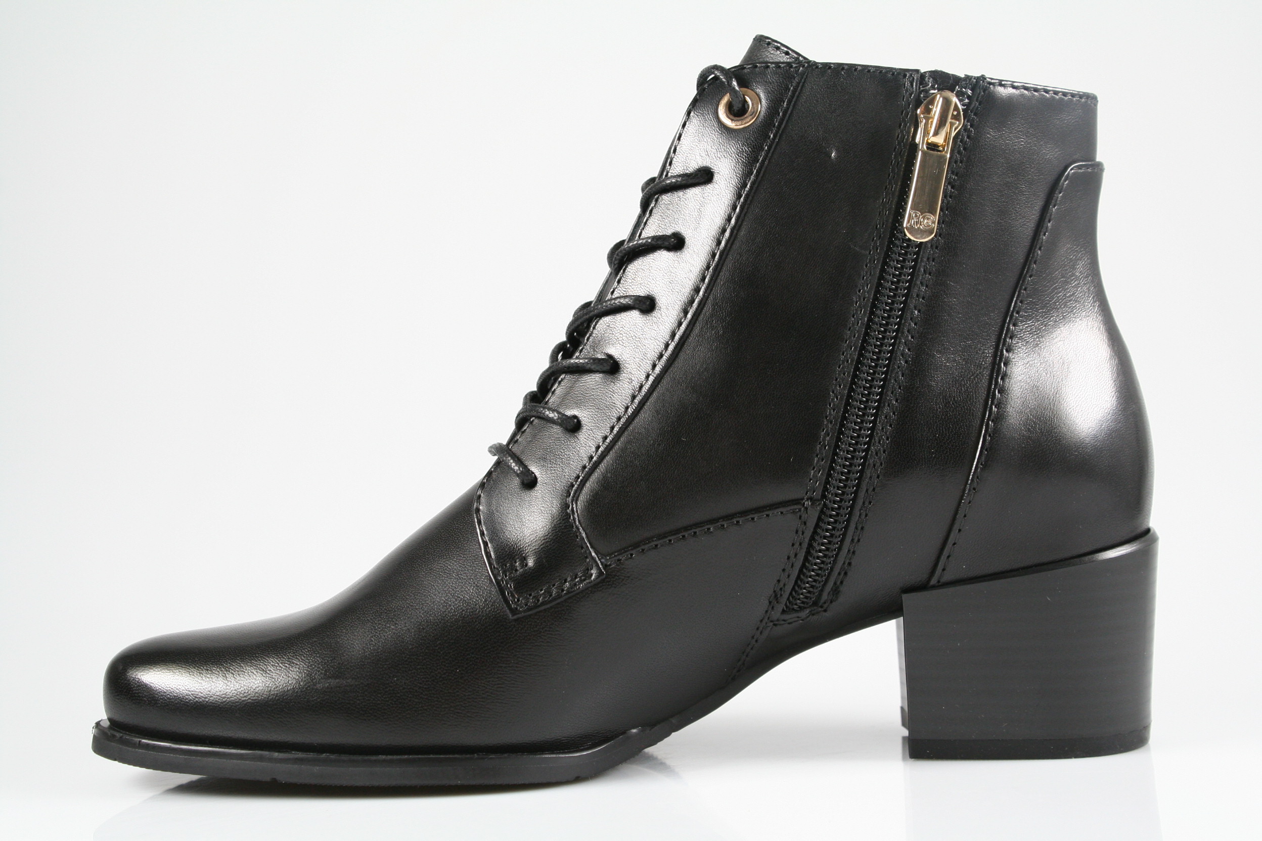 Typ: Stiefelette; Farbe "black"; Ausstattung:; - Obermaterial: Glattleder; - Warmfutter; - herausnehmbares Fußbett; - leichte Laufsohle; - 50mm Blockabsatz; - gepolsterter Schaftrand; - Schnürsenkel und Reißverschluss