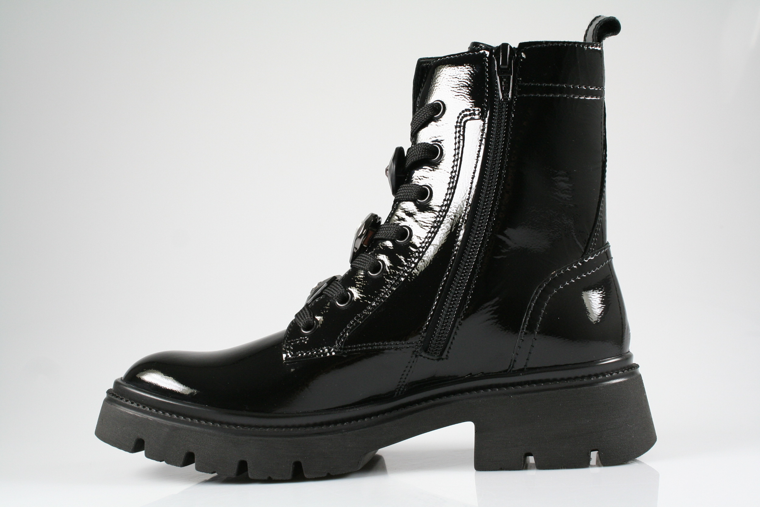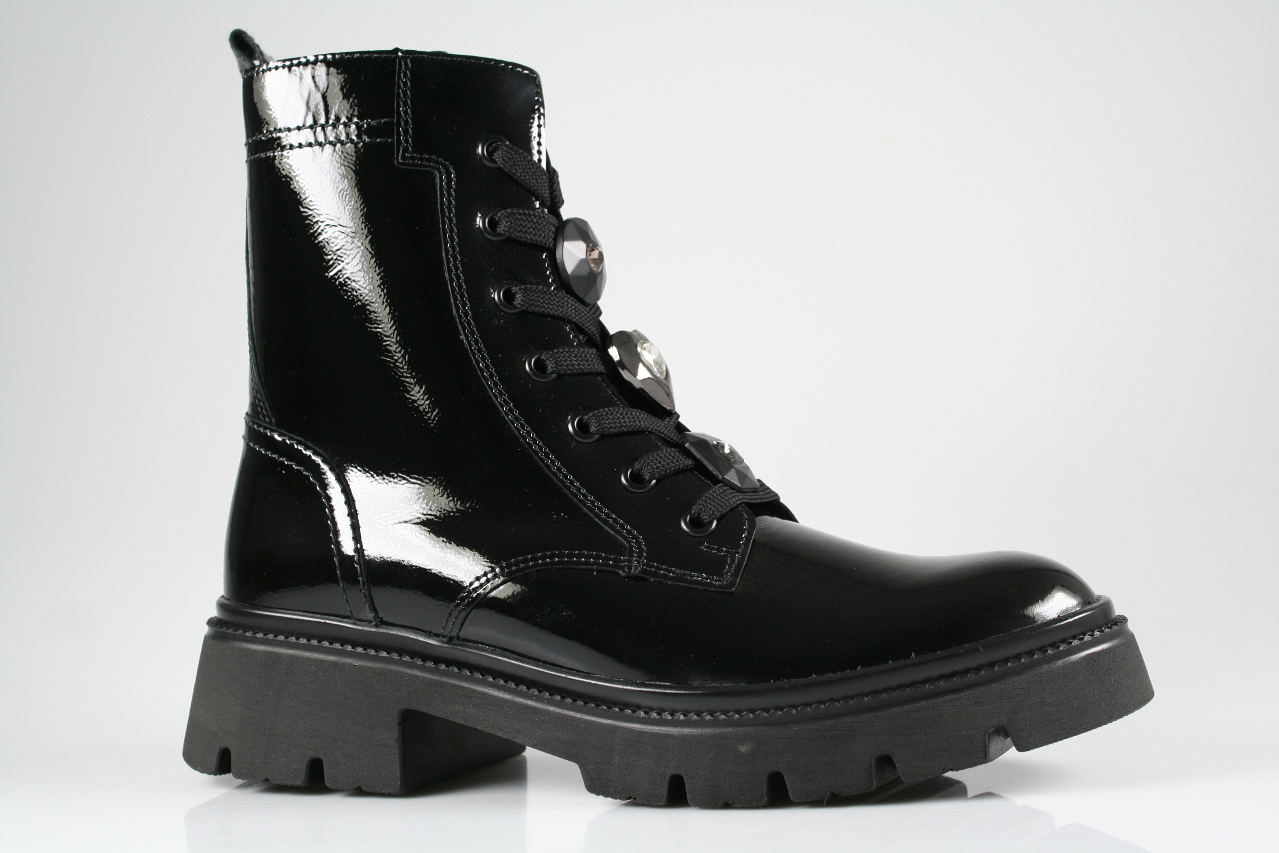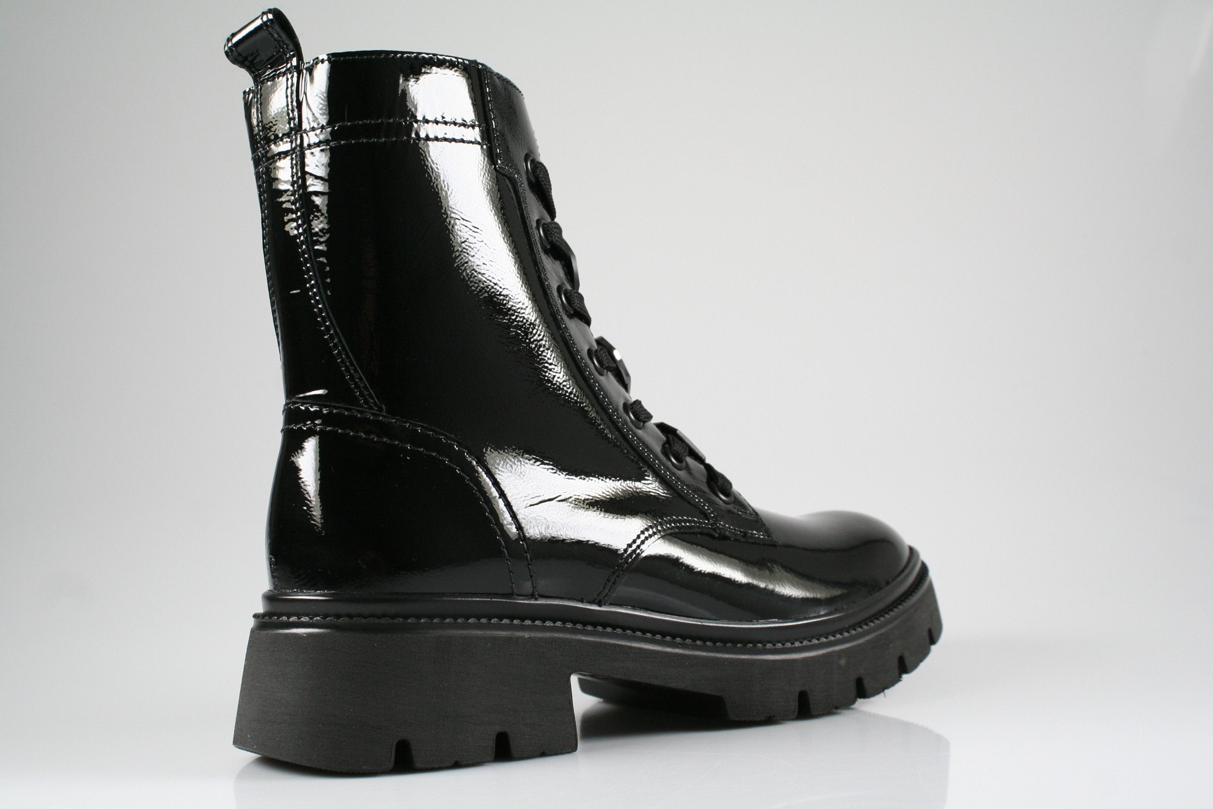 Typ: Boots; Farbe "schwarz"; Ausstattung:; - Obermaterial: Lack; - herausnehmbares Fußbett; - leichte Laufsohle; - gepolsterter Schaftrand; - Schnürsenkel und Reißverschluss zur Weitenregulierung