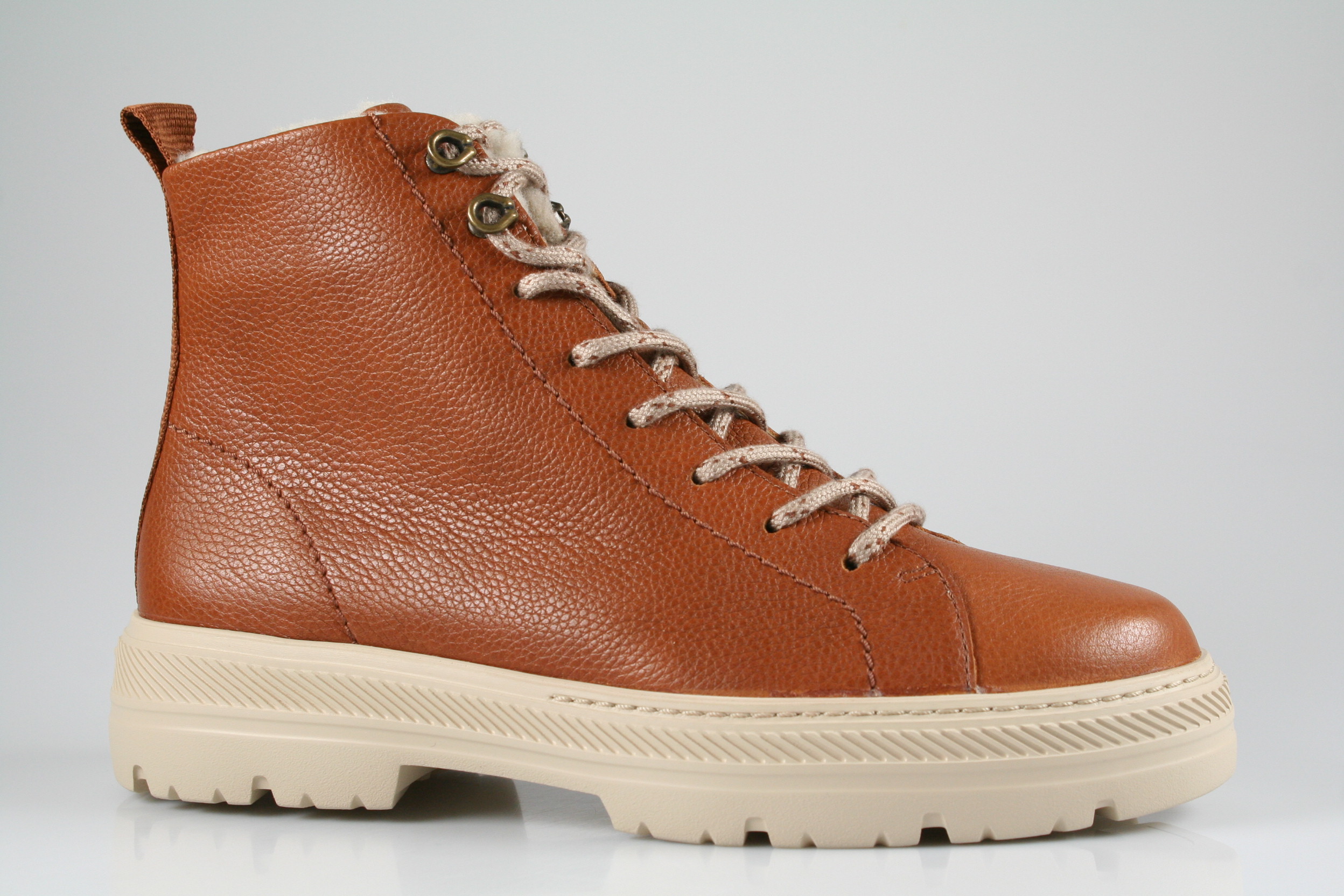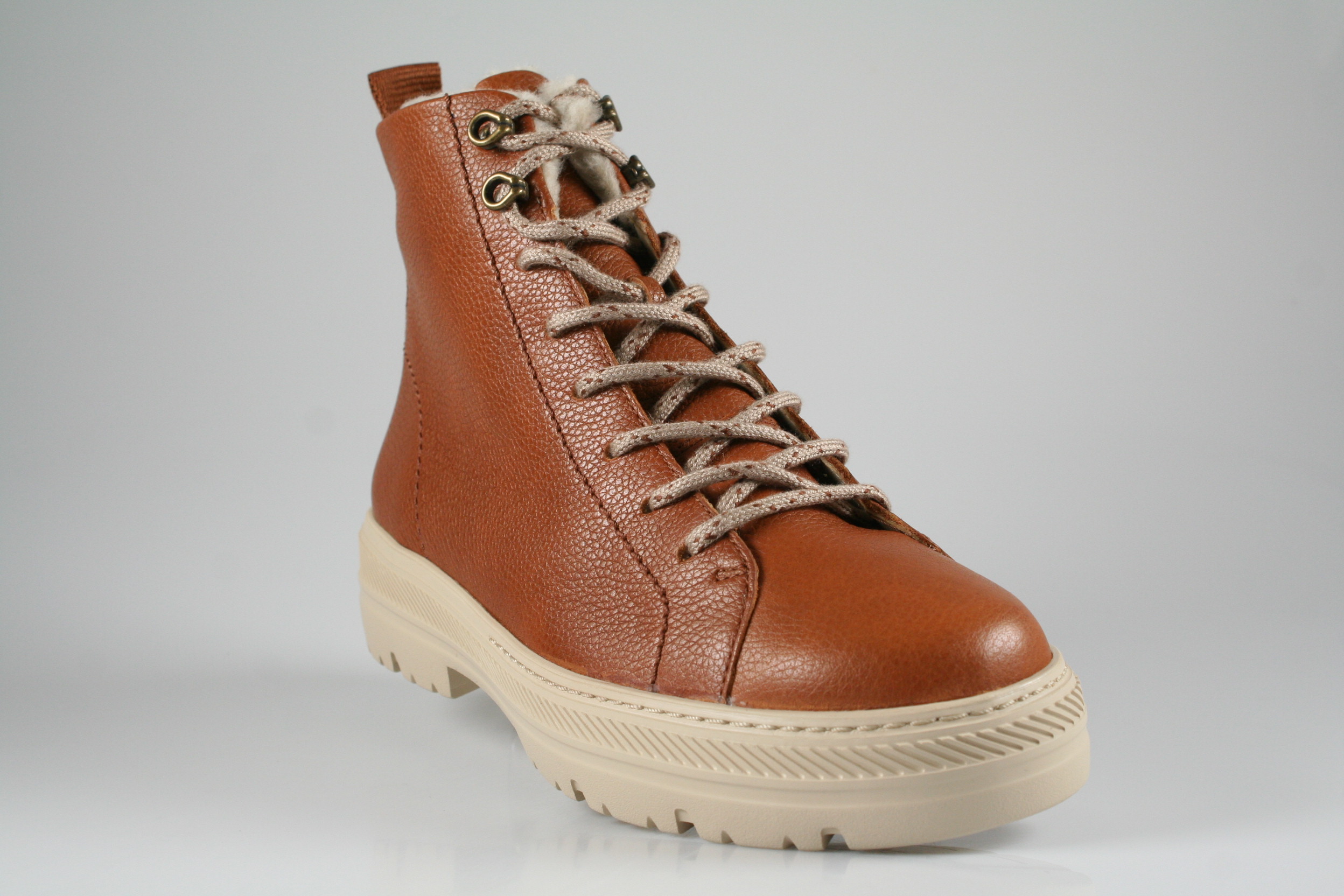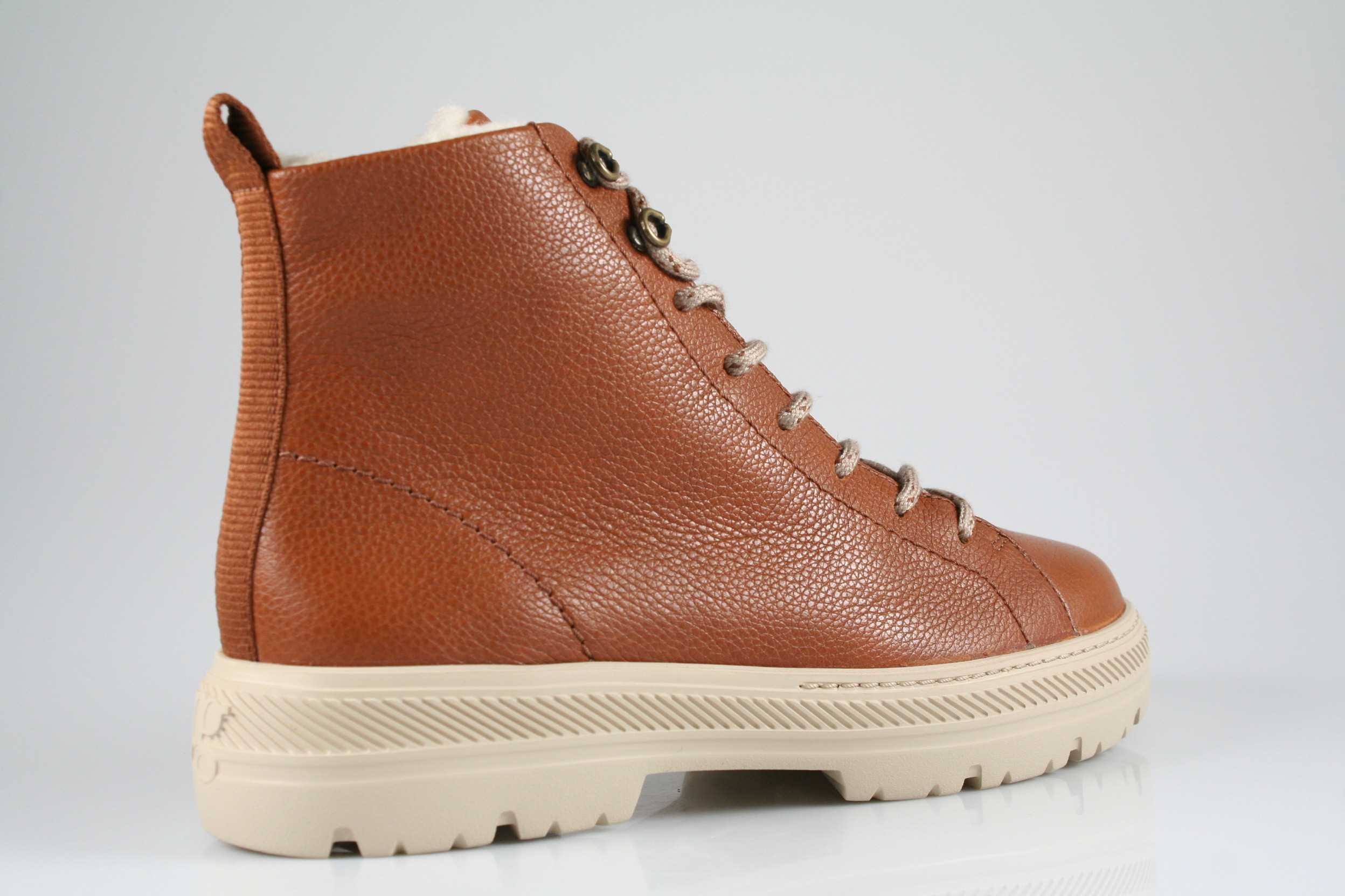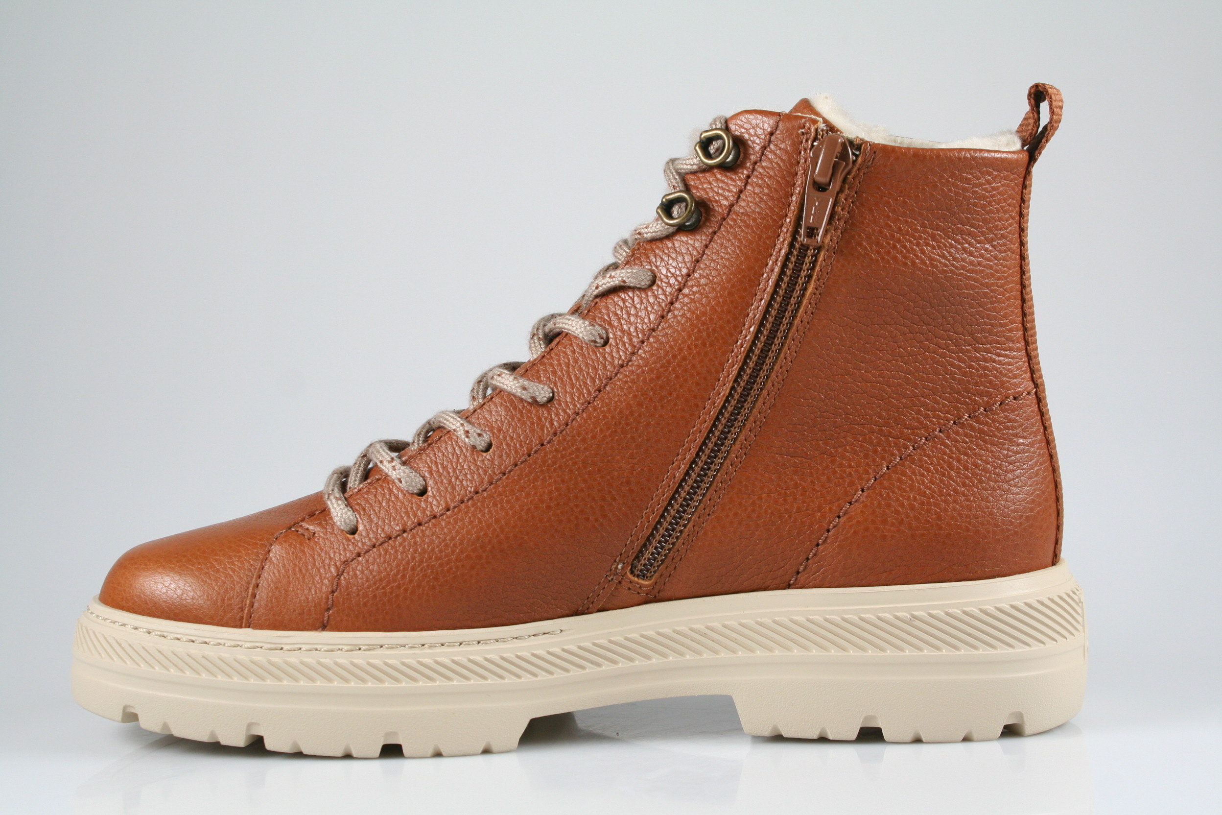 Typ: Boots; Farbe "cognac"; Ausstattung:; - Obermaterial: Leder; - Warmfutter; - weiches Fußbett; - flexible Laufsohle; - gepolsterter Schaftrand; - Schnürsenkel zur Weitenregulierung; - Reißverschluss an der Innenseite