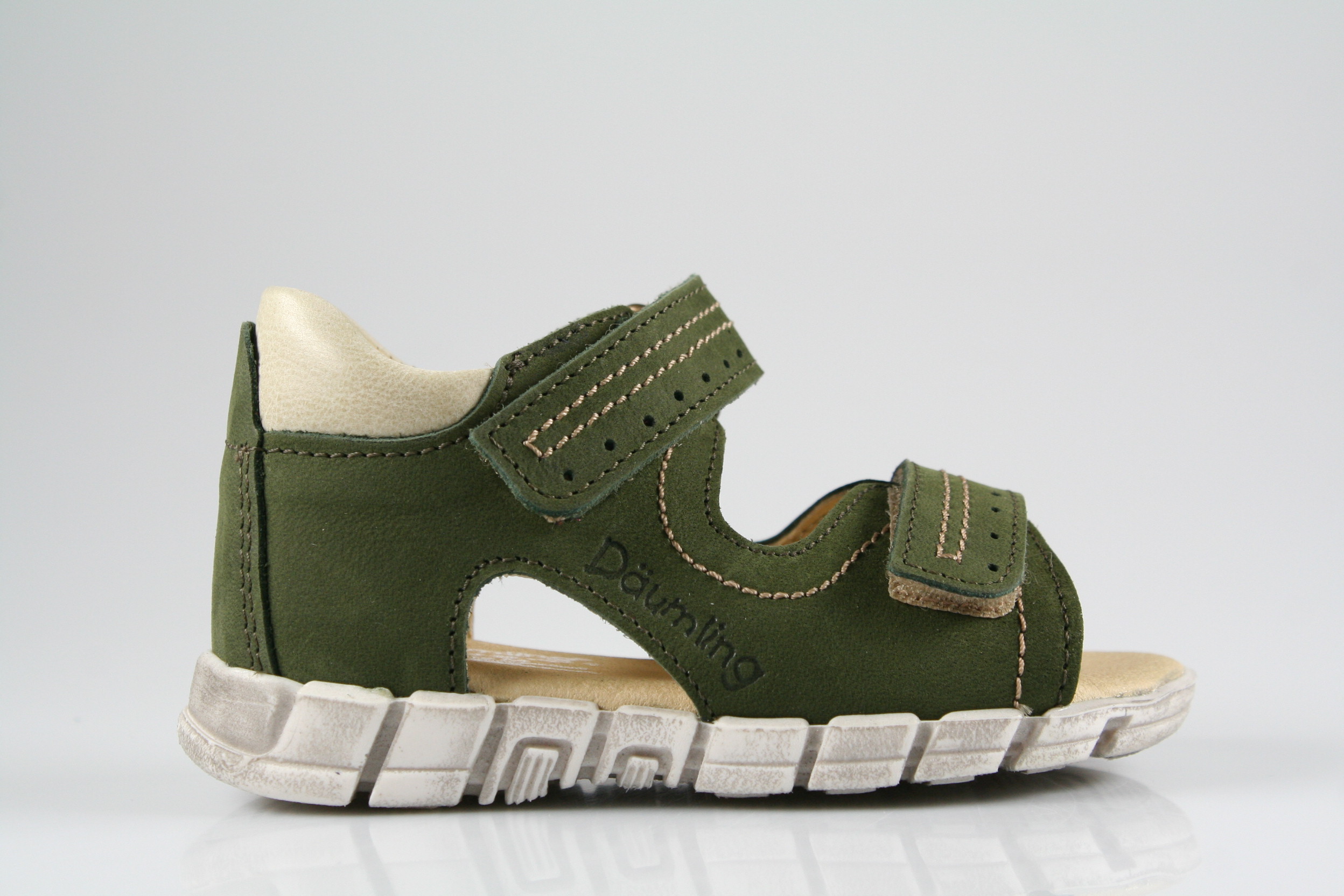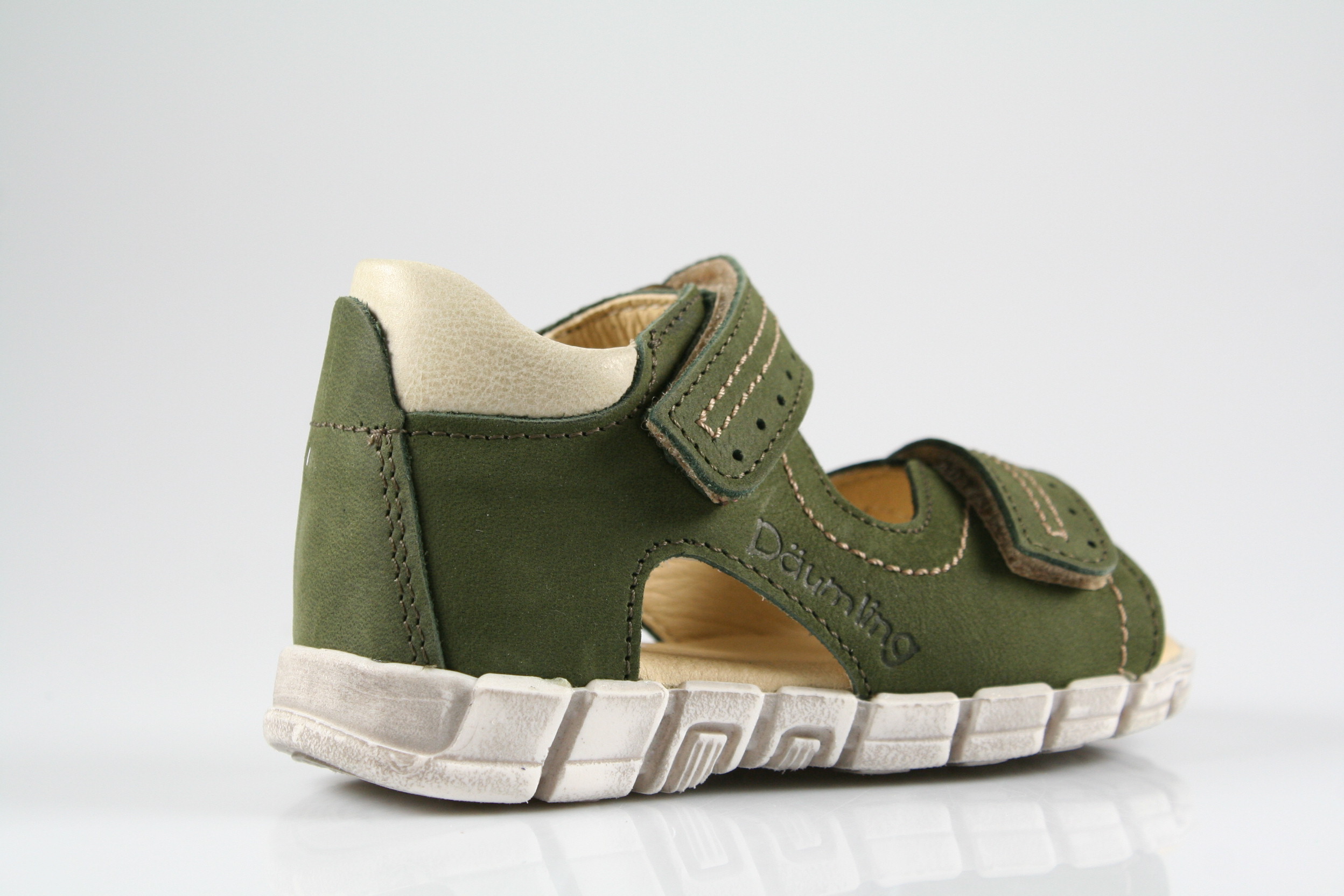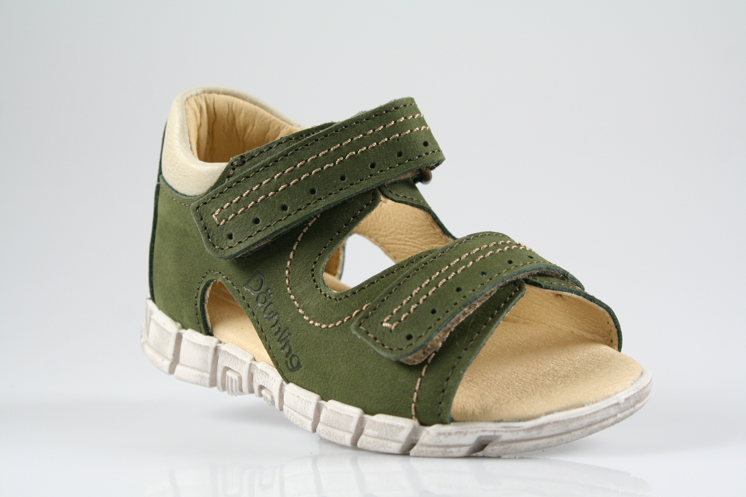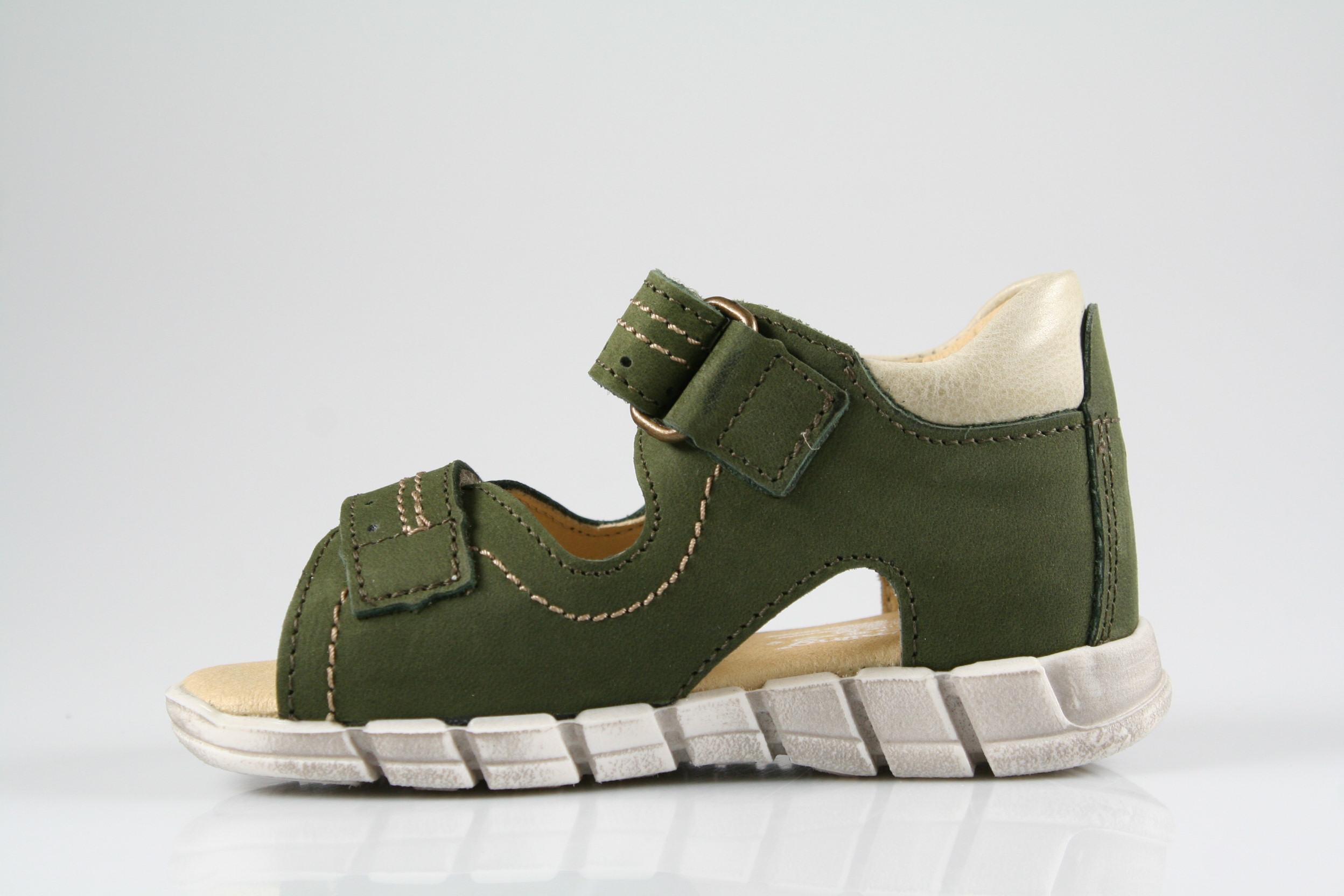 Typ: erste Schritte, Sandale; Farbe: "military"; Ausstattung:; - Obermaterial: Nubukleder; - Lederfutter; - weich gepolstertes Fußbett; - gepolsterter Schaftrand; - flexible Gummilaufsohle; - Riemchen mit Klettverschluss;