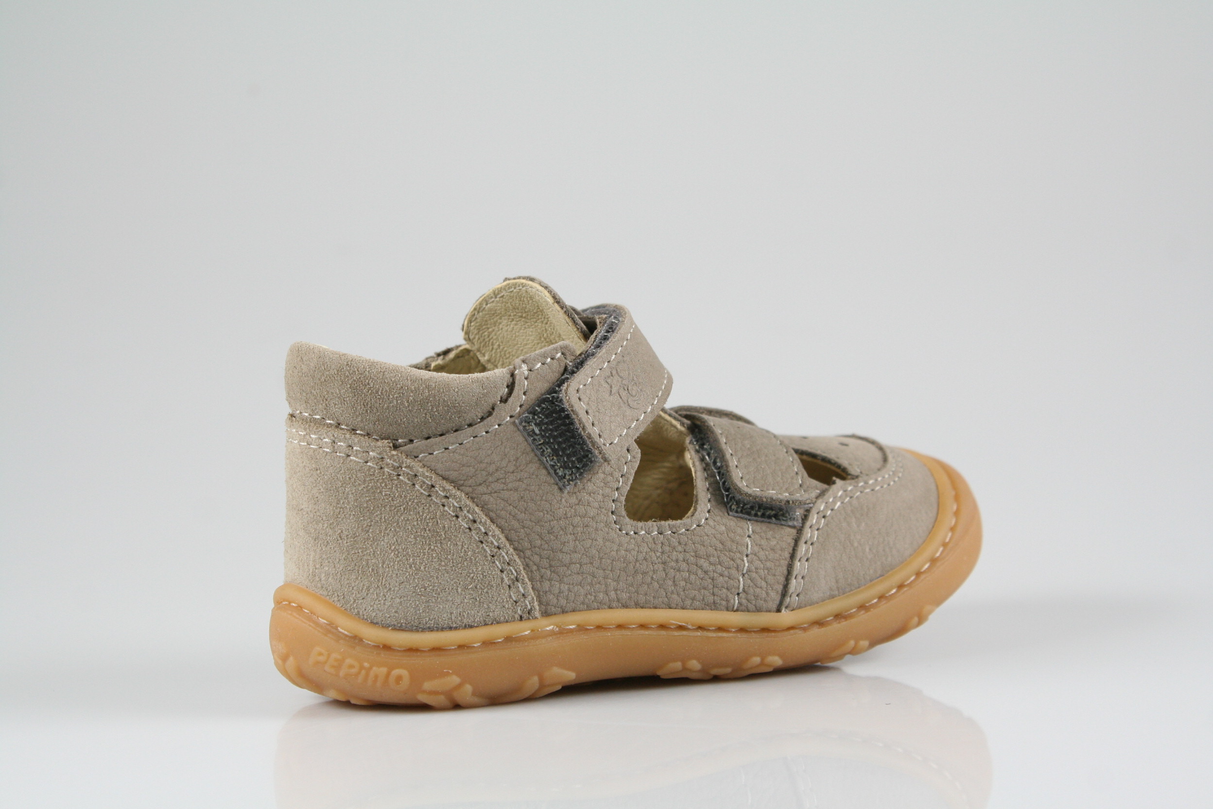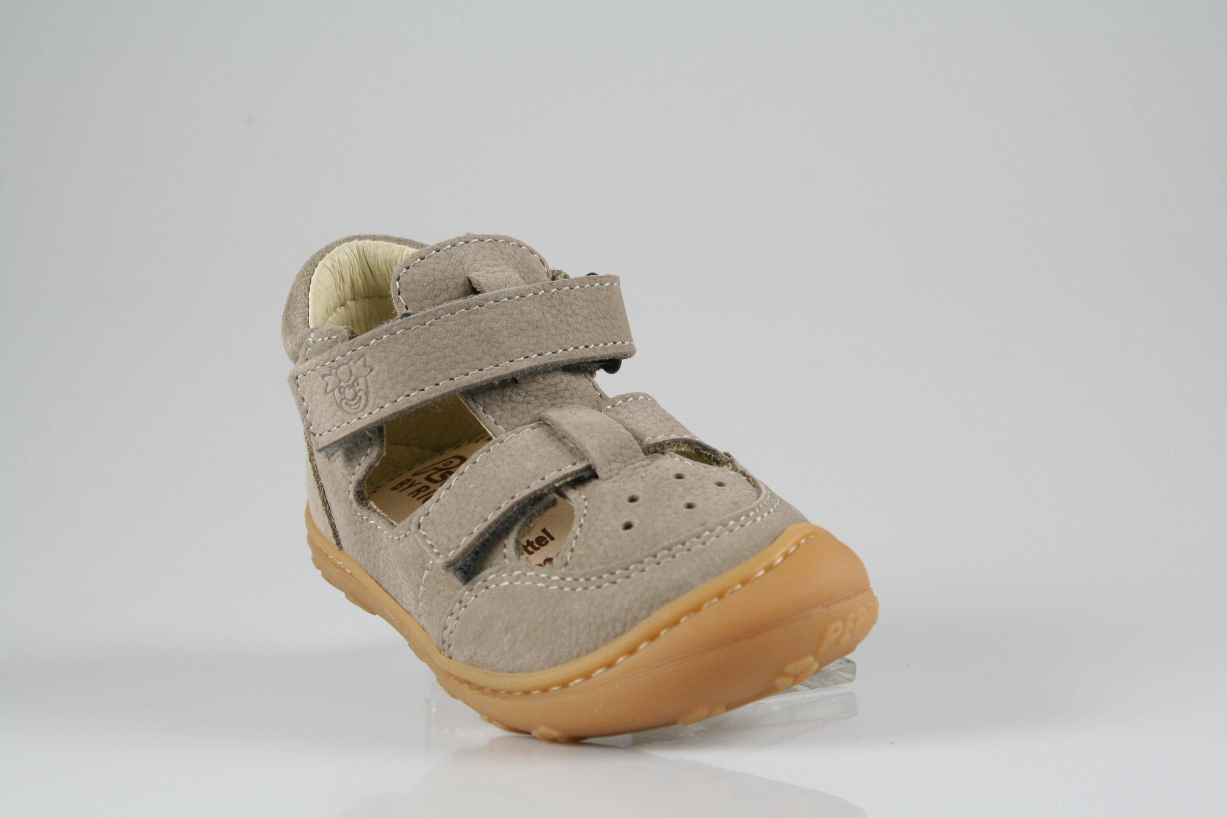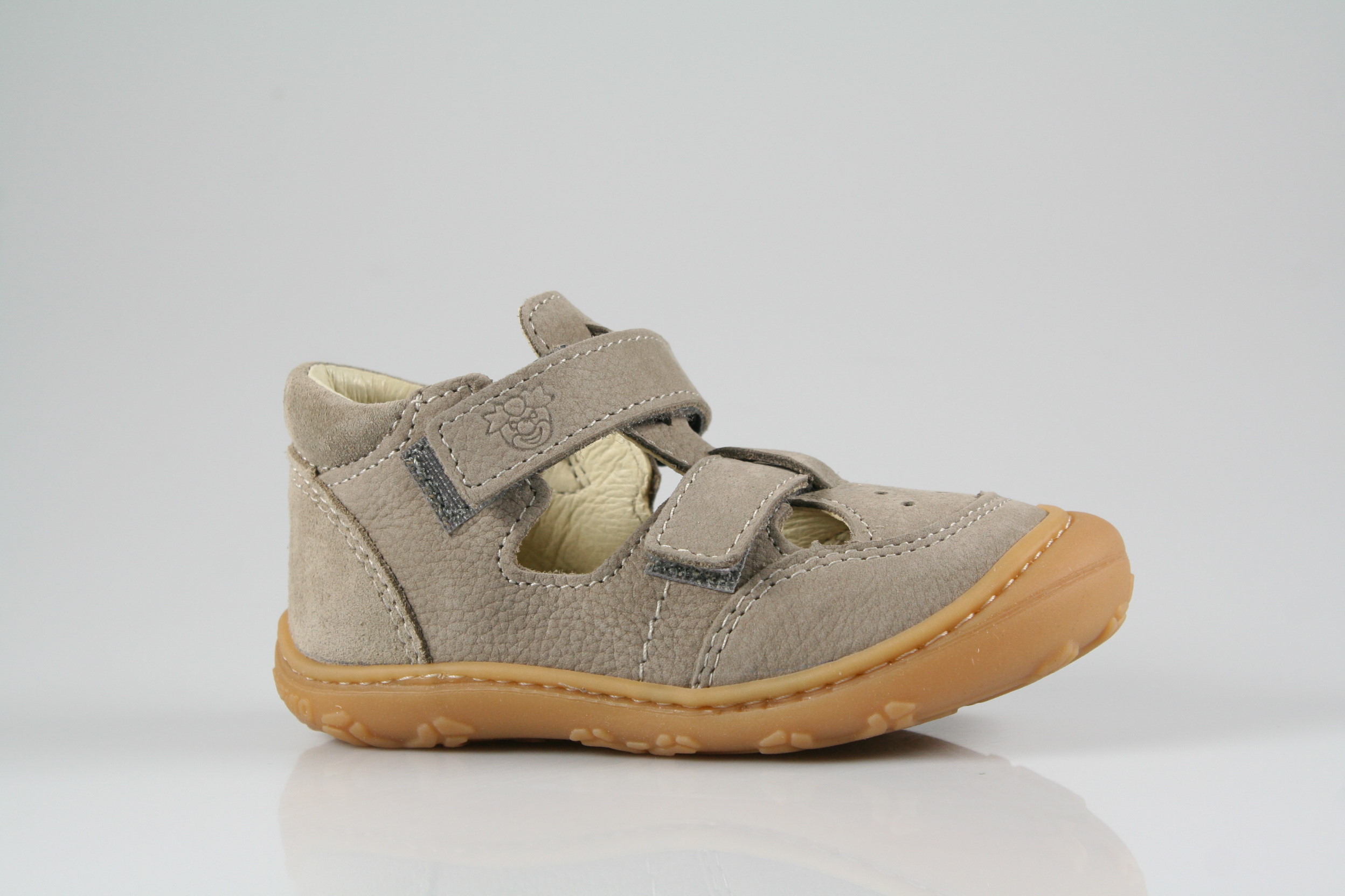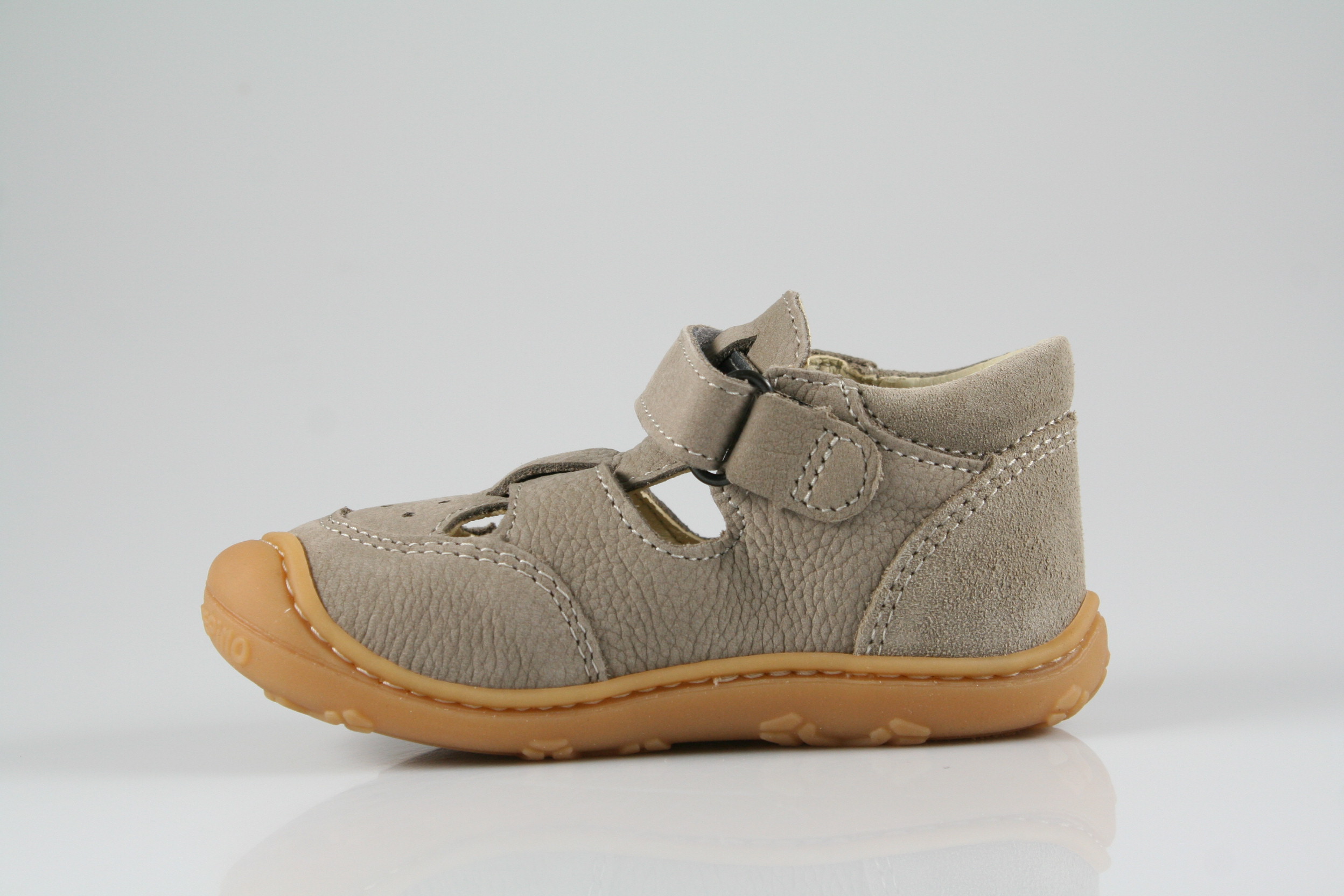 Typ: Lauflernsandale; Farbe: "kies/tundra"; Ausstattung:; - Obermaterial Nubukleder; - Lederfutter; - herausnehmbares Lederfußbett mit Grössenkontrolle; - gepolsterter Schaftrand; - flexible Gummisohle mit robuster Krabbelkappe; - Doppelklette; - Modell "ENI"; - Weite "M";