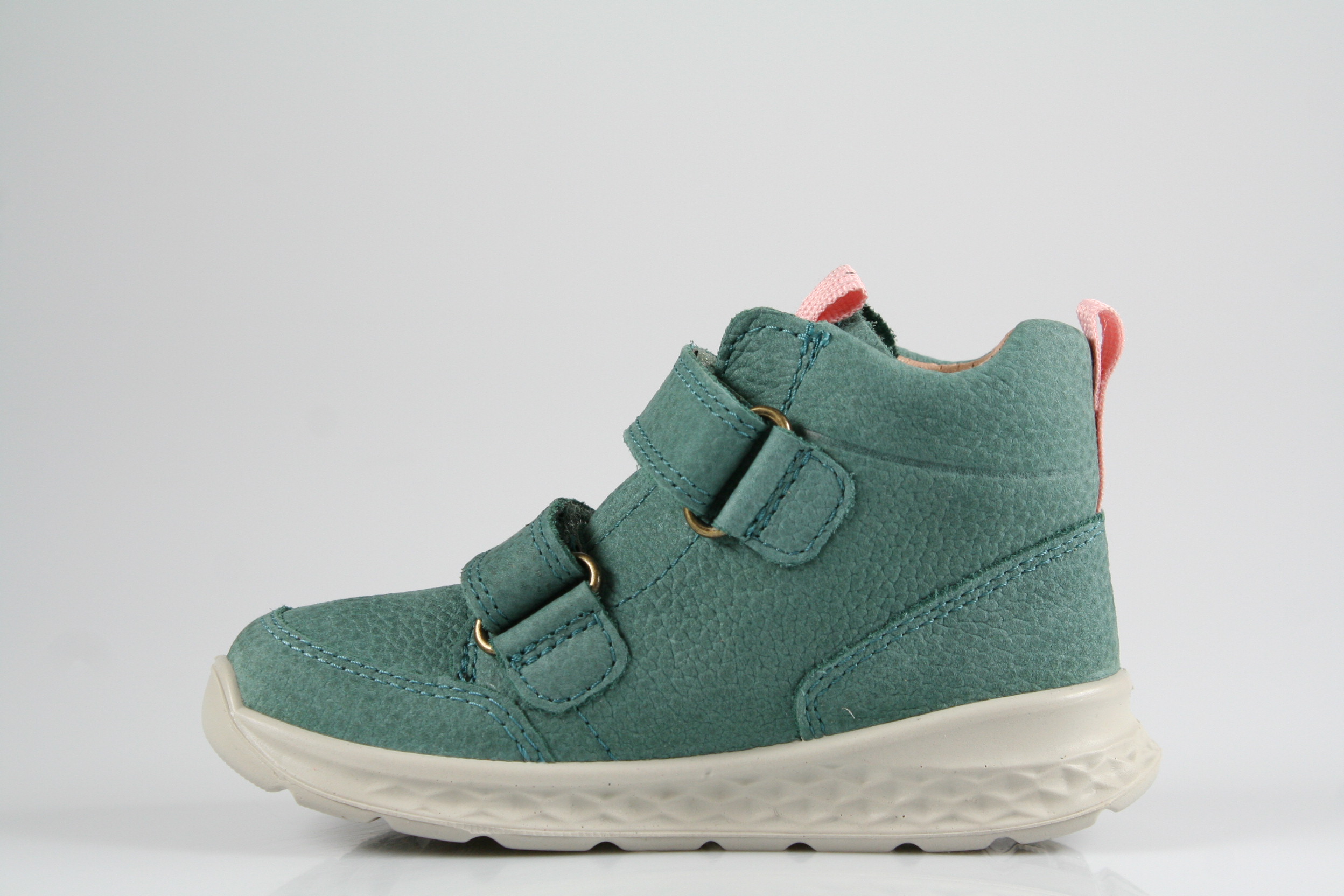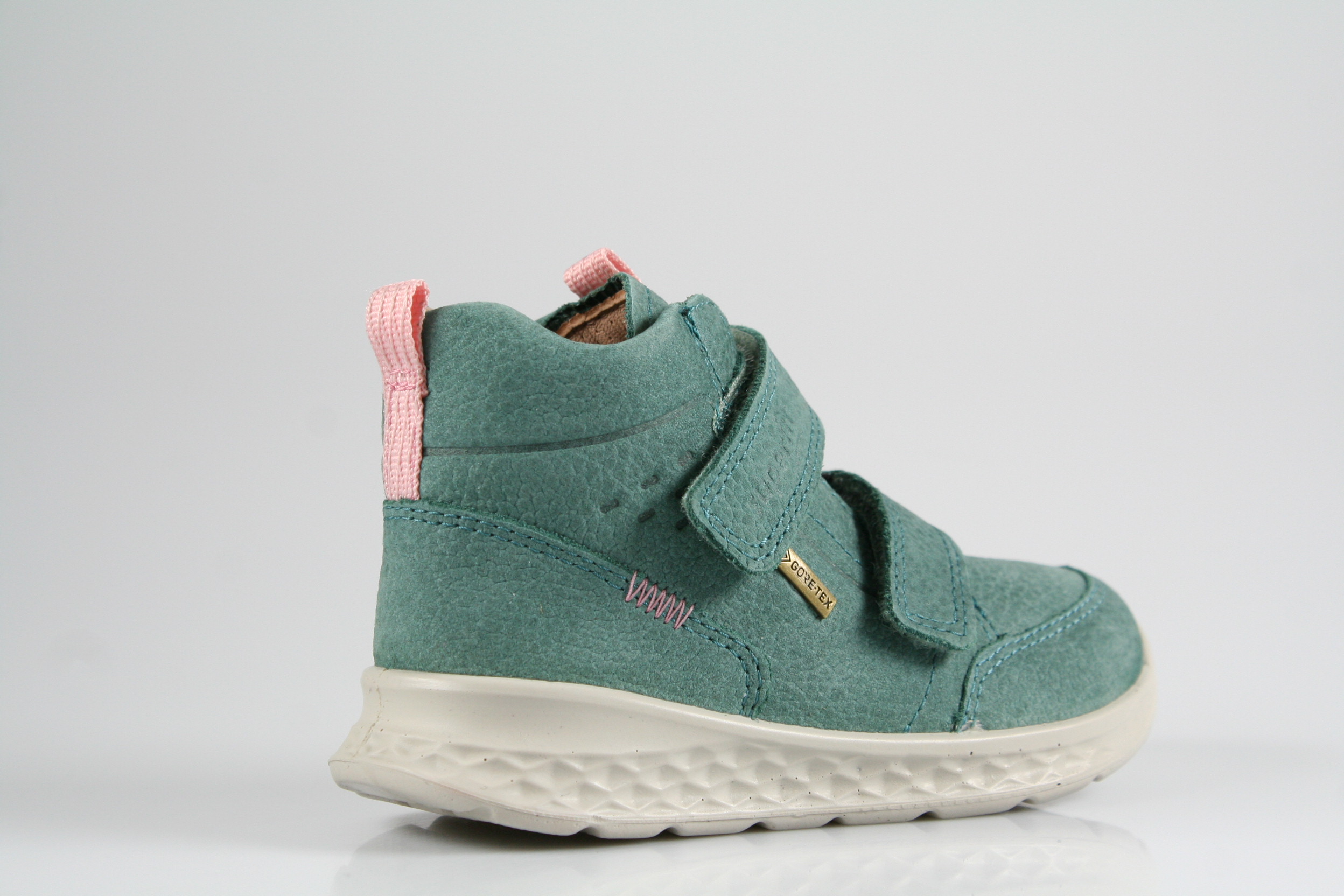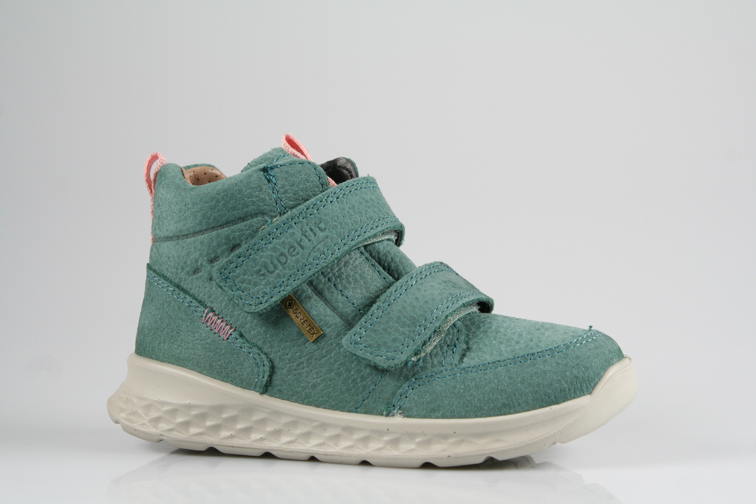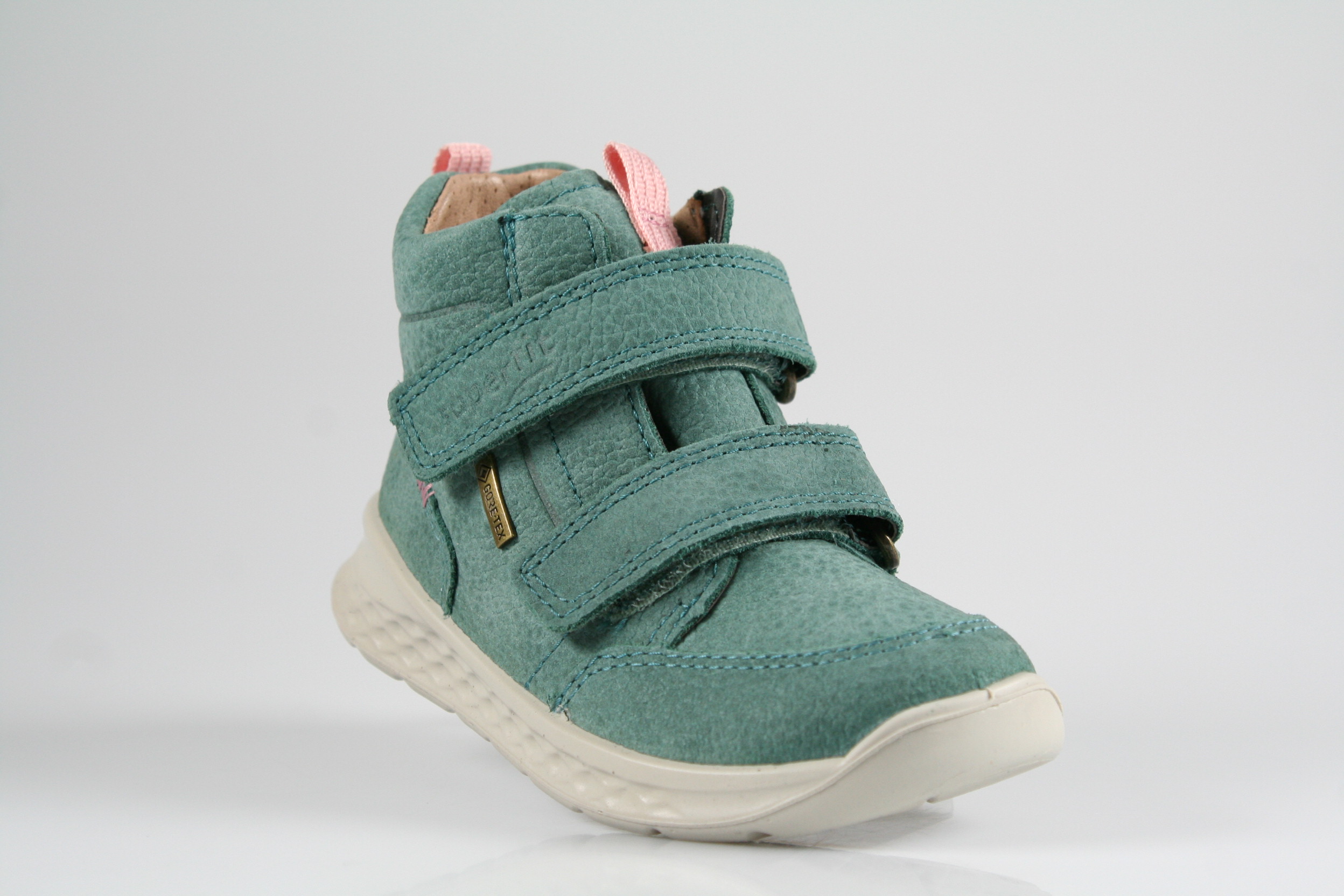 Typ: Erste-Schritte-Schuh; Farbe: "grün/rosa"; Ausstattung:; - Obermaterial: Nubukleder; - herausnehmbares Fußbett; - flexible Laufsohle; - gepolsterter Schaftrand; - Klettverschluss zur Weitenregulierung; - wasserfest durch "GoreTex"-Membrane