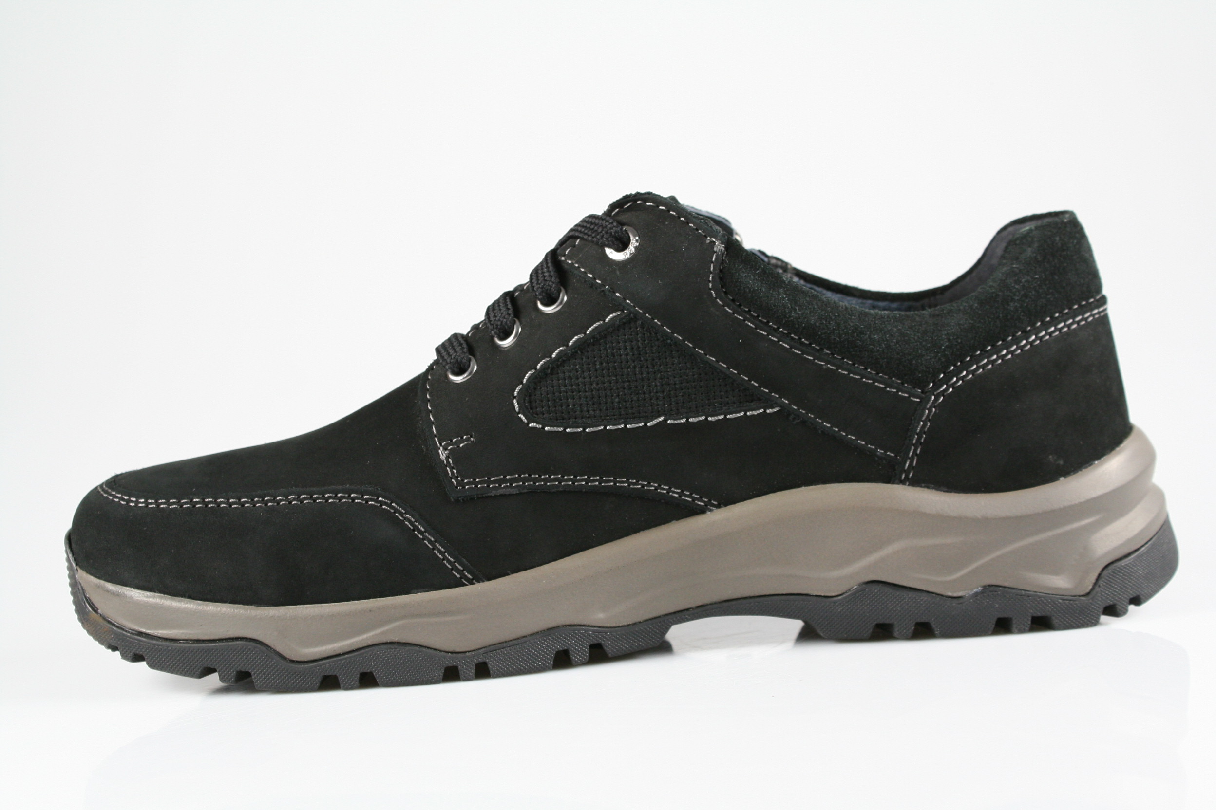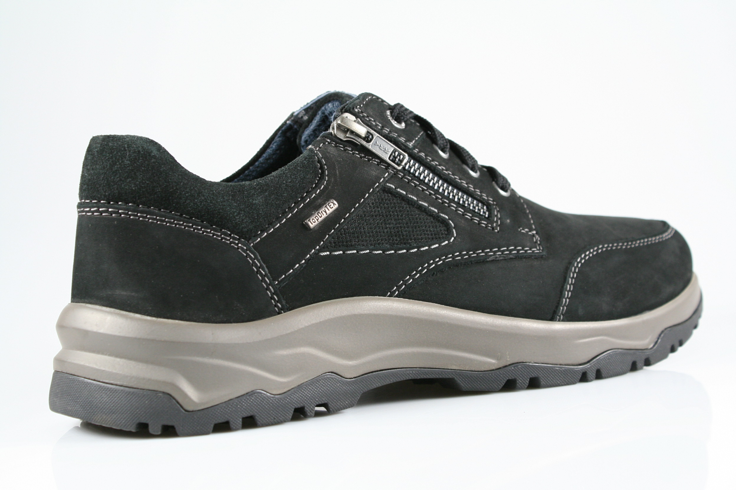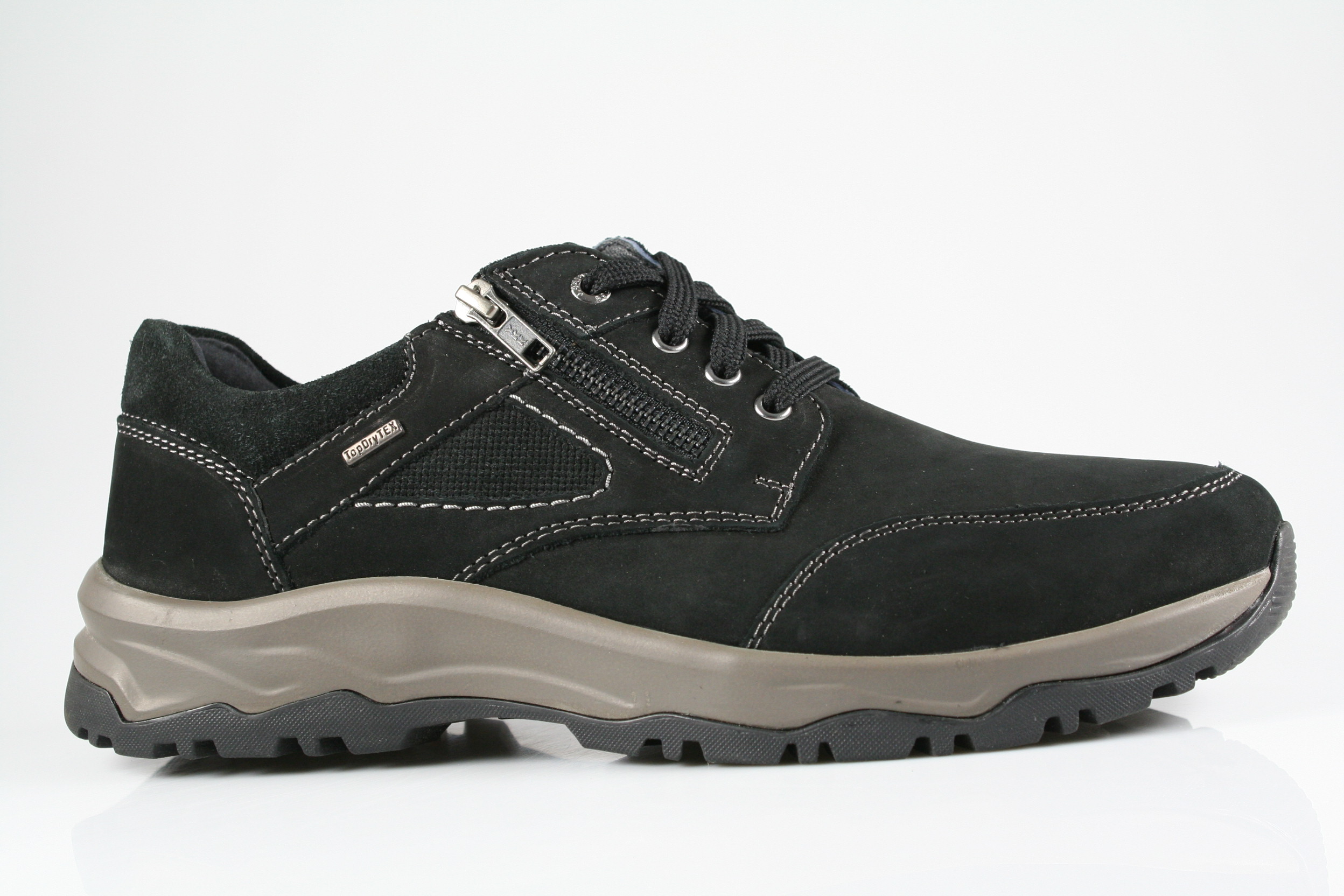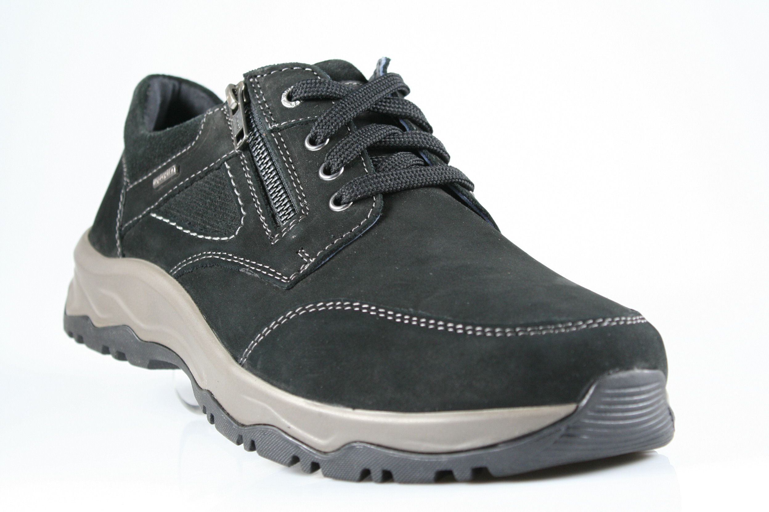 Typ: Halbschuh; Farbe: "schwarz"; Ausstattung:; - Obermaterial: Fettleder; - atmungsaktives Futter; - herausnehmbares Fußbett ; - robuste Profilsohle; - gepolsterter Schaftrand; - Schnürsenkel und Reißverschluss; - wasserdeste Membrane