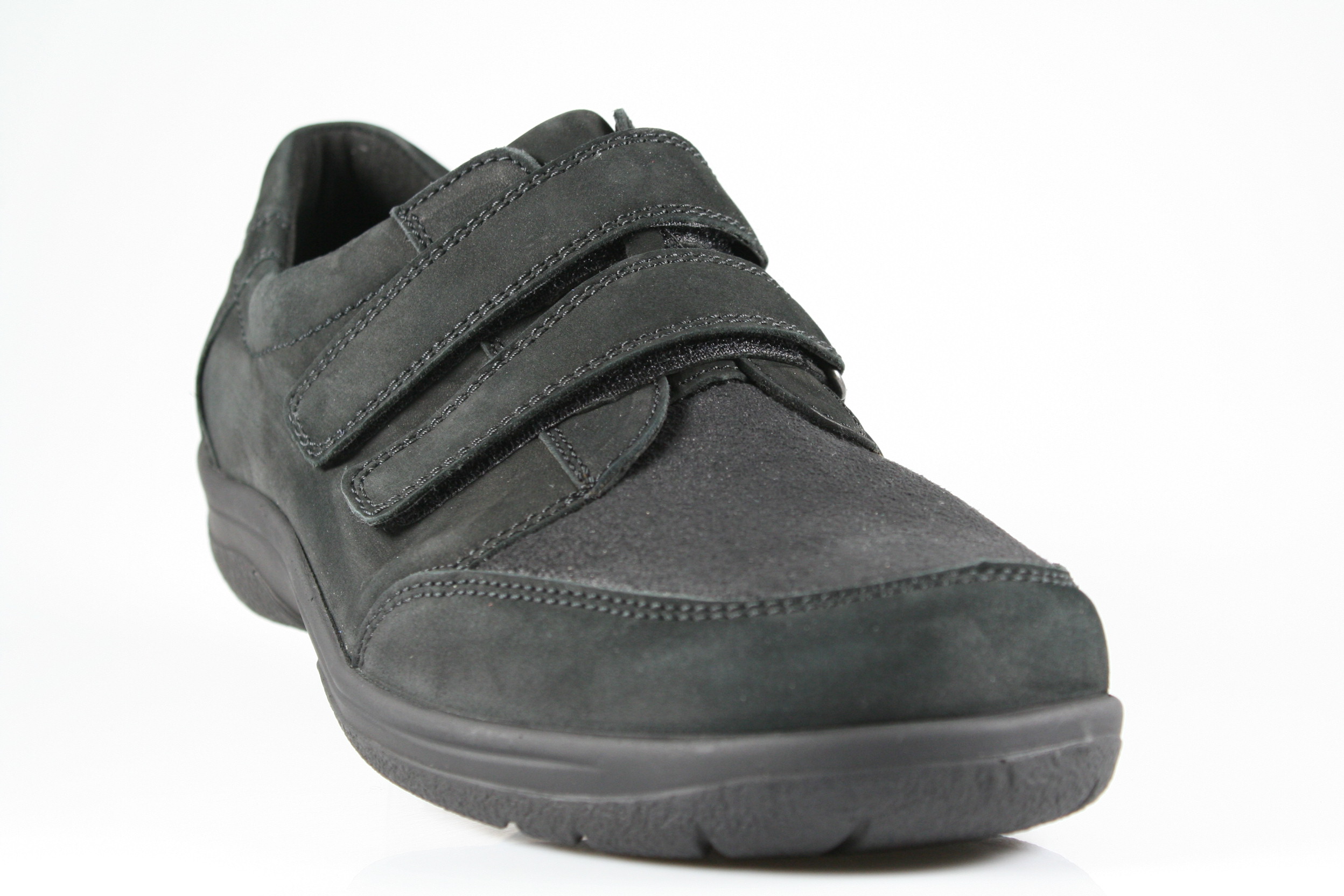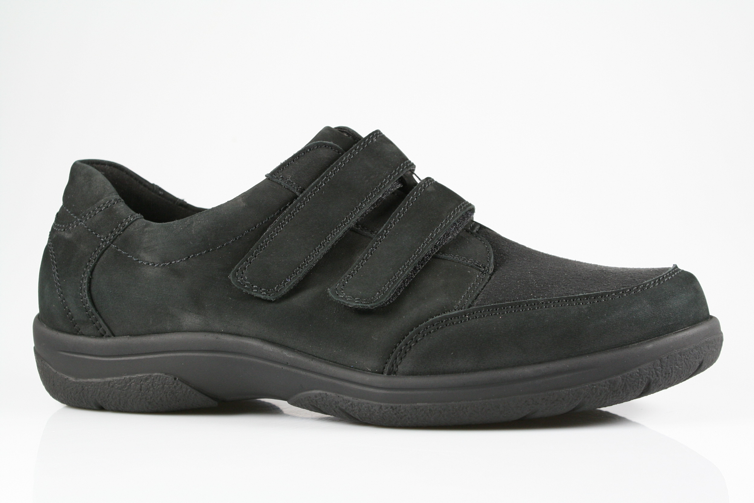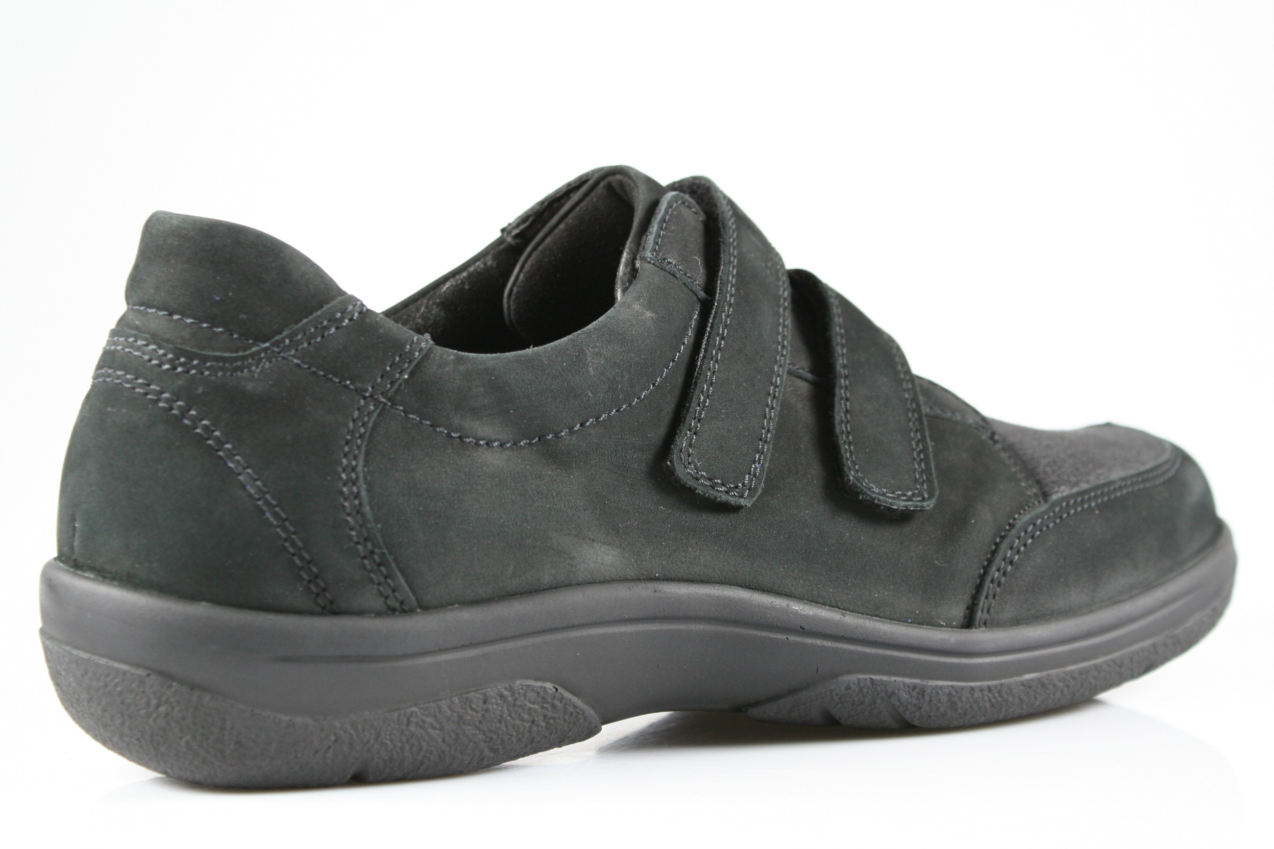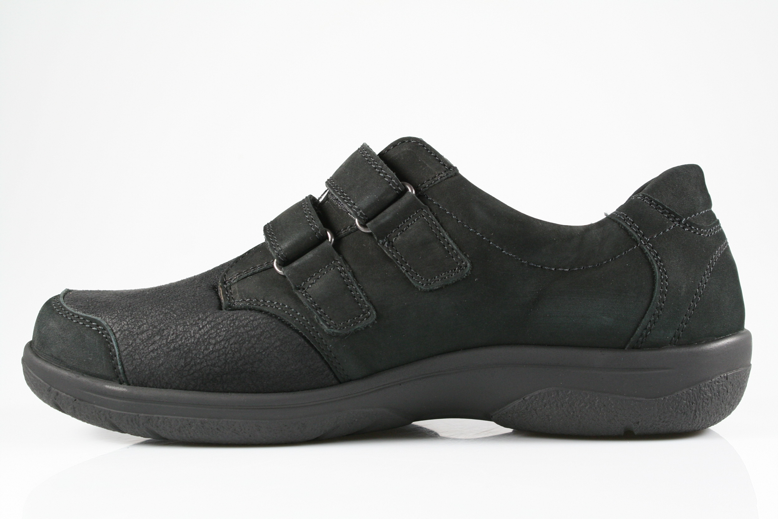 Typ: Halbschuh; Farbe "schwarz"; Ausstattung:; - Obermaterial: Leder, Stretch; - herausnehmbares Fußbett; - flexible Laufsohle; - gepolsterter Schaftrand; - Klettverschluss zur Weitenregulierung