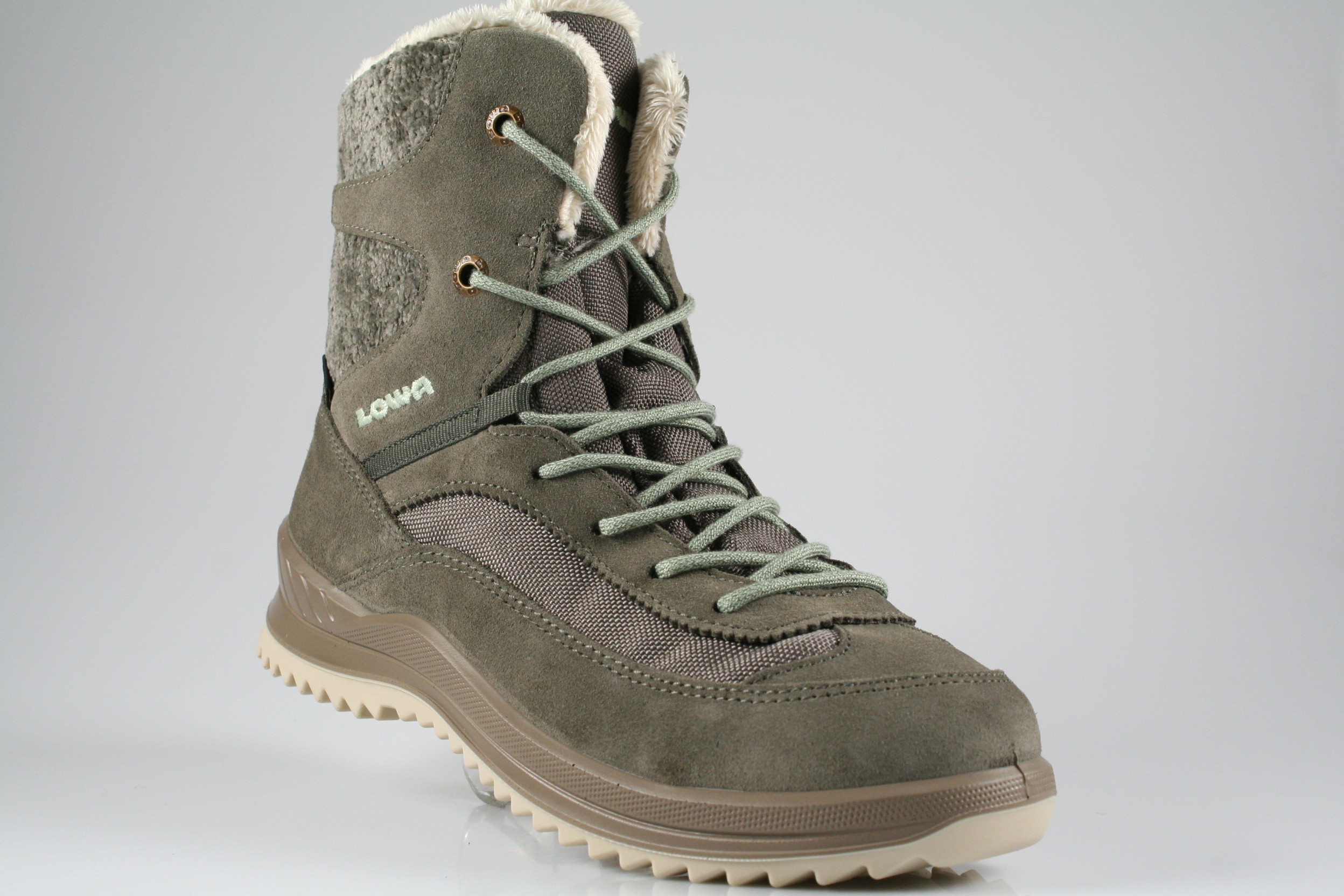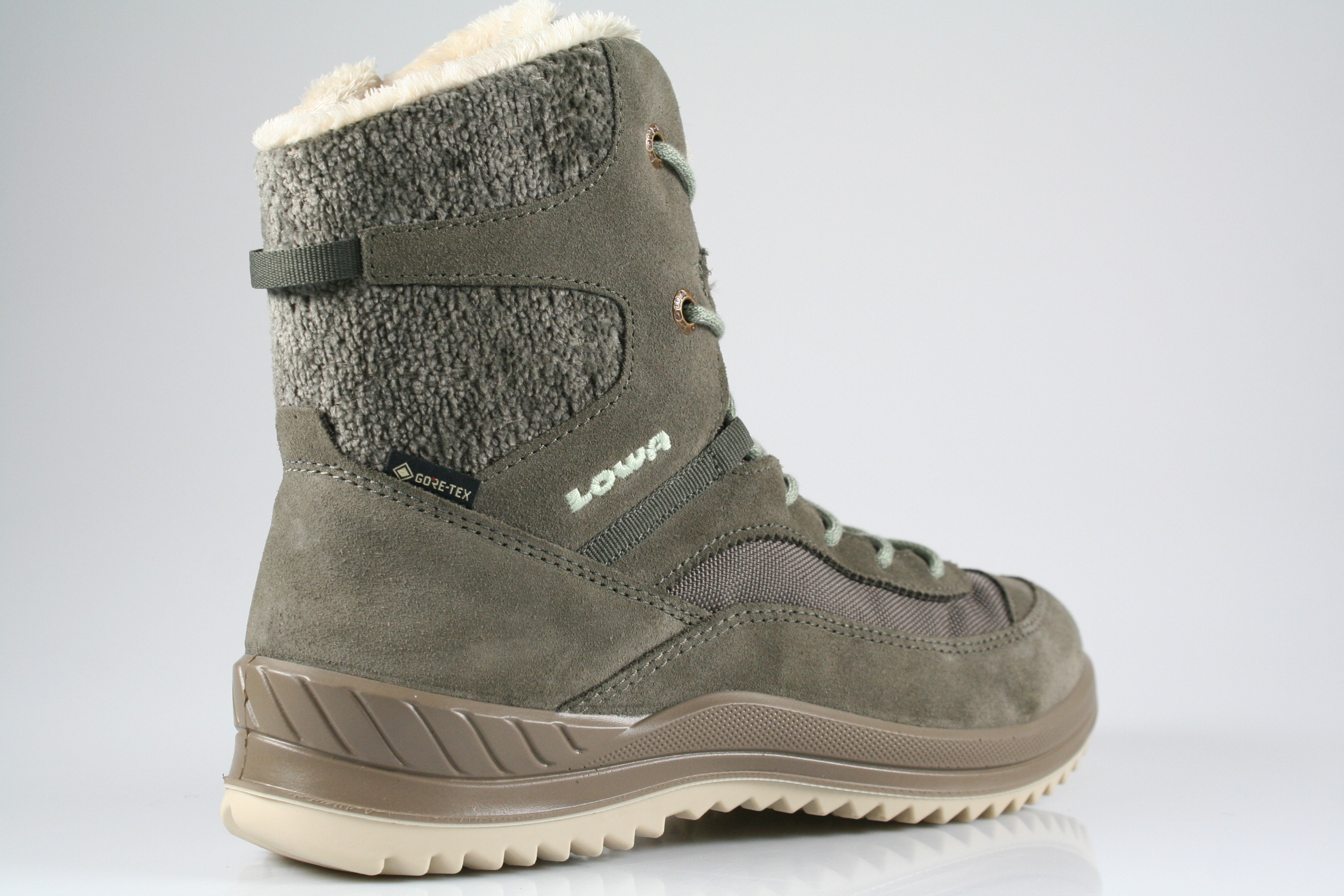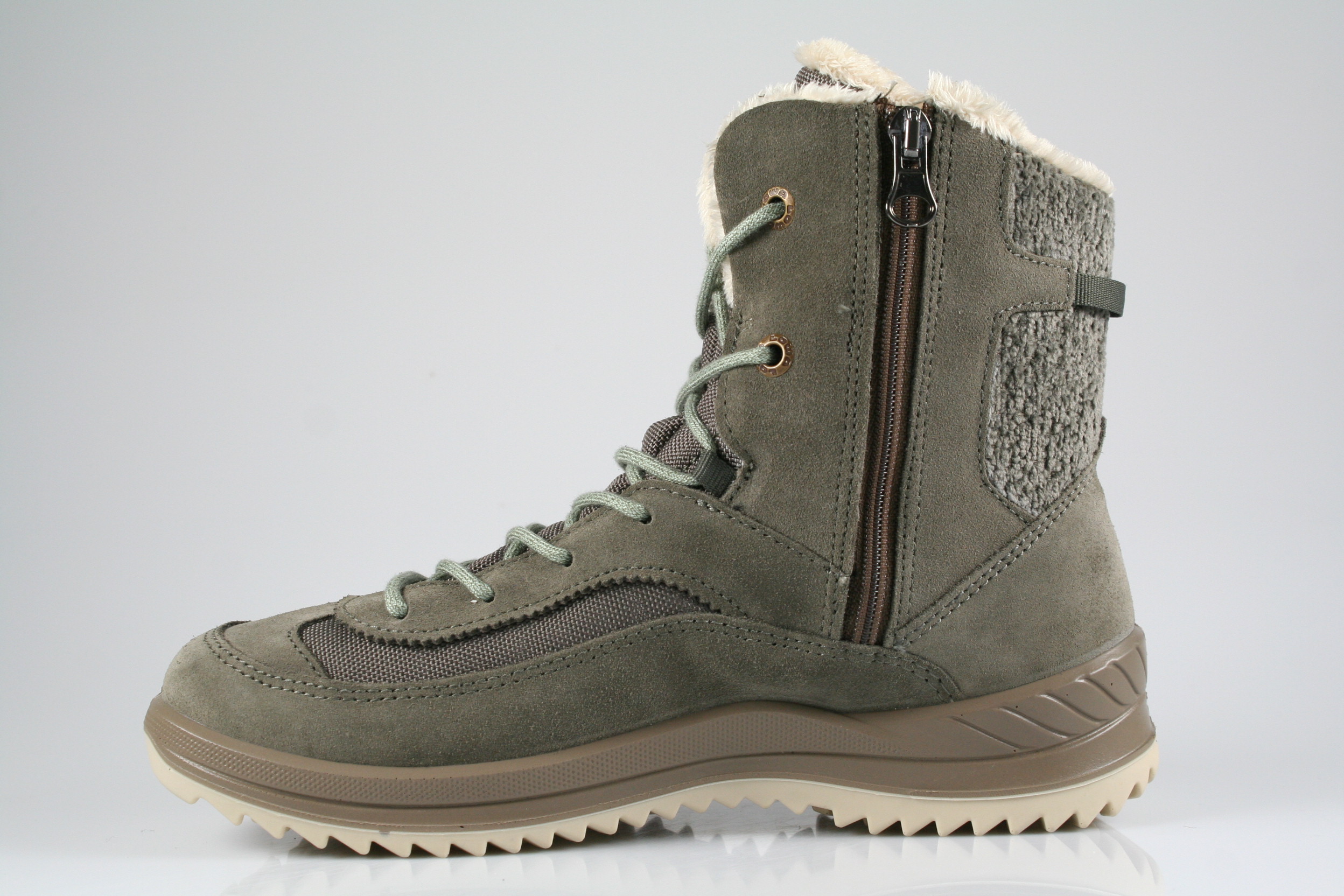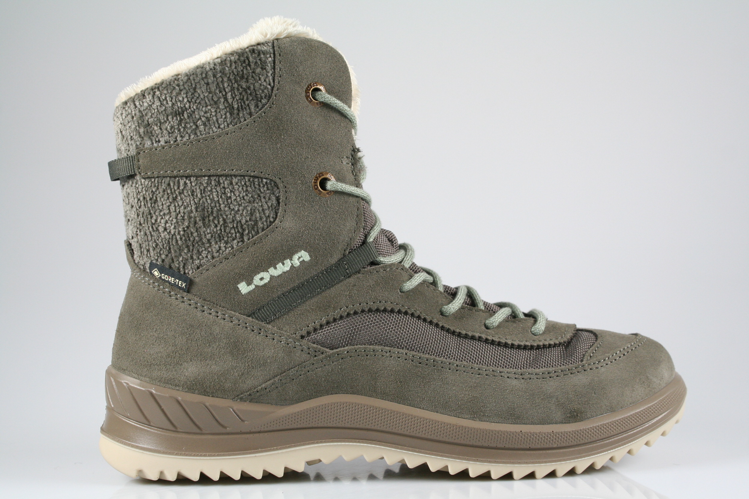 Typ: Boots; Farbe: "stein/mint"; Ausstattung:; - Obermaterial: Velourleder/Mesh/kombiniert; - wasserfest durch Gore-Tex; - auswechselbares Fußbett; - leichte, robuste Profilsohle; - gepolsterter Schaftrand; - Schnürung und Reißverschluss