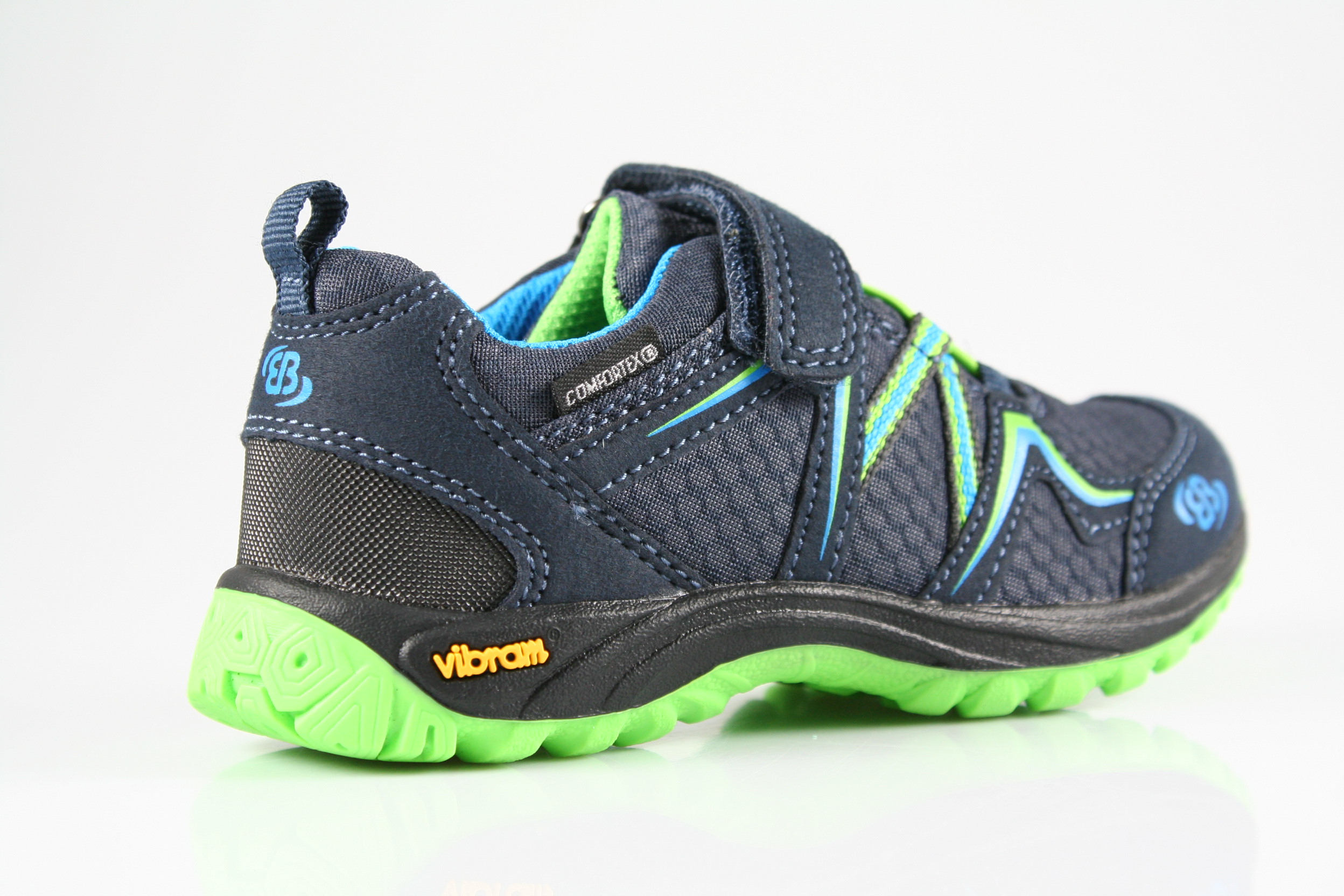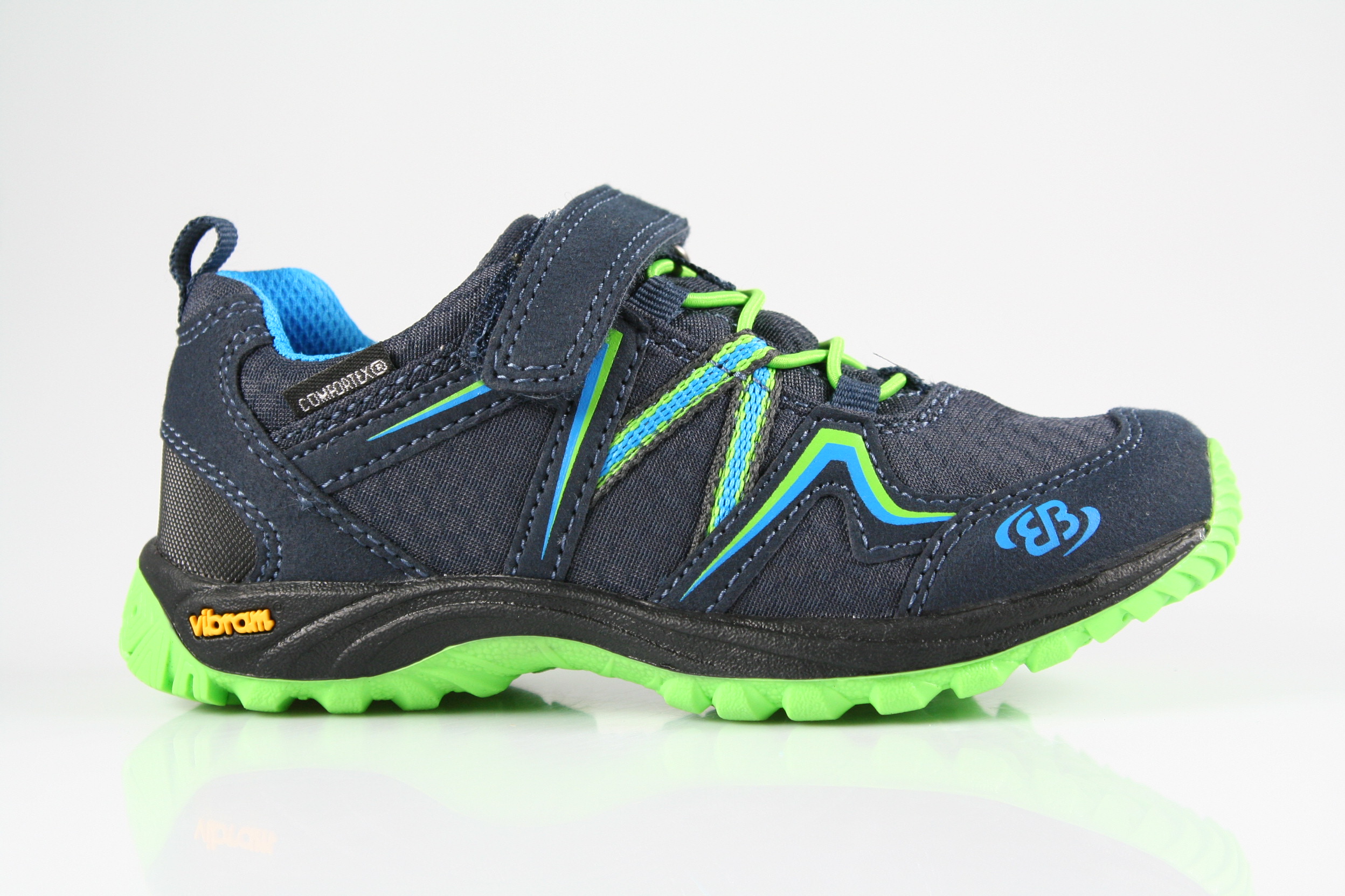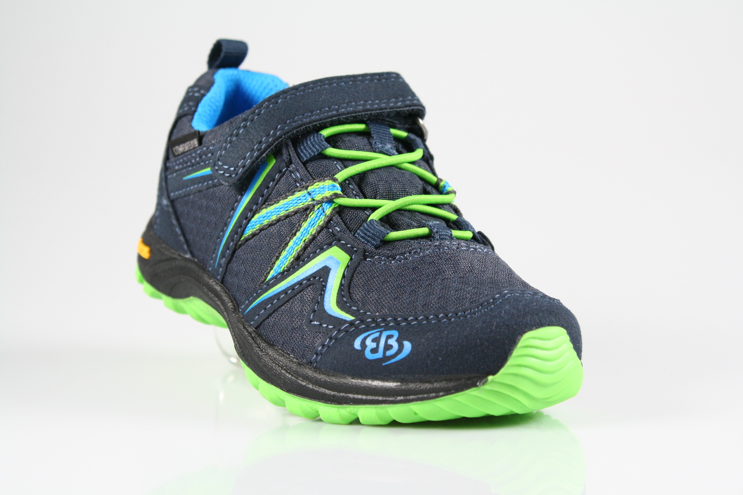 Typ: Halbschuh; Farbe: "marine/blau/lemon"; Ausstattung:; - Obermaterial: Mesh; - herausnehmbares Fußbett; - leichte Laufsohle; - gepolsterter Schaftrand; - Gummizug und Klettverschluss; - wasserfest durch "ComforTex"-Membrane