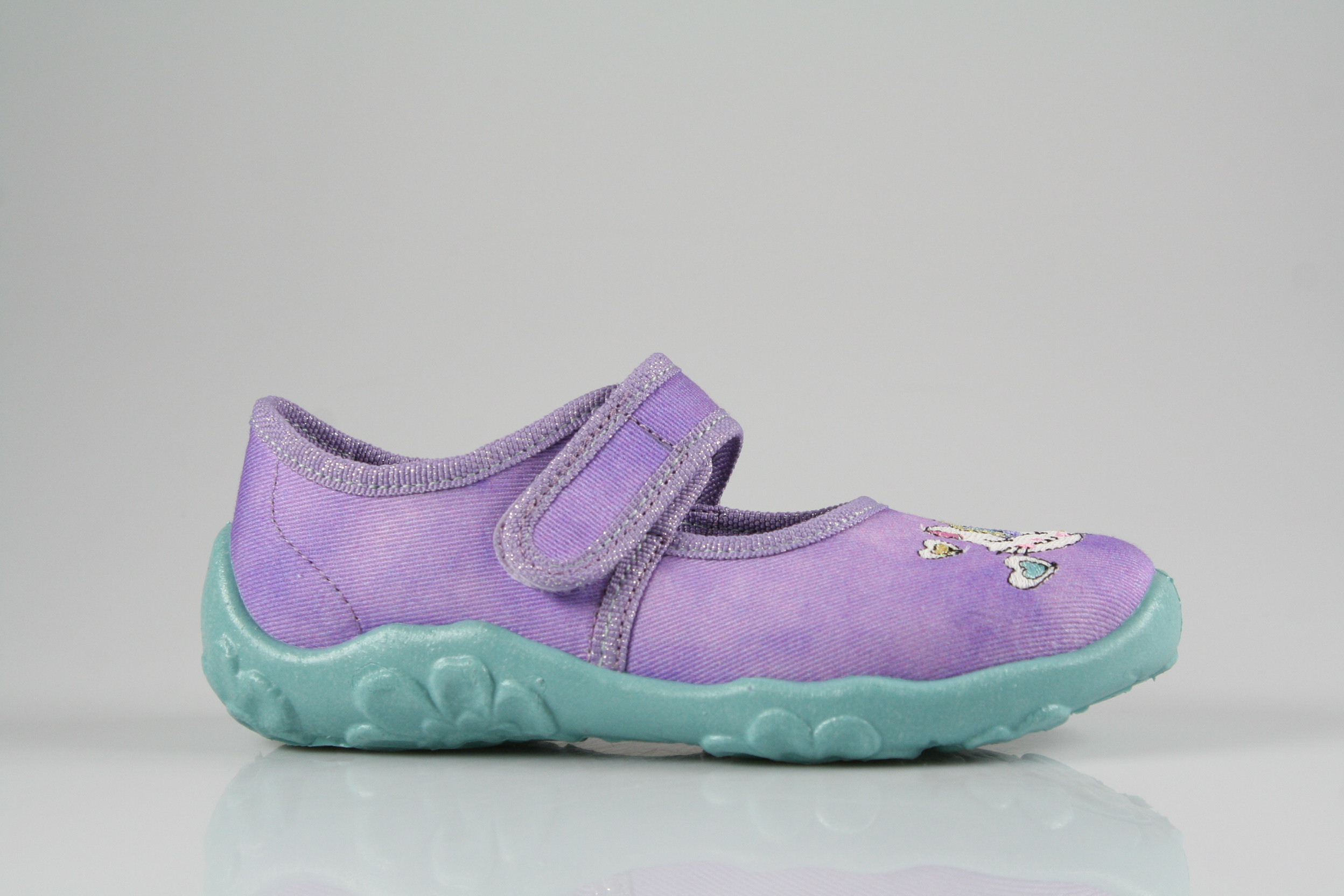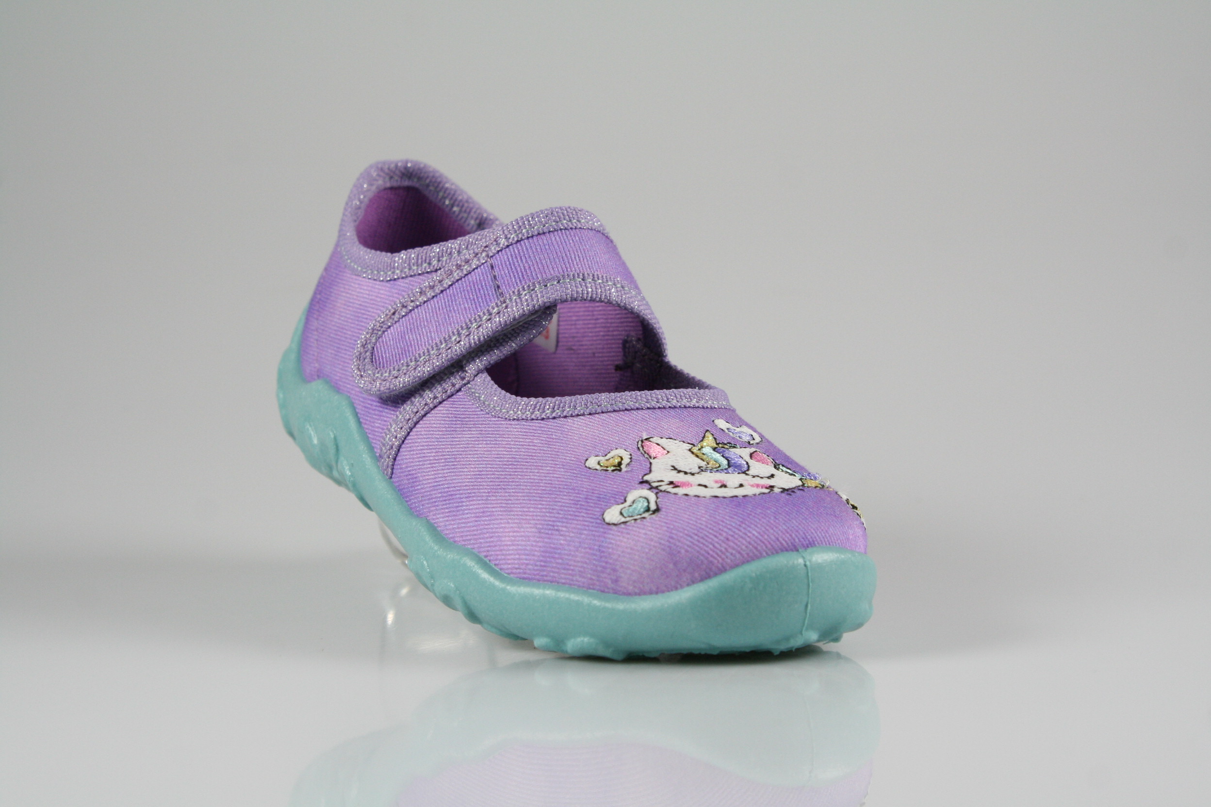 Typ: Hausschuh; Farbe: lila; Ausstattung:; - Obermaterial Textilien; - weiches Fußbett; - leichte und flexible Laufsohle; - atmungsaktiv durch perforierte Laufsohle; - Klettverschluss zur Weitenregulierung; - Modell "Bonny"