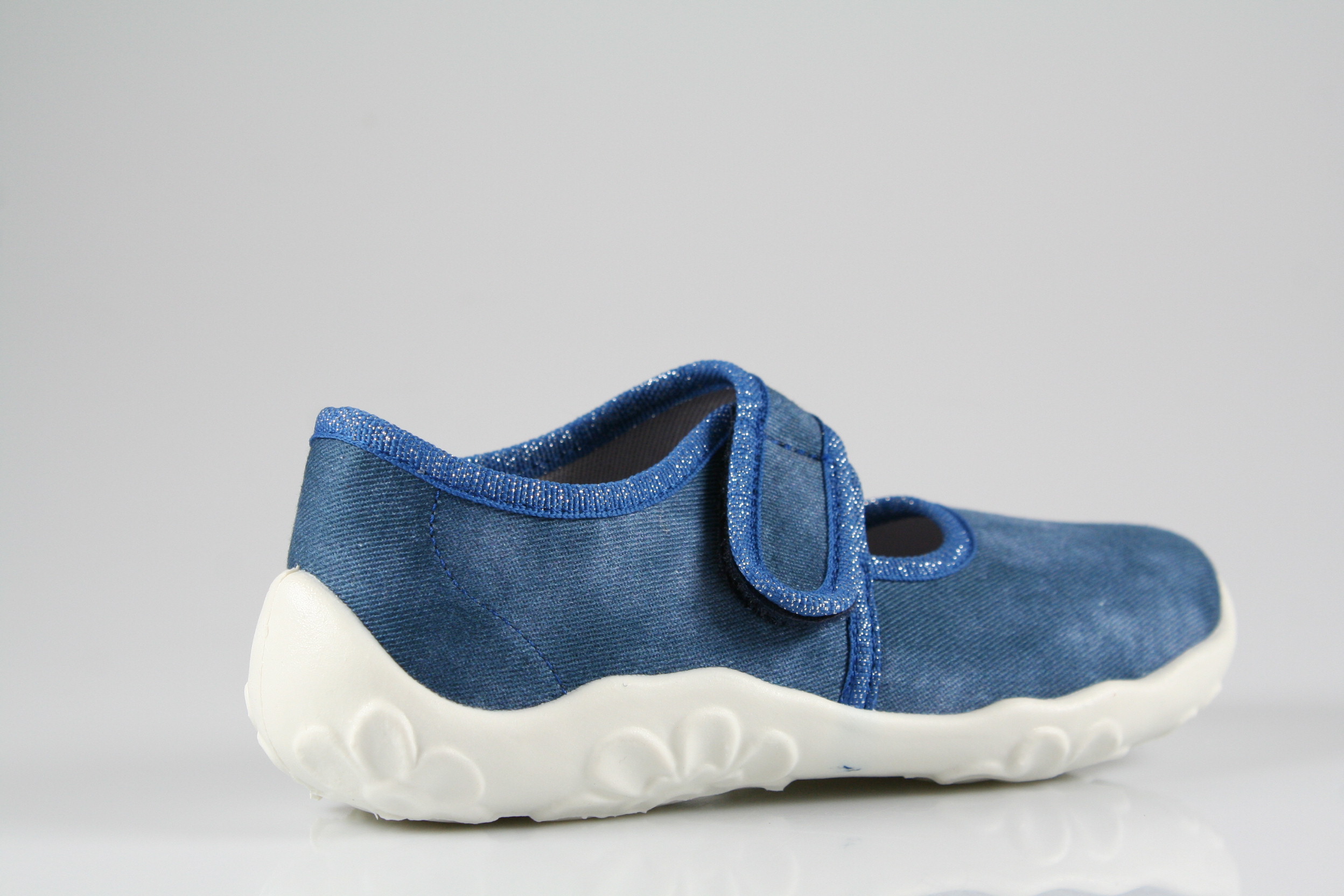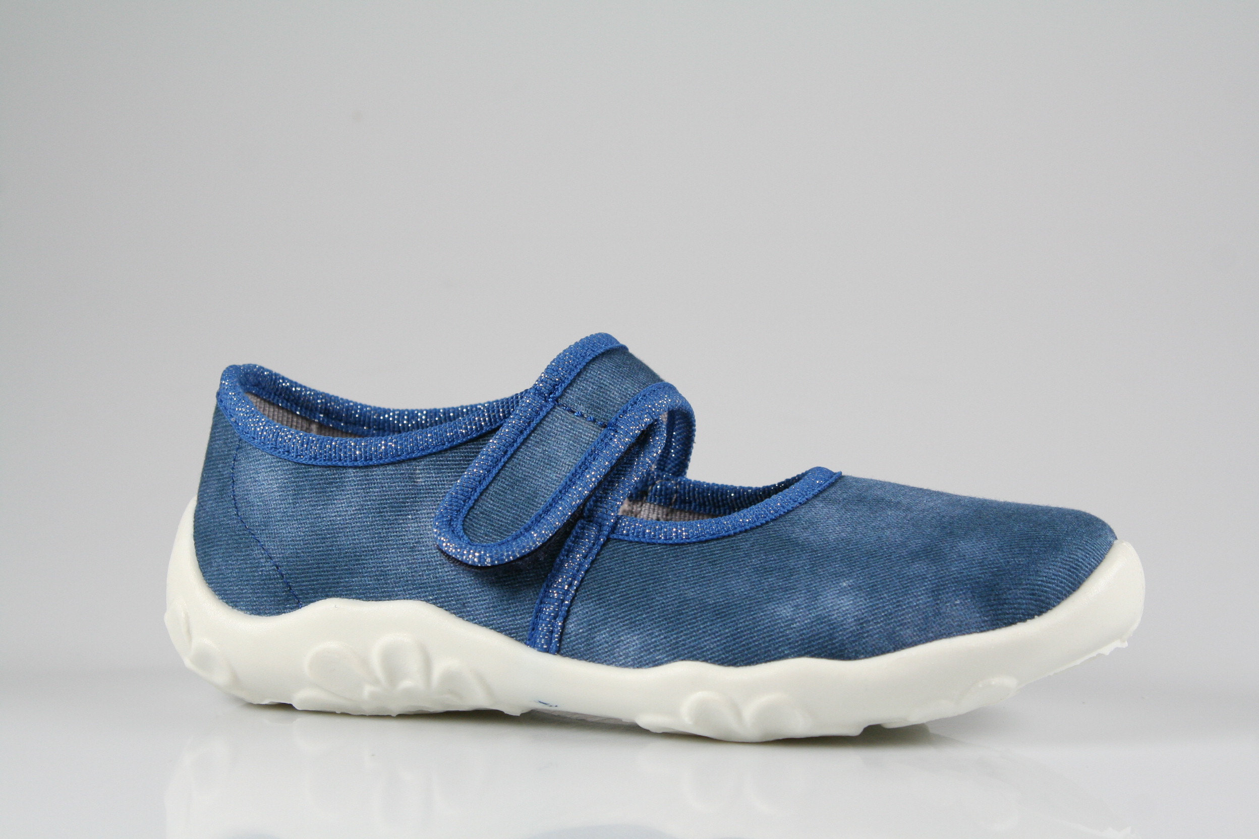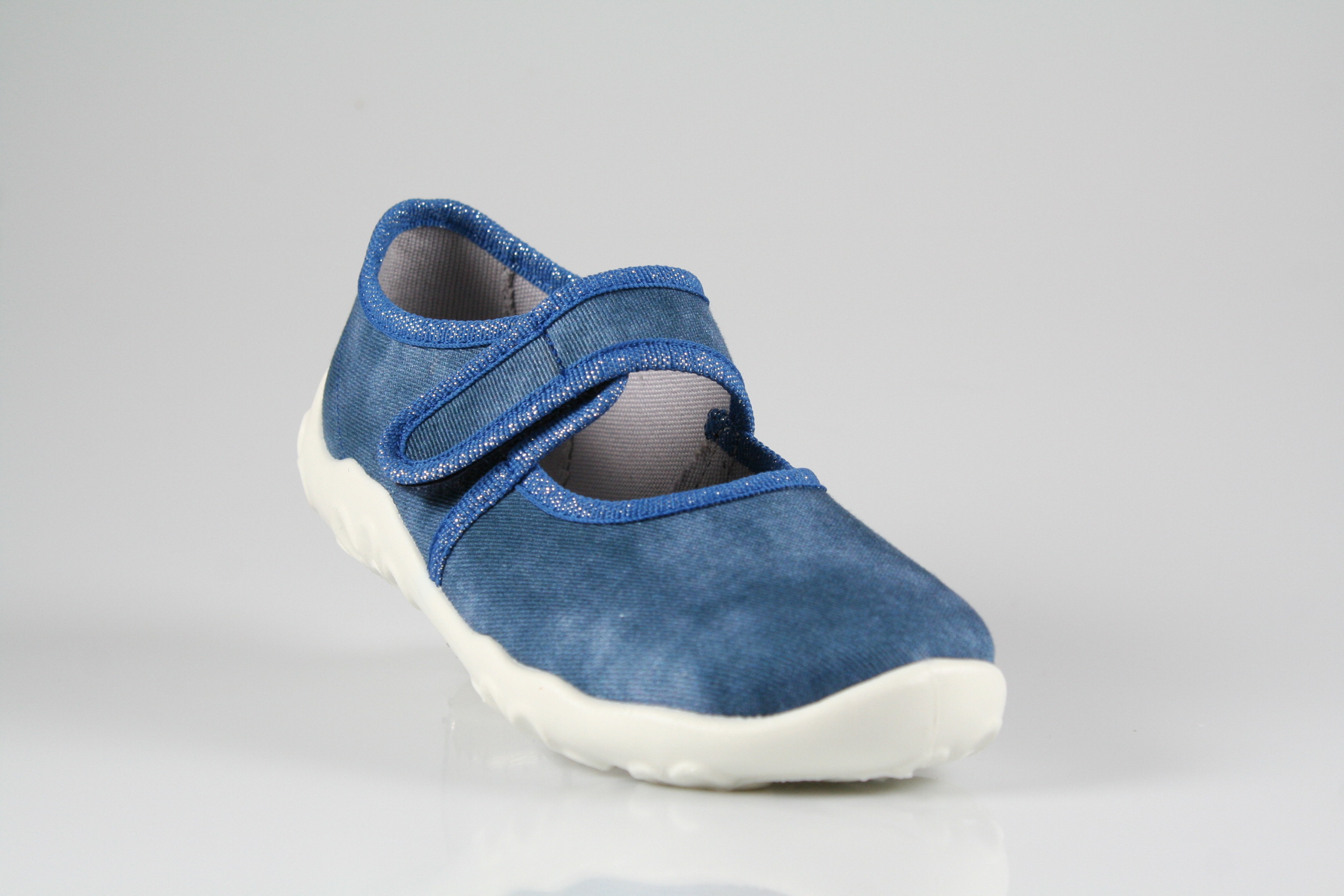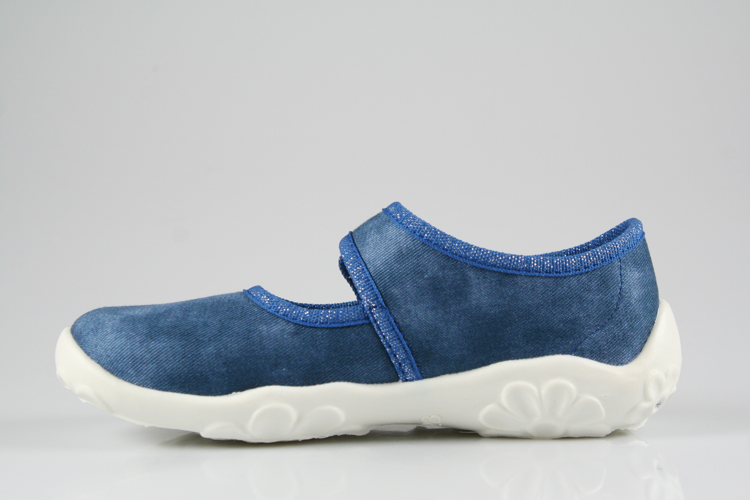 Typ: Hausschuh; Farbe "blau"; Ausstattung:; - Obermaterial und Innenfutter: Baumwolle; - bequemes Fußbett; - leichte, perforierte Laufsohle; - gepolsterter Schaftrand; - Klettverschluss zur Weitenregulierung