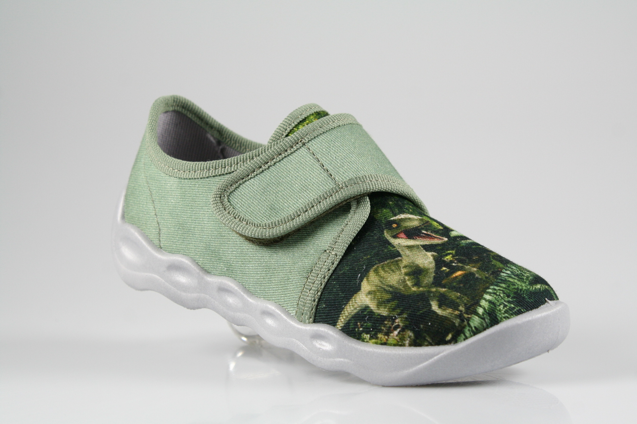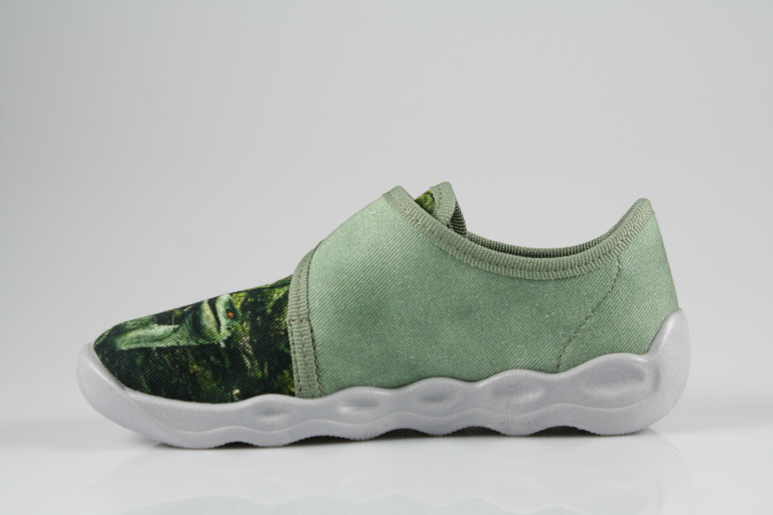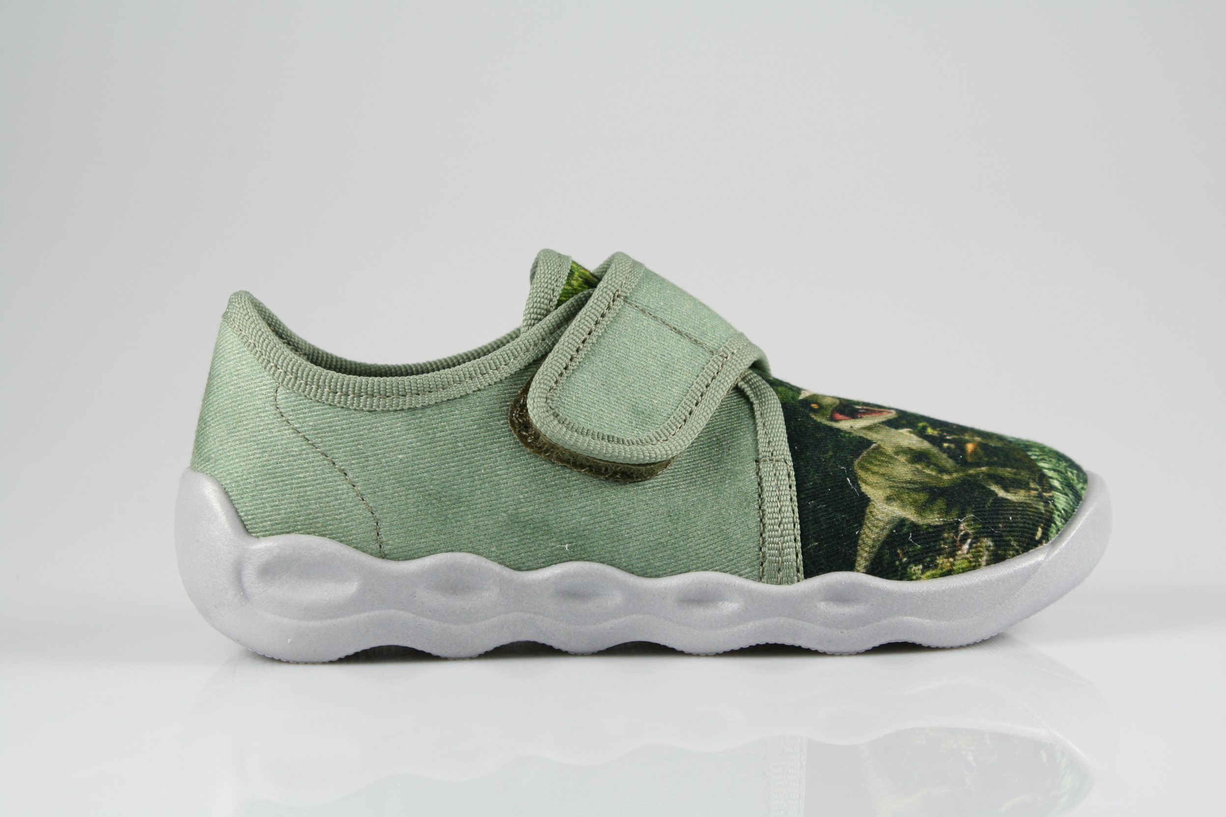Typ: Hausschuh; Farbe: "grün"; Ausstattung:; - flexible Laufsohle; - atmungsaktiv durch Perforation; - Klettverschluss zur Weitenregulierung