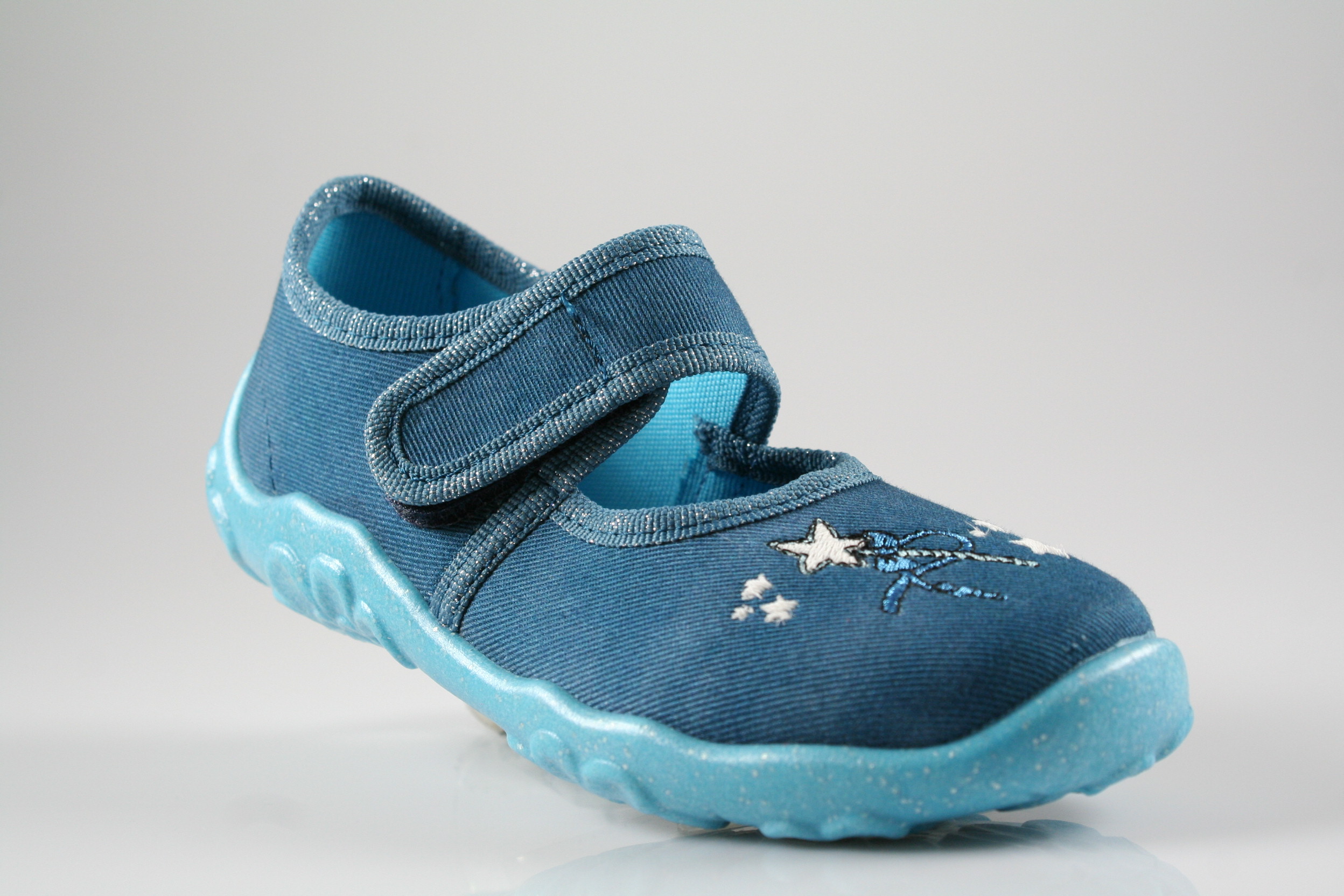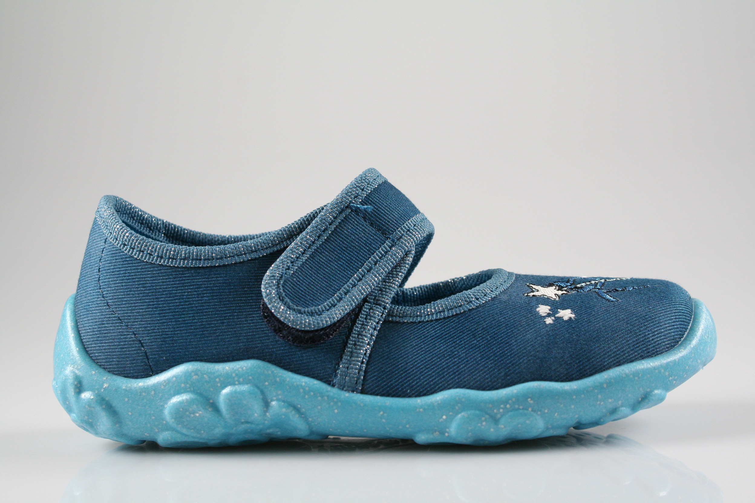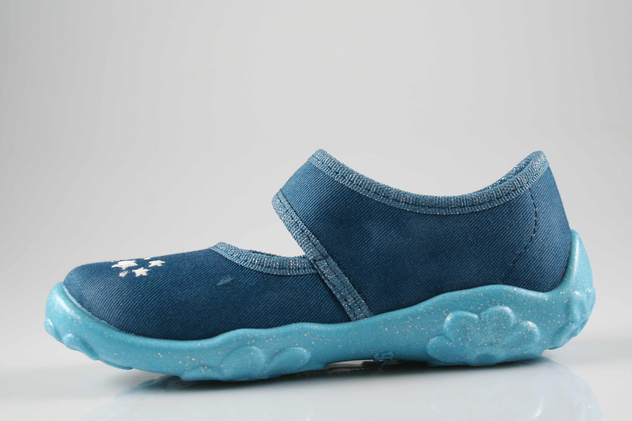Typ: Hausschuh; Farbe "blau"; Ausstattung:; - Obermaterial und Innenfutter: Baumwolle; - gepolsterter Schaftrand; - leichte und flexible Laufsohle; - atmungsaktiv durch perforierte Sohle; - Klettverschluss zur Weitenregulierung