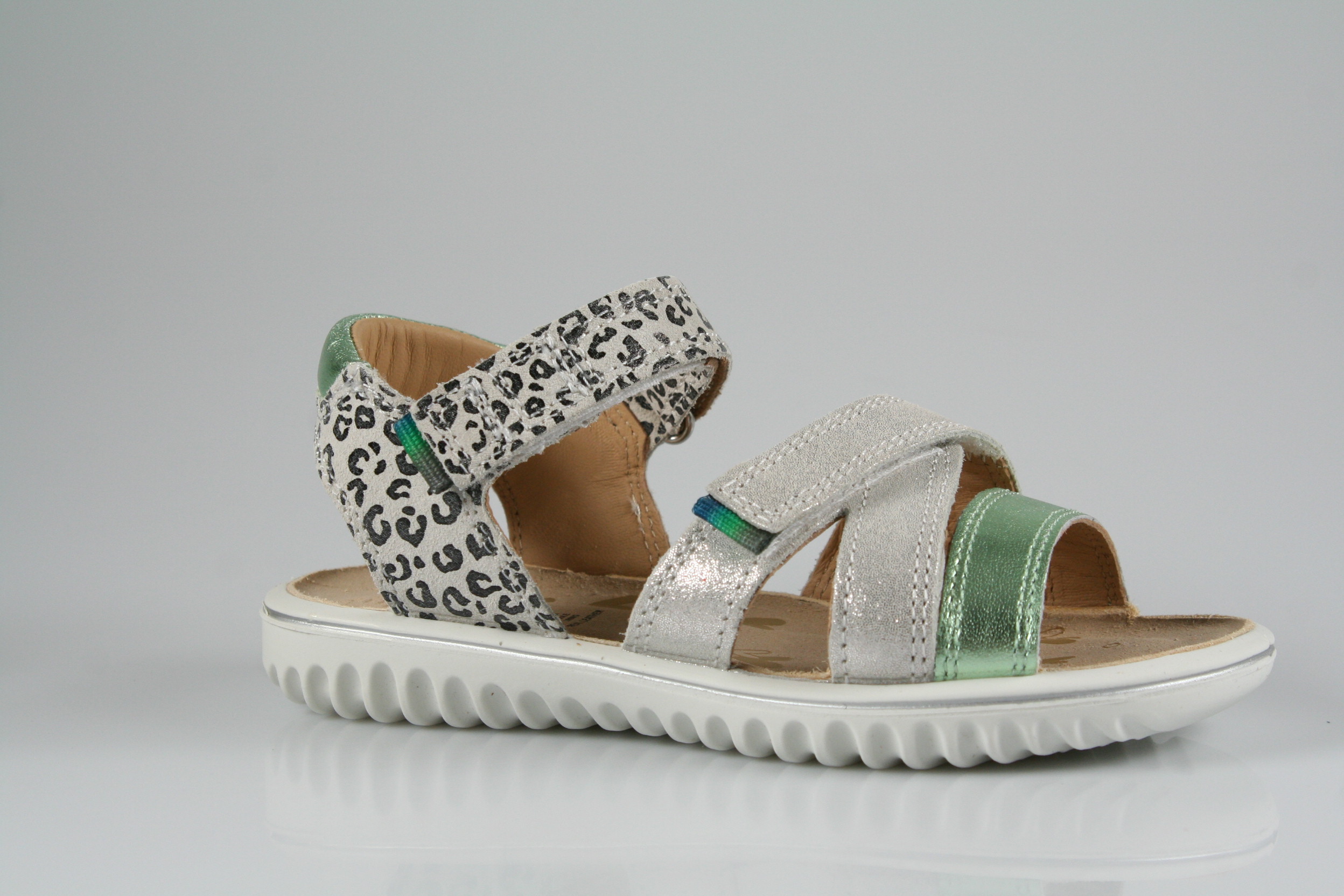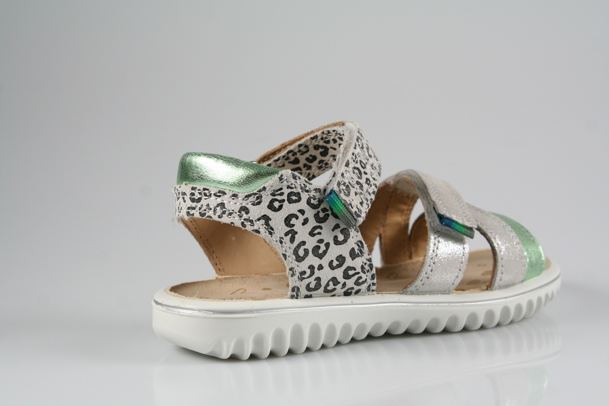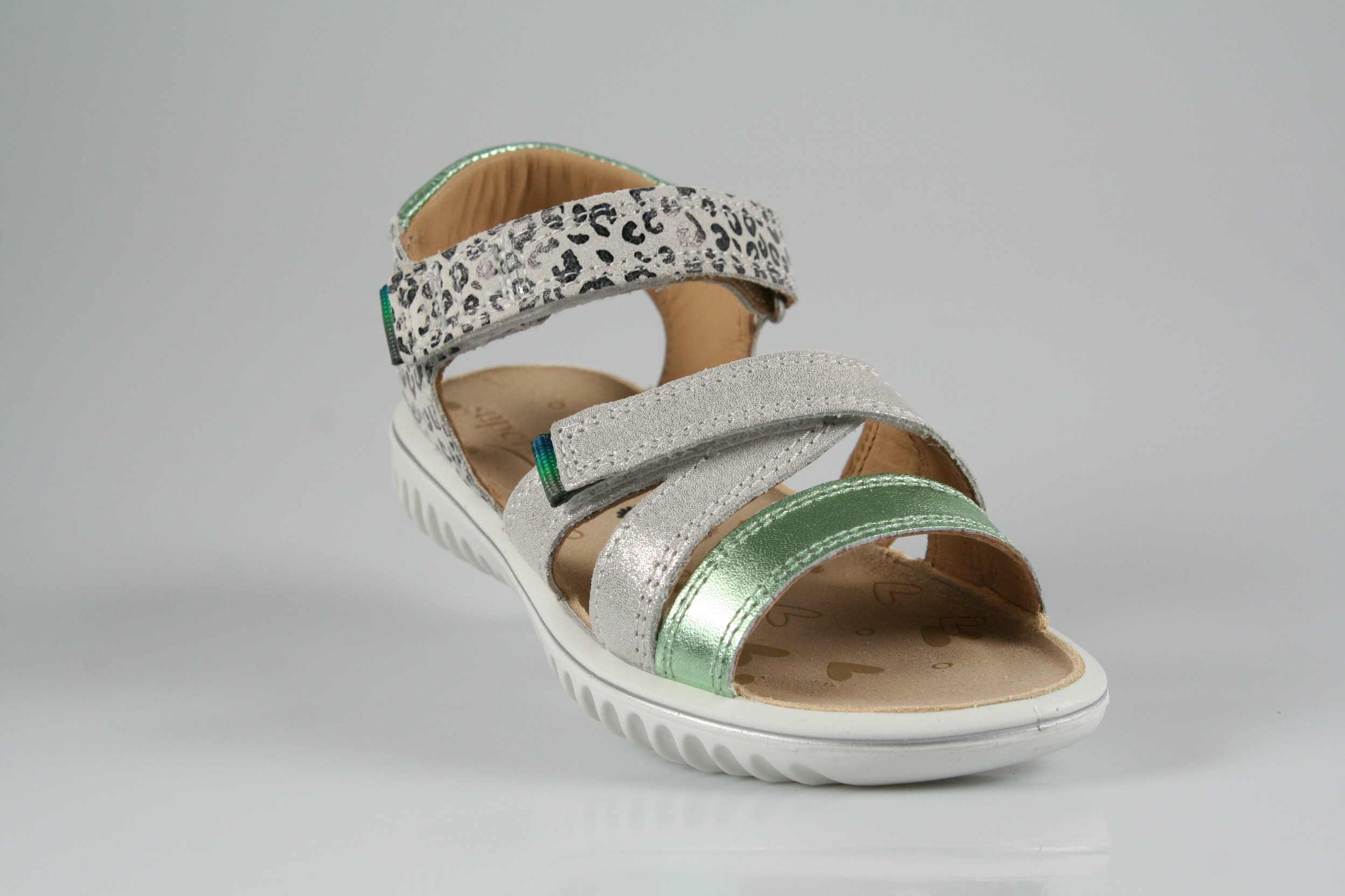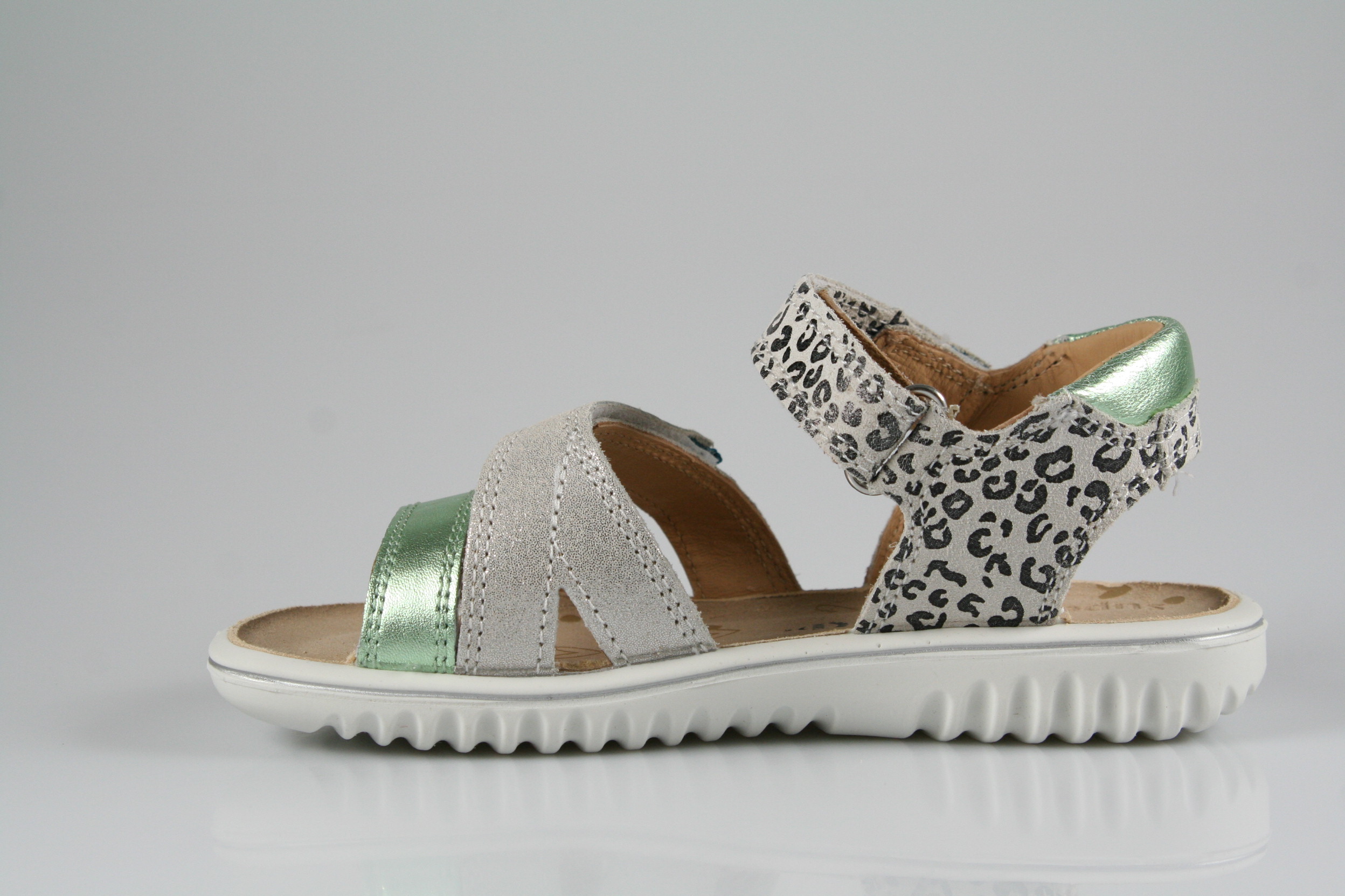 Typ: Sandale; Farbe: "weiß/hellgrün"; Ausstattung:; - Obermaterial: Effektleder; - weiches Fußbett; - leichte, flexible Laufsohle; - gepolsterter Schaftrand; - Klettverschluss zur Weitenregulierung;