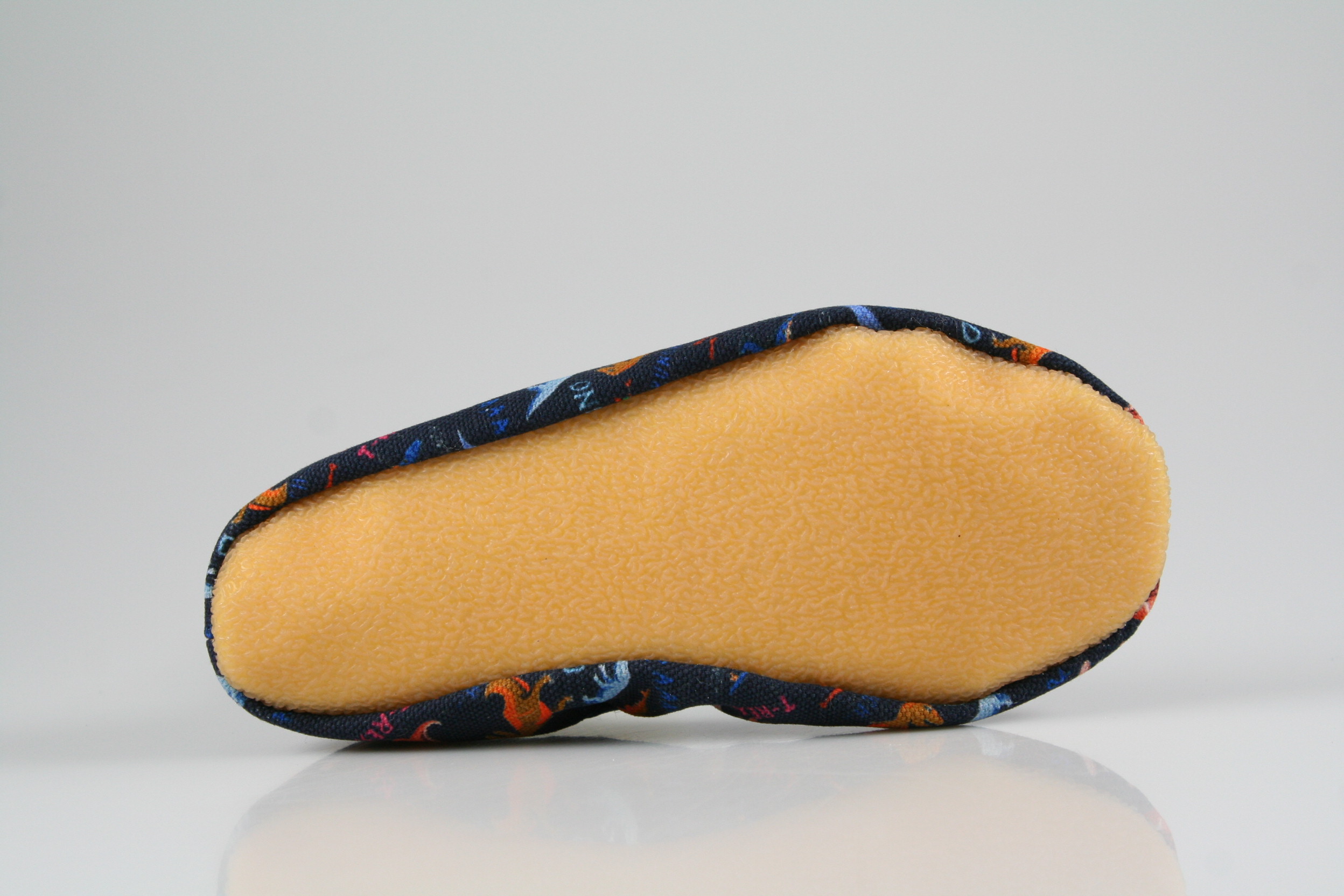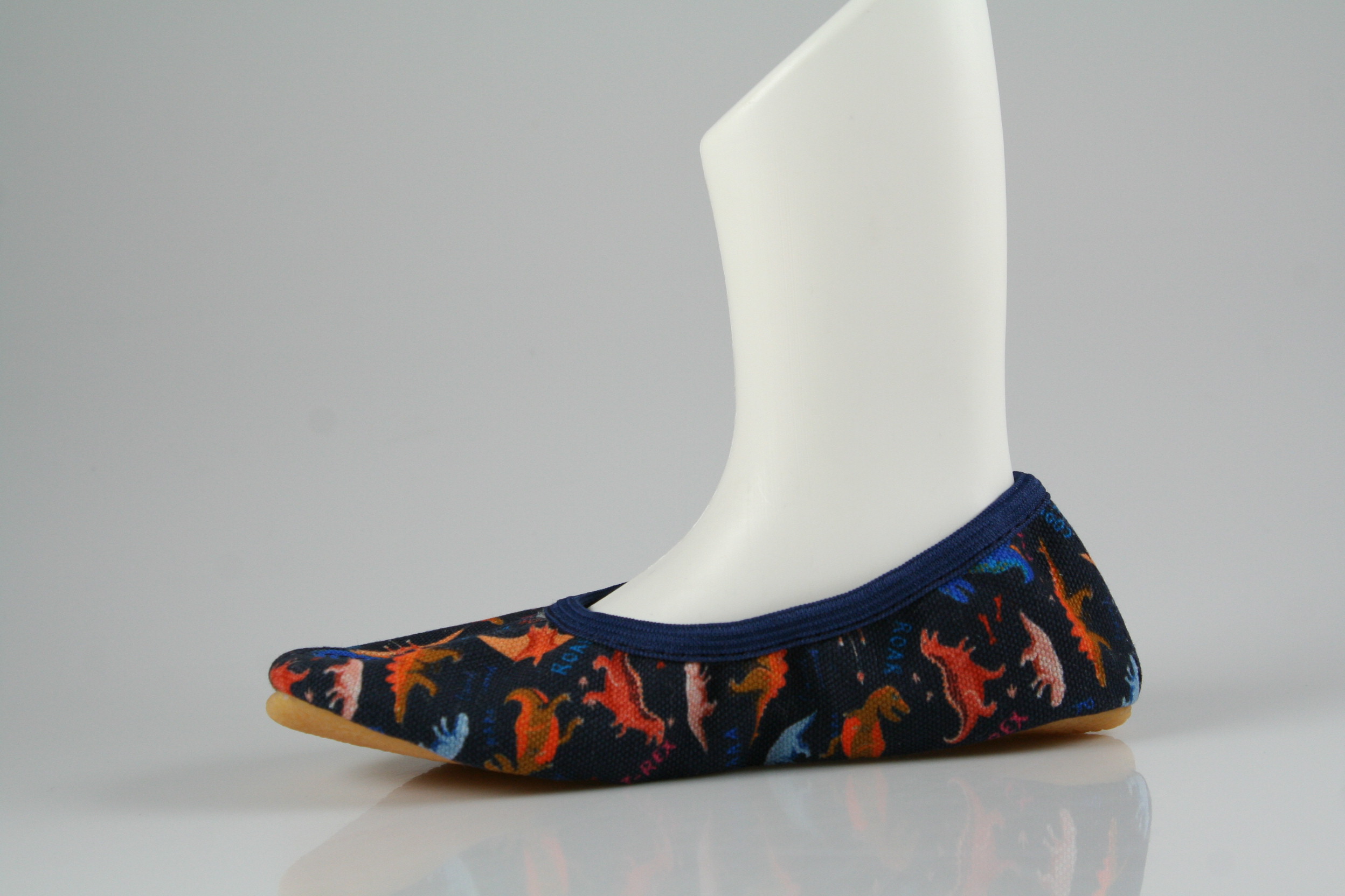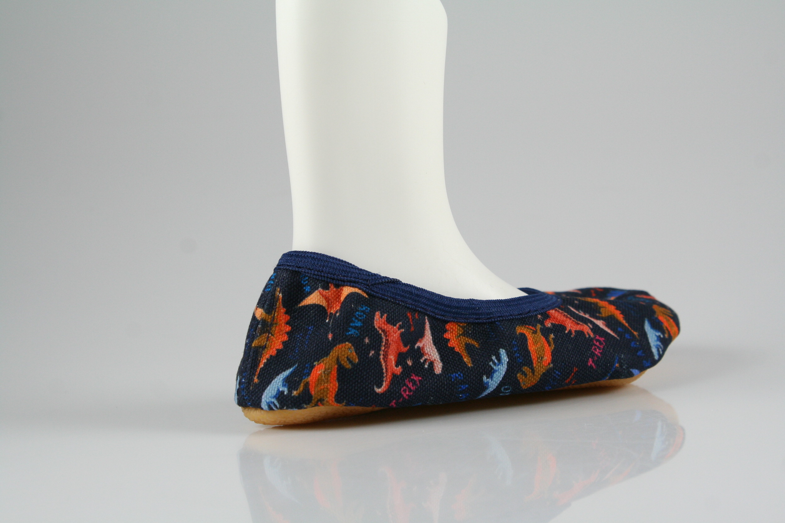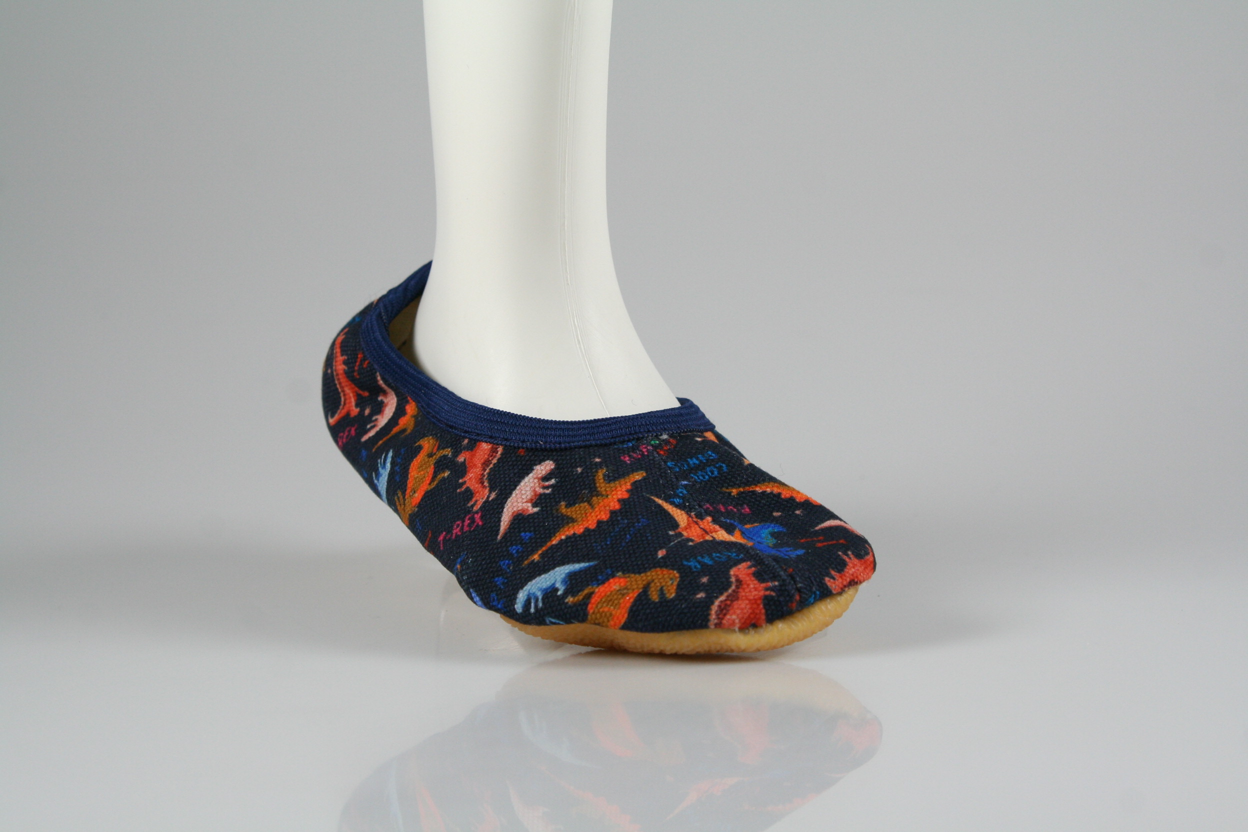 Typ: Turnschläppchen; Farbe "Dinosaurier dunkelblau"; Ausstattung:; - Obermaterial: Baumwolle; - weiche Decksohle; - rutschfeste Gummilaufsohle; - dehnbarer Einschlupf