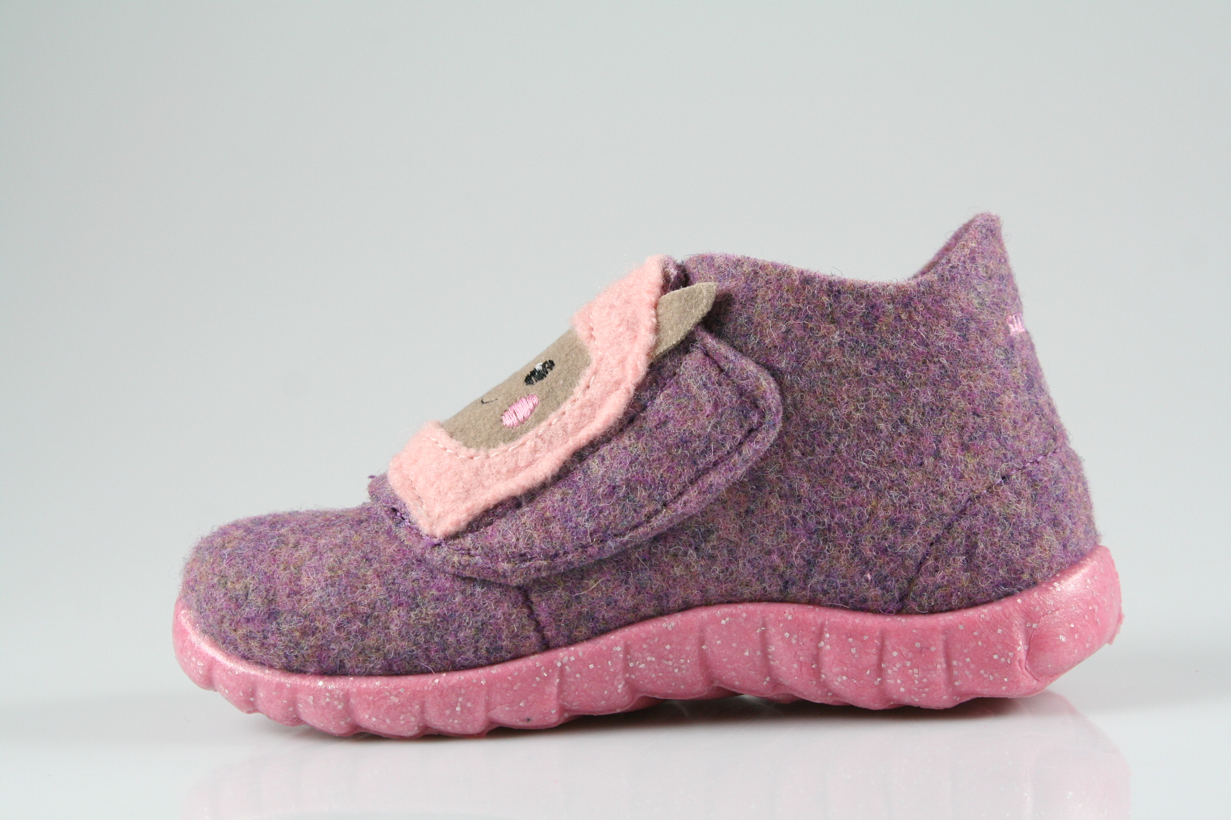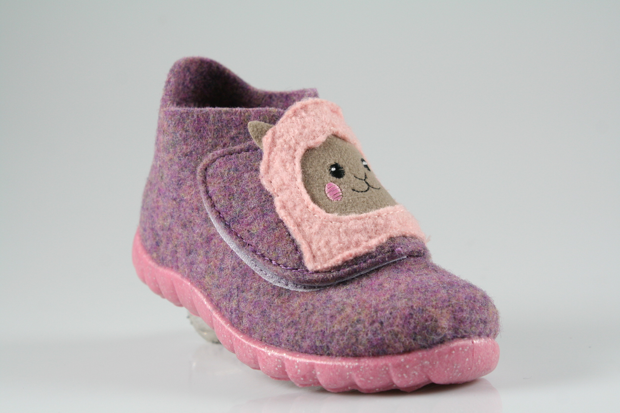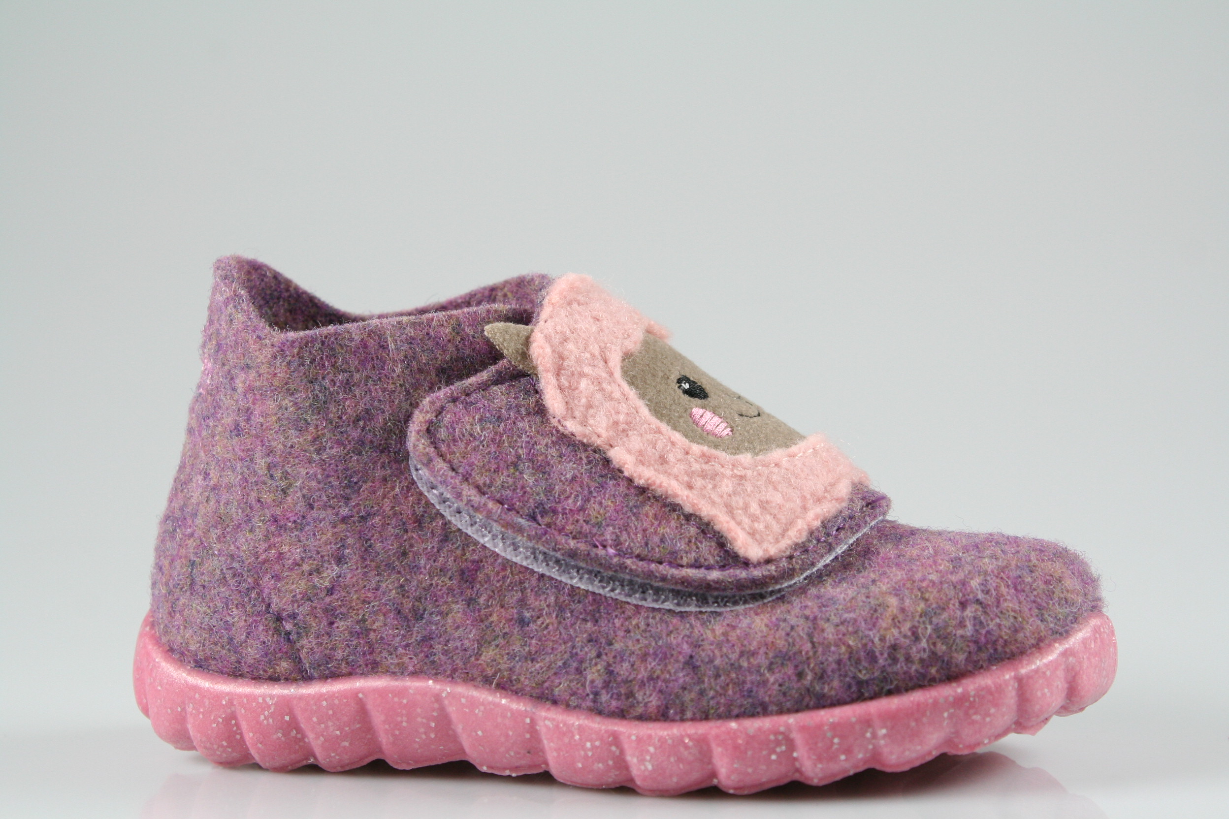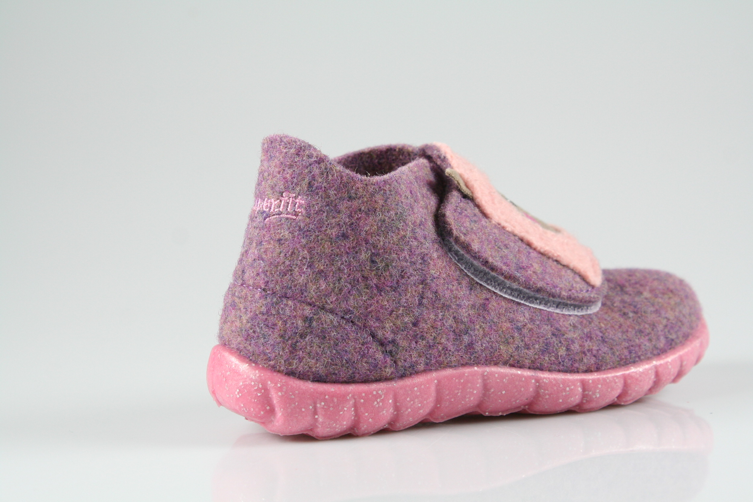 Typ: Hausschuh; Farbe "lila"; Ausstattung:; - Obermaterial: Wollfilz; - leichte und flexible Laufsohle; - atmungsaktiv durch Löcher in der Sohle; - Klettverschluss zur Weitenregulierung